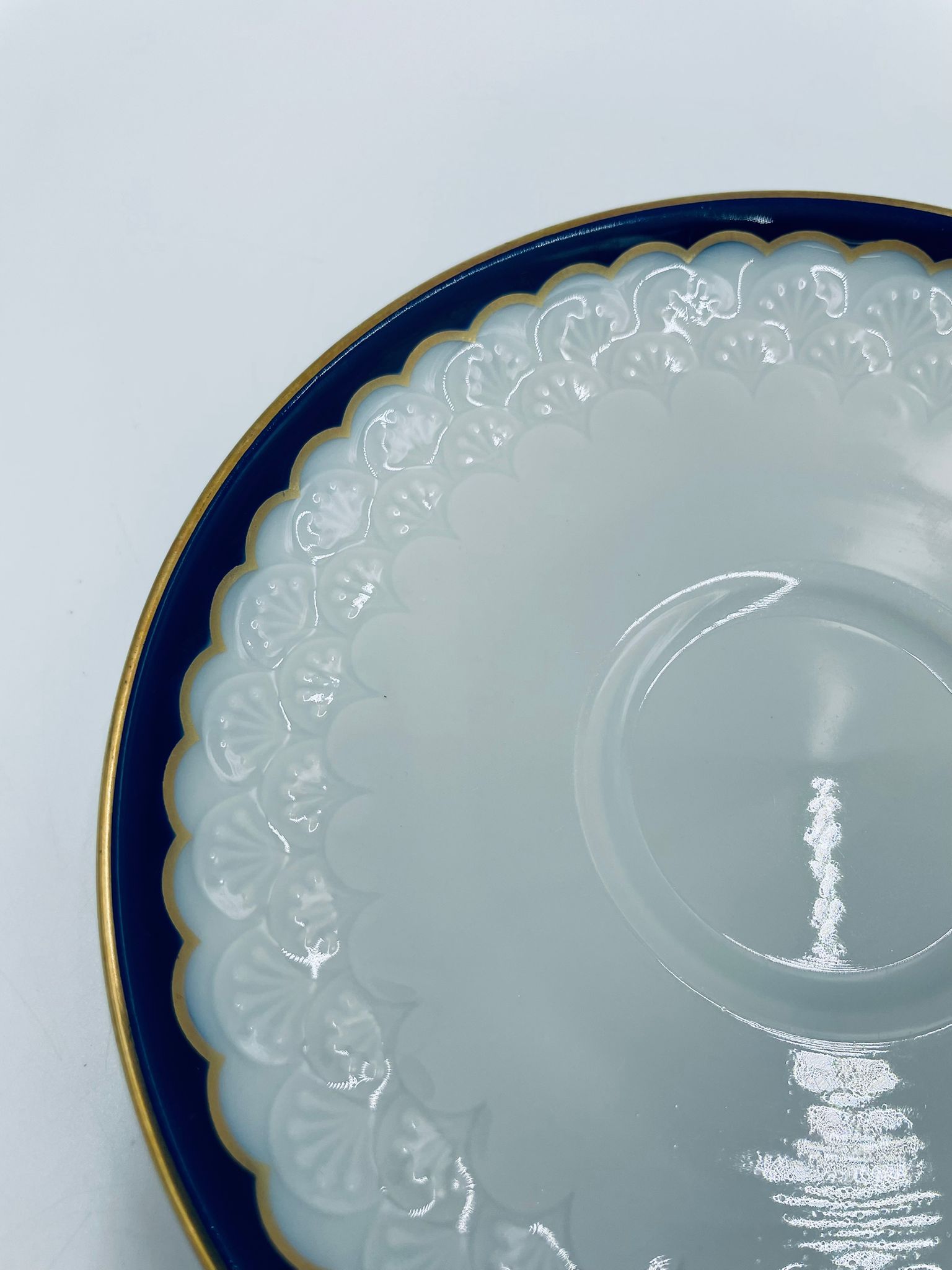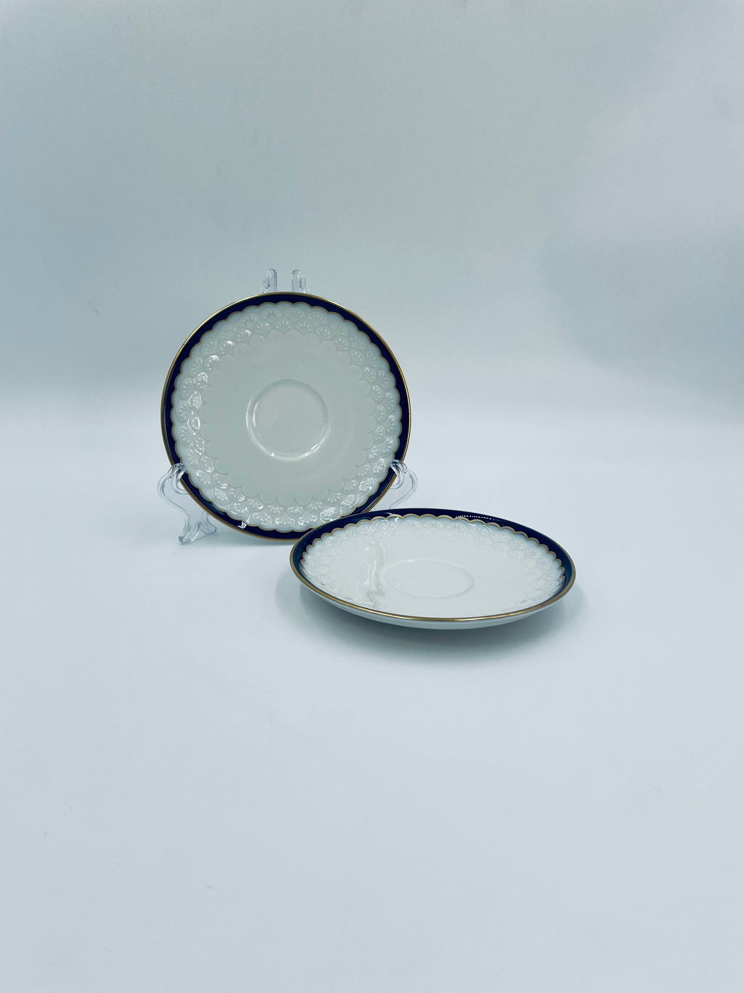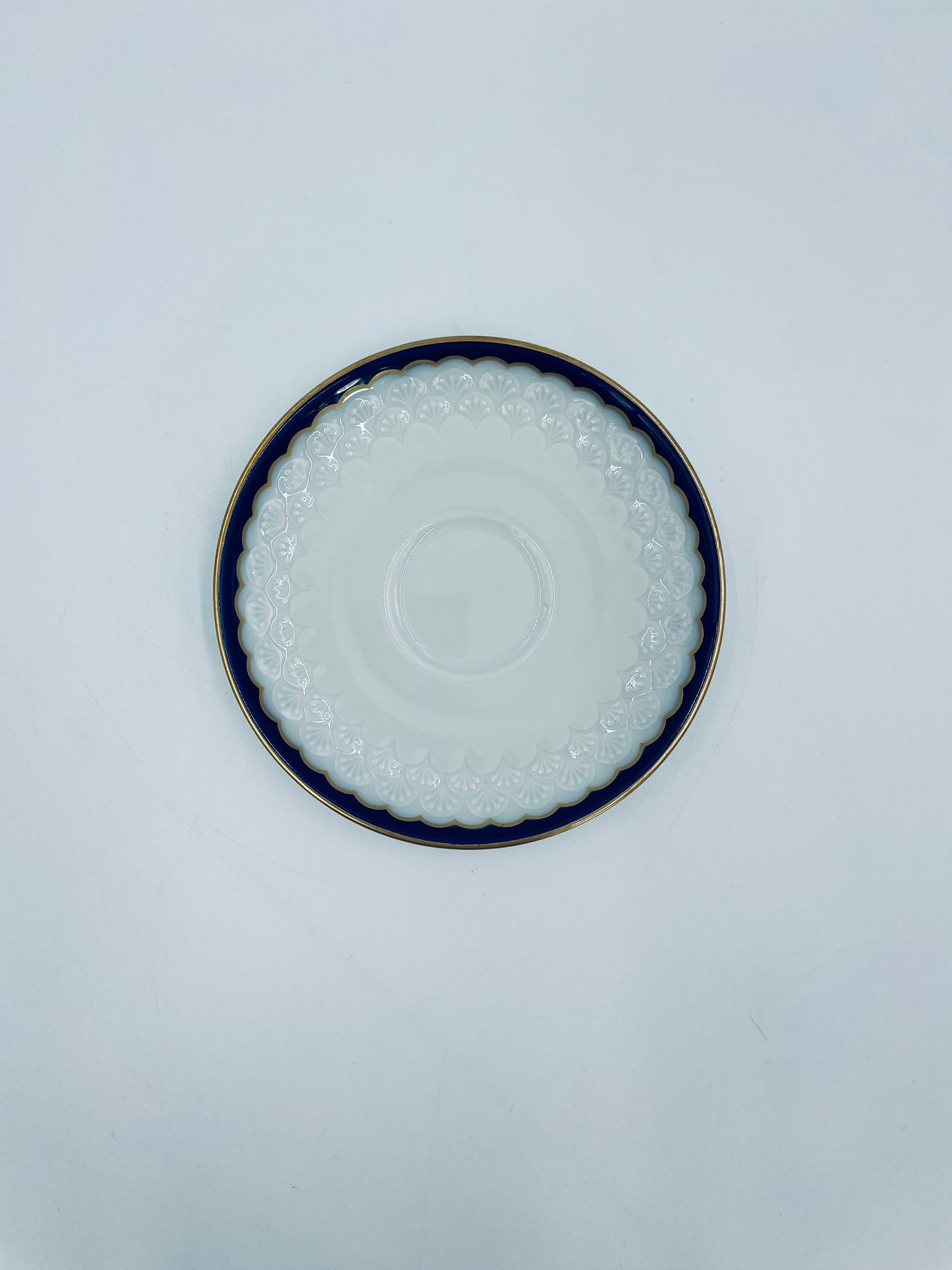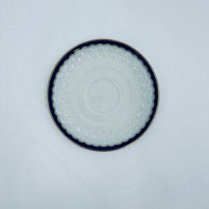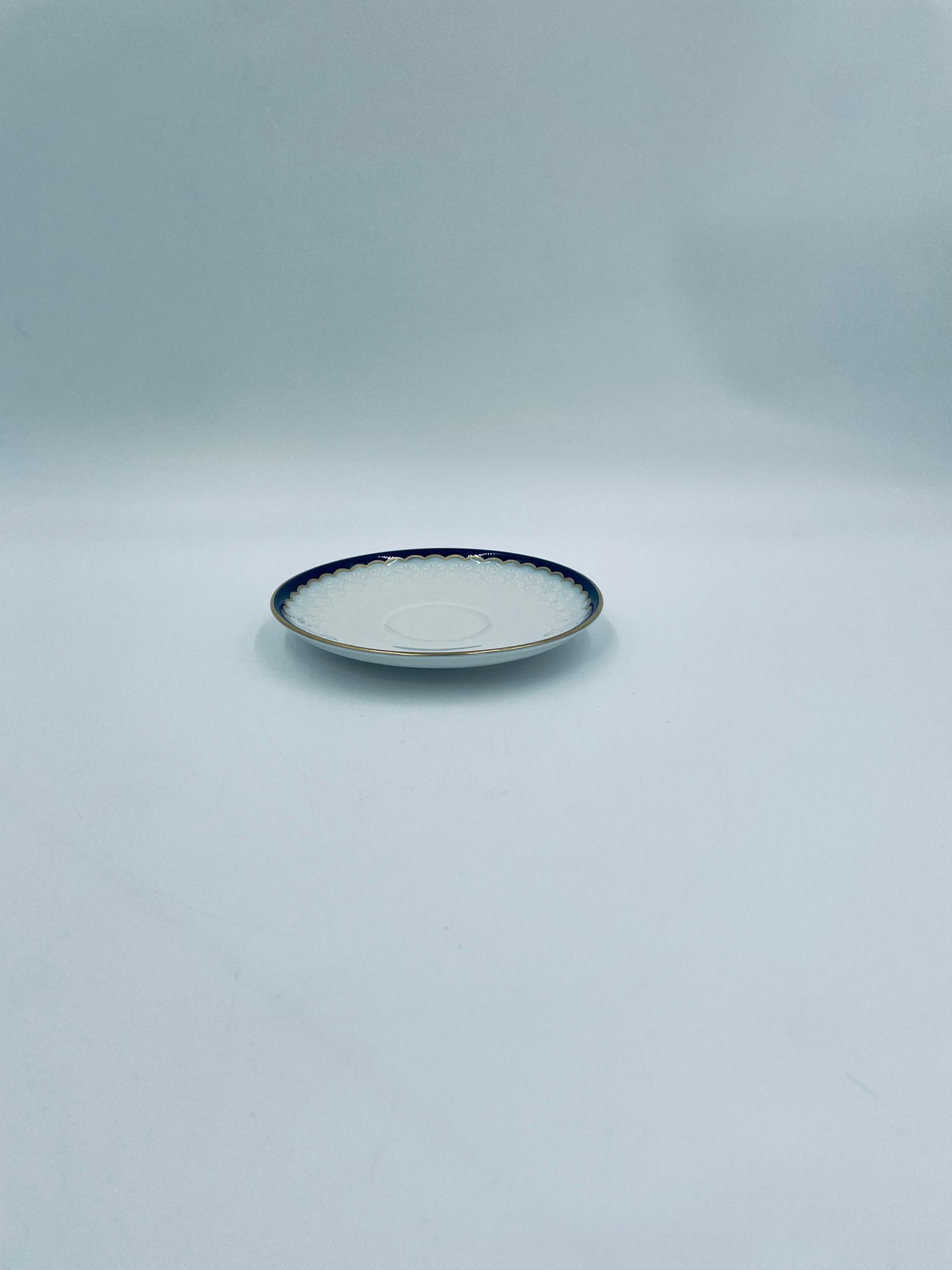 Spodek pod filiżankę wytwórni Hutschenreuther Arzberg Bavaria, wykonany z wysokiej jakości białej porcelany. Talerzyk elegancki, bogato zdobiony w reliefowe wzory oraz kobaltowy pas ze złoceniem wokół krawędzi. Posiada małe przetarcie na złoceniu.