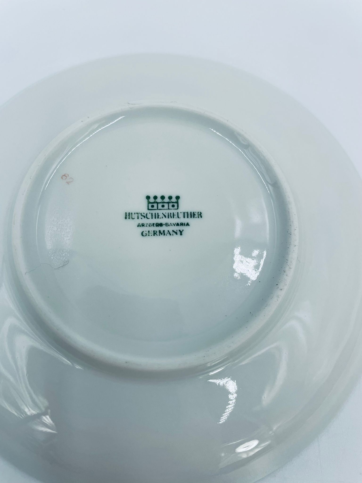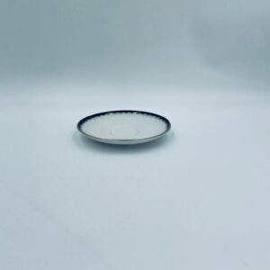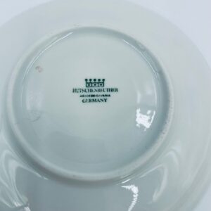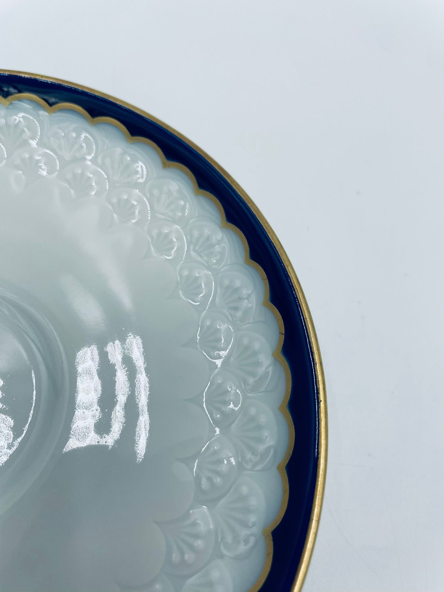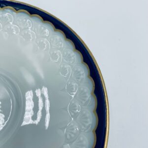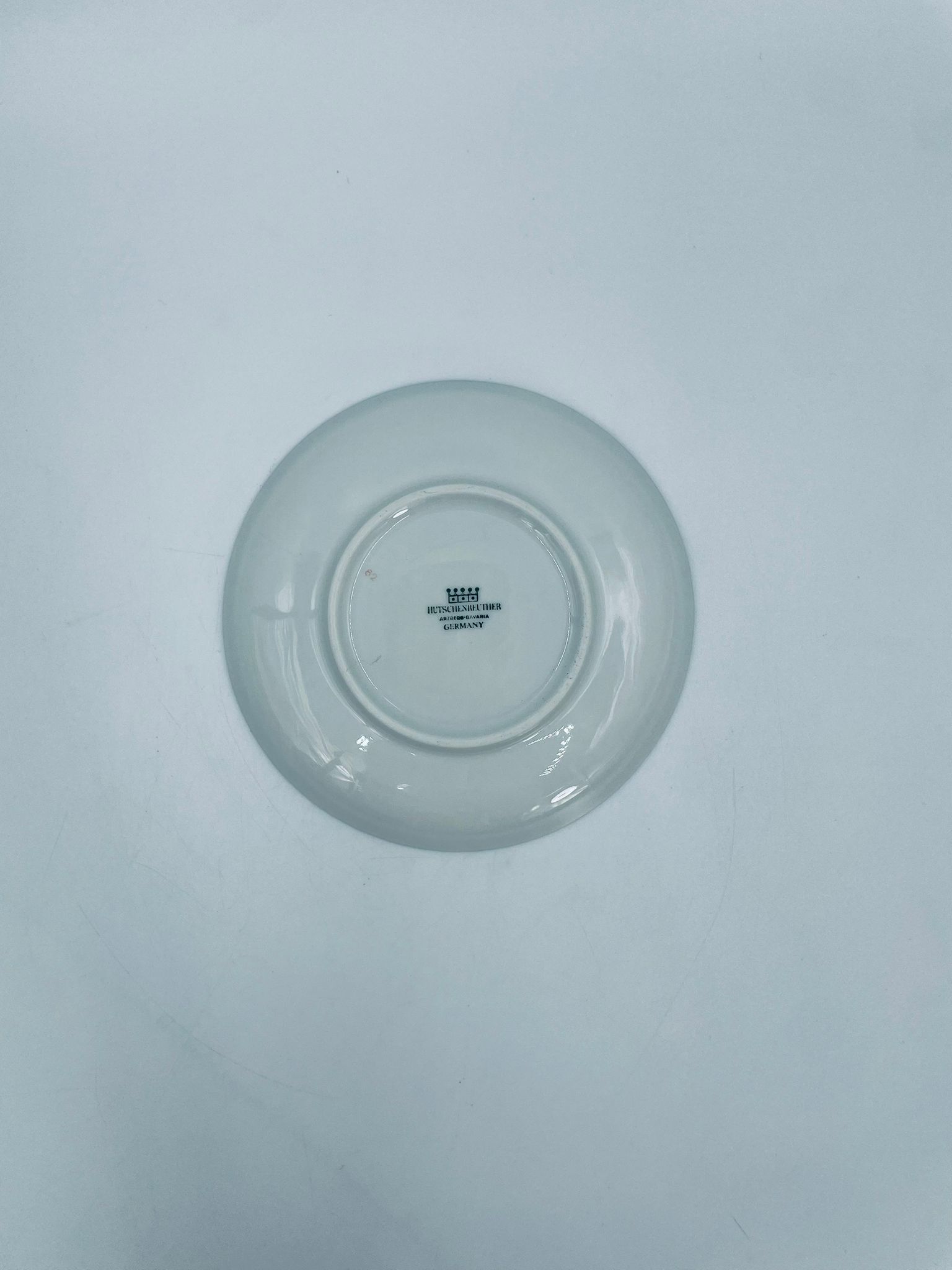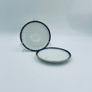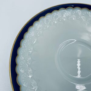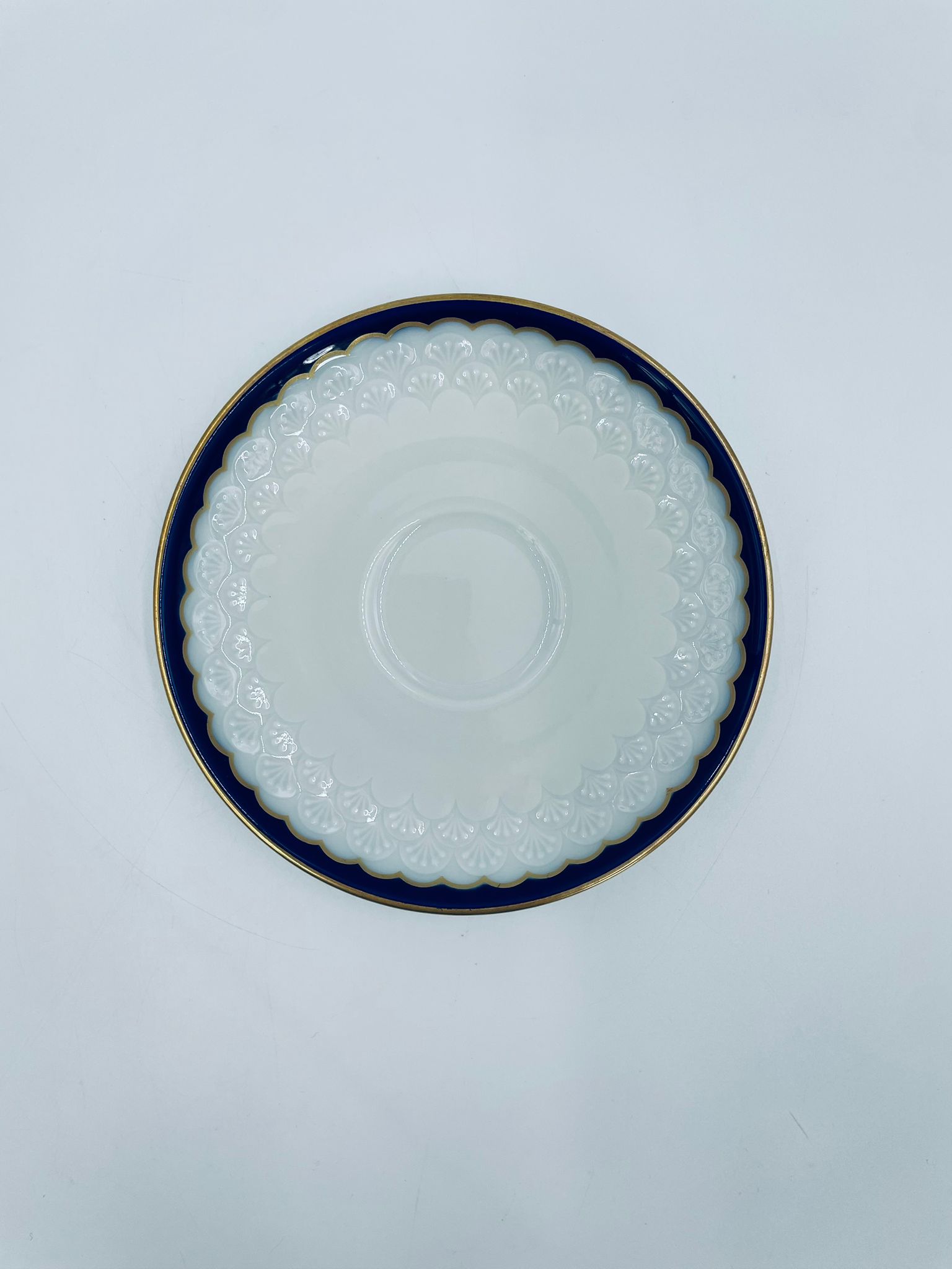 Spodek pod filiżankę wytwórni Hutschenreuther Arzberg Bavaria, wykonany z wysokiej jakości białej porcelany. Talerzyk elegancki, bogato zdobiony w reliefowe wzory oraz kobaltowy pas ze złoceniem wokół krawędzi. Posiada małe przetarcie na złoceniu.