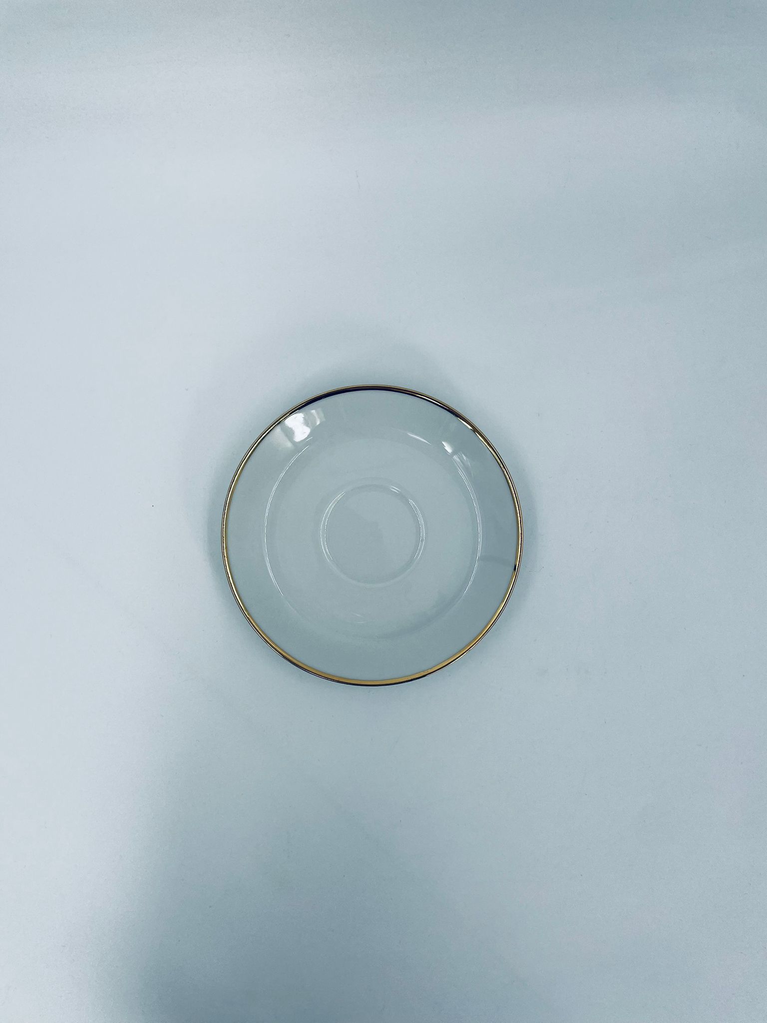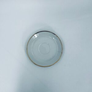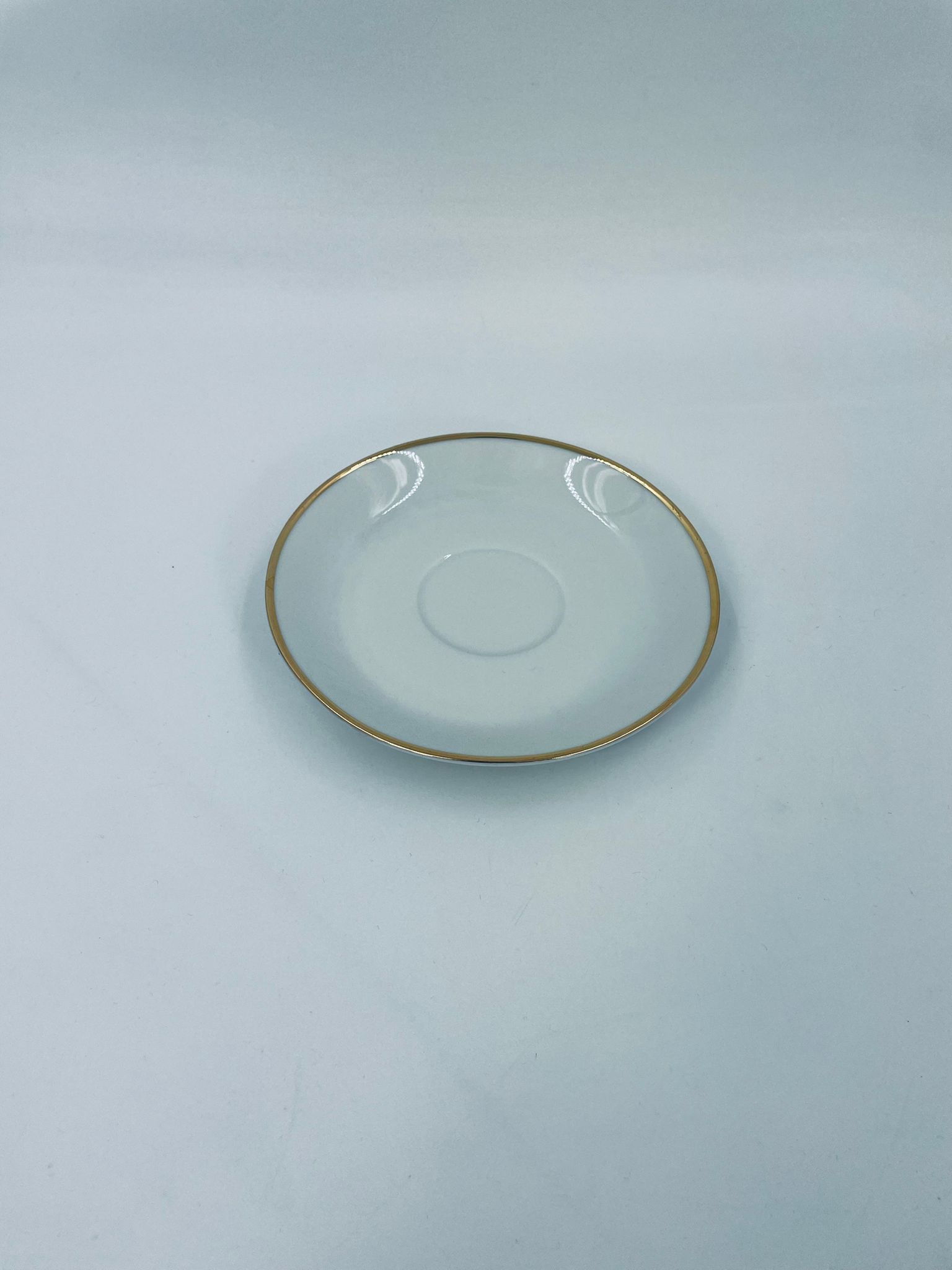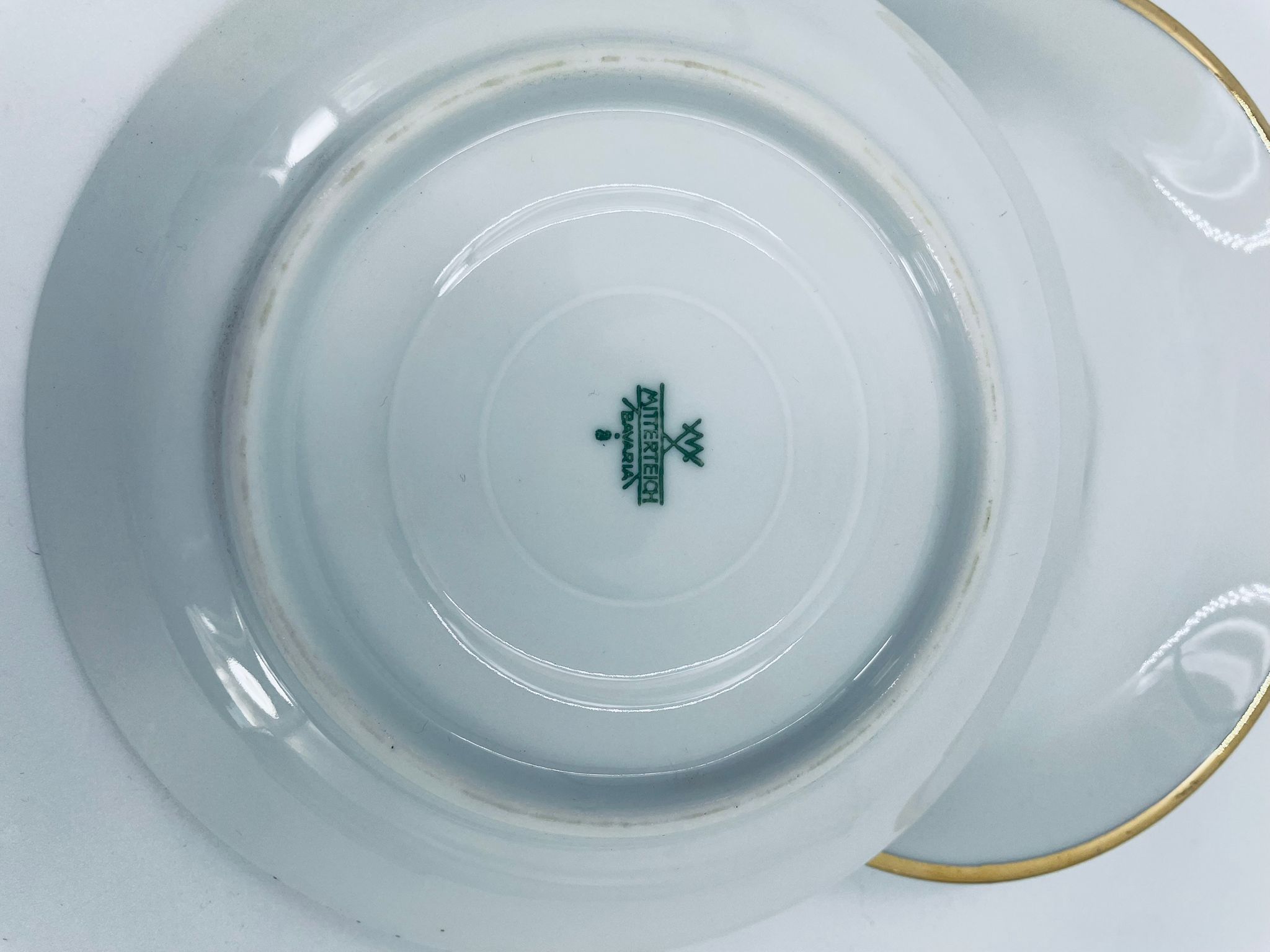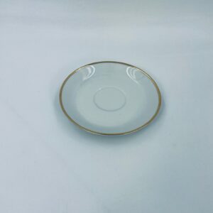 Spodek pod filiżankę wytwórni Mitterteich Bavaria, wykonany z wysokiej jakości białej porcelany. Klasyczny, okrągły spodek, wykończony zloceniem na rancie.