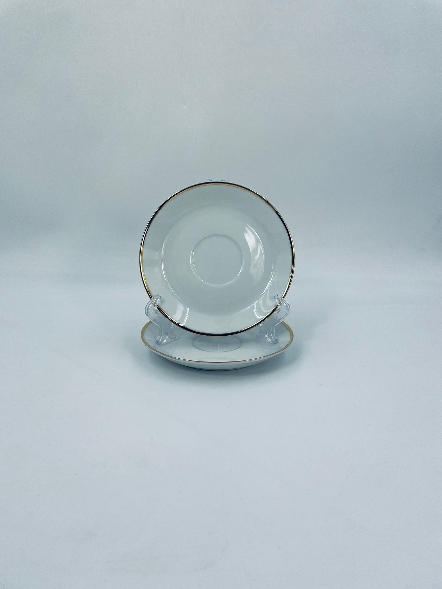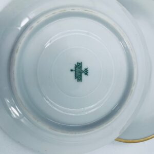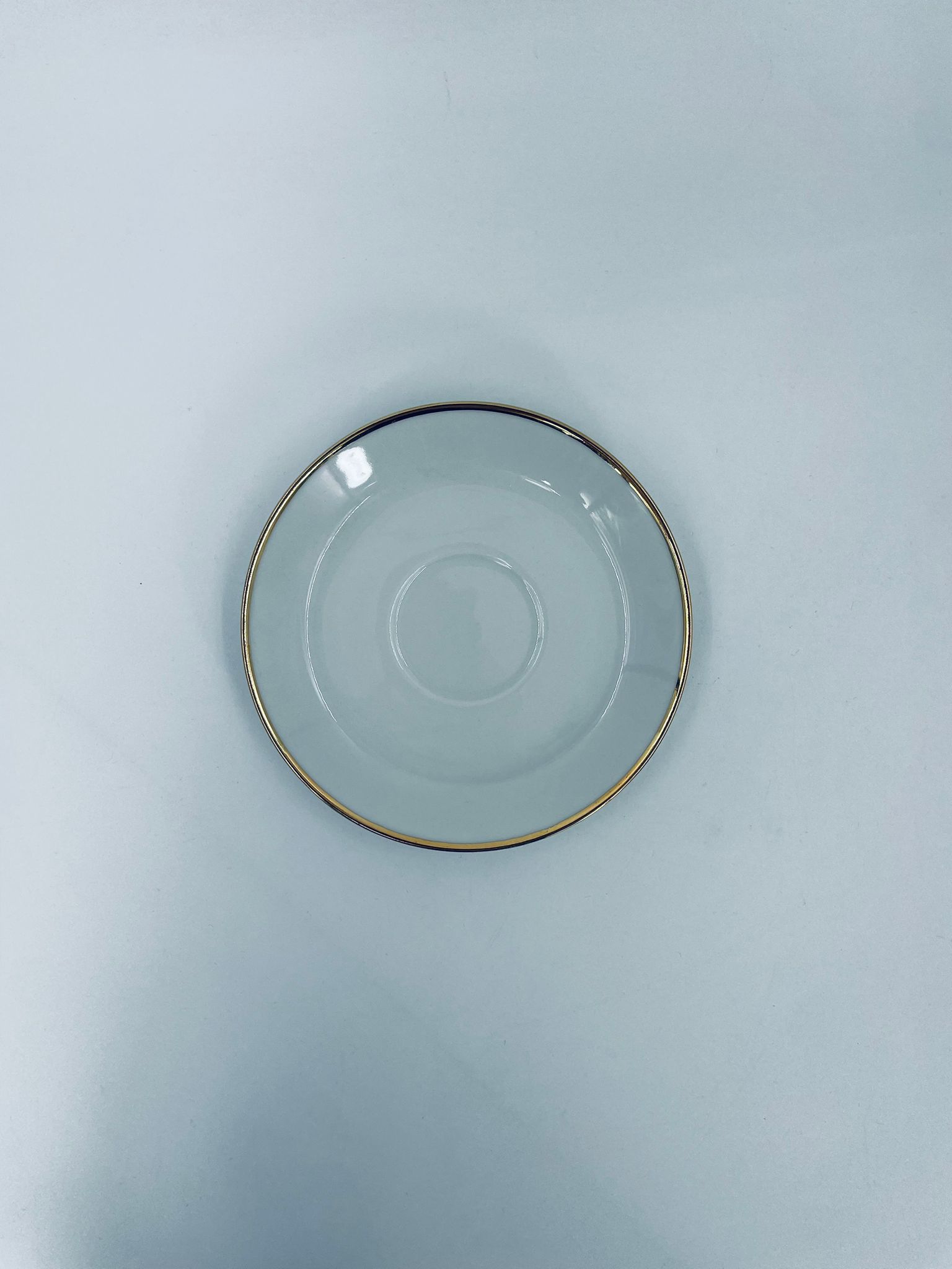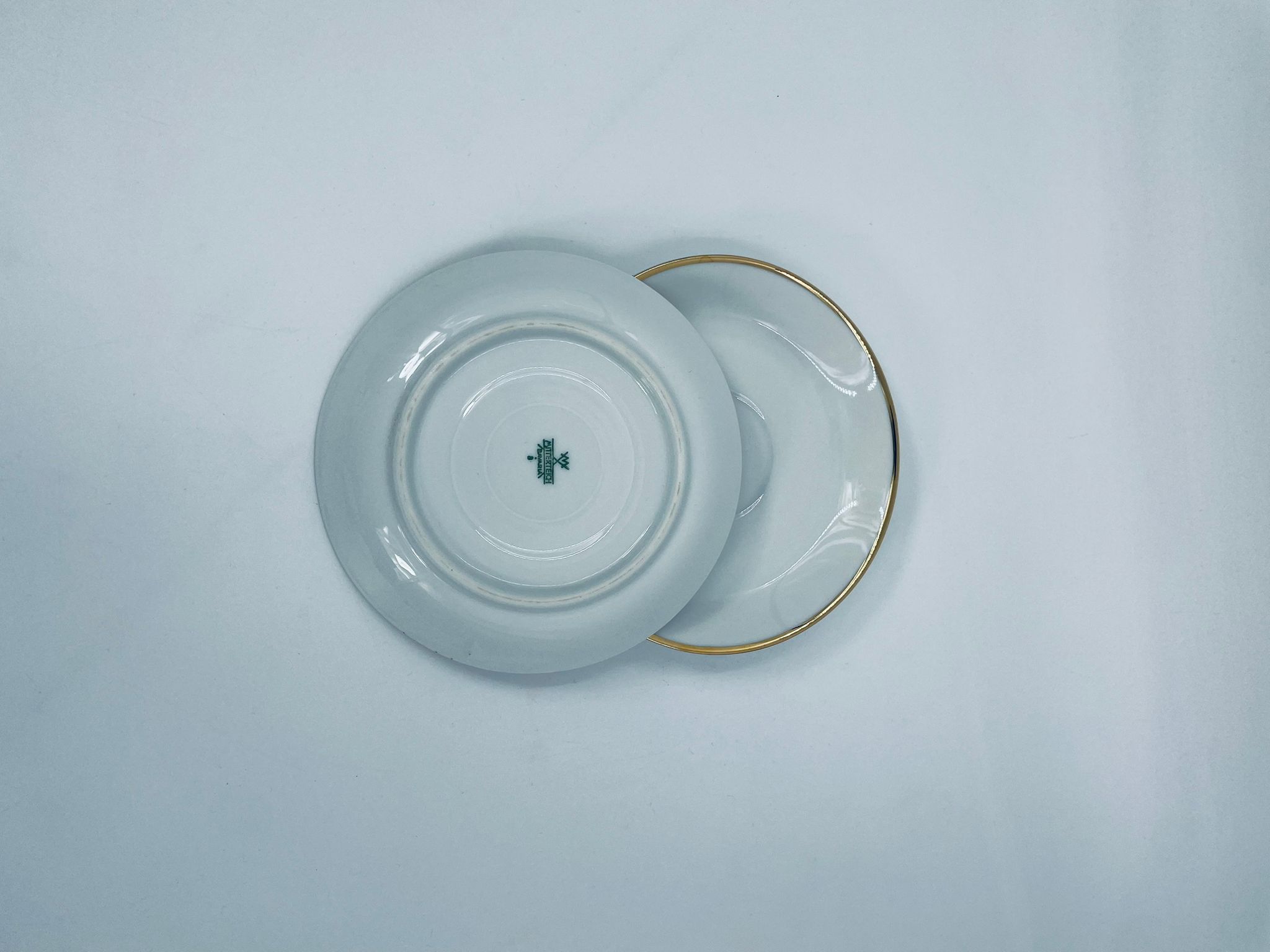 Spodek pod filiżankę wytwórni Mitterteich Bavaria, wykonany z wysokiej jakości białej porcelany. Klasyczny, okrągły spodek, wykończony zloceniem na rancie.