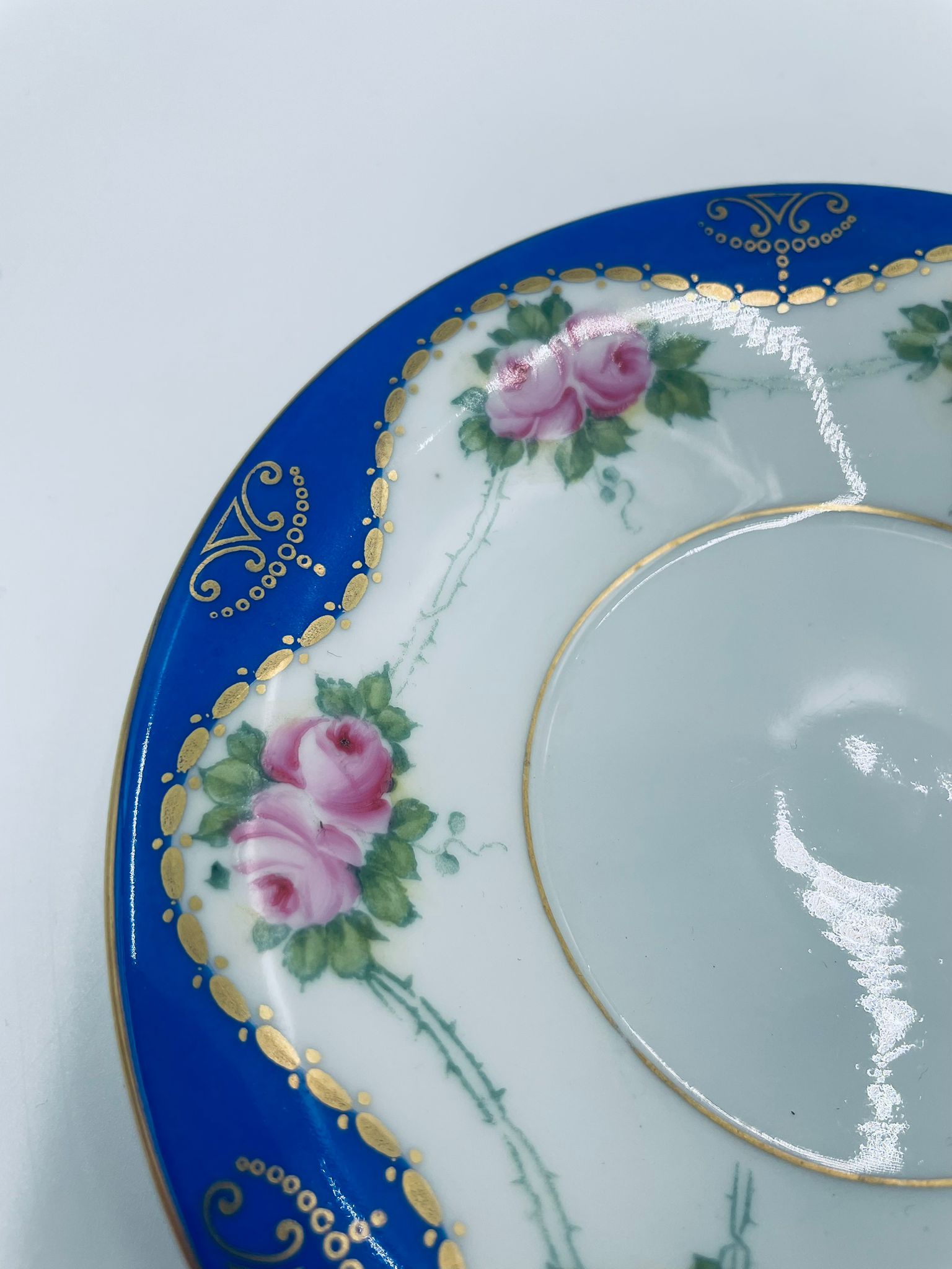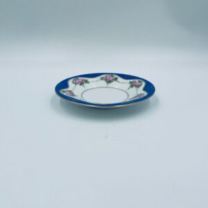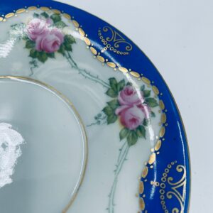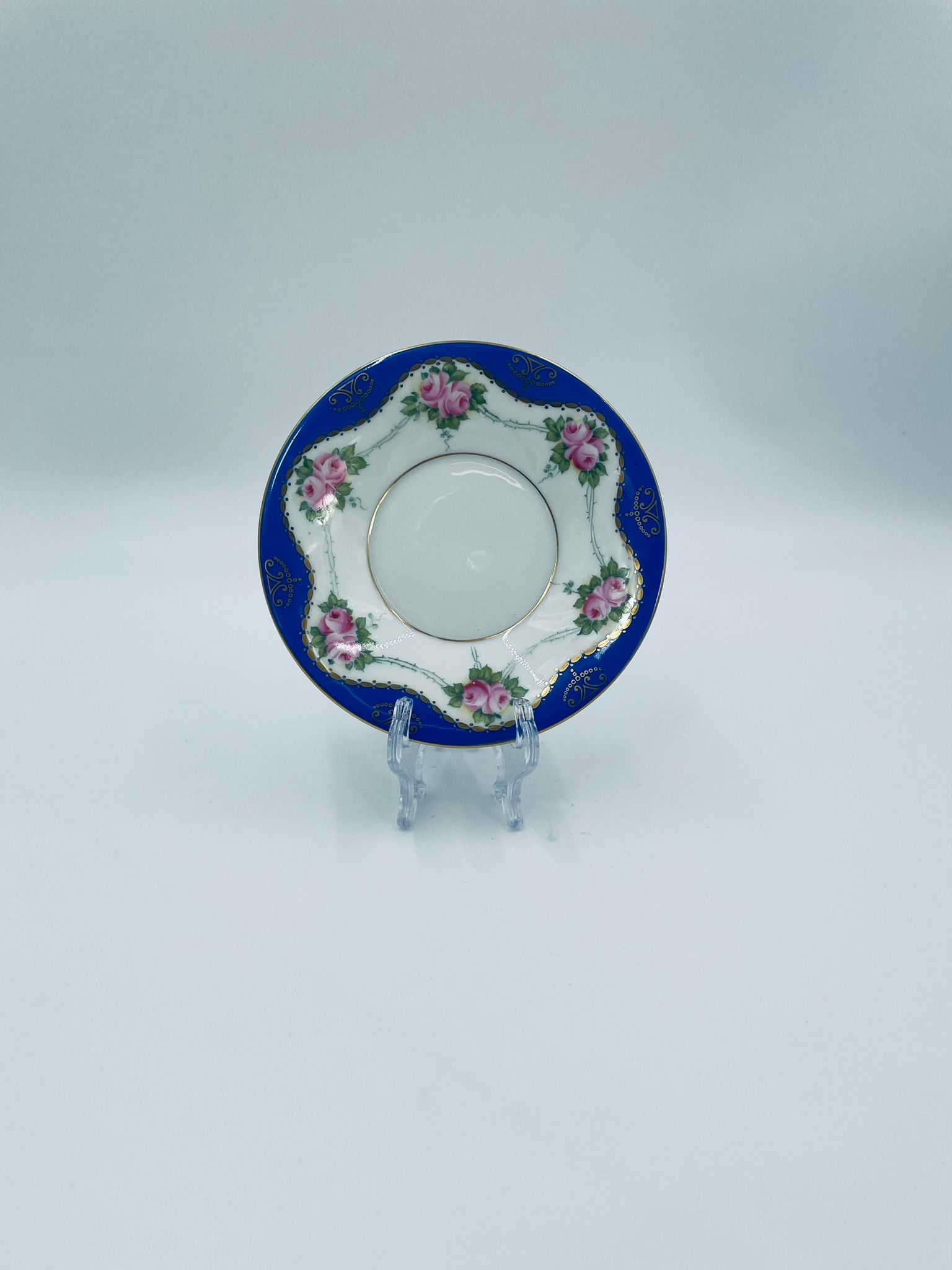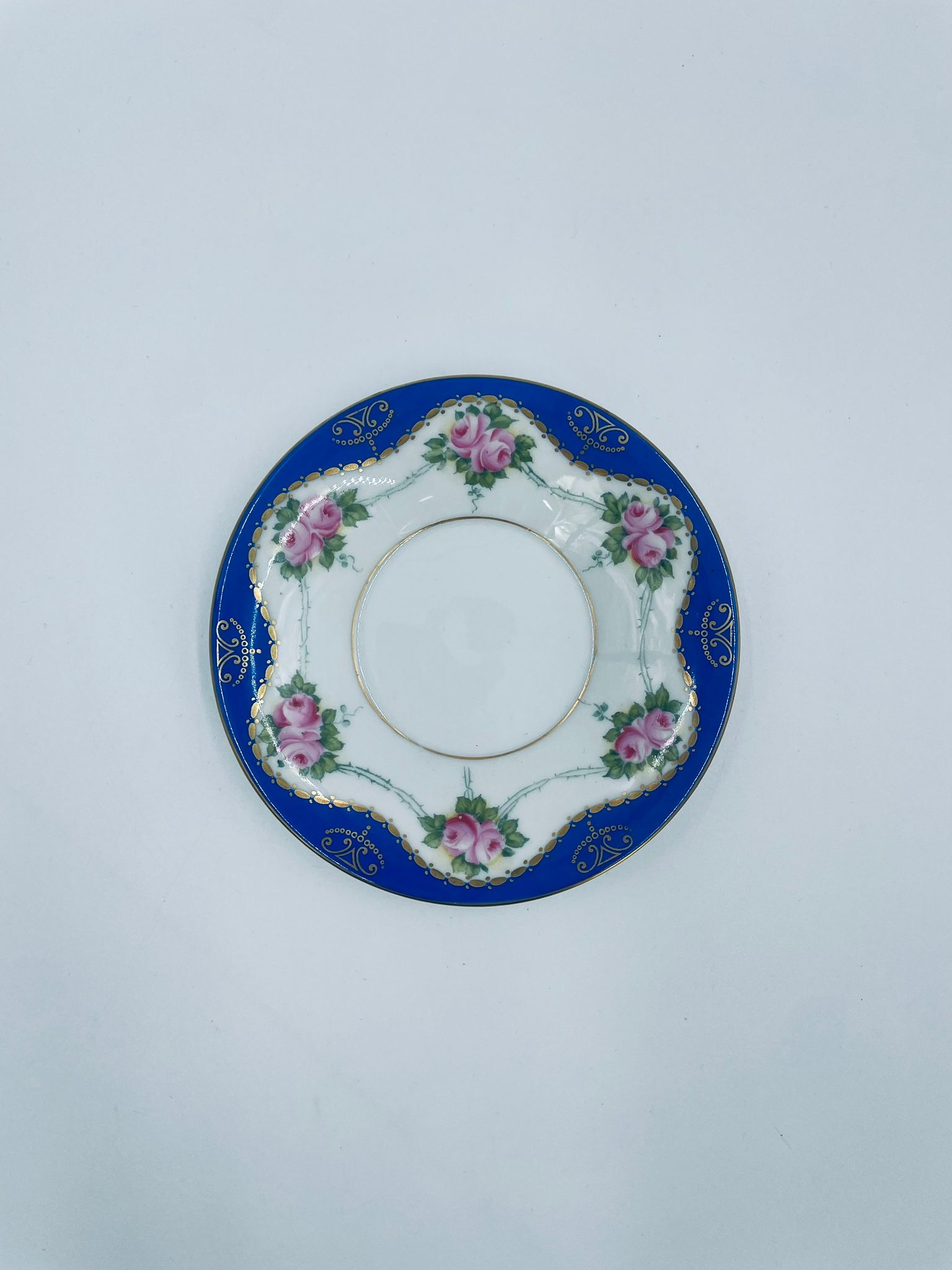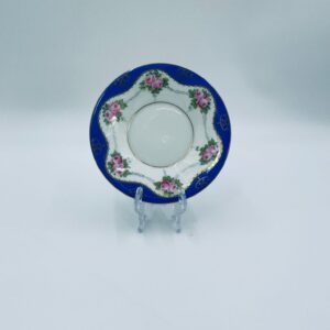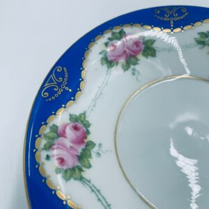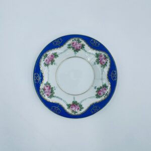 Spodek pod filiżankę wytwórni Tirschenreuth, wykonany z wysokiej jakości białej porcelany. Spodek ozdobiony dekorem różowych kwiatów, szerokim kobaltowym pasem oraz złotymi akcentami.