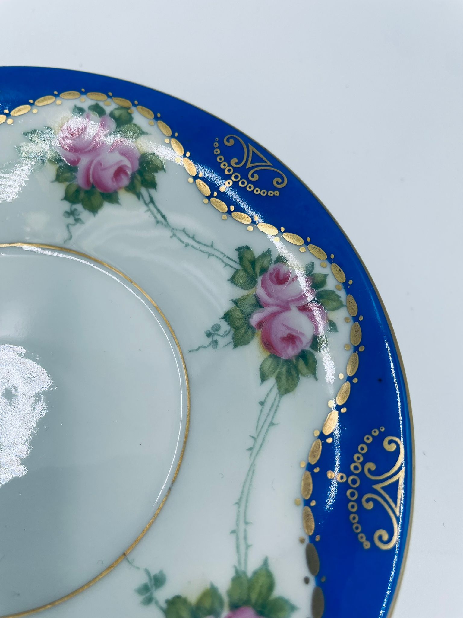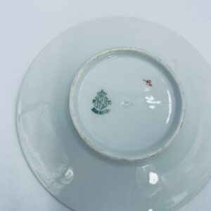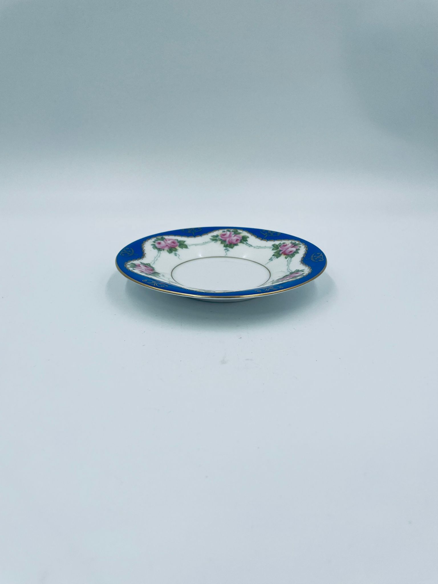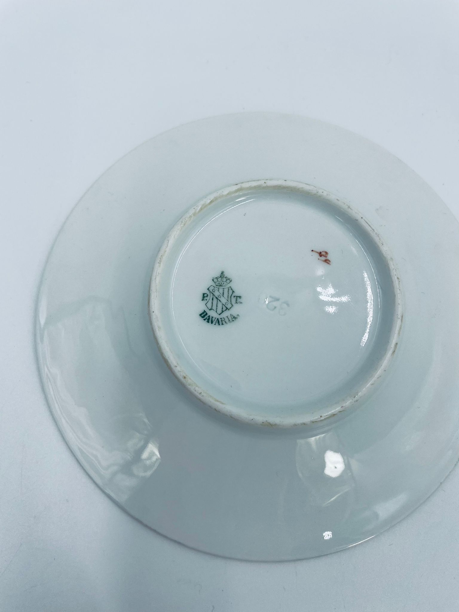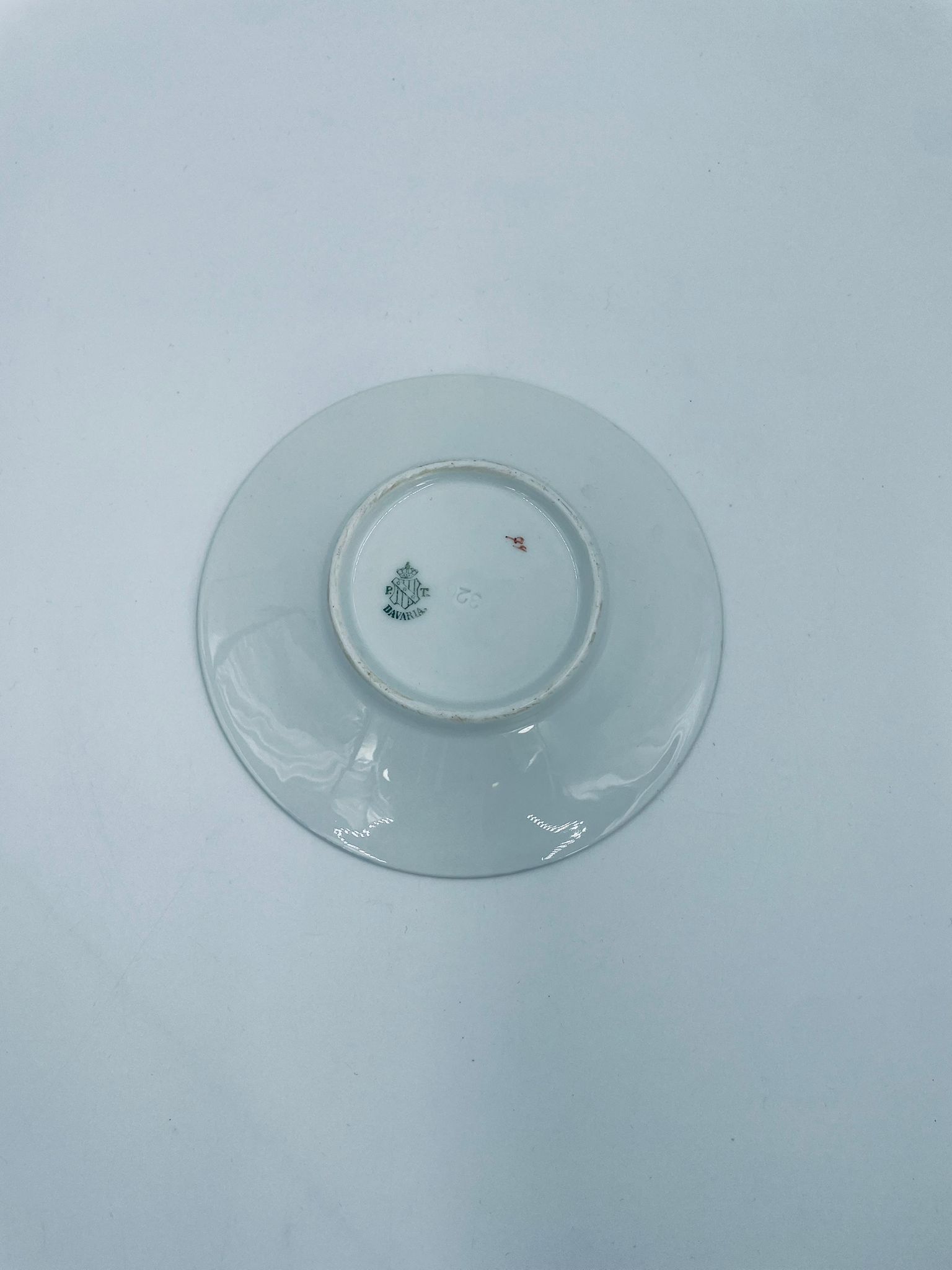 Spodek pod filiżankę wytwórni Tirschenreuth, wykonany z wysokiej jakości białej porcelany. Spodek ozdobiony dekorem różowych kwiatów, szerokim kobaltowym pasem oraz złotymi akcentami.