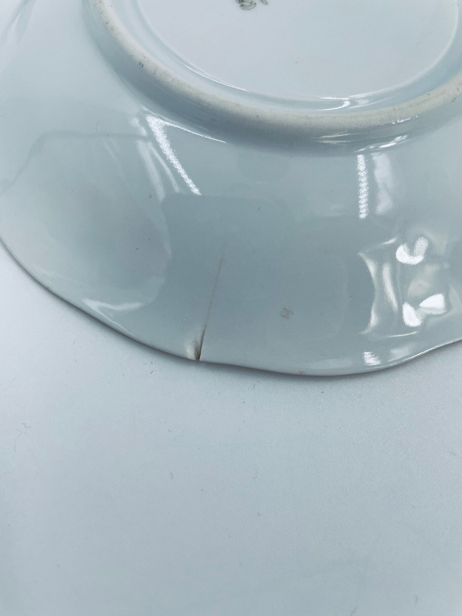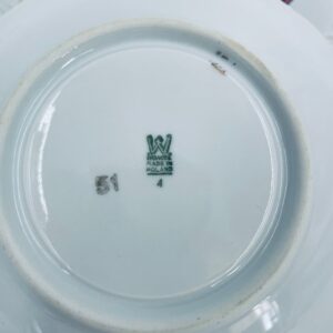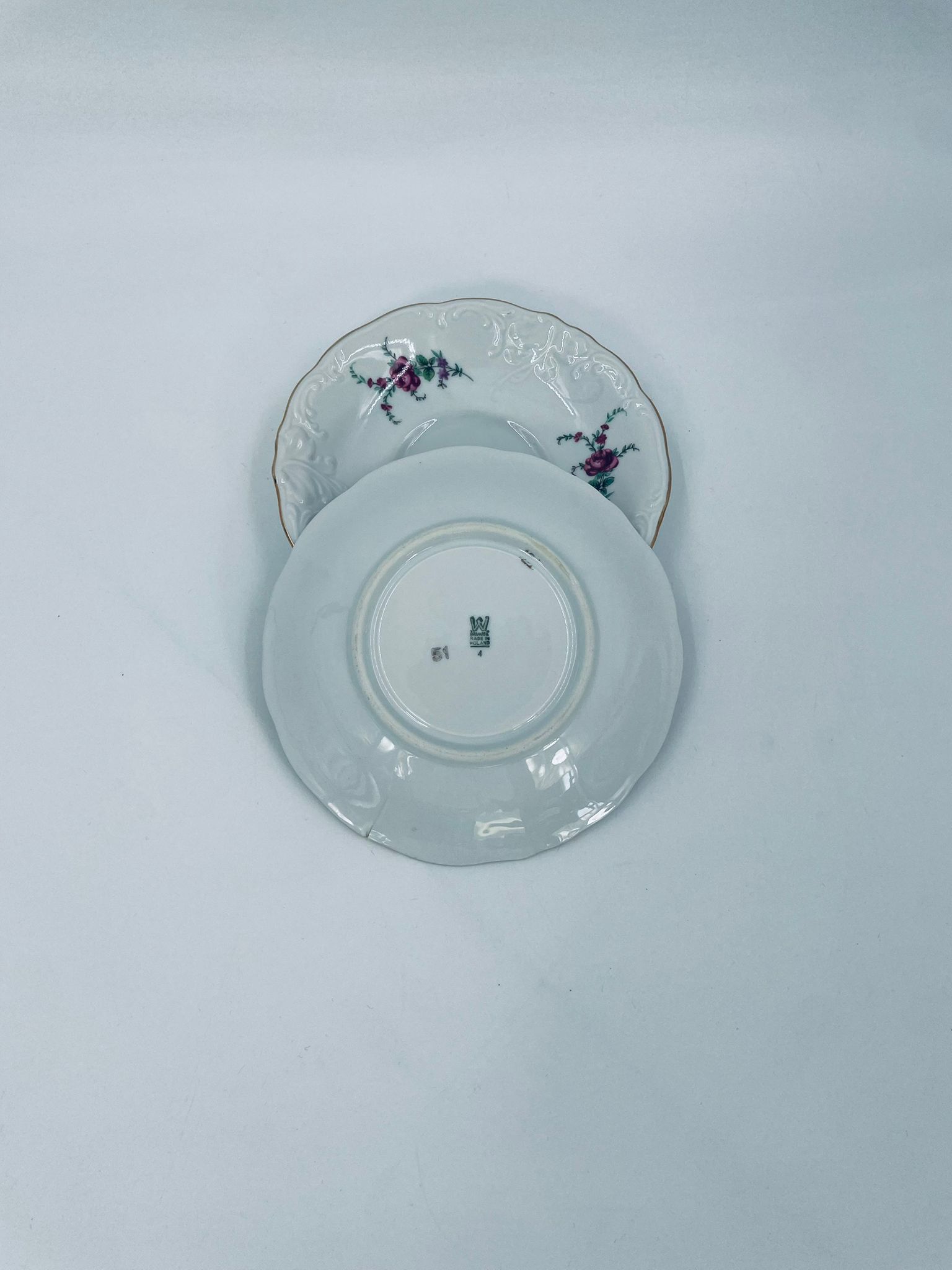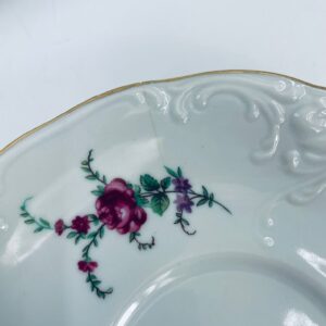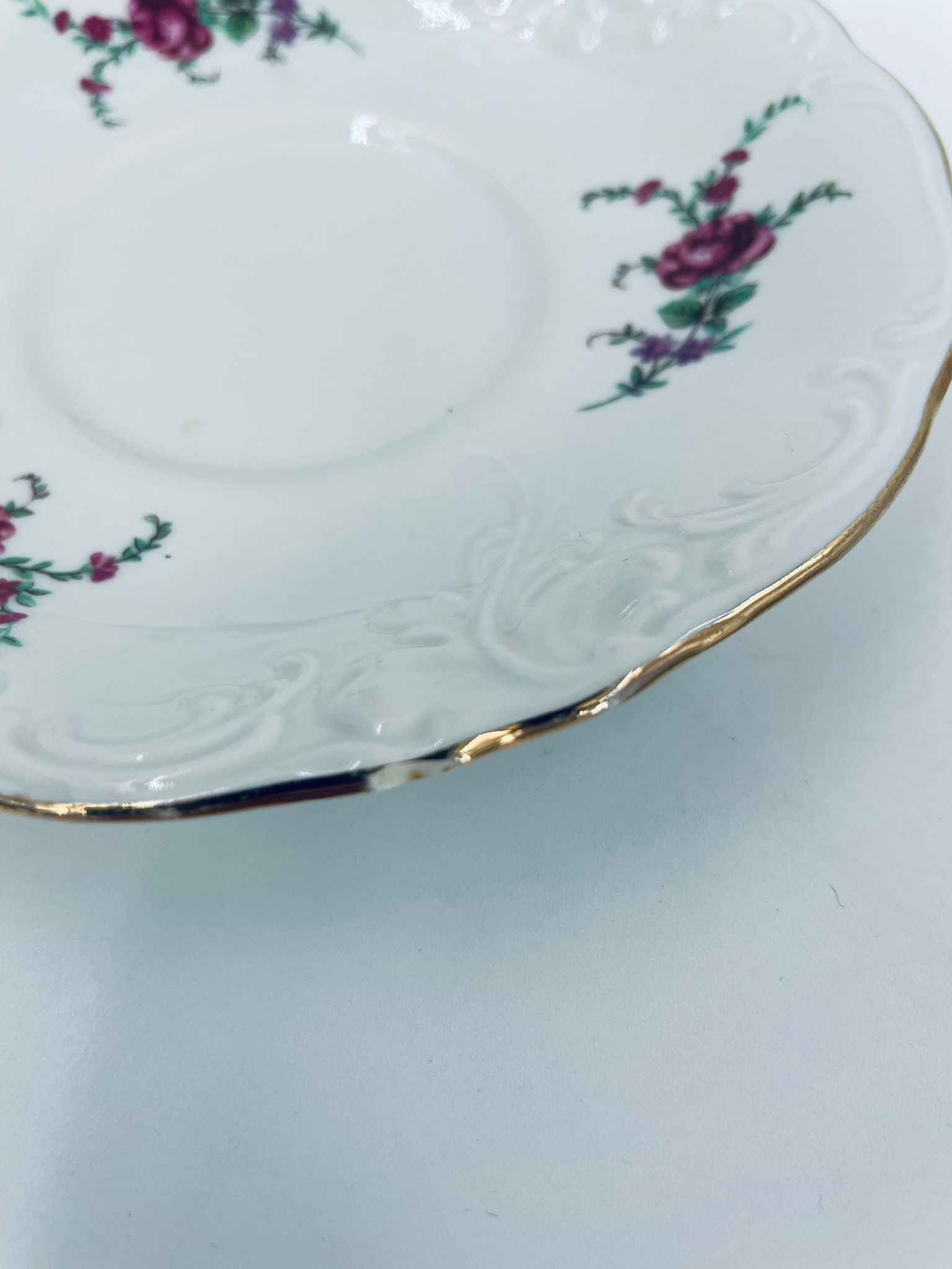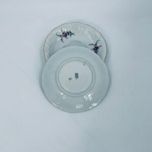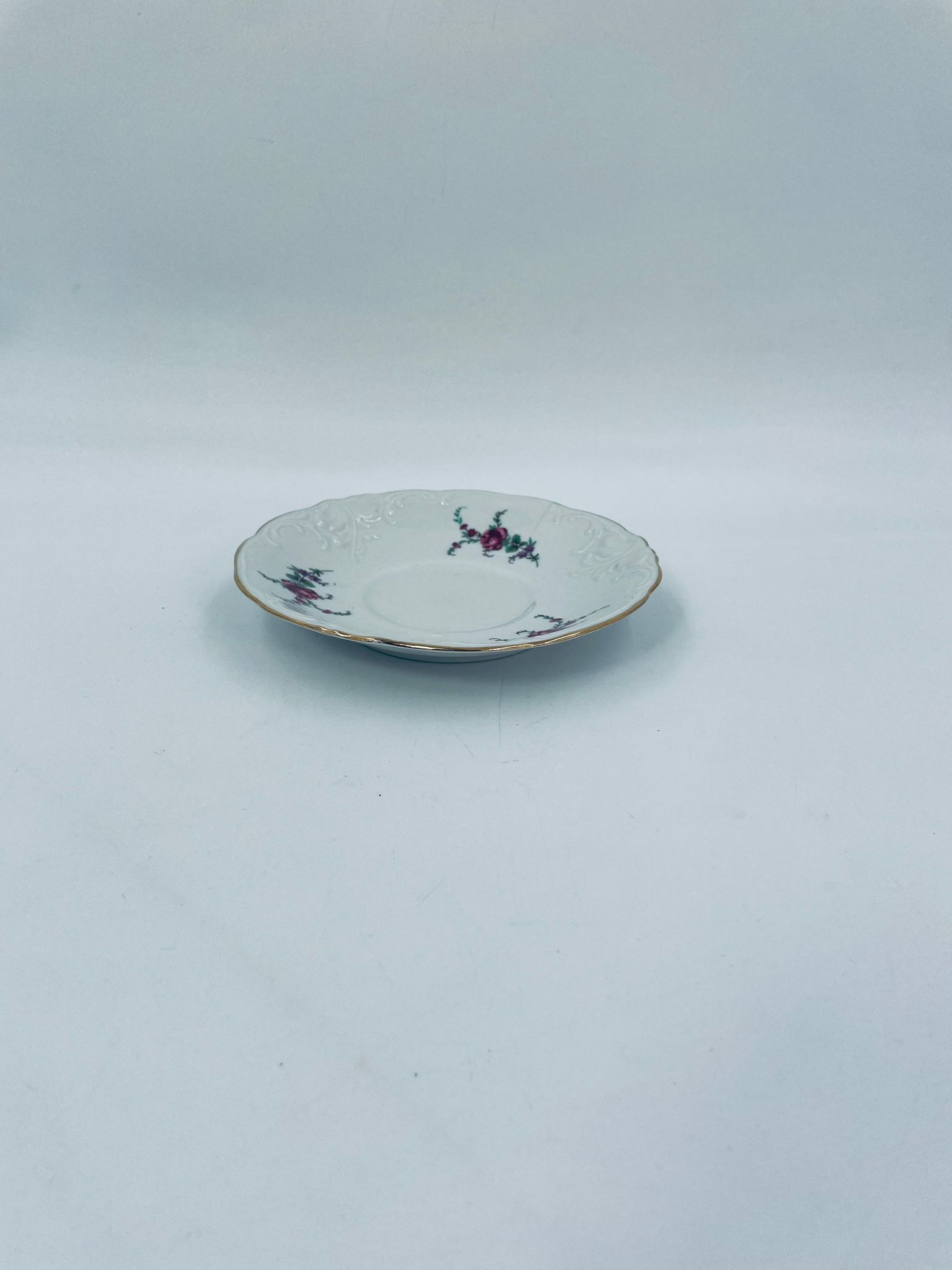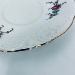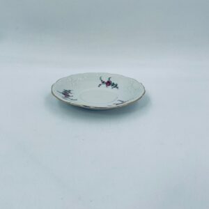 Spodek pod filiżankę Polskiej wytwórni Wawel, wykonany z wysokiej jakości białej porcelany. Charakteryzuje się pięknym motywem kwiatowym, ozdobnymi reliefami oraz złoceniem na falowanym rancie. Posiada uszczerbek oraz pęknięcie.