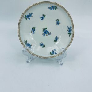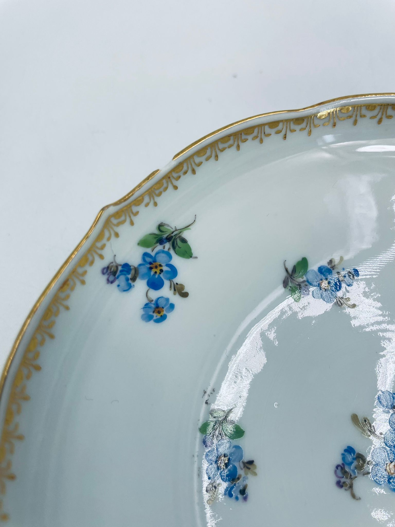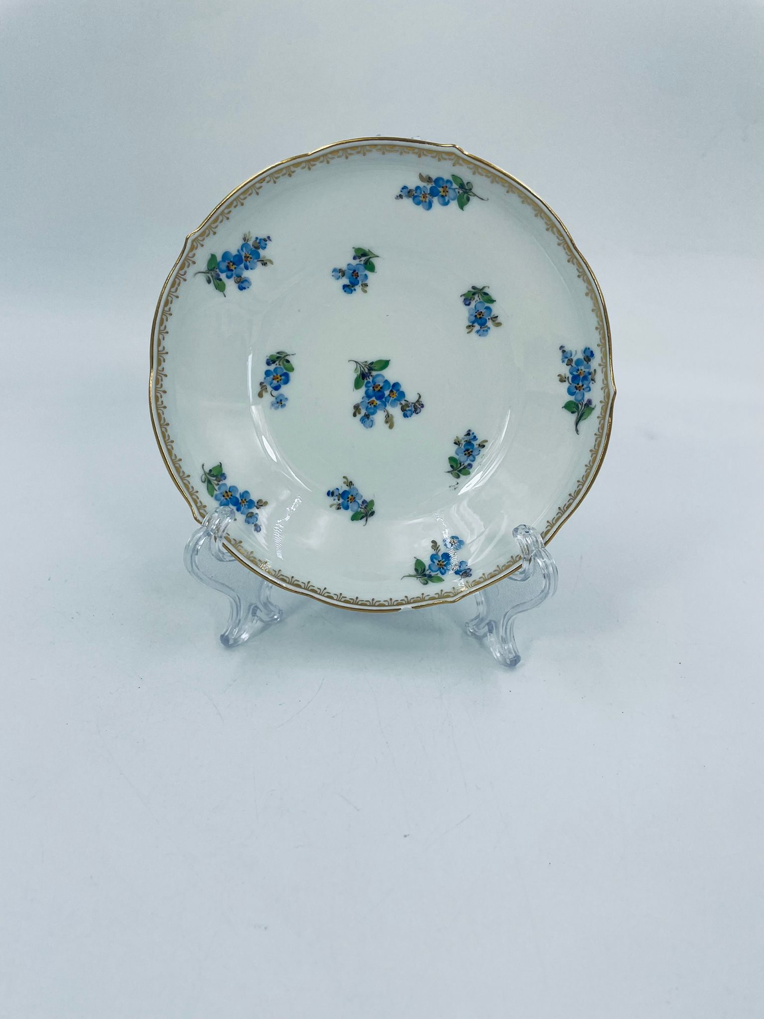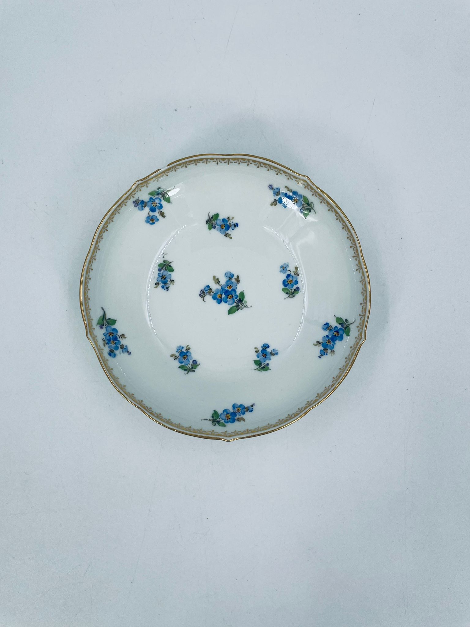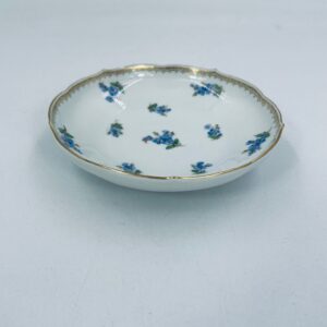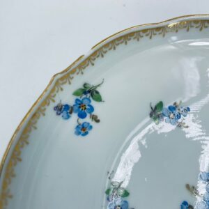 Spodek pod filiżankę z porcelany miśnieńskiej. Wysokiej jakości porcelana miśnieńska w białym kolorze ze wzorem małych kwiatków niezapominajek, złotymi wzorami w górnej części spodka, wykończona złoceniem na falistym obrzeżu. Spodek posiada uszczerbek na rancie.