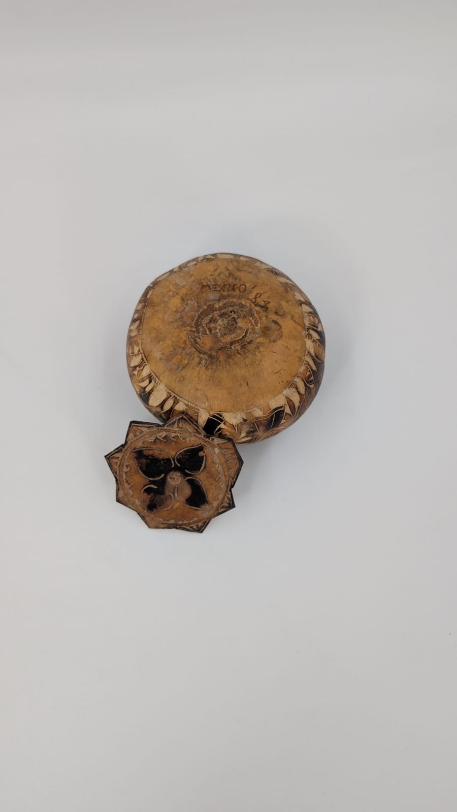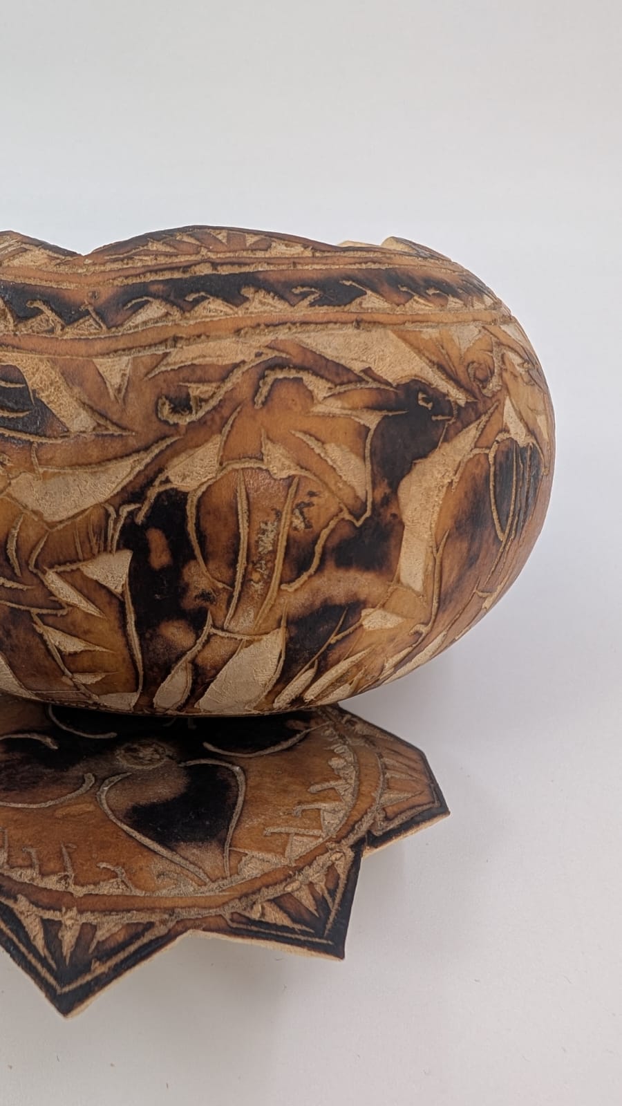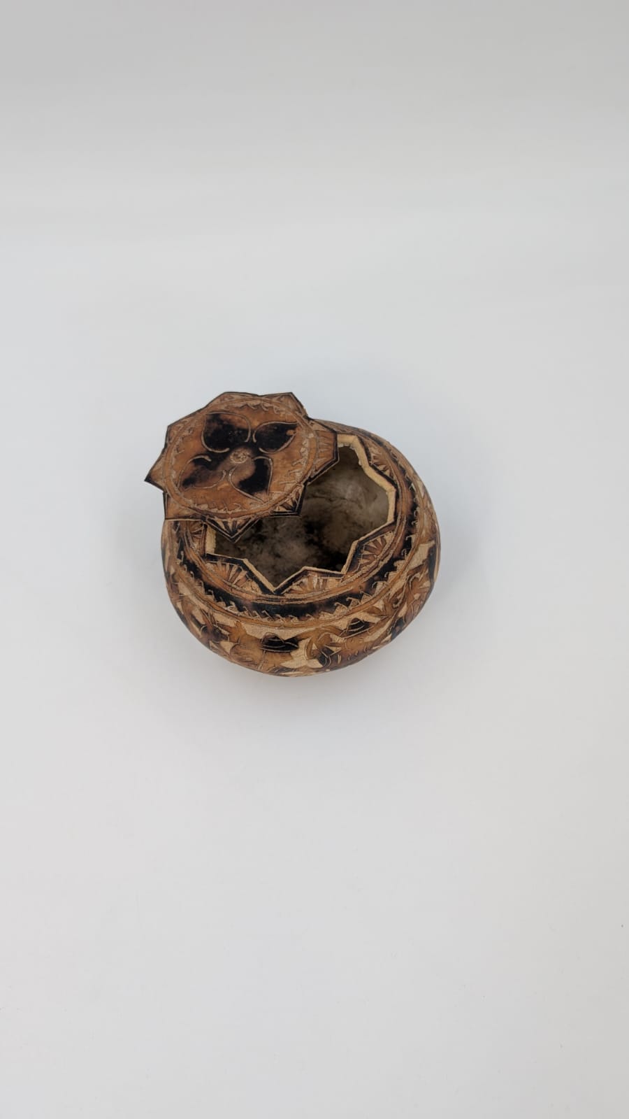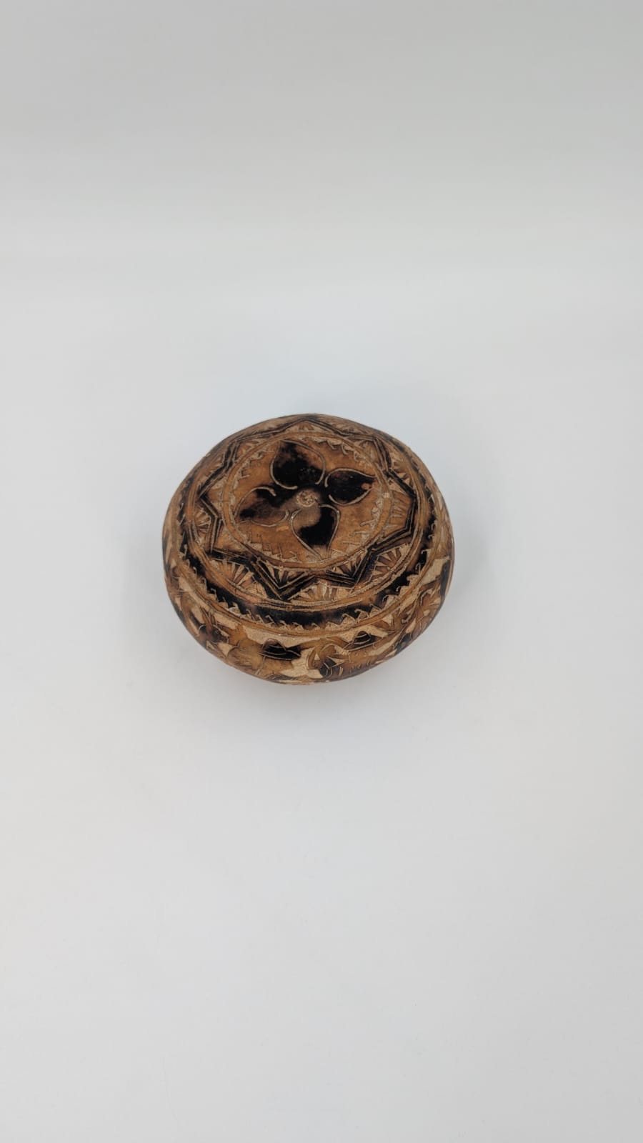 Stara dynia Peruwiańska Mexico z 1984r wykonana z tykwy w brązowym kolorze. Misa z przykryciem w ksztalcie gwiazdy, ręcznie rzeźbiona we wzory wiejskie, zwierząt, roślin i ludzi, a także we wzory geometryczne.