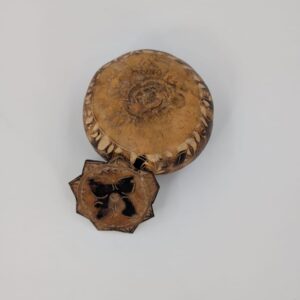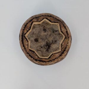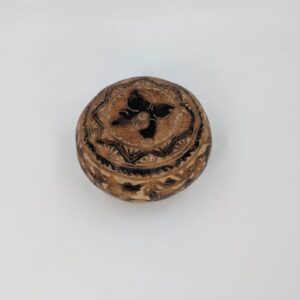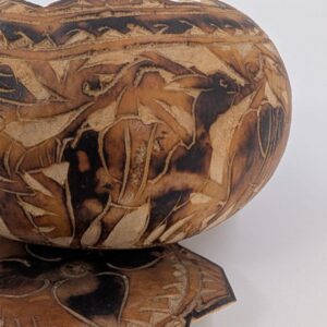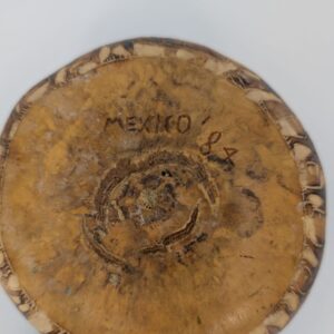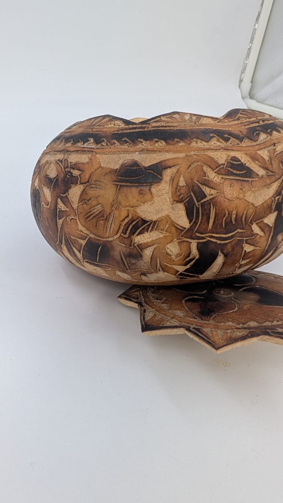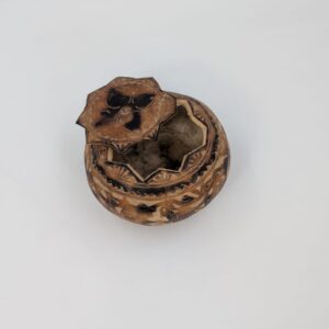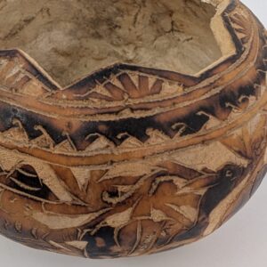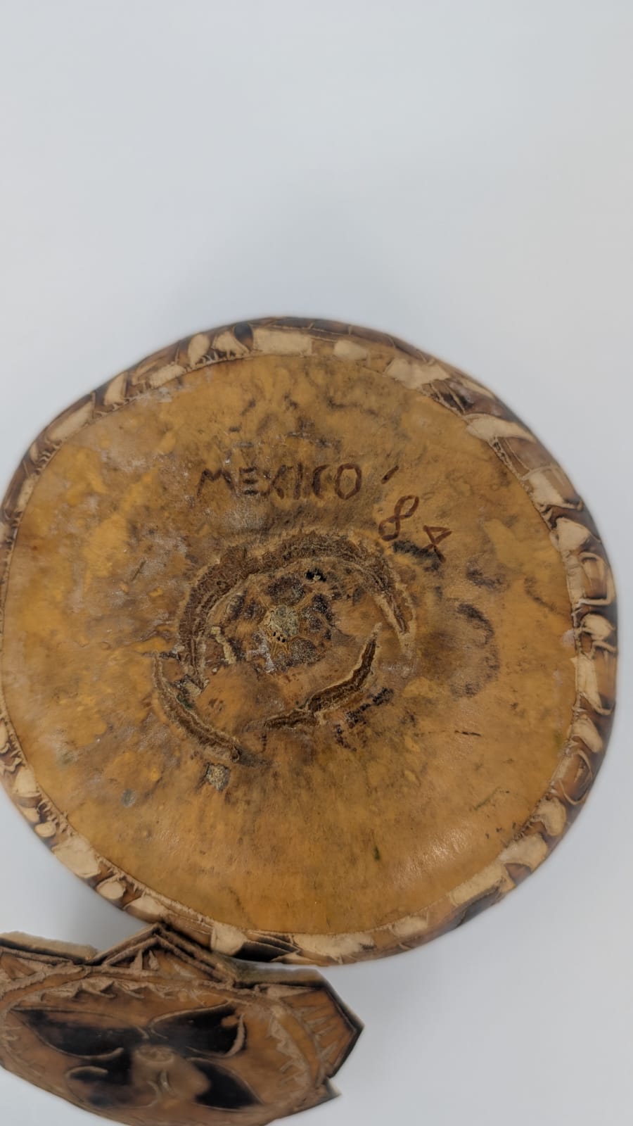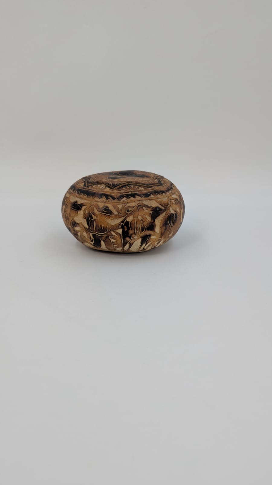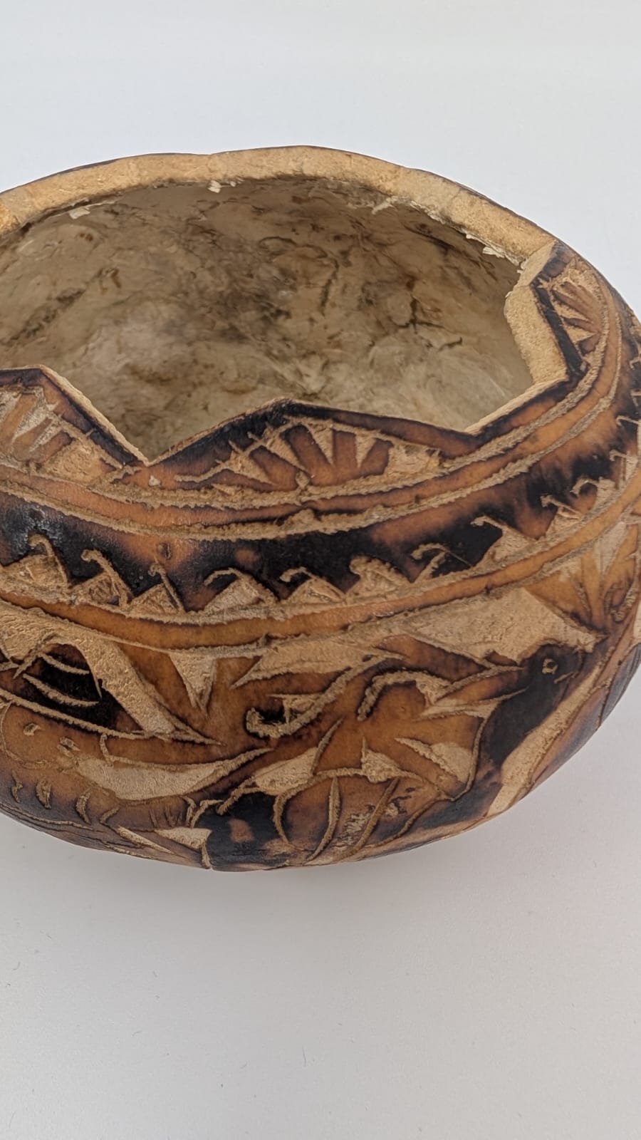 Stara dynia Peruwiańska Mexico z 1984r wykonana z tykwy w brązowym kolorze. Misa z przykryciem w ksztalcie gwiazdy, ręcznie rzeźbiona we wzory wiejskie, zwierząt, roślin i ludzi, a także we wzory geometryczne.