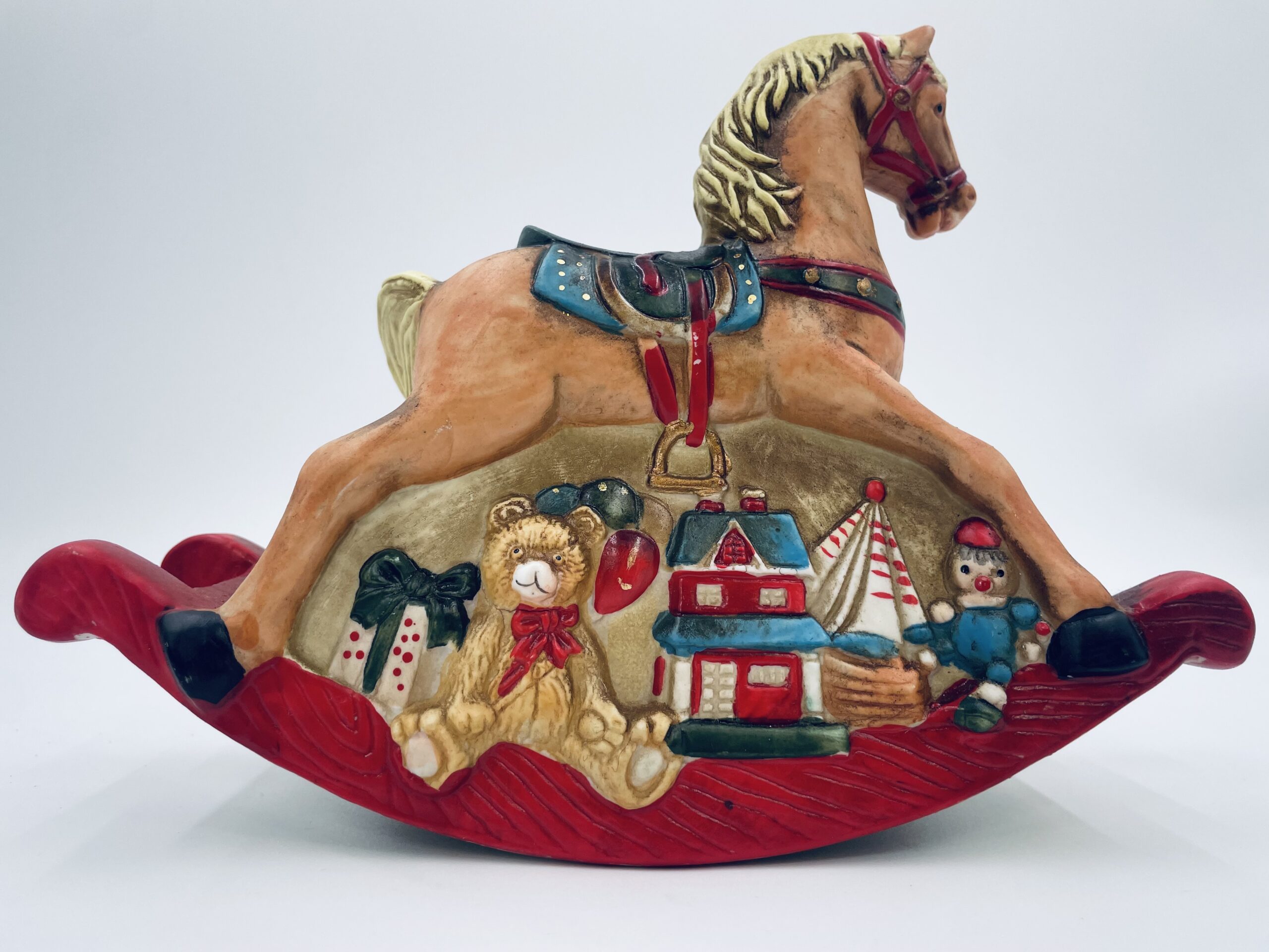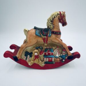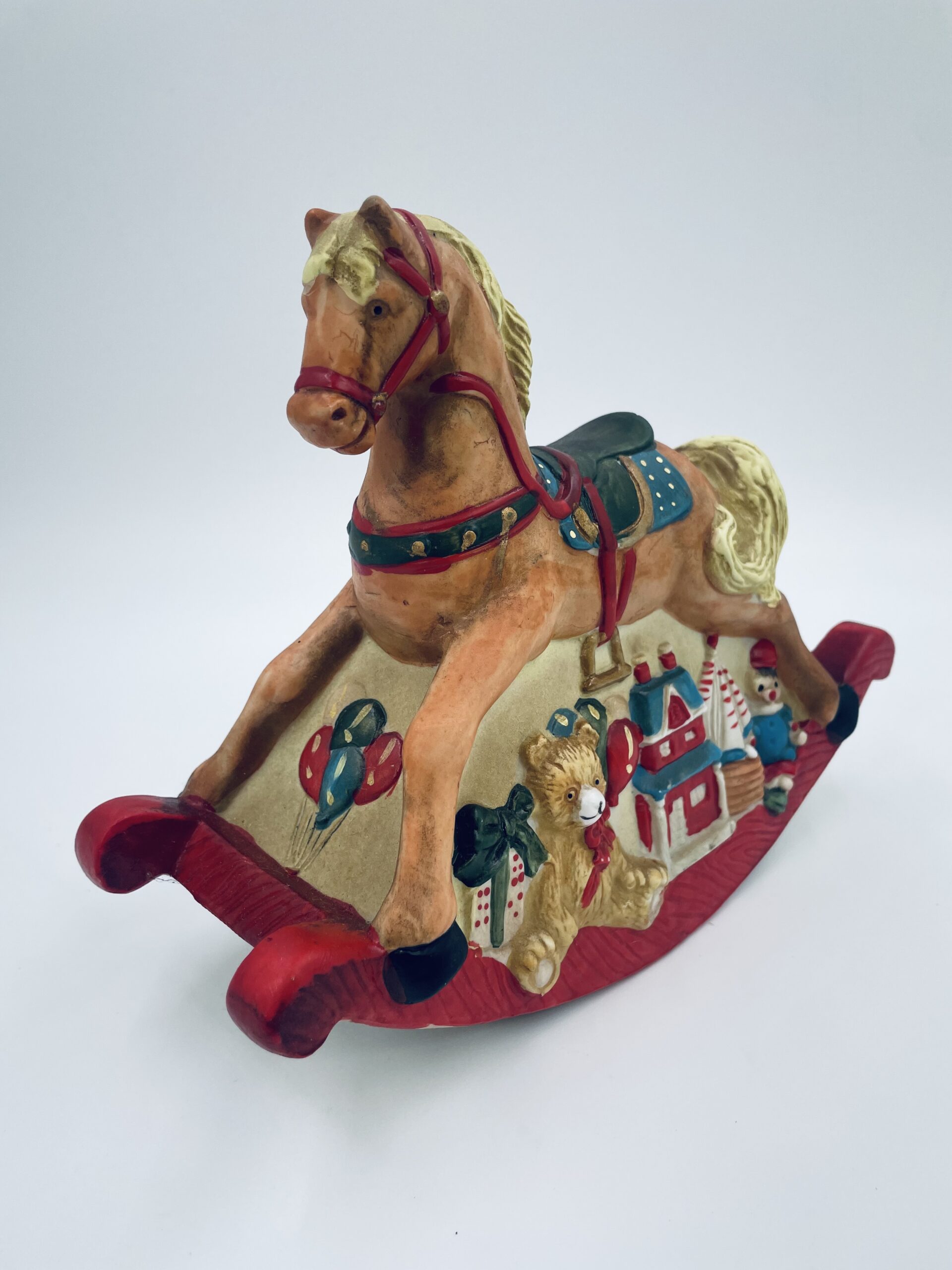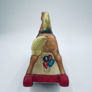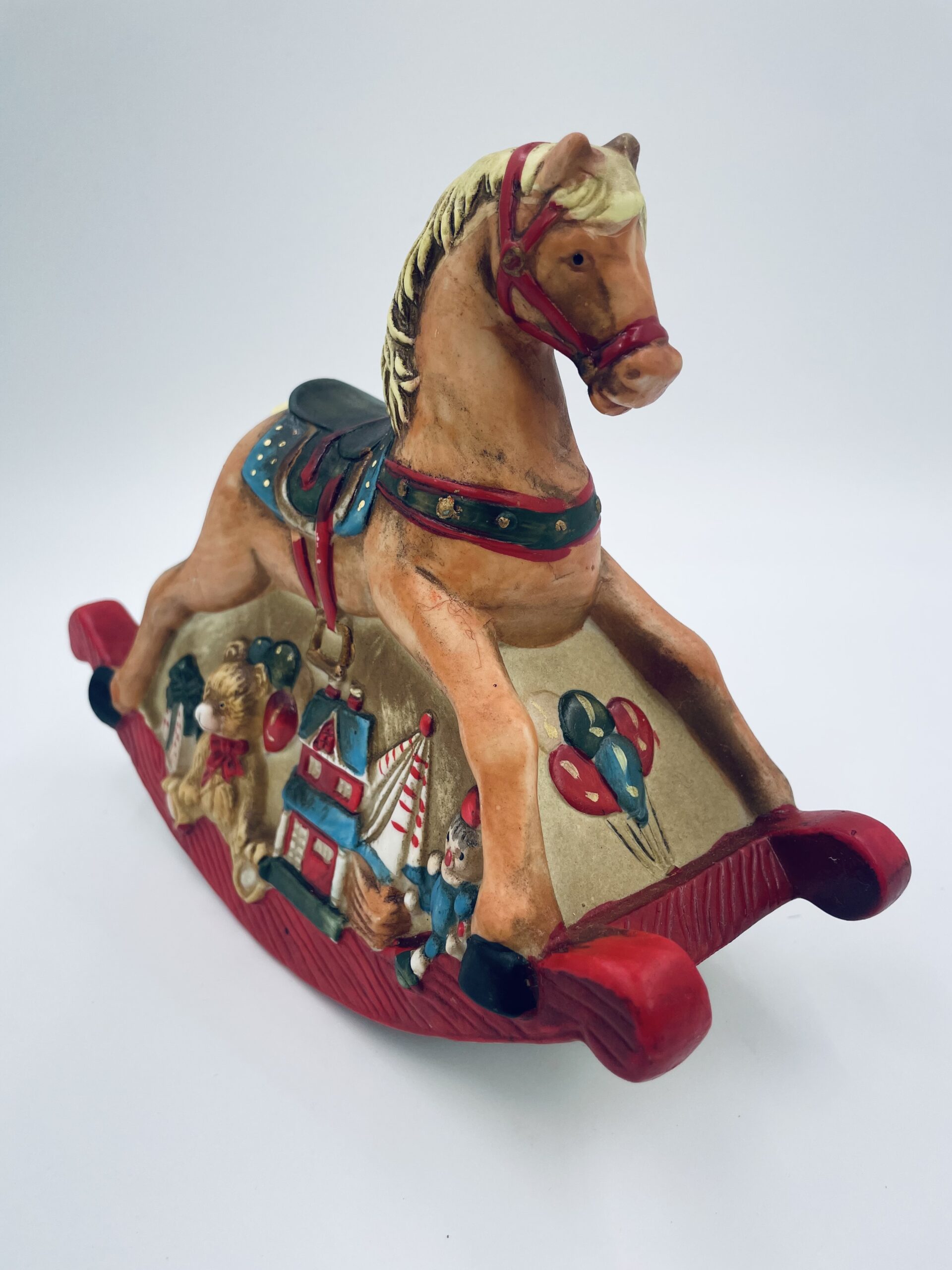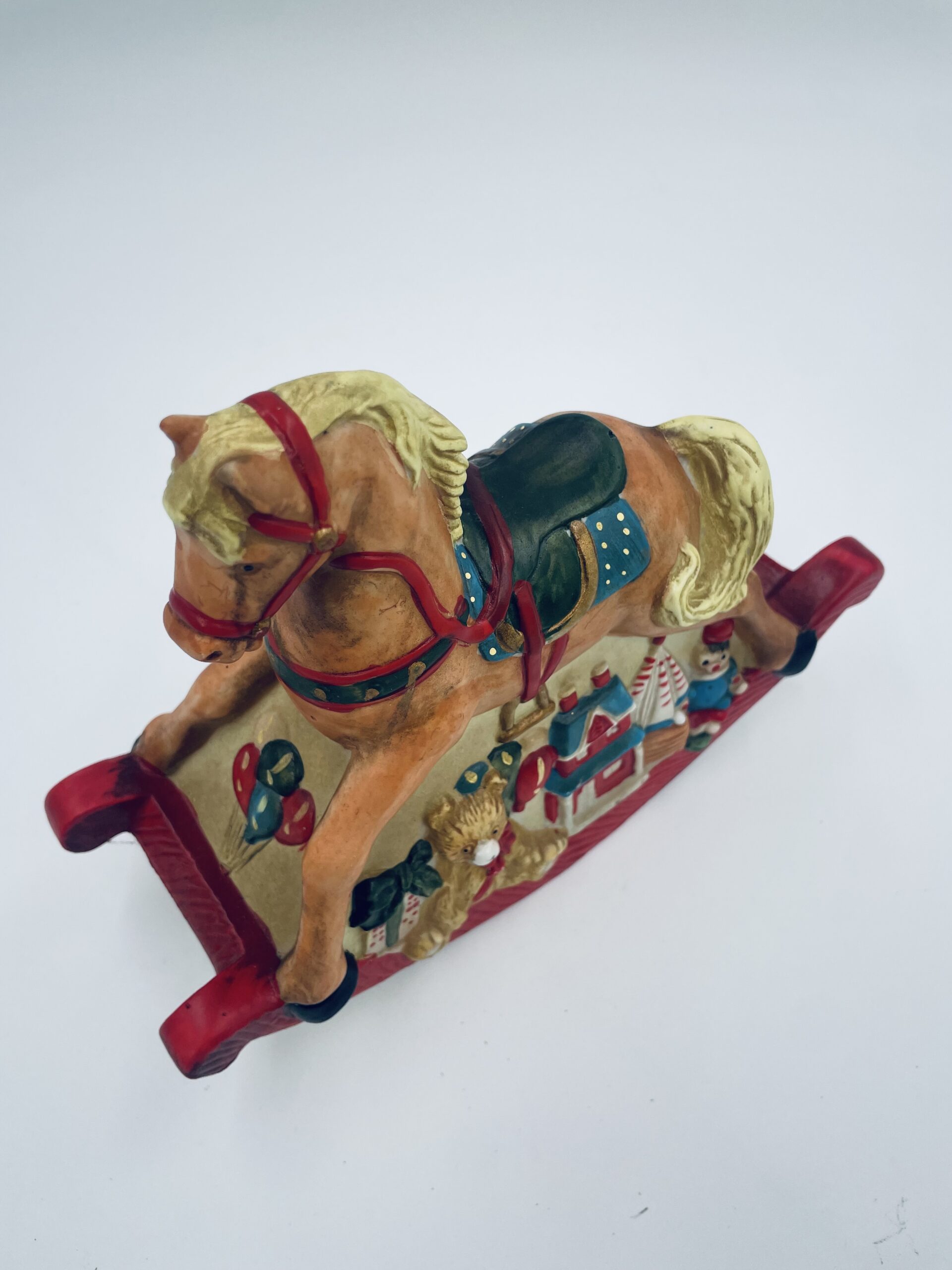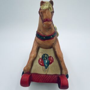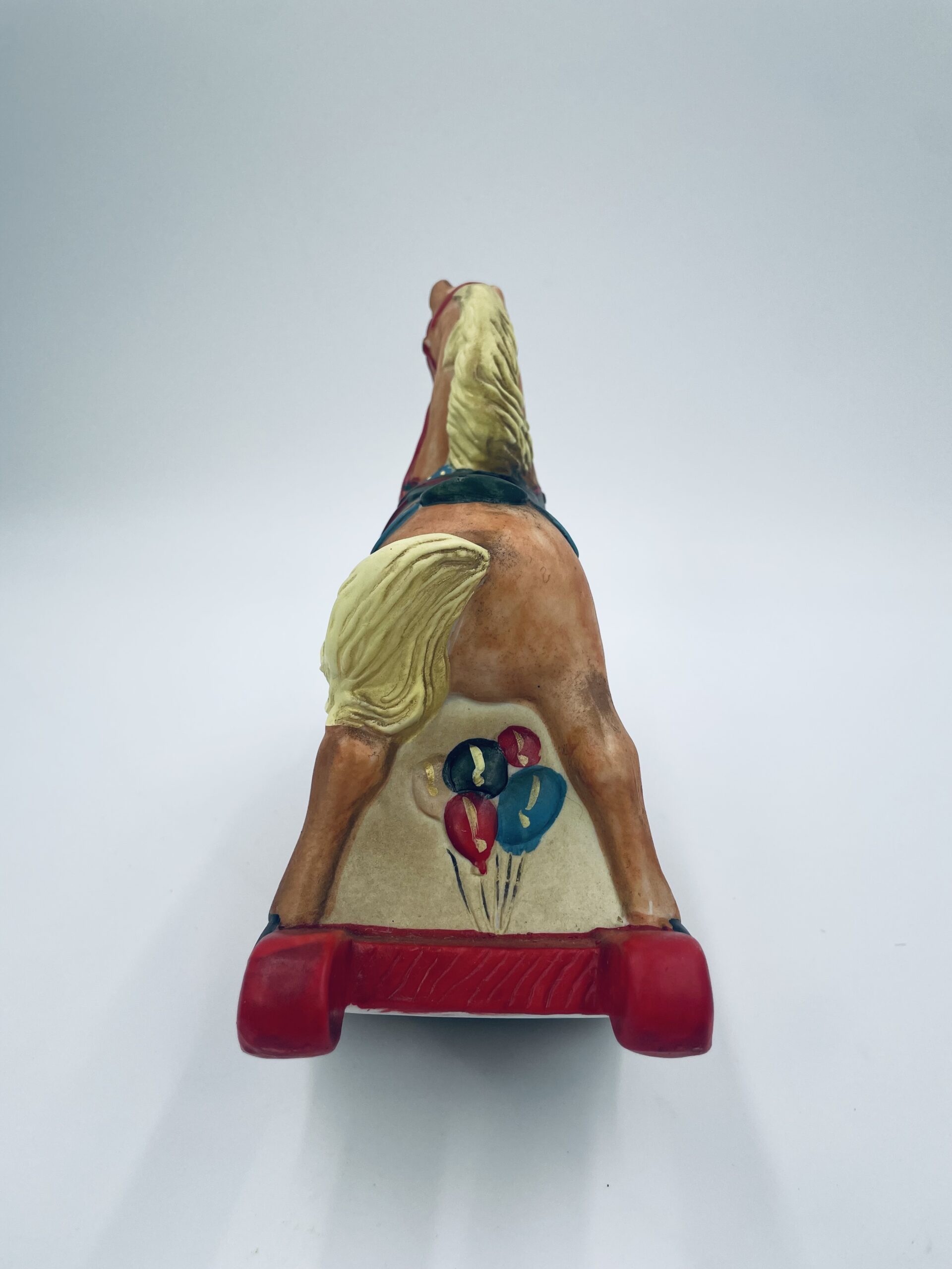 Stara porcelanowa pozytywka przedstawiająca konia na biegunach ręcznie malowana.