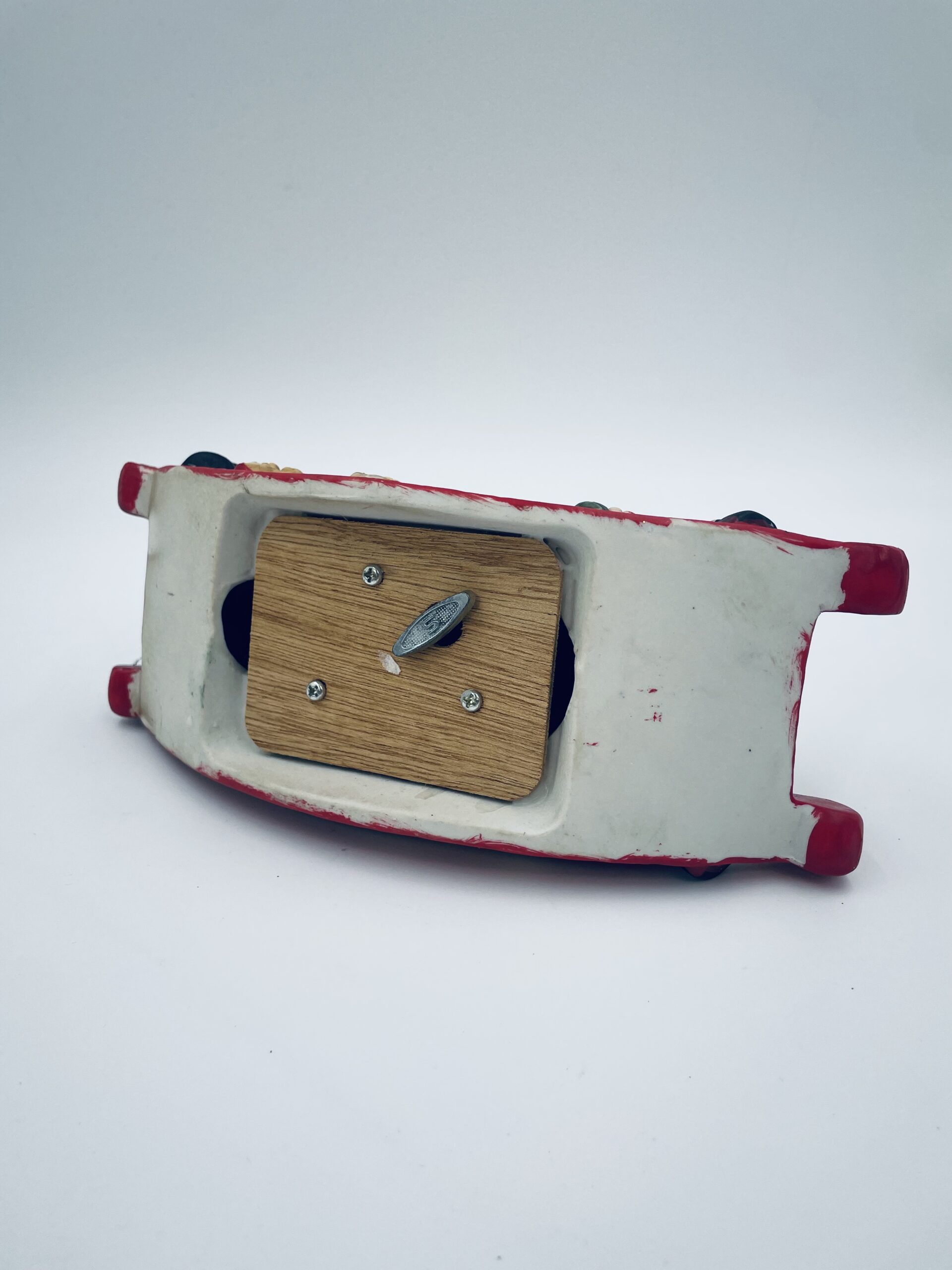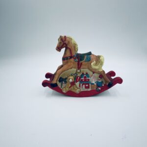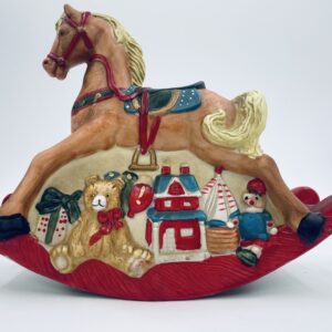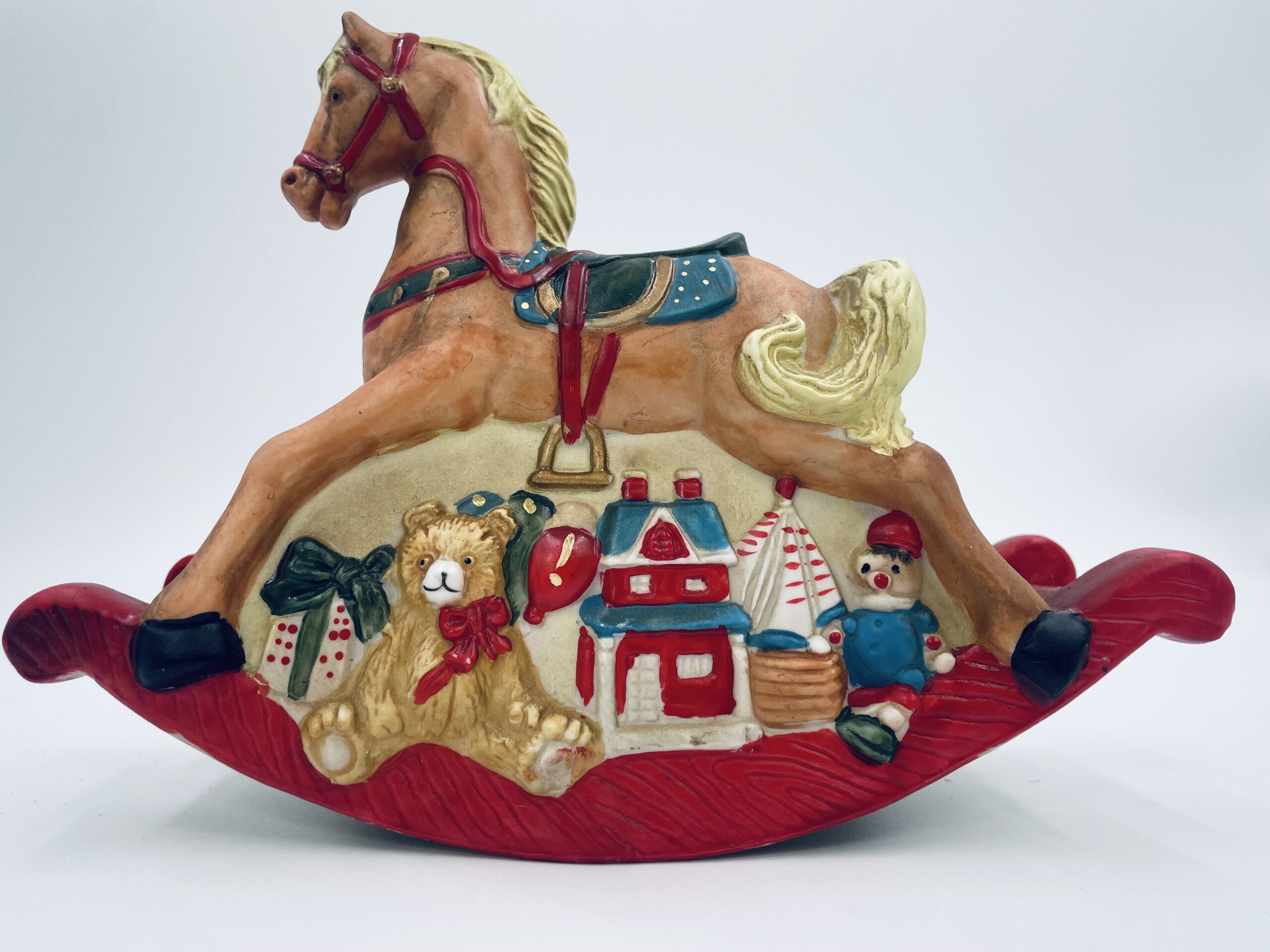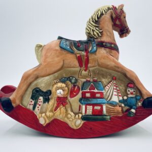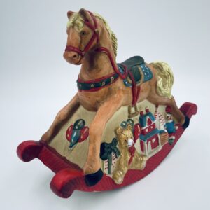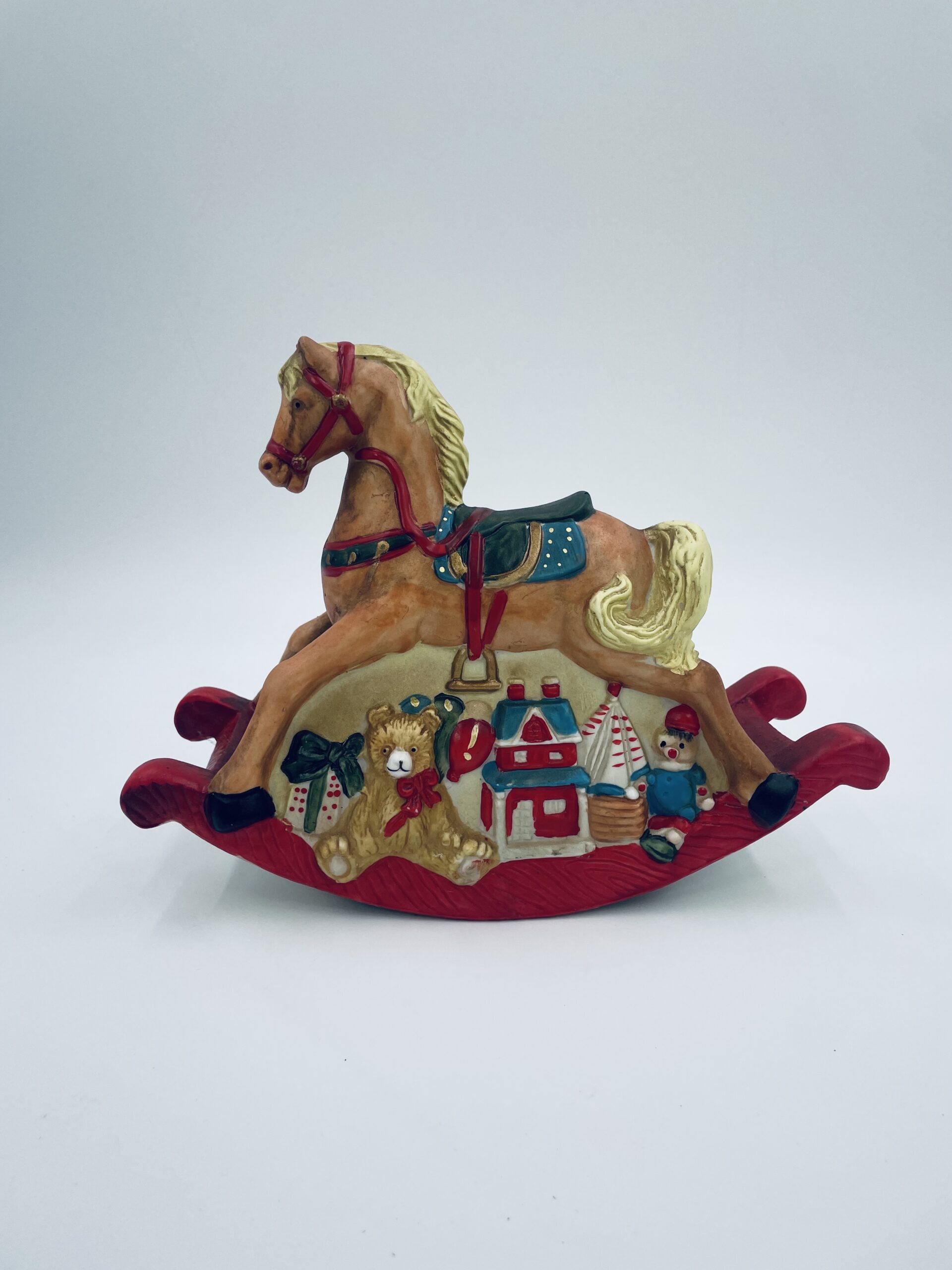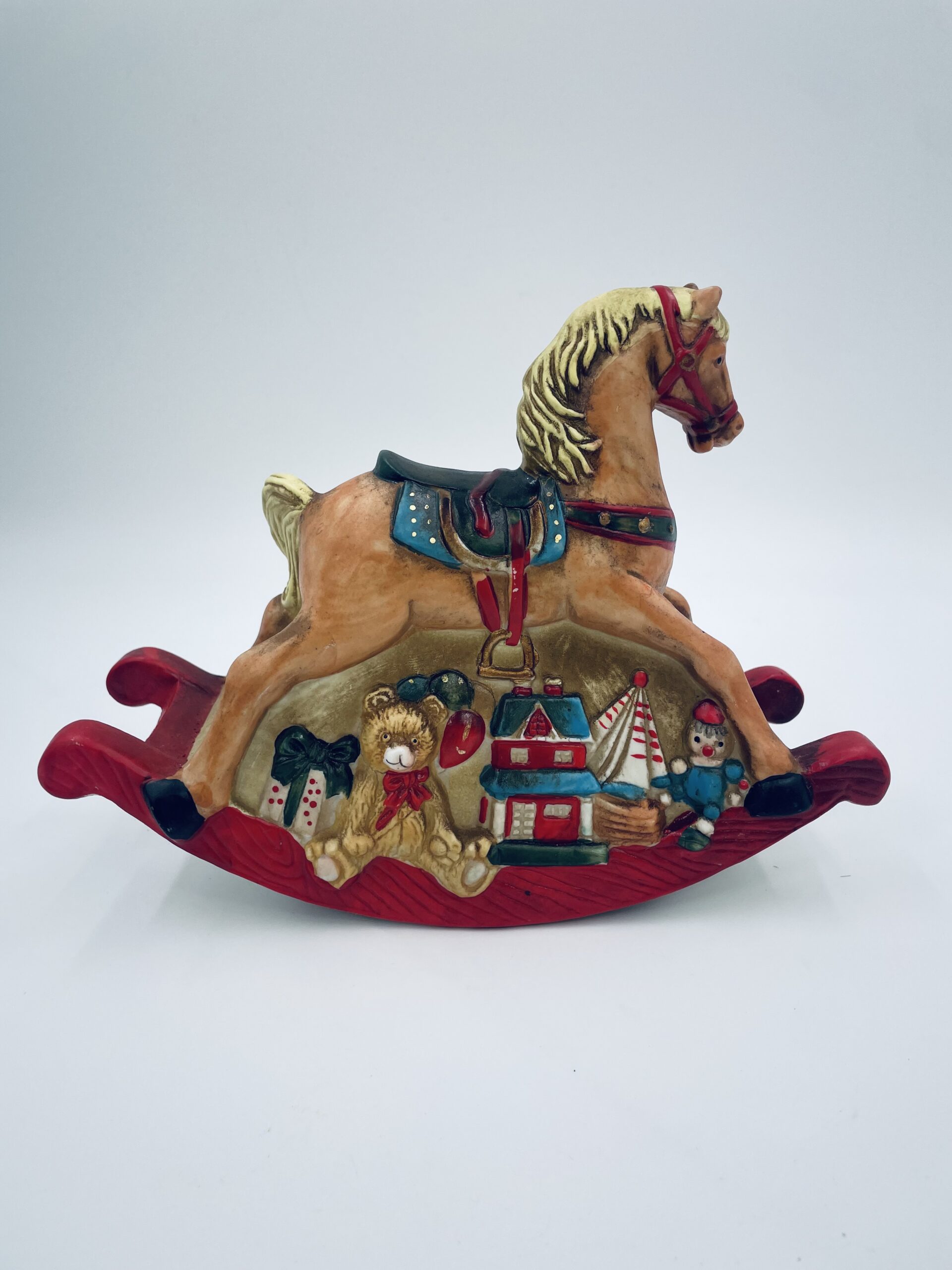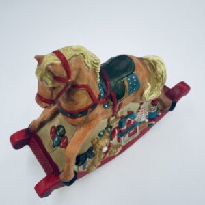 Stara porcelanowa pozytywka przedstawiająca konia na biegunach ręcznie malowana.