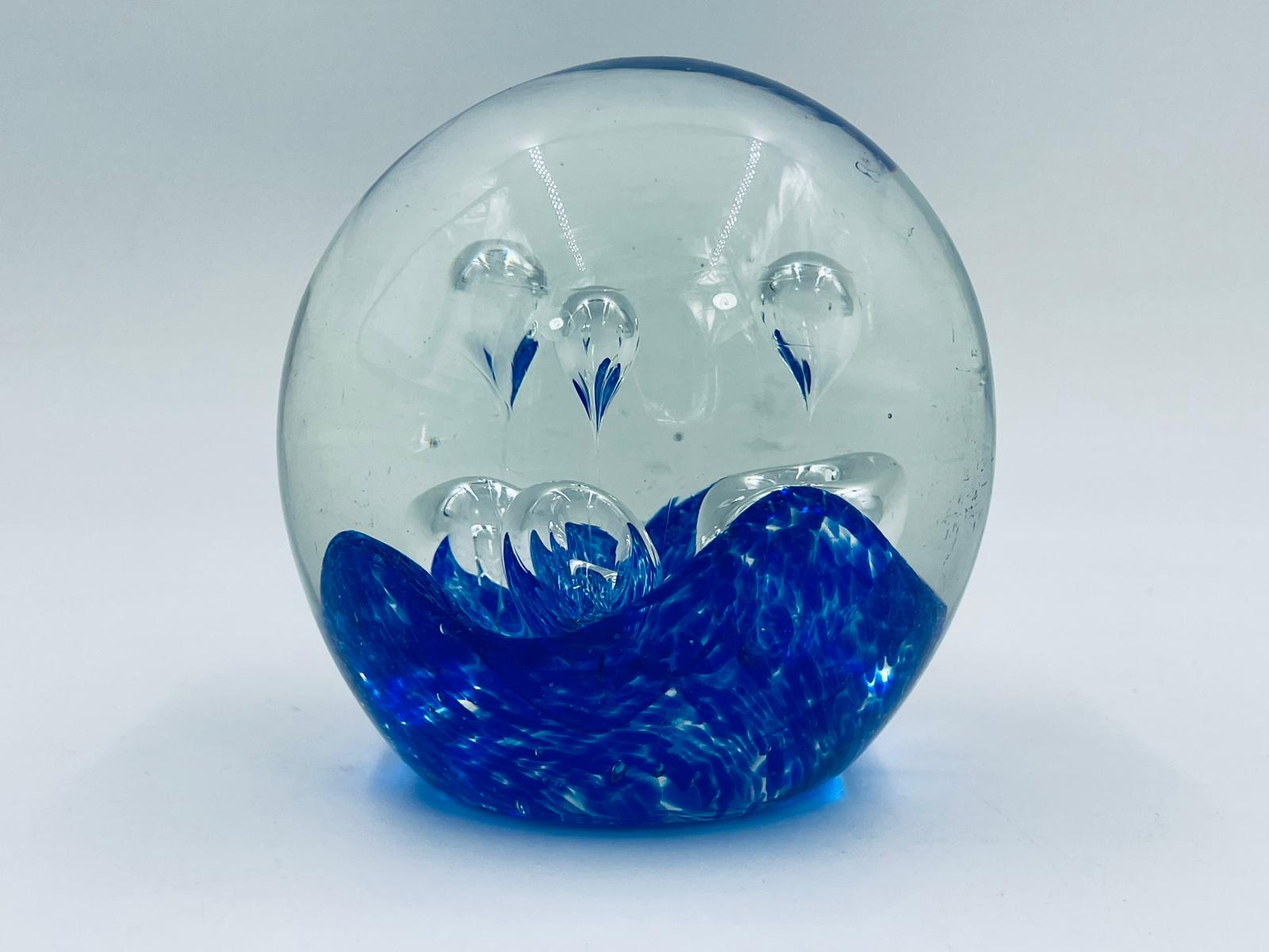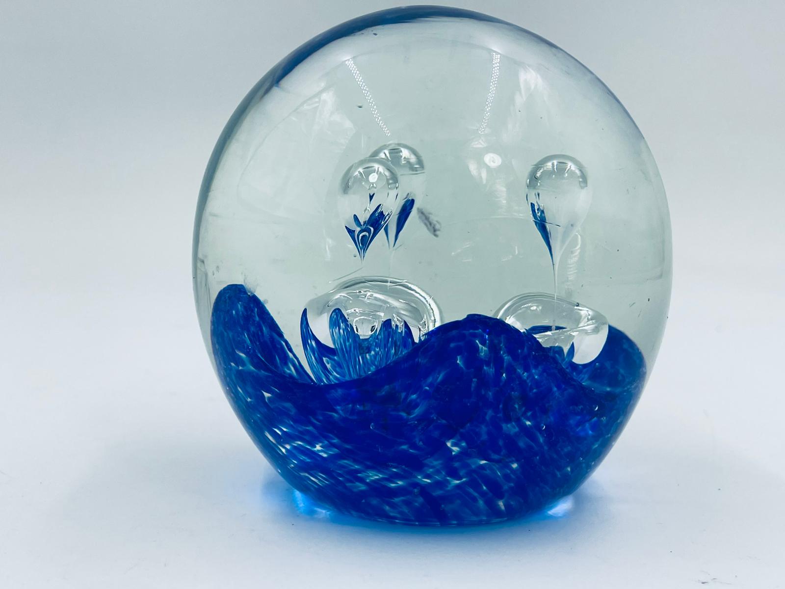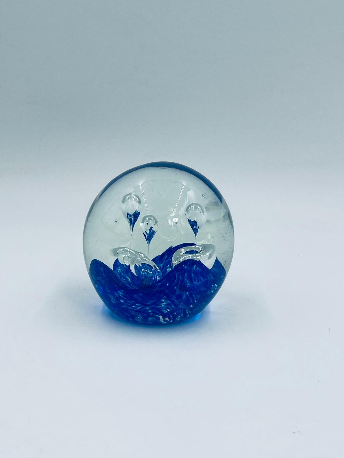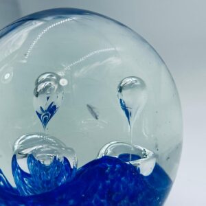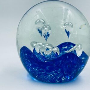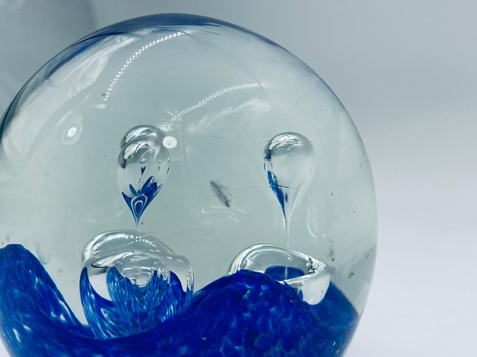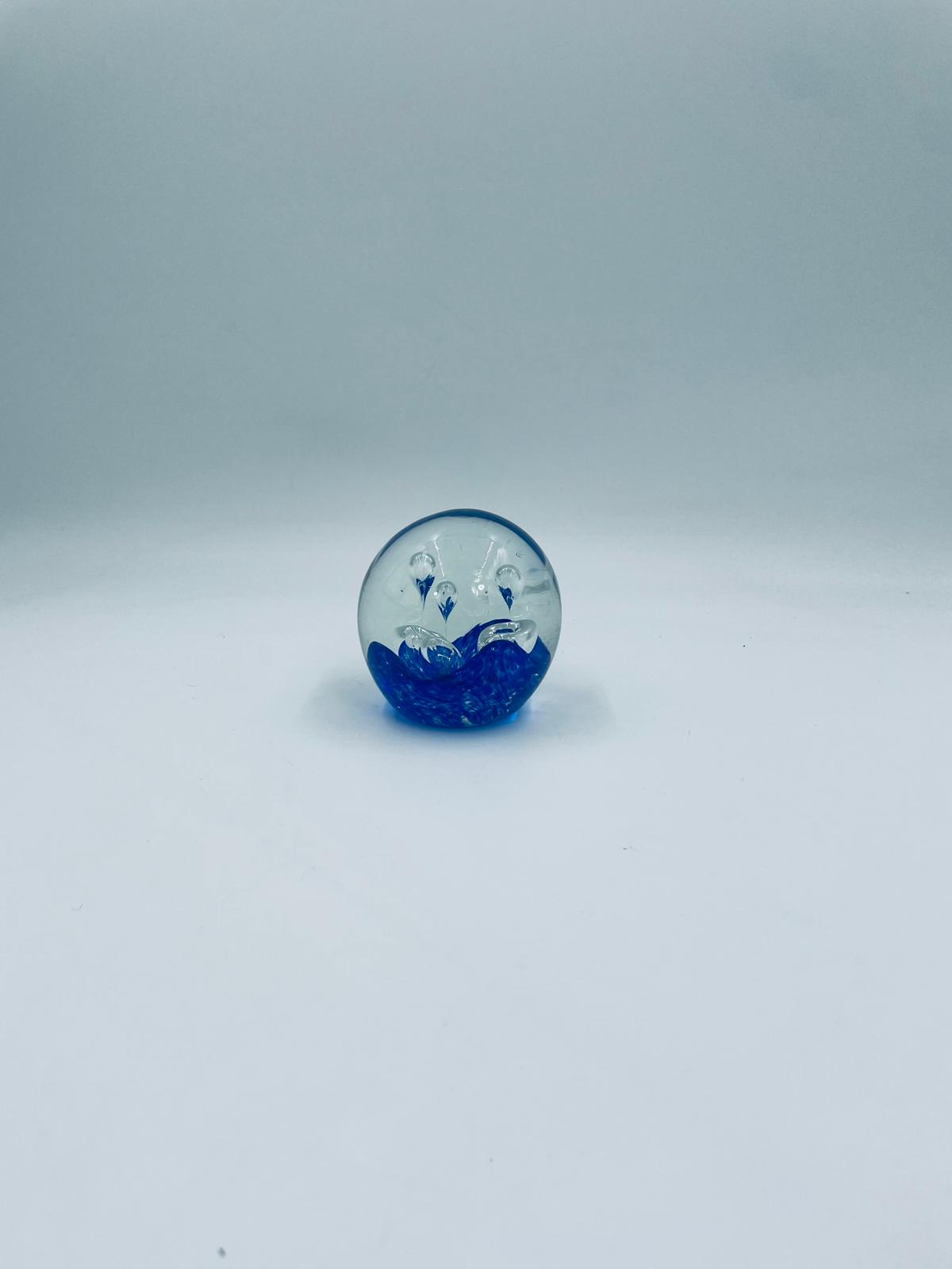 Przycisk wykonany z dobrej jakości przezroczystego szkła z niebieskimi wtrąceniami w masie tworzące dekoracyjne bąbelki w środku kuli.
