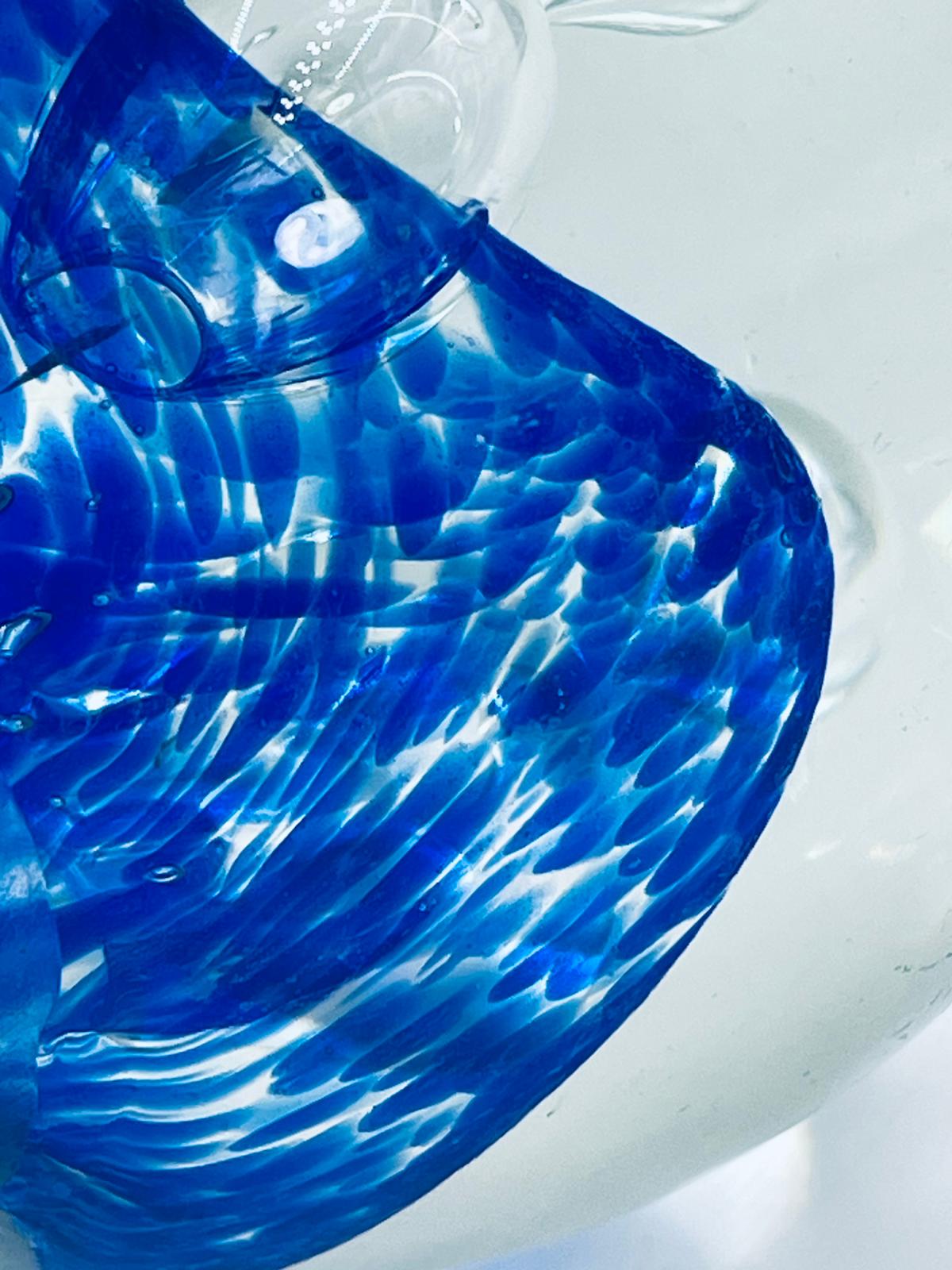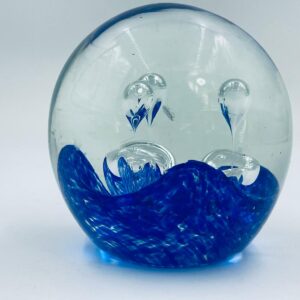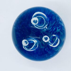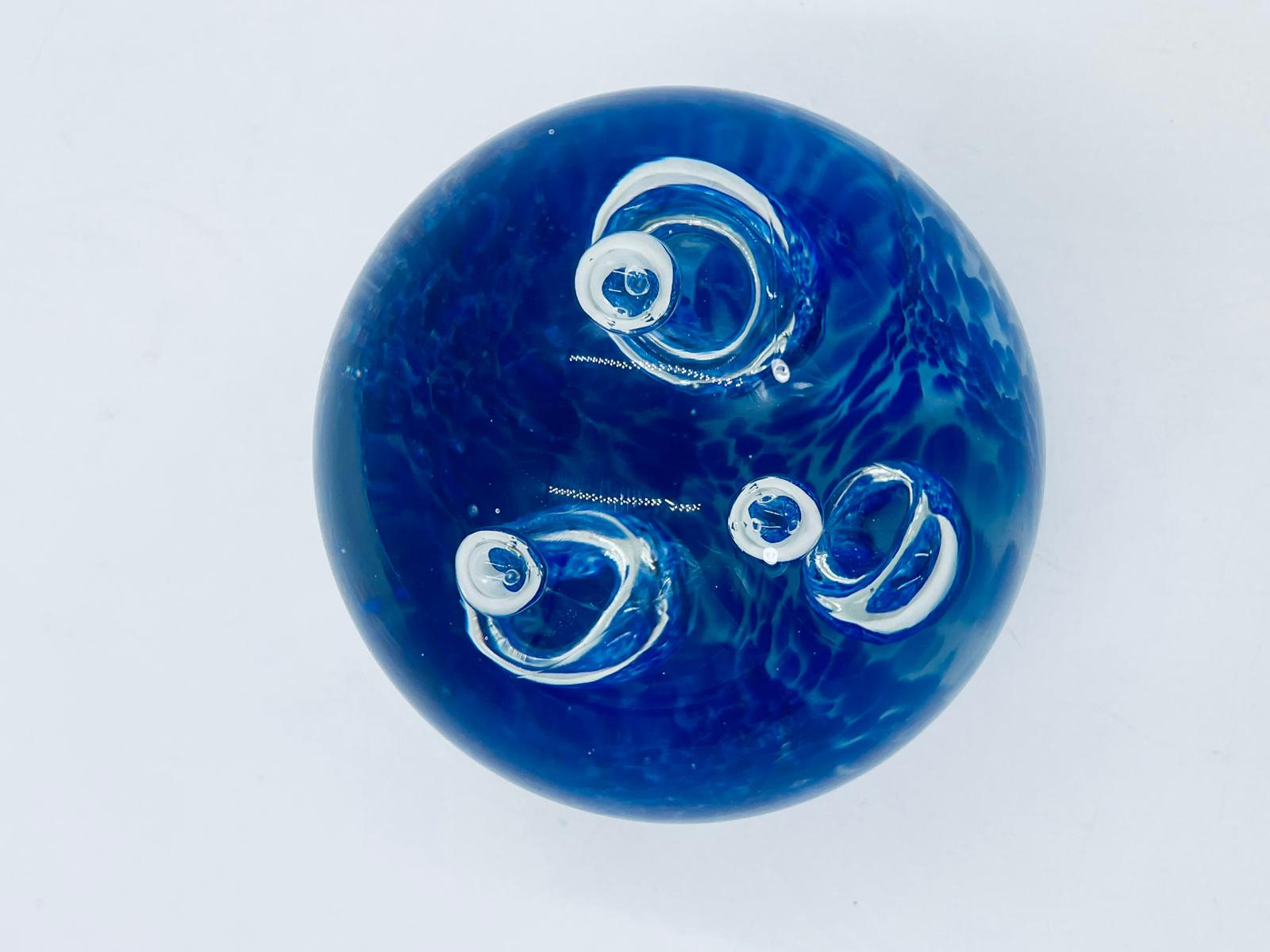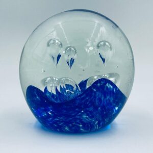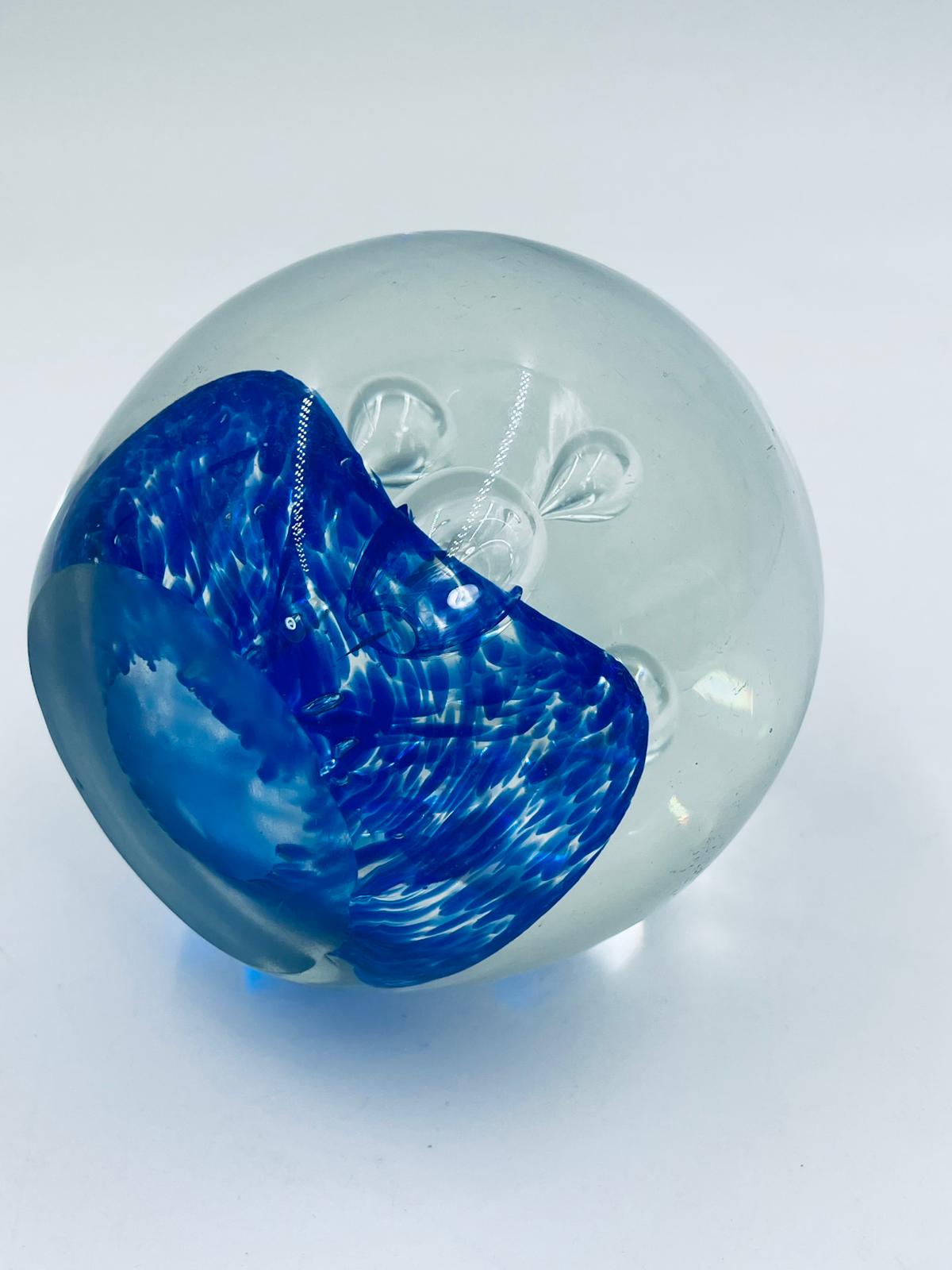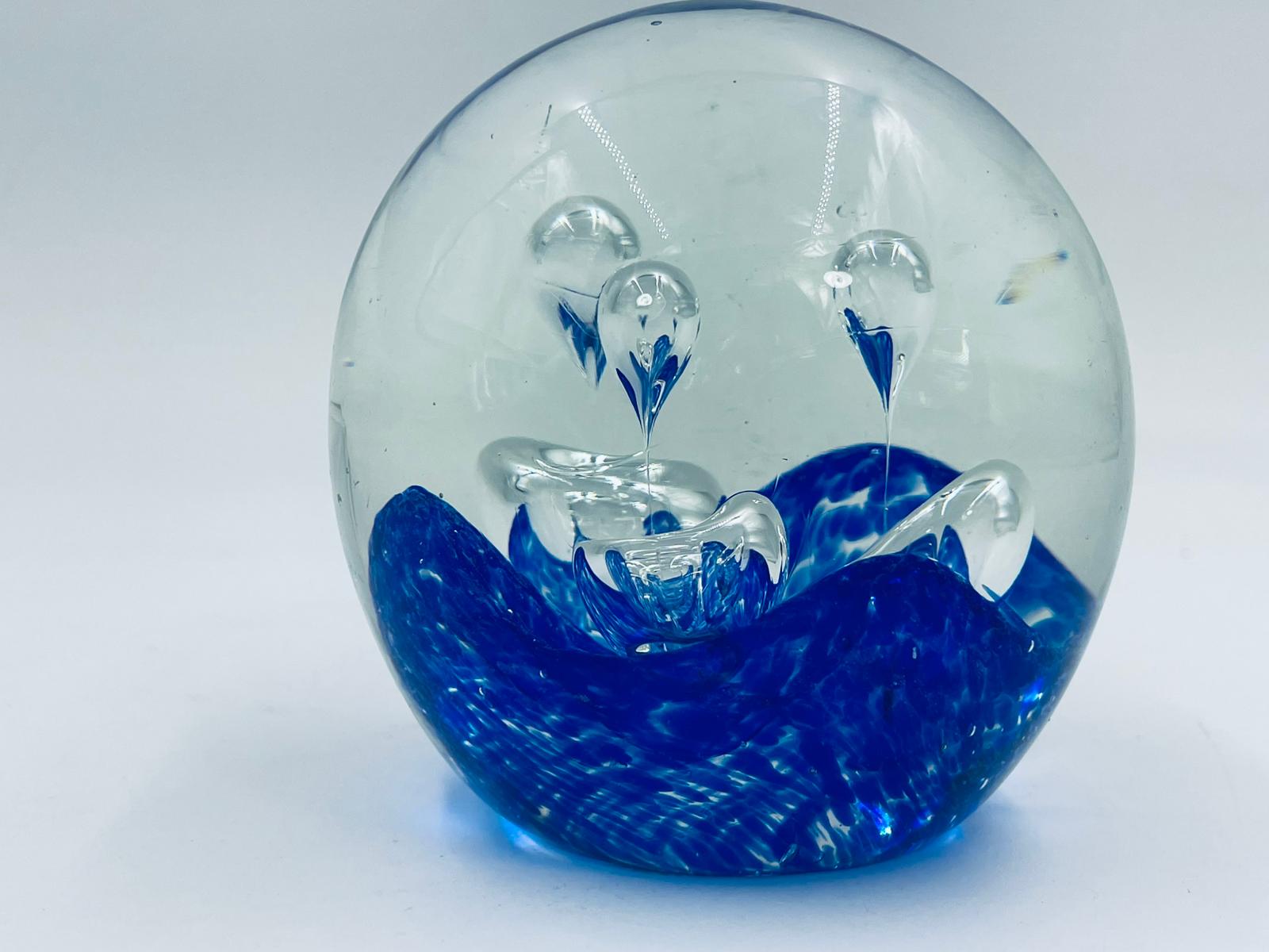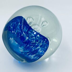 Przycisk wykonany z dobrej jakości przezroczystego szkła z niebieskimi wtrąceniami w masie tworzące dekoracyjne bąbelki w środku kuli.