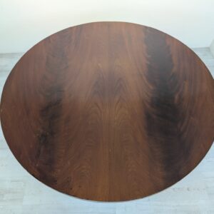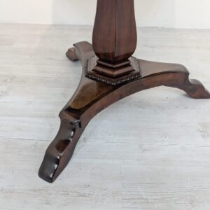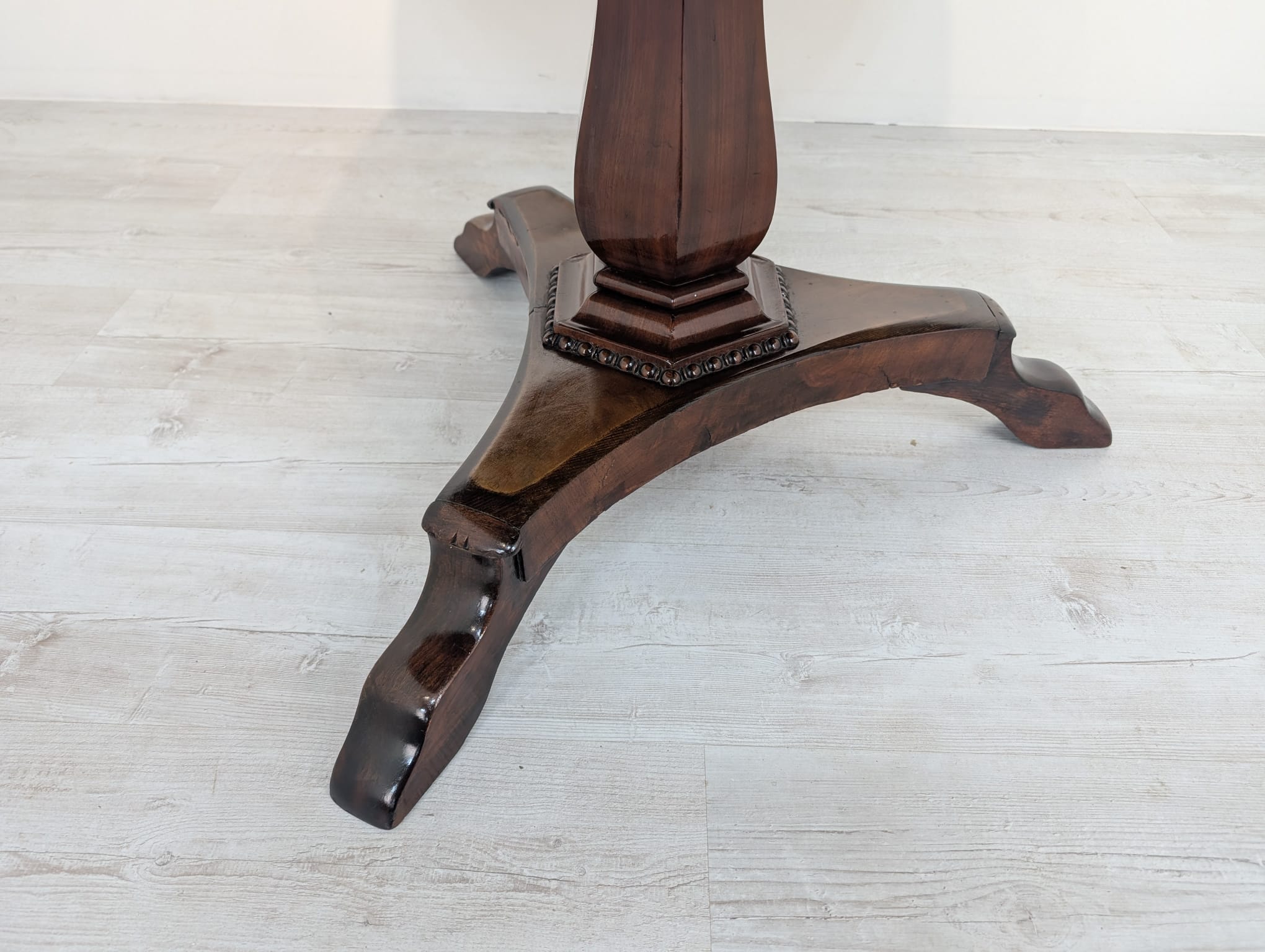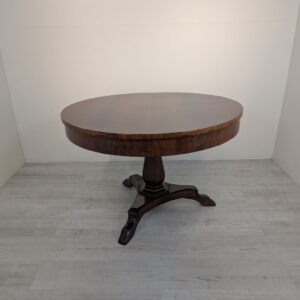 Stylowy, okrągły stół w stylu biedermeier z XIX wieku, wykonany z ciemnego litego orzechowego drewna. Jego elegancka forma i wysoka jakość wykonania czynią go doskonałym dodatkiem do każdego wnętrza.