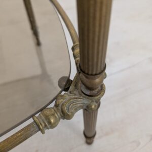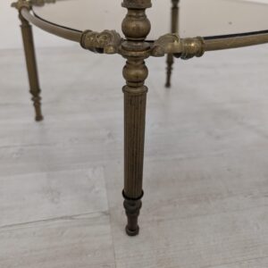 Stylowy stolik kawowy z lat 60-tych. Podstawa wykonana z mosiądzu, blat z dymionego szkła. Unikatowy mebel z epoki, który doda charakteru każdemu wnętrzu.