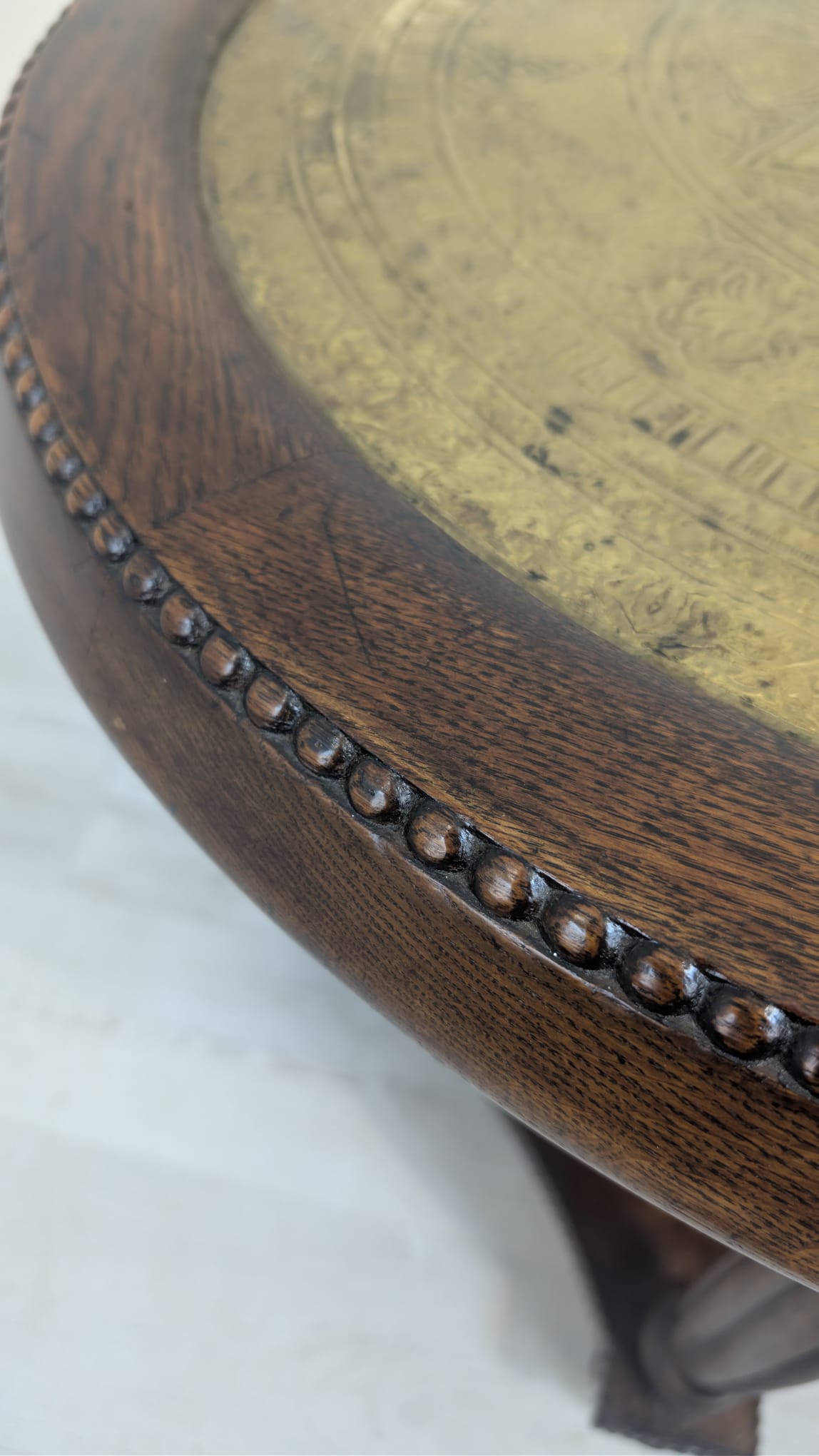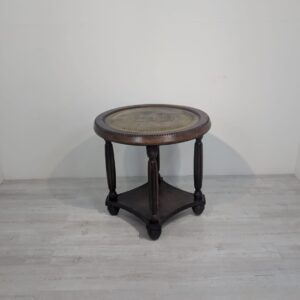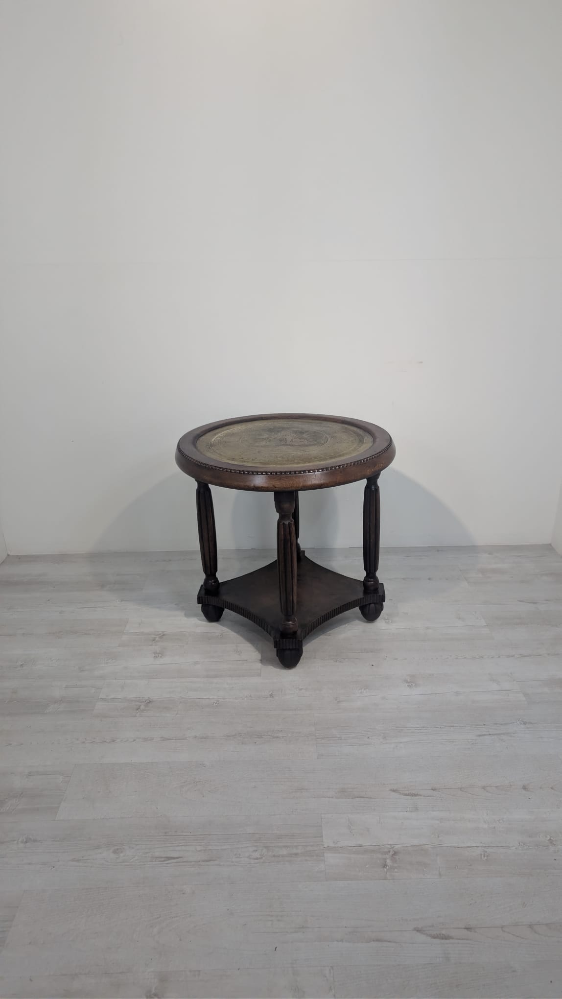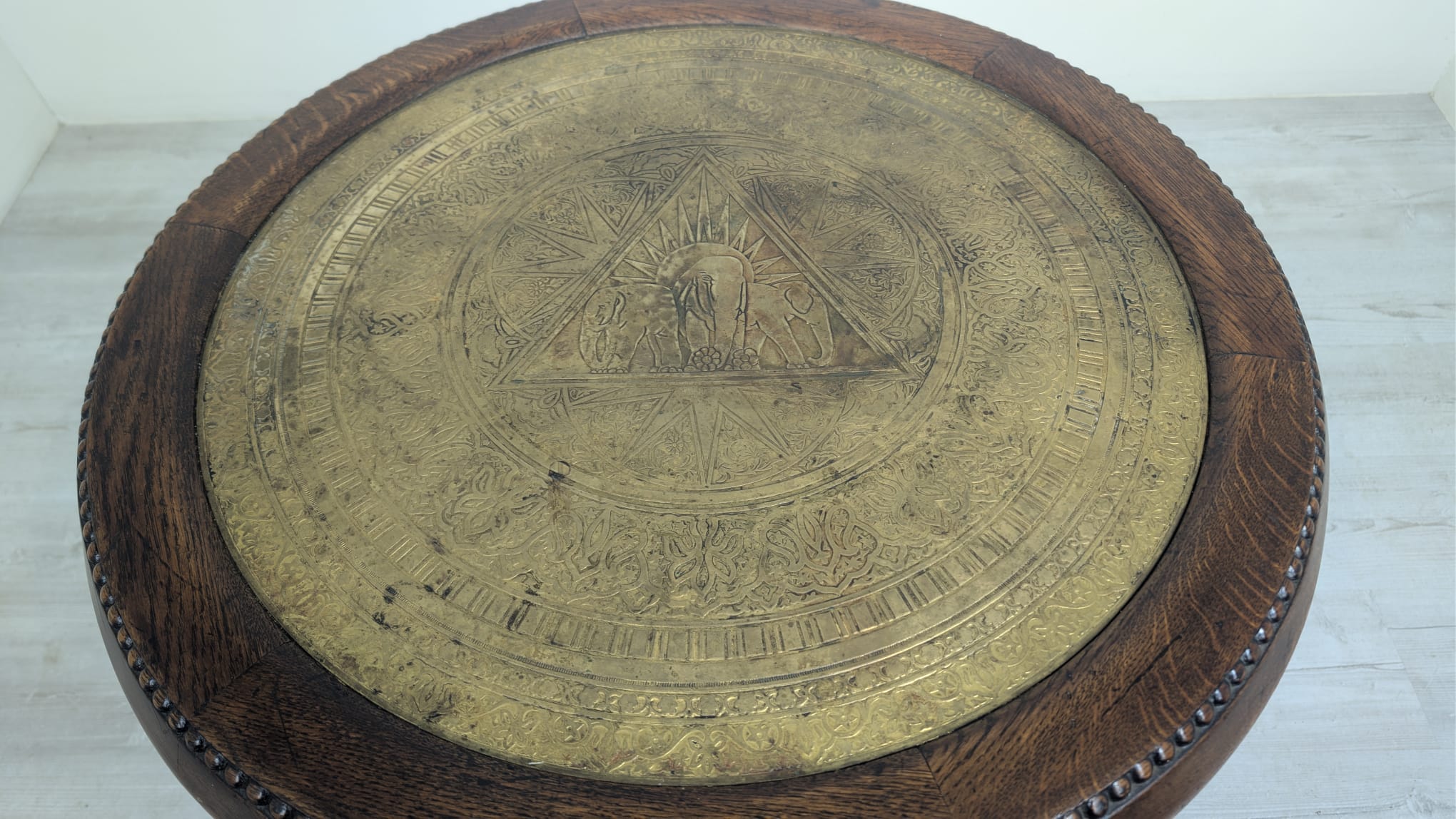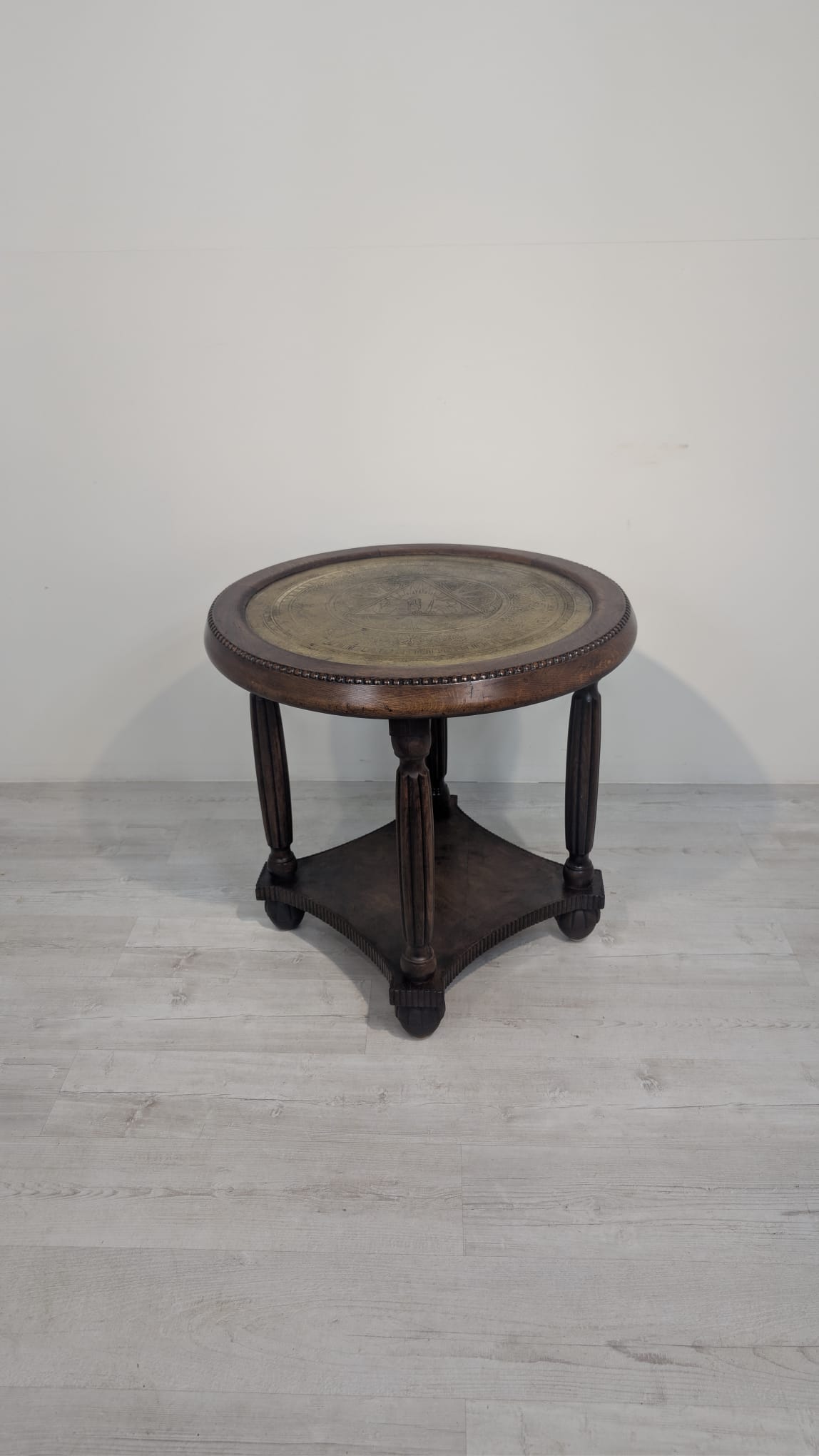 Stylowy, okrągły stolik kawowy w stylu vintage z drewnianą konstrukcją i mosiężnym blatem.