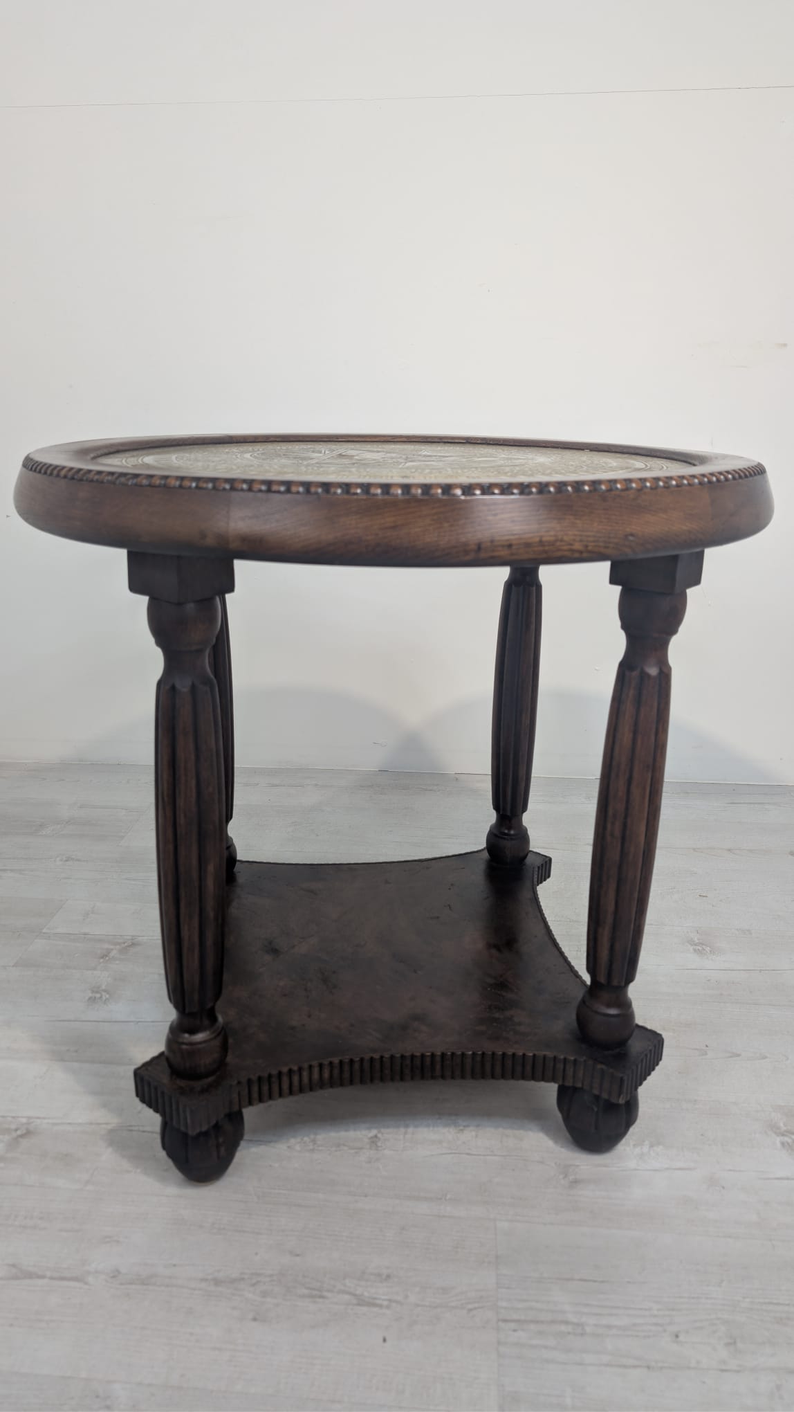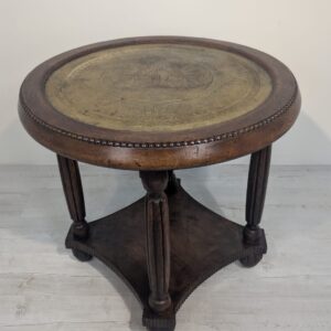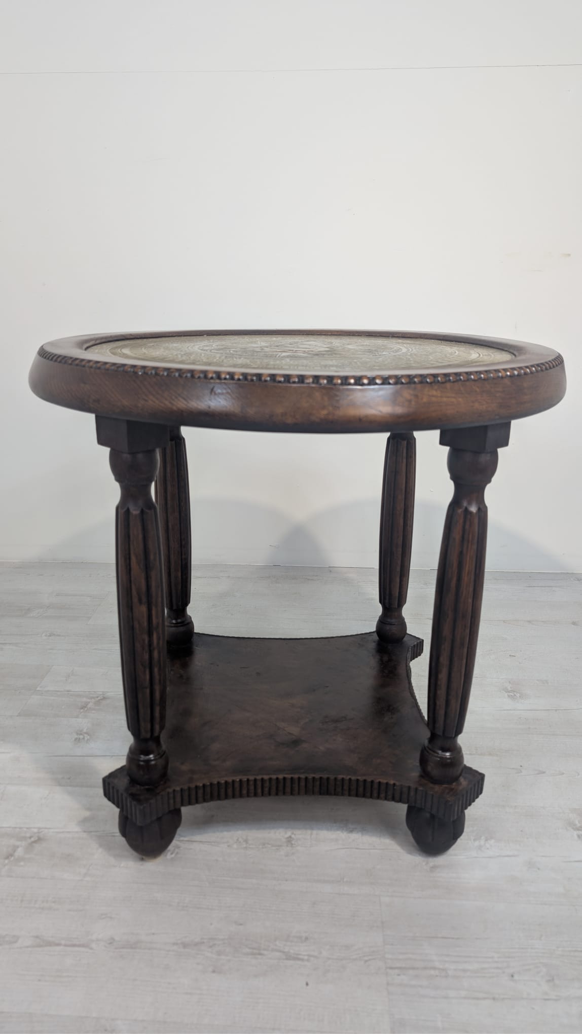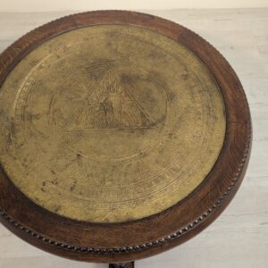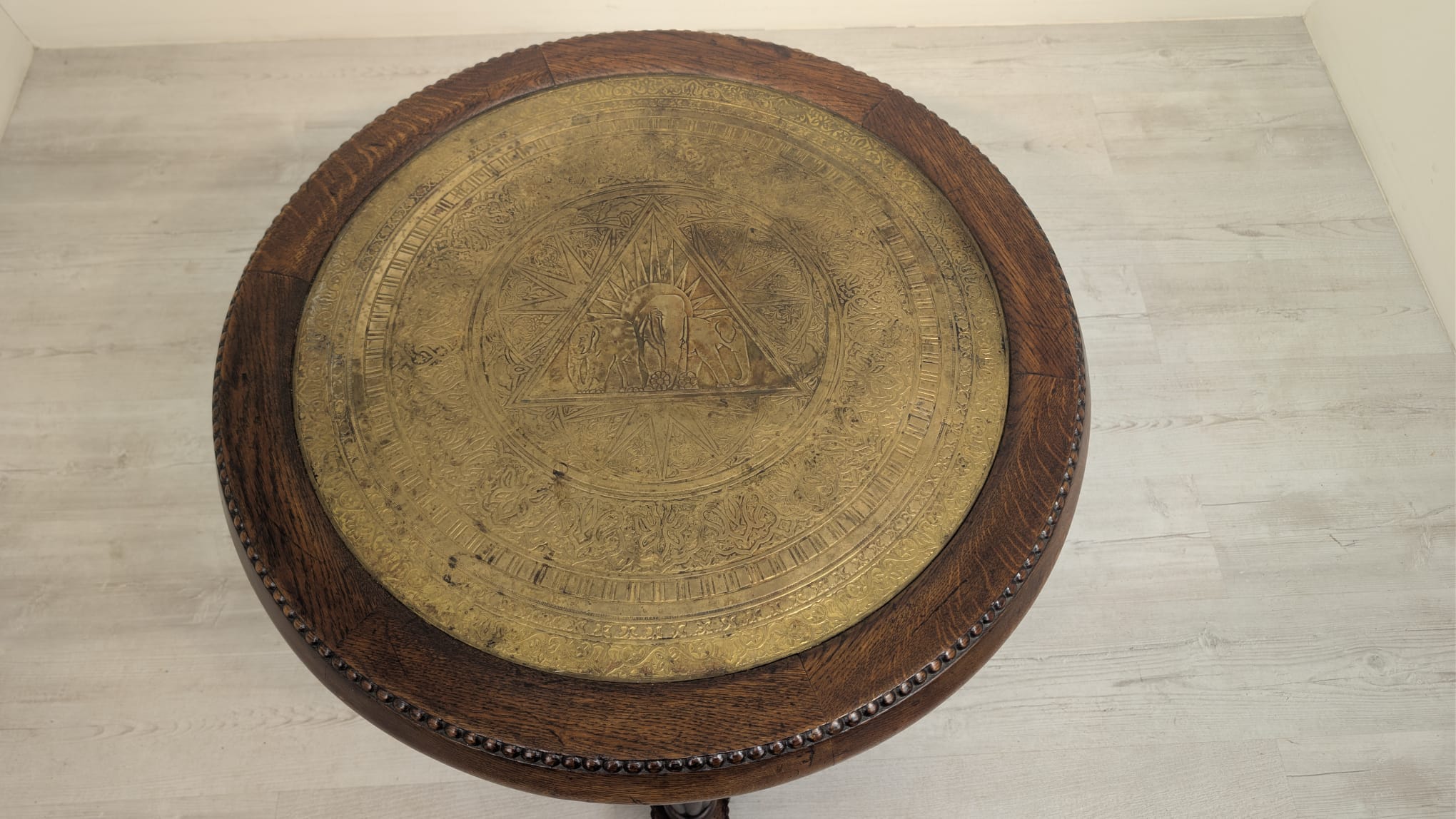 Stylowy, okrągły stolik kawowy w stylu vintage z drewnianą konstrukcją i mosiężnym blatem.