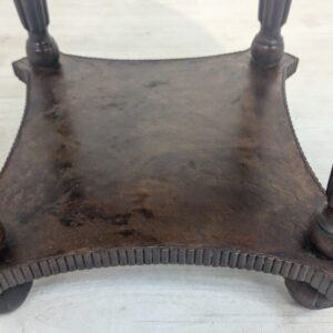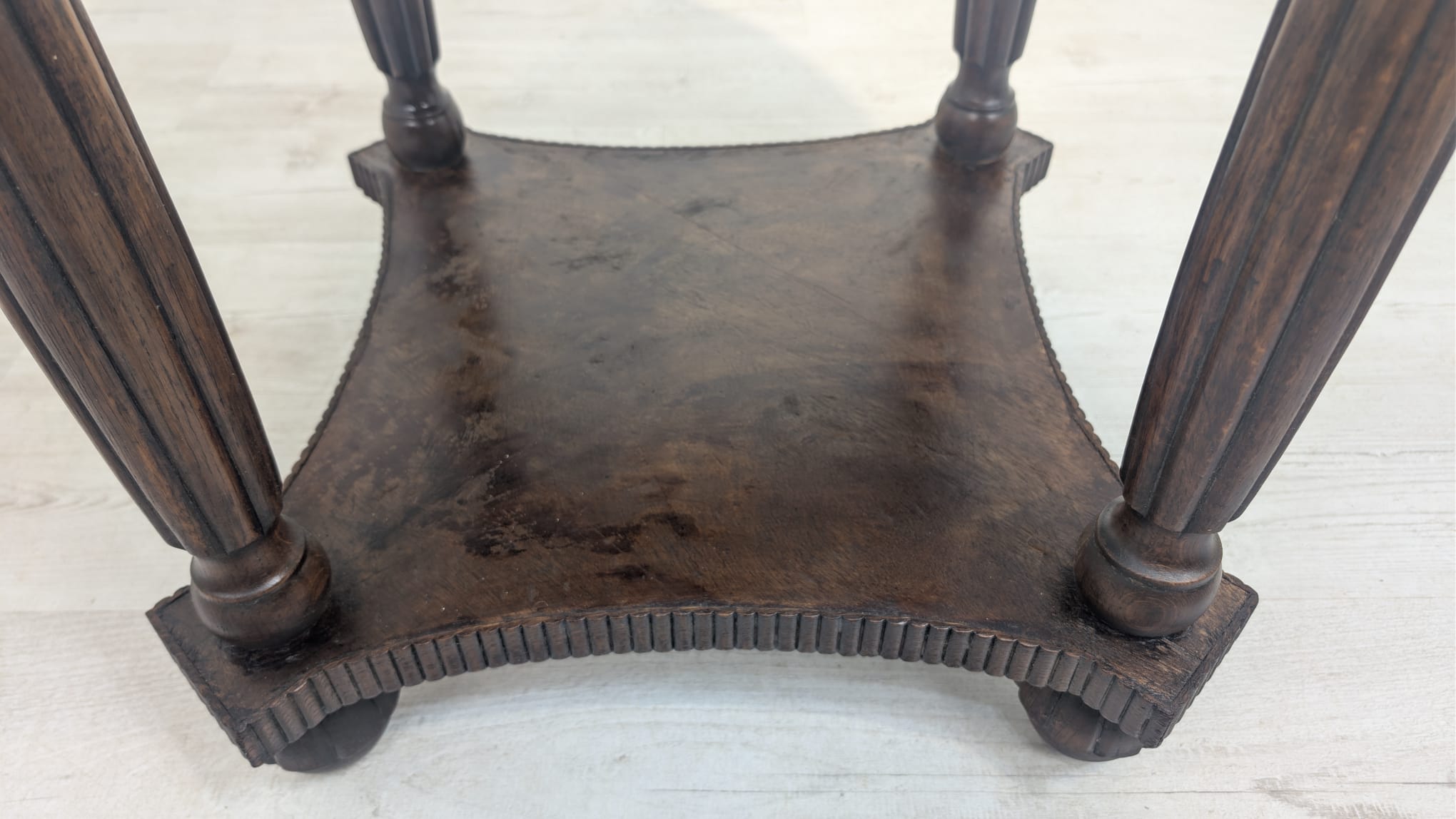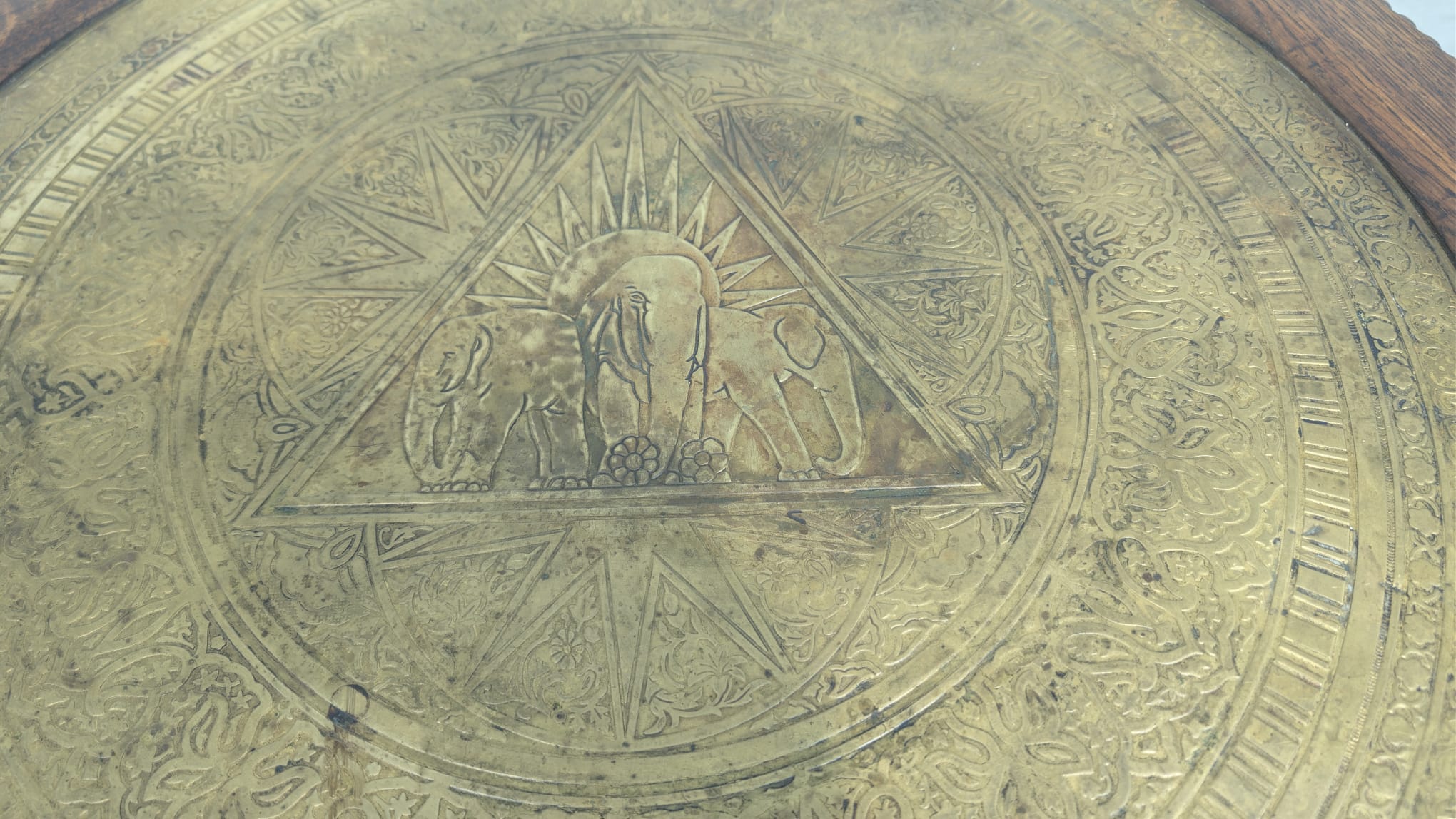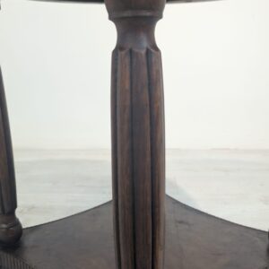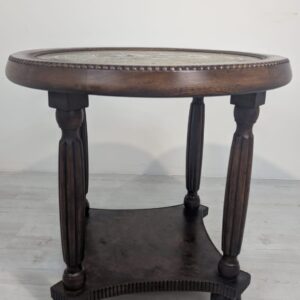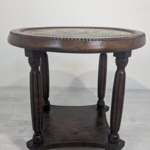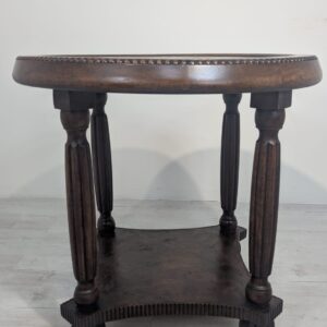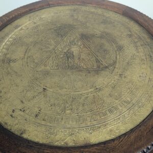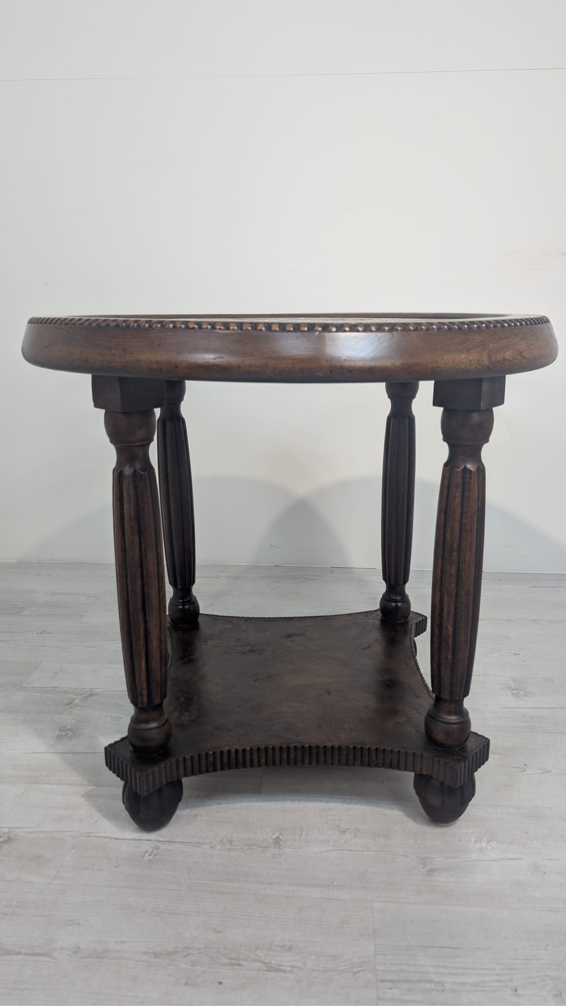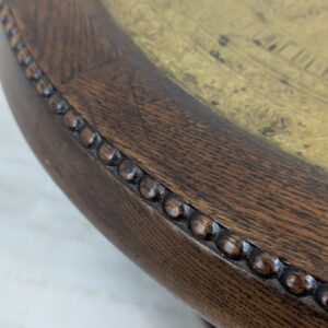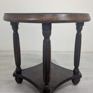 Stylowy, okrągły stolik kawowy w stylu vintage z drewnianą konstrukcją i mosiężnym blatem.