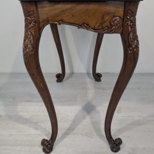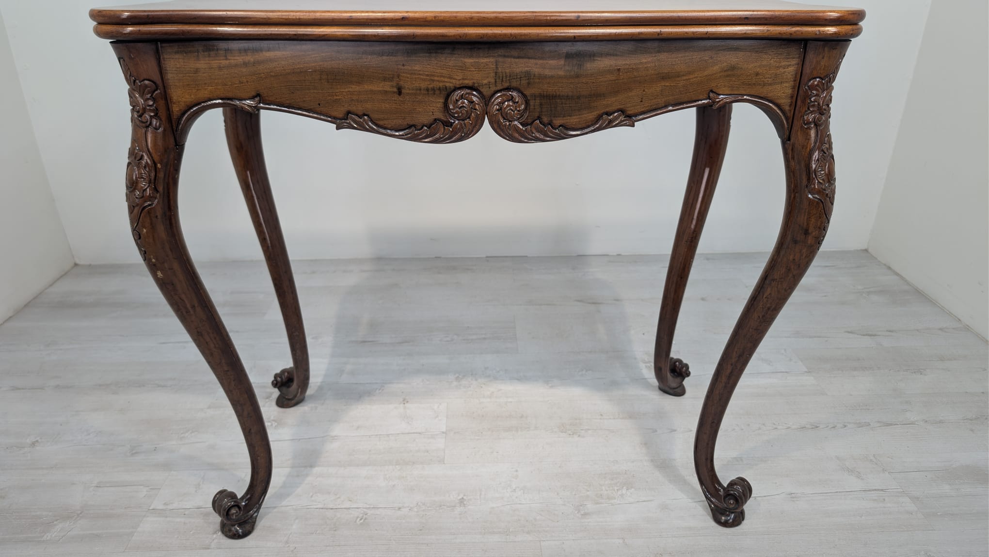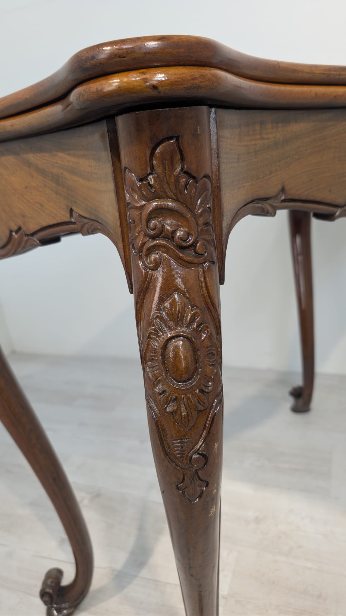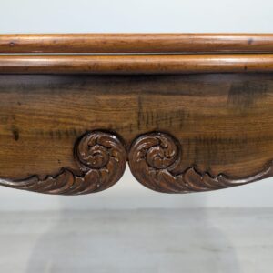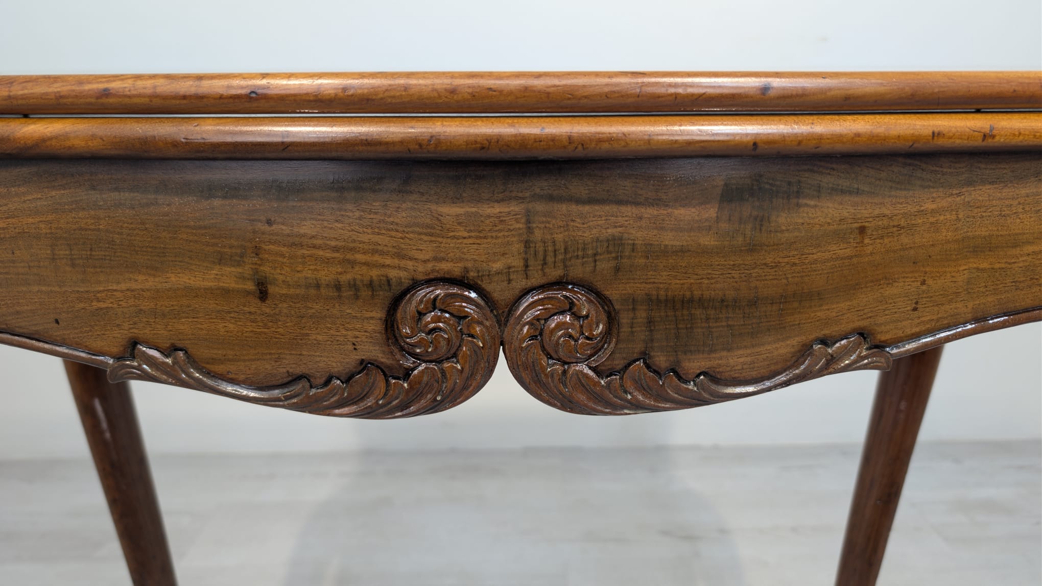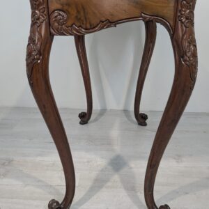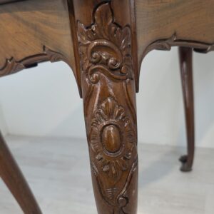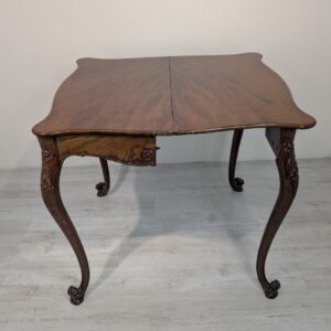 Stylowy stolik kawowy, karciak, wykonany z litego drewna w stylu Ludwika XV. Posiada piękne rzeźbione wykończenia nadający szyku i elegancji. Nogi tylne wysuwają się oraz rozkłada się blat. Pod blatem znajduje się skrytka na karty lub inne przedmioty.