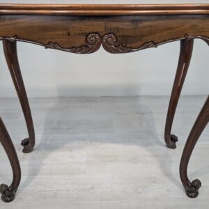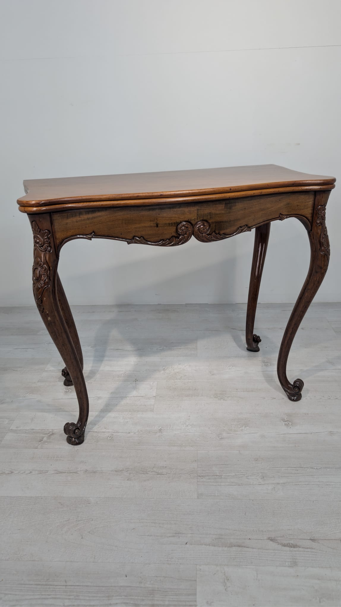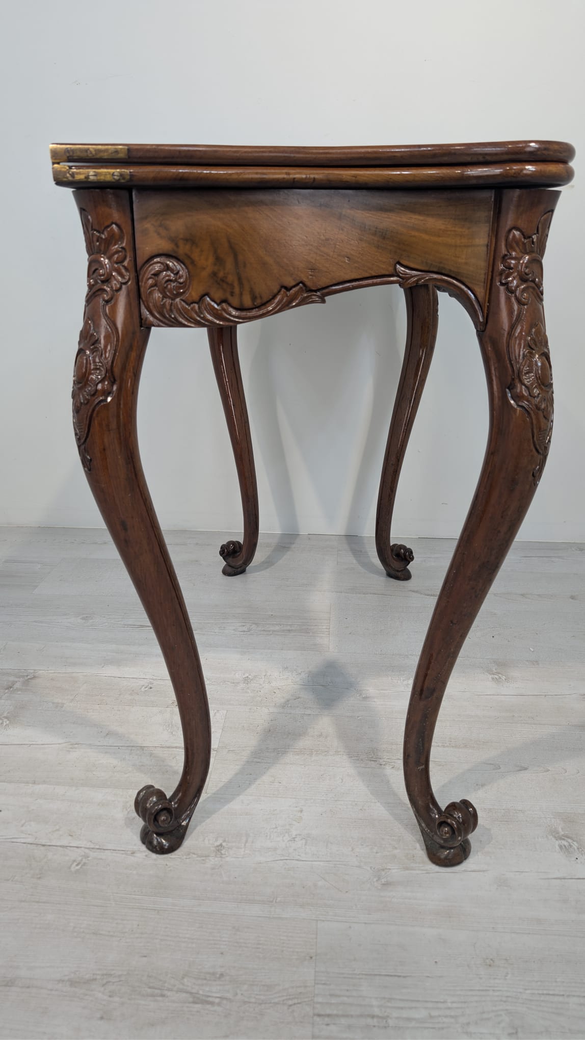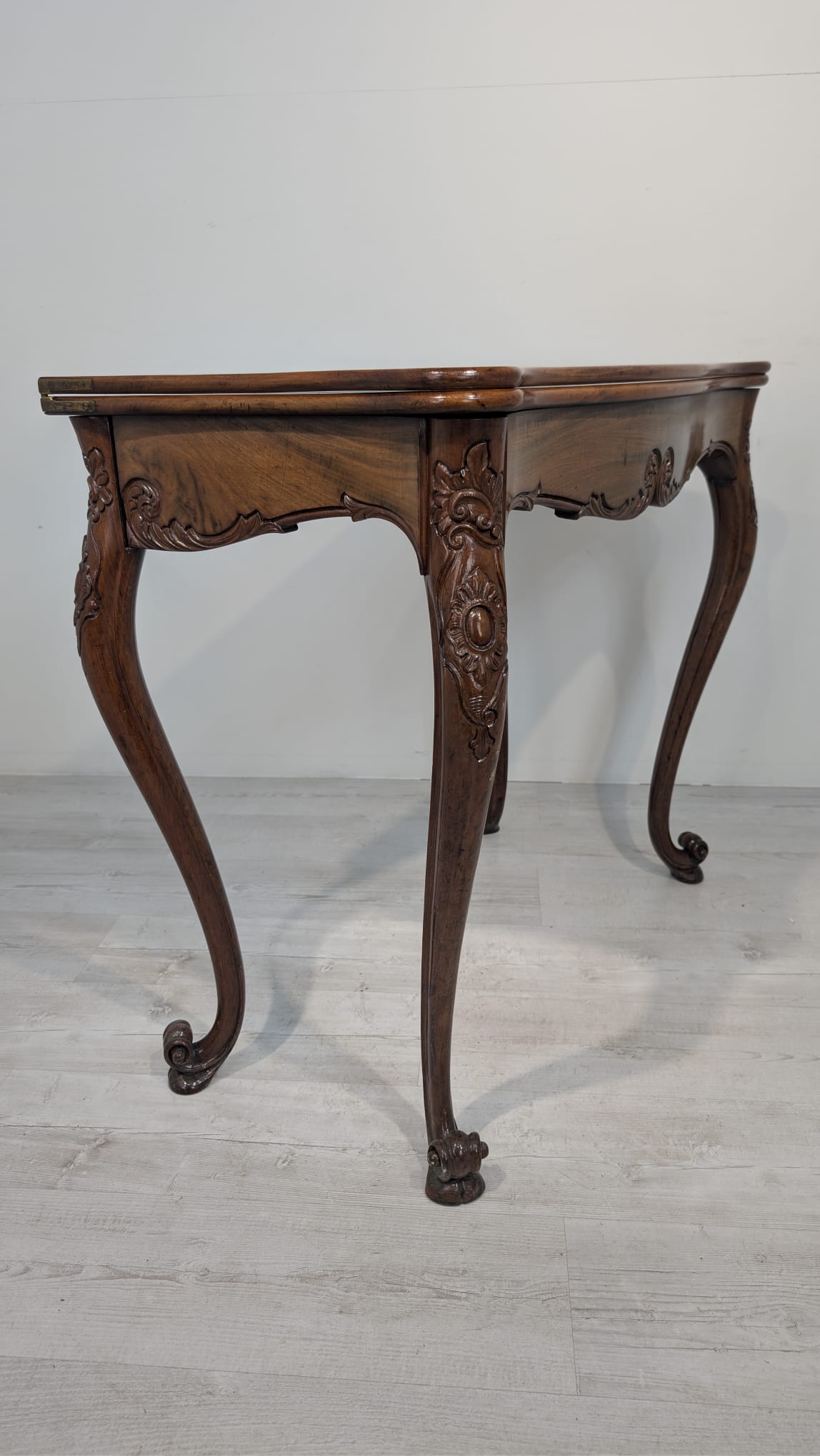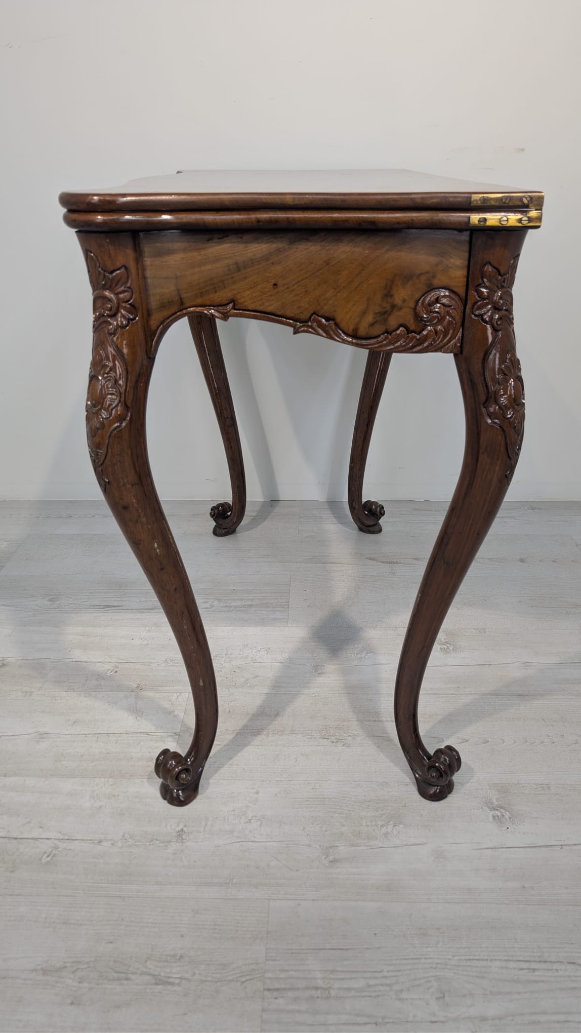 Stylowy stolik kawowy, karciak, wykonany z litego drewna w stylu Ludwika XV. Posiada piękne rzeźbione wykończenia nadający szyku i elegancji. Nogi tylne wysuwają się oraz rozkłada się blat. Pod blatem znajduje się skrytka na karty lub inne przedmioty.
