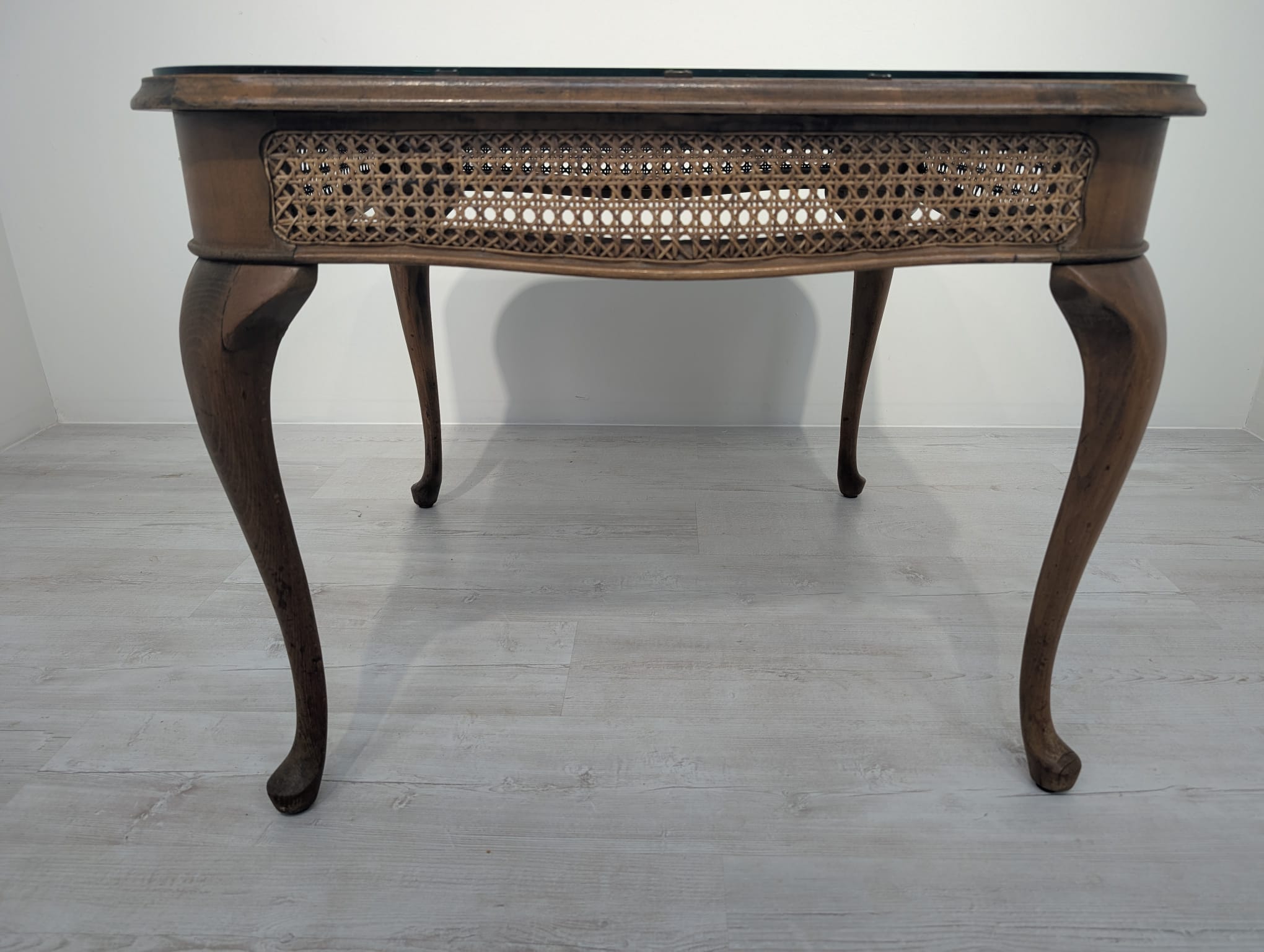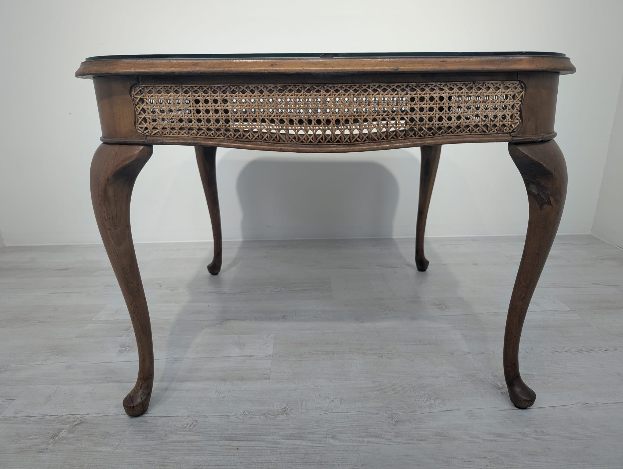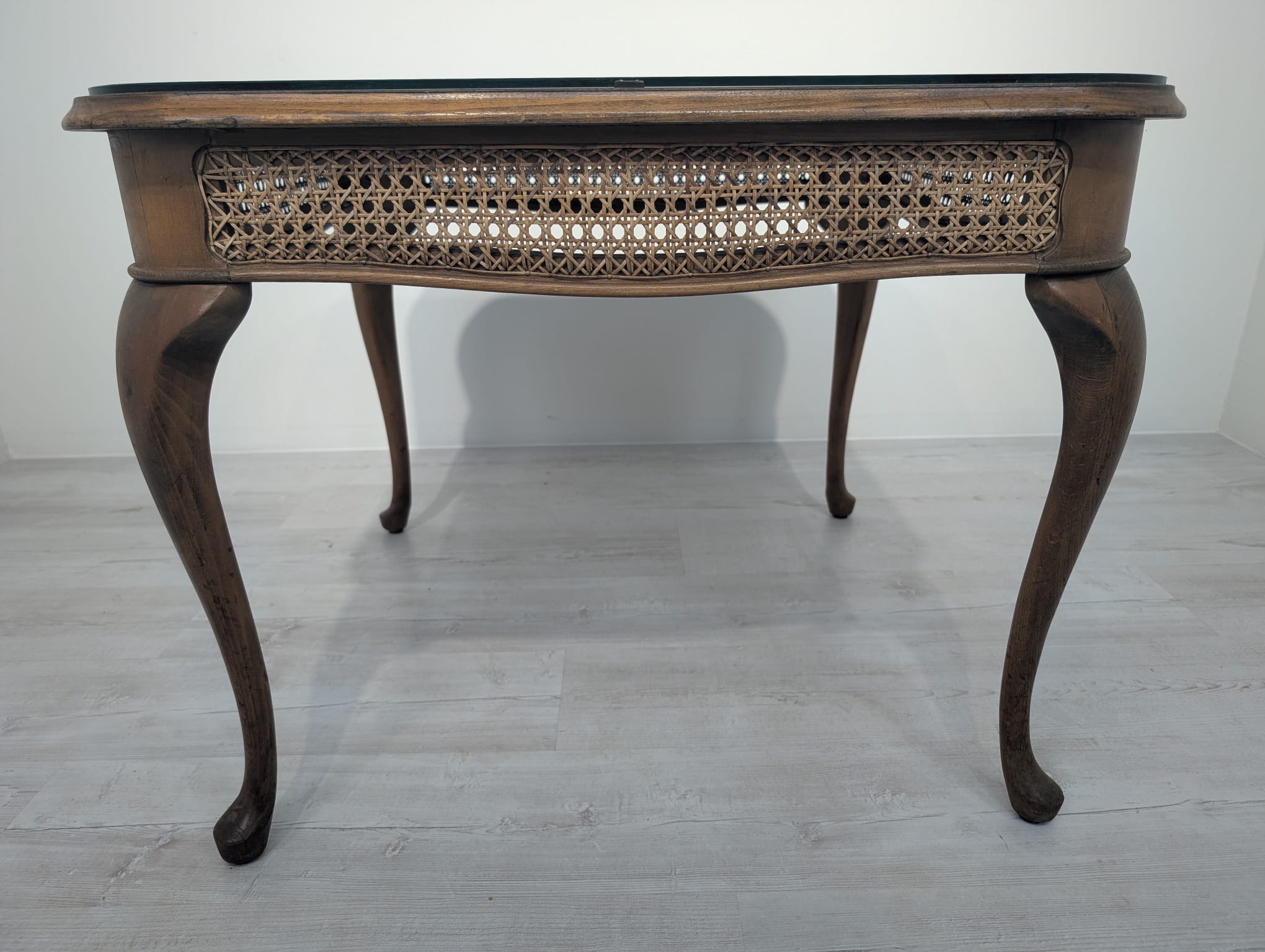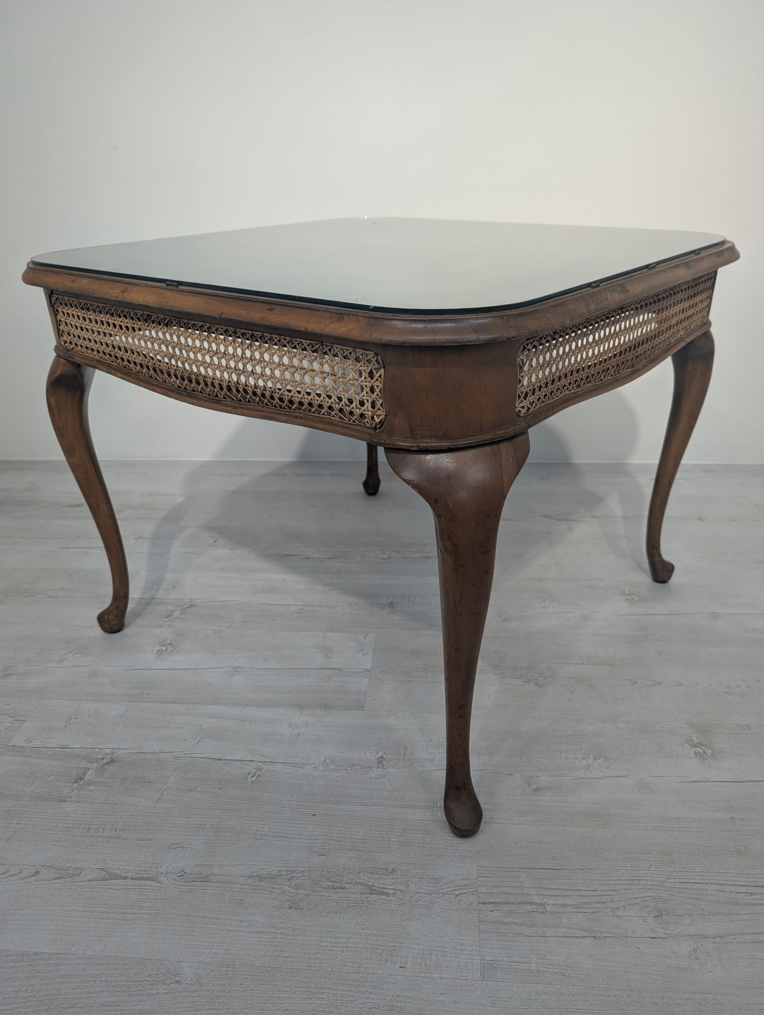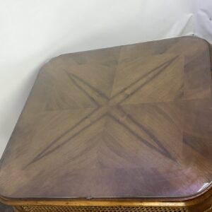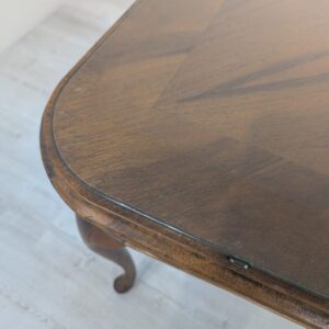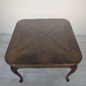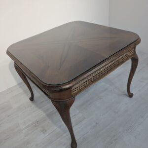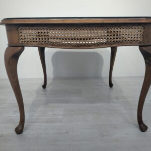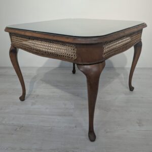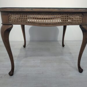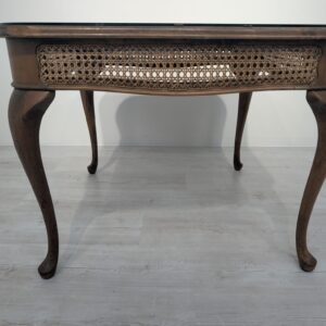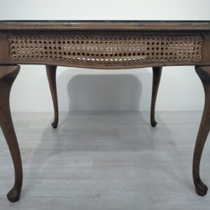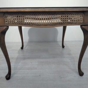Stylowy stolik kawowy z lat 60. XX wieku w stylu Chippendale. Blat wykonany z ciemnego, fornirowanego drewna, ozdobiony plecionką z rafii. Nogi w stylu królowej Anny, dodające elegancji i ponadczasowego charakteru temu meblu.