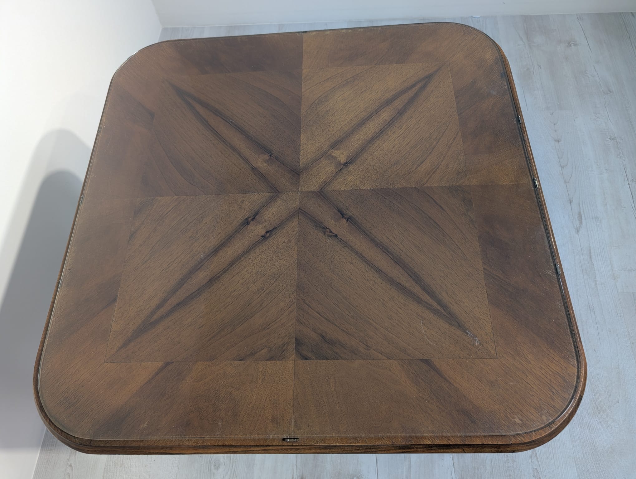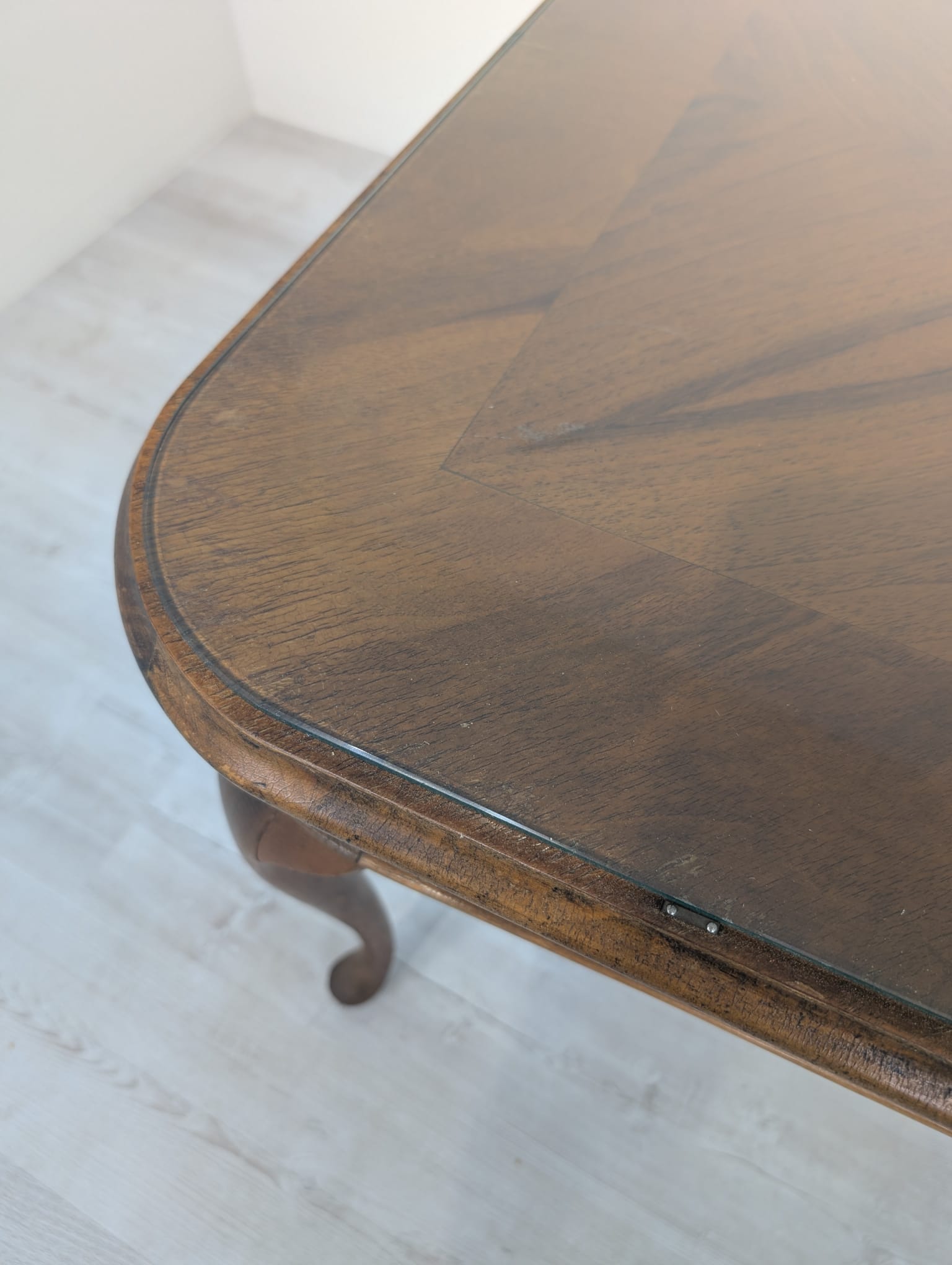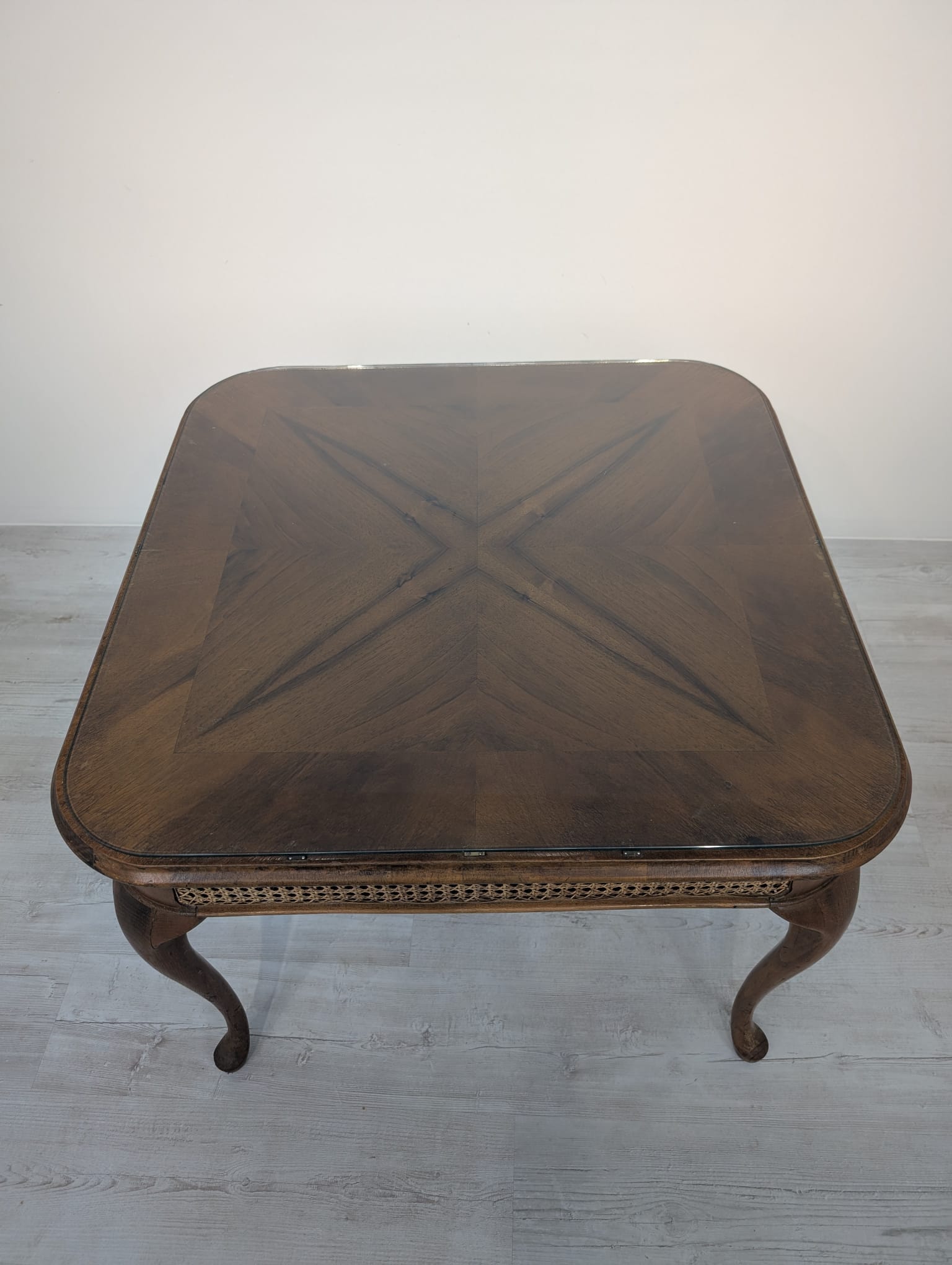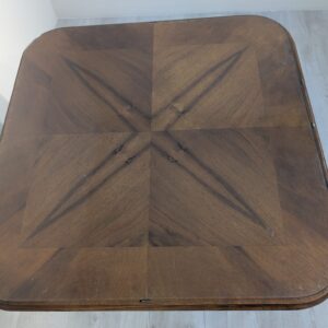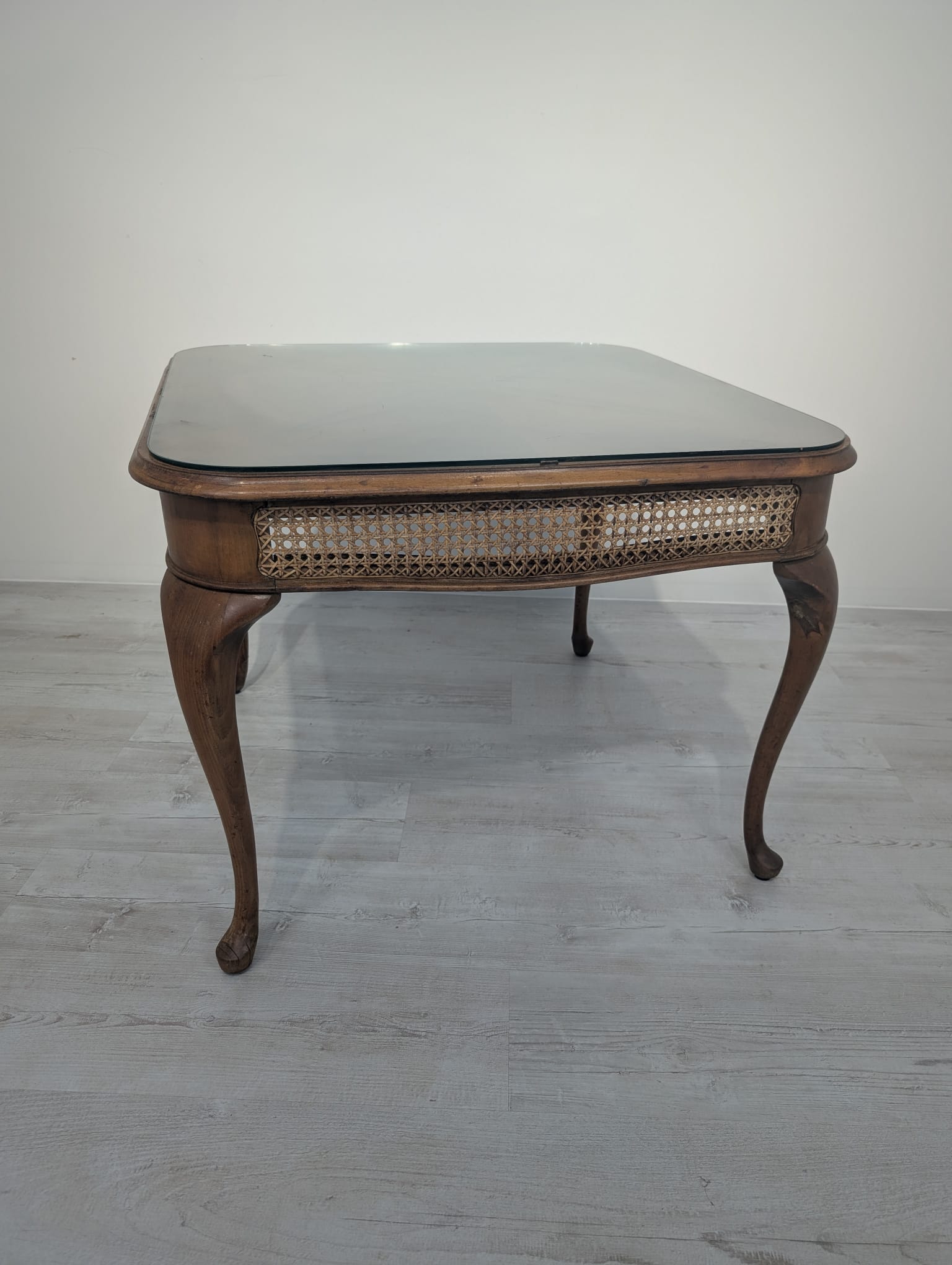 Stylowy stolik kawowy z lat 60. XX wieku w stylu Chippendale. Blat wykonany z ciemnego, fornirowanego drewna, ozdobiony plecionką z rafii. Nogi w stylu królowej Anny, dodające elegancji i ponadczasowego charakteru temu meblu.