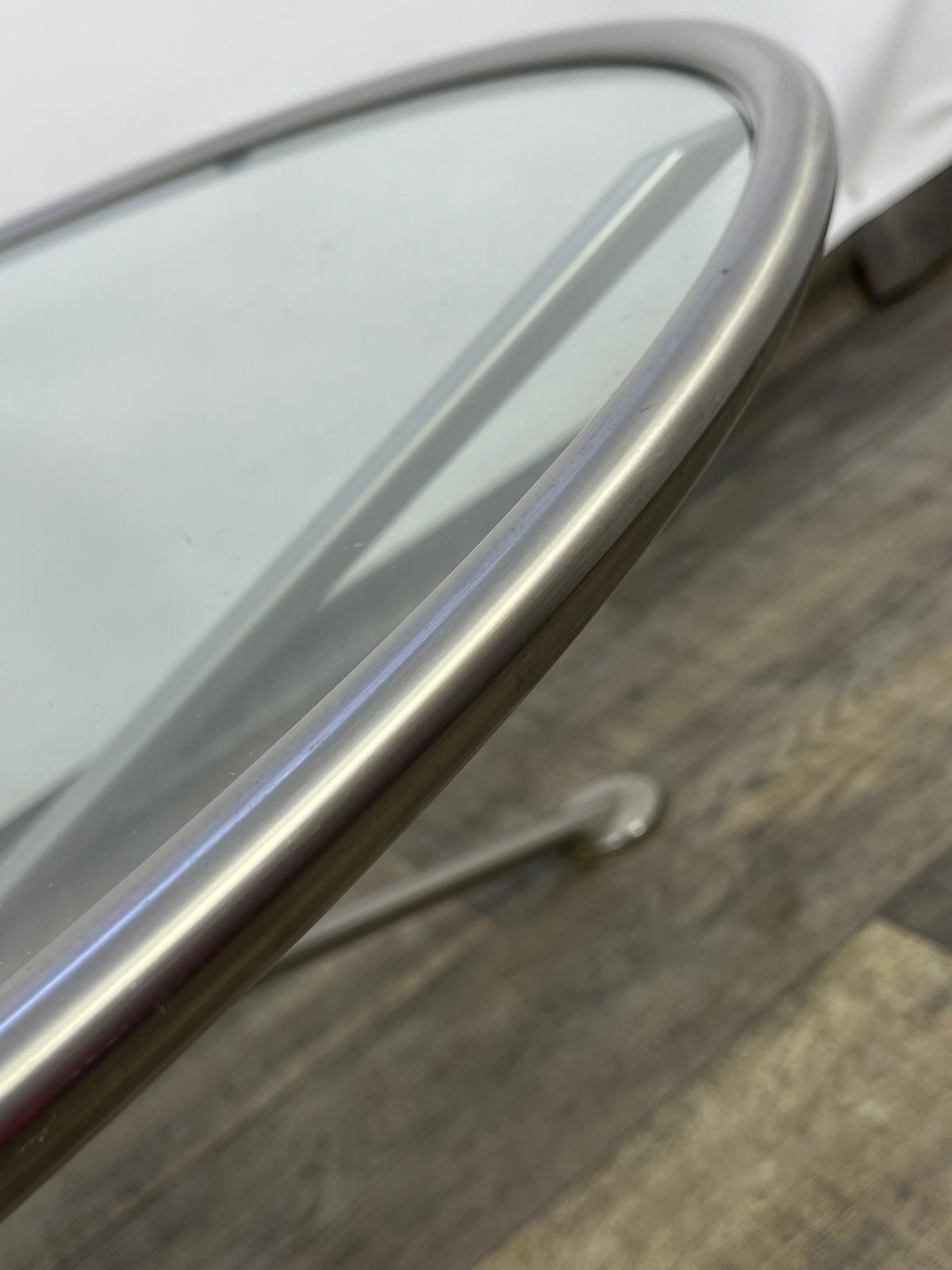 Stolik okrągły pokryty szybą z grubego hartowanego szkła.