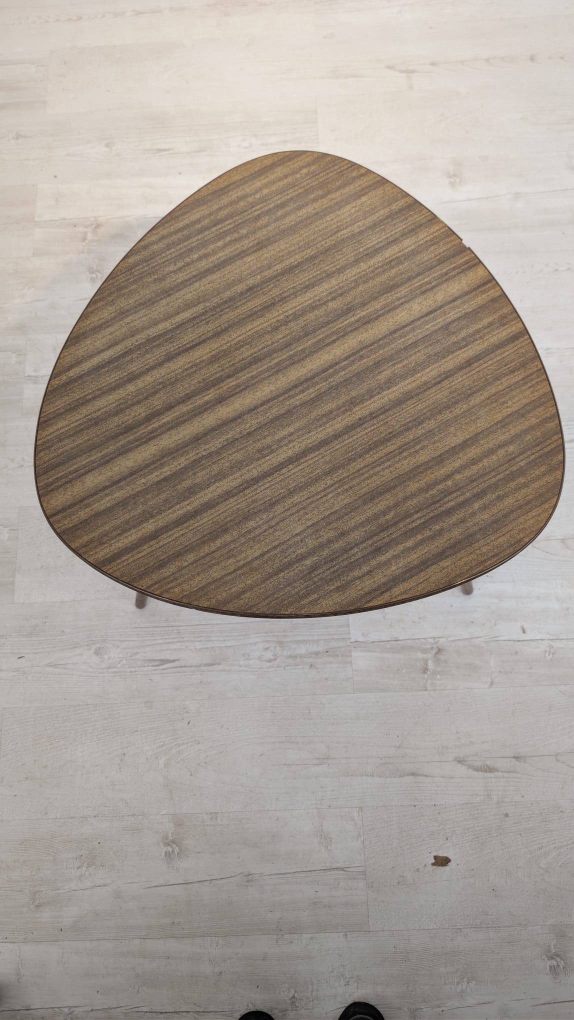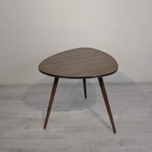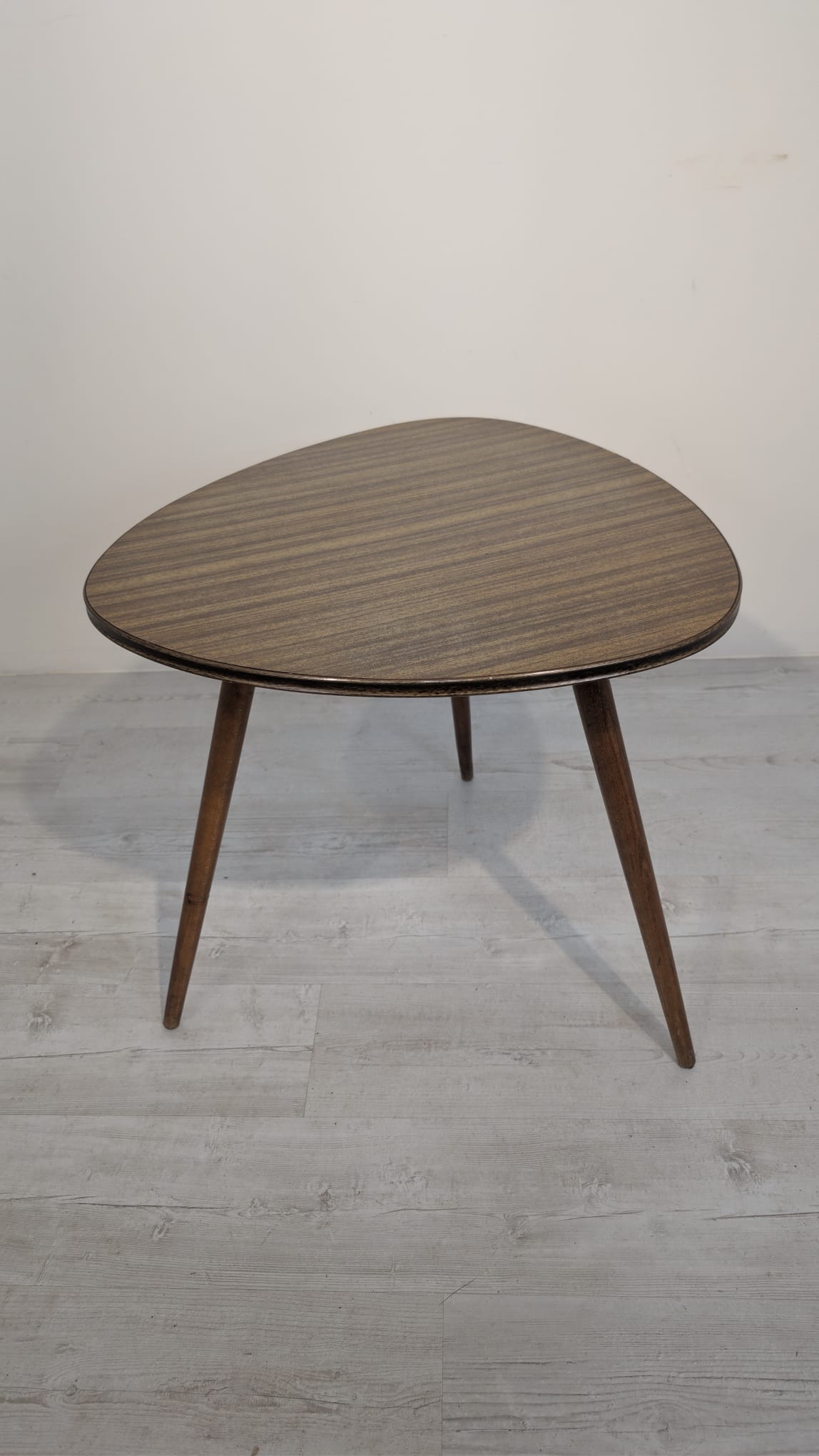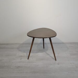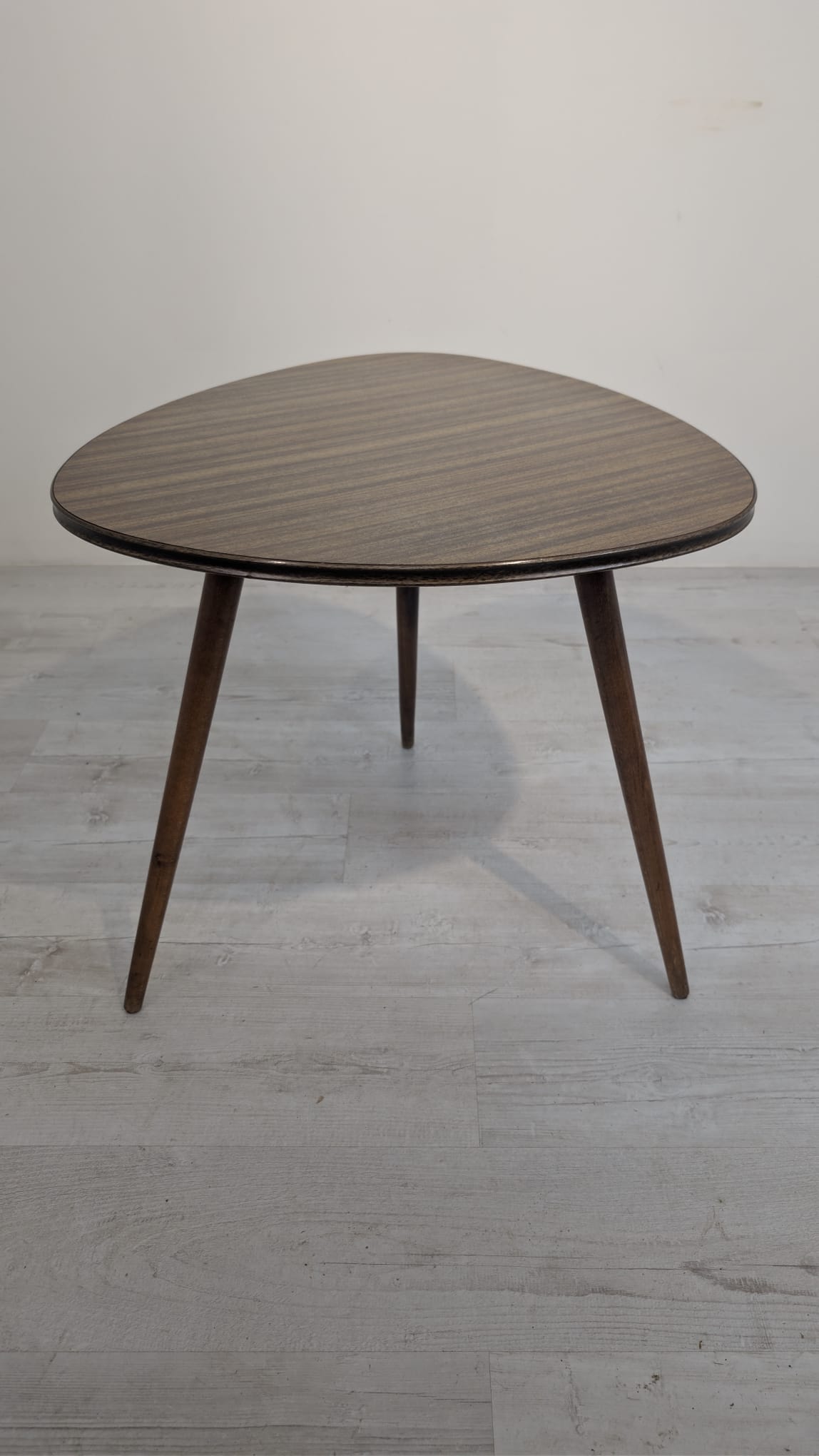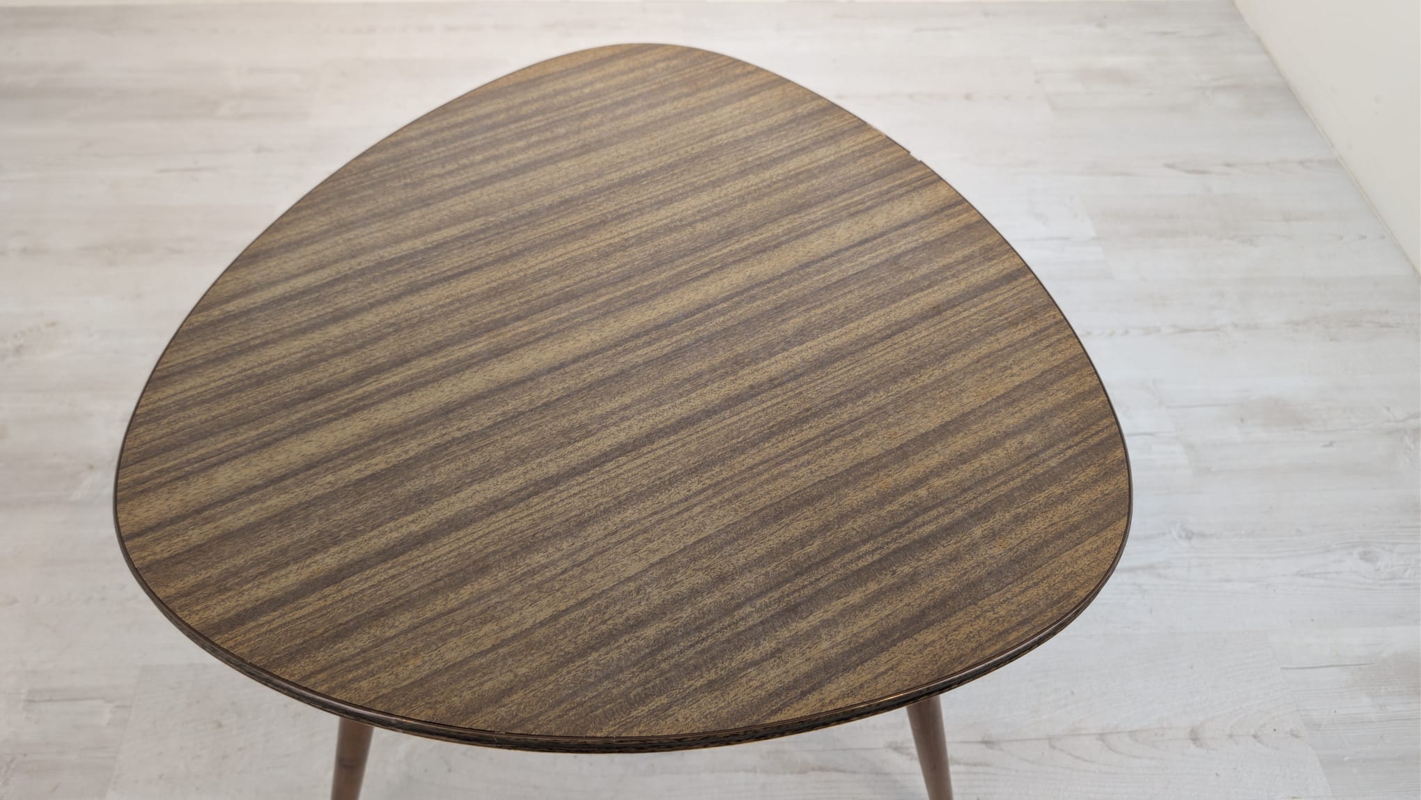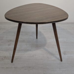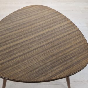 Stolik kawowy w kształcie trójkąta z lat 50/60. Posiada ciemnobrązowy kolor i nogi w stylu nintage. Stolik jest używany, ale w dobrym stanie. Idealny jako mebel uzupełniający do salonu w stylu vintage.