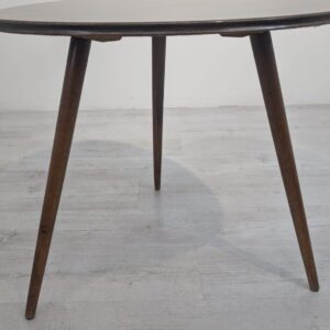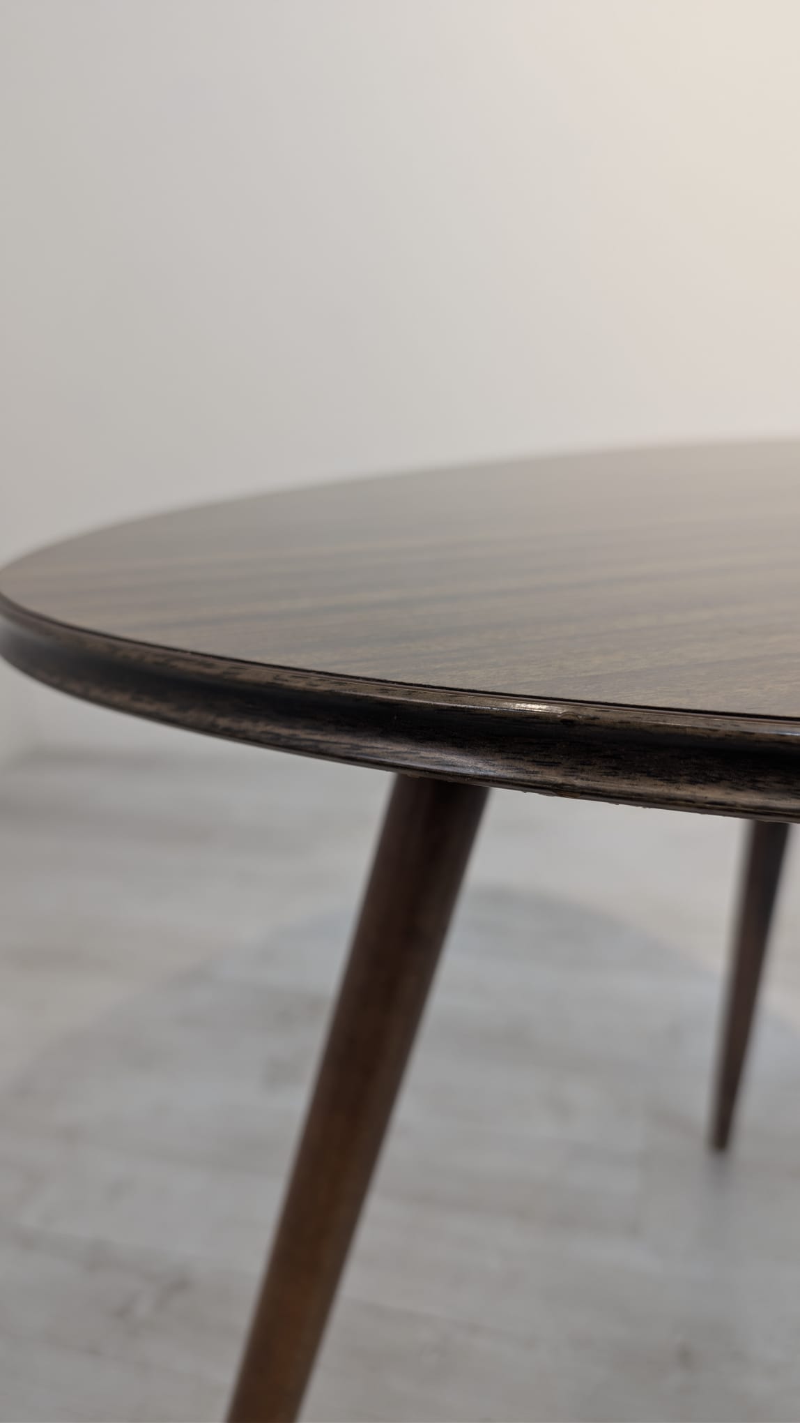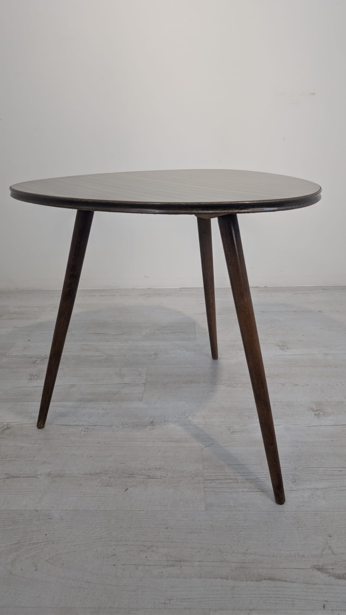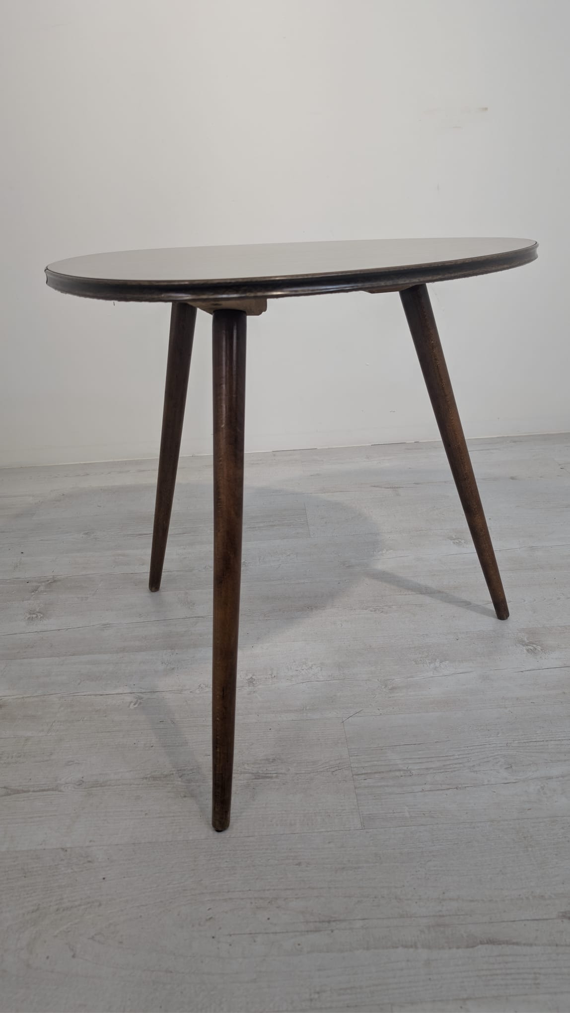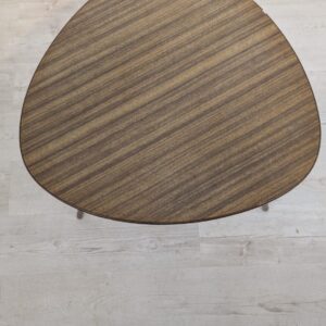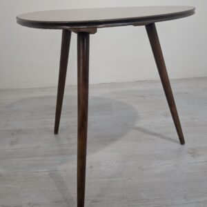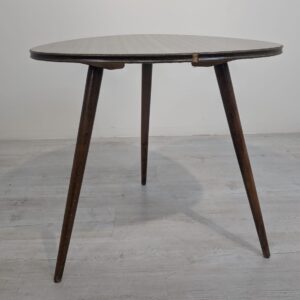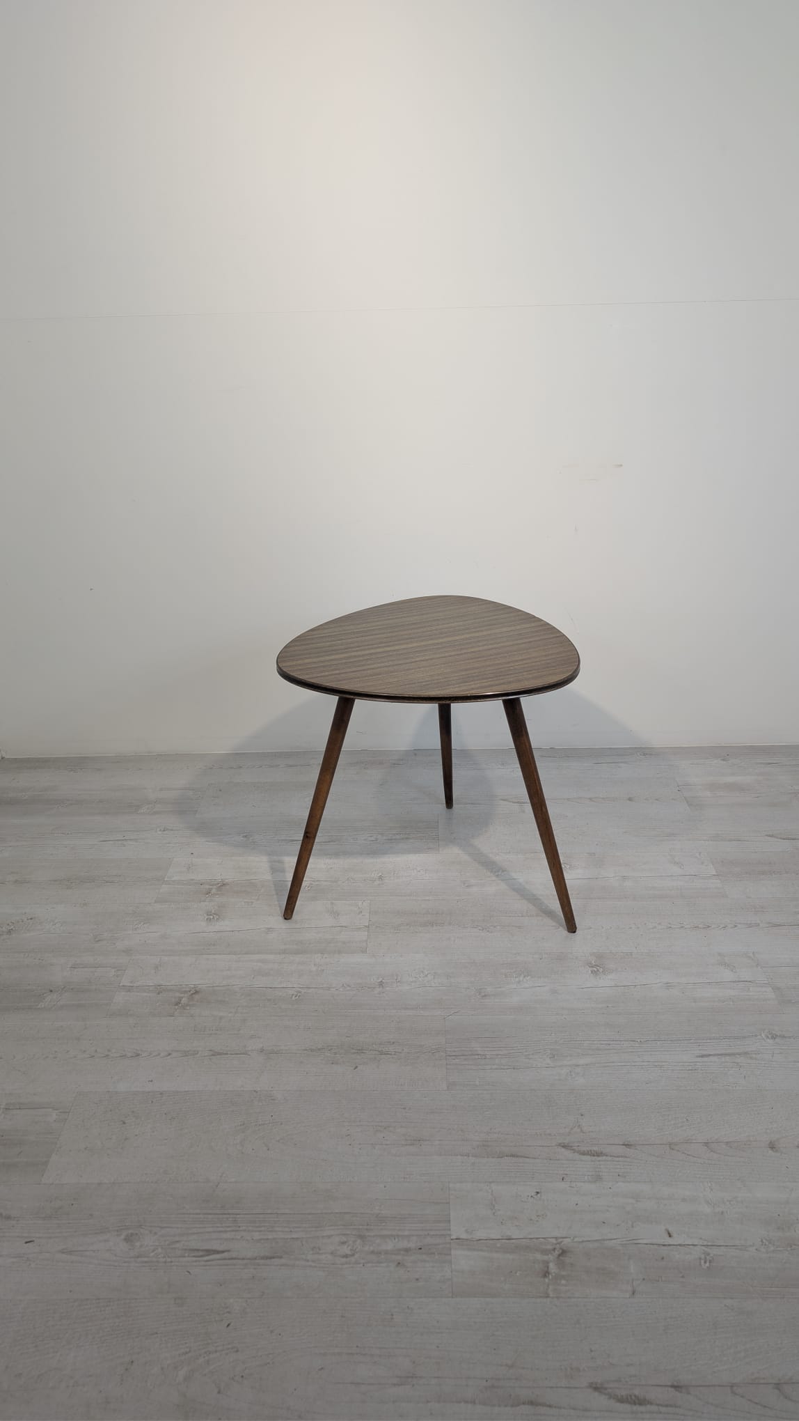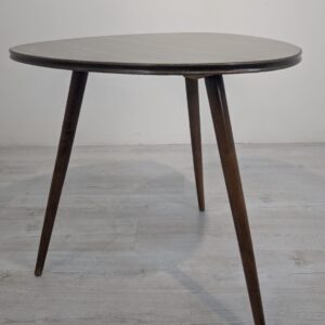 Stolik kawowy w kształcie trójkąta z lat 50/60. Posiada ciemnobrązowy kolor i nogi w stylu nintage. Stolik jest używany, ale w dobrym stanie. Idealny jako mebel uzupełniający do salonu w stylu vintage.