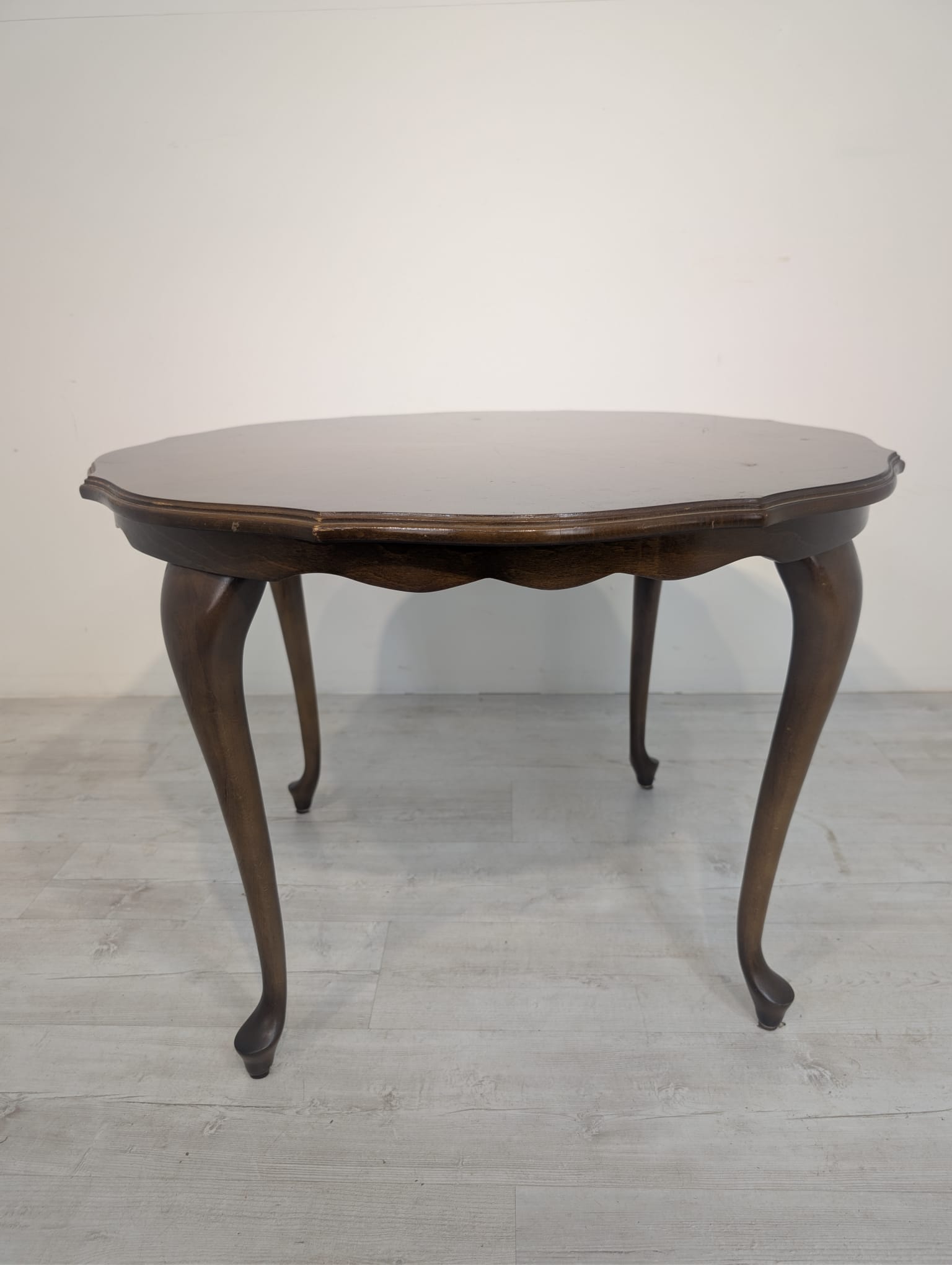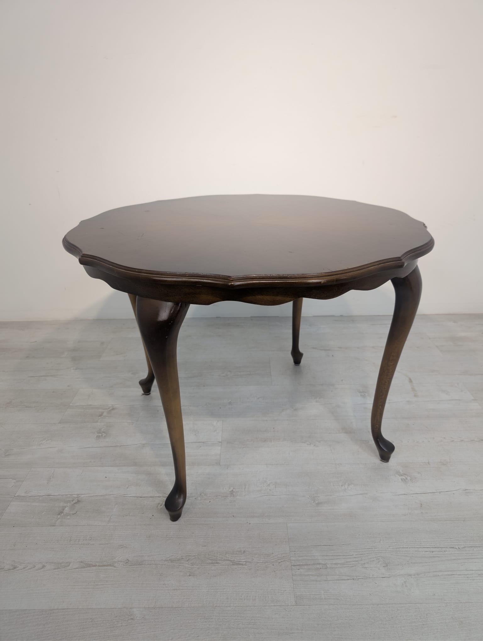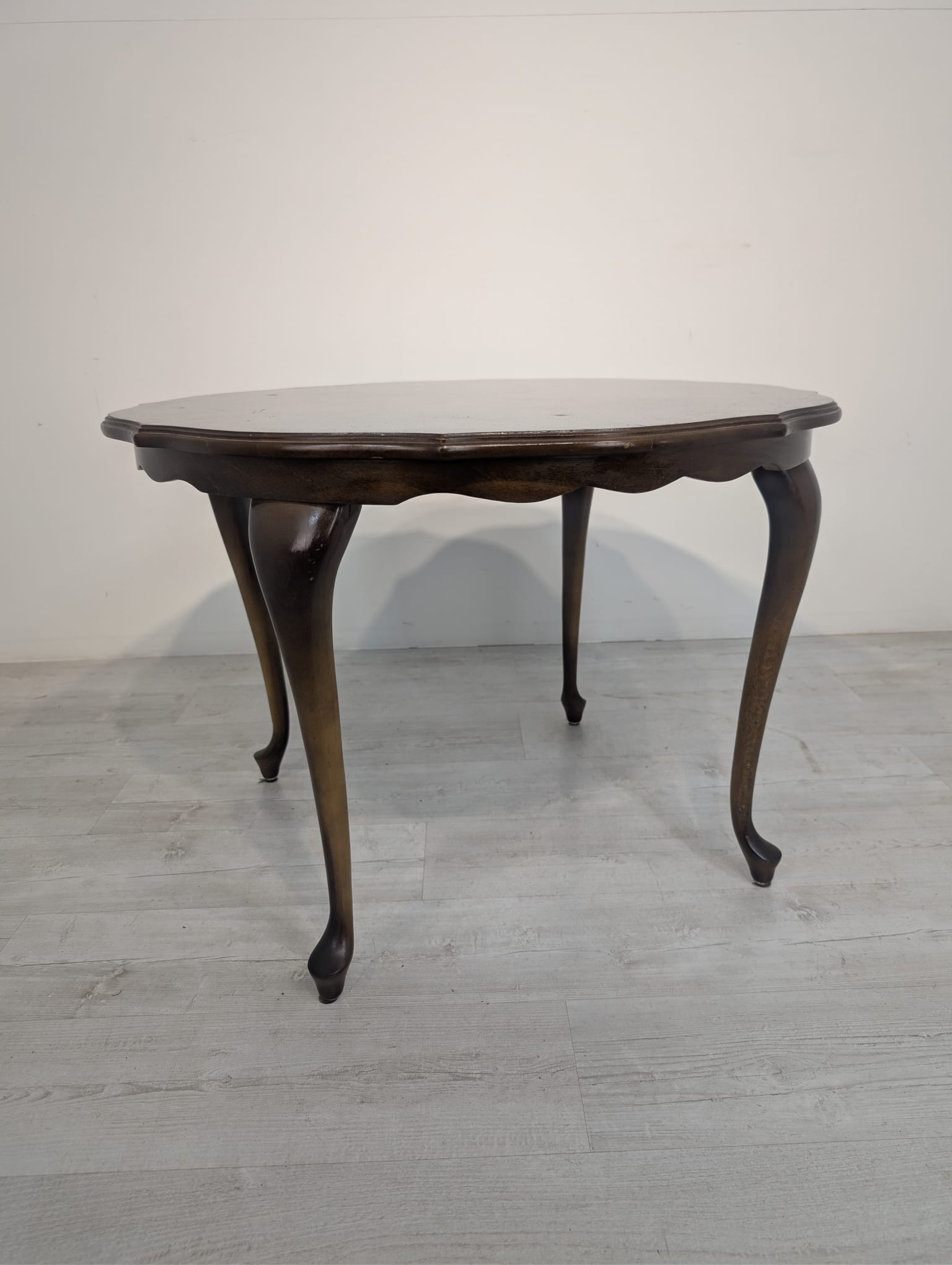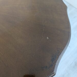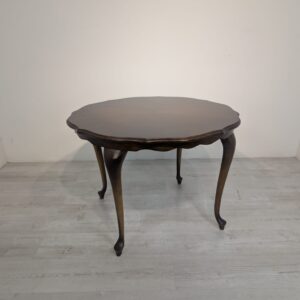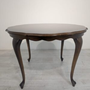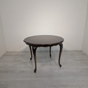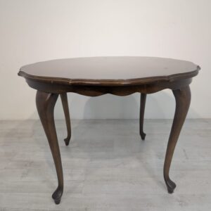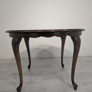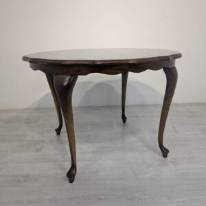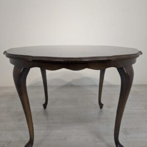 Stylowy stolik kawowy w stylu ludwikowskim wykonany z drewna orzechowego. Mebel posiada charakterystyczne nogi w kształcie litery S oraz zaokrąglony blat. Stolik jest używany, ale w dobrym stanie.