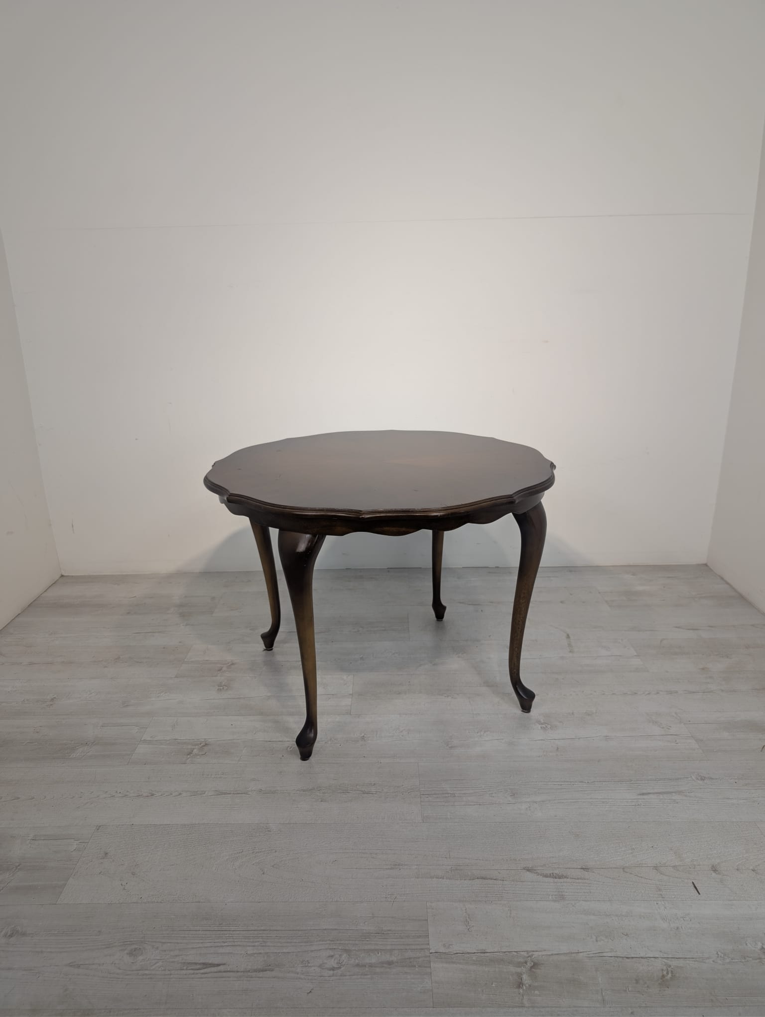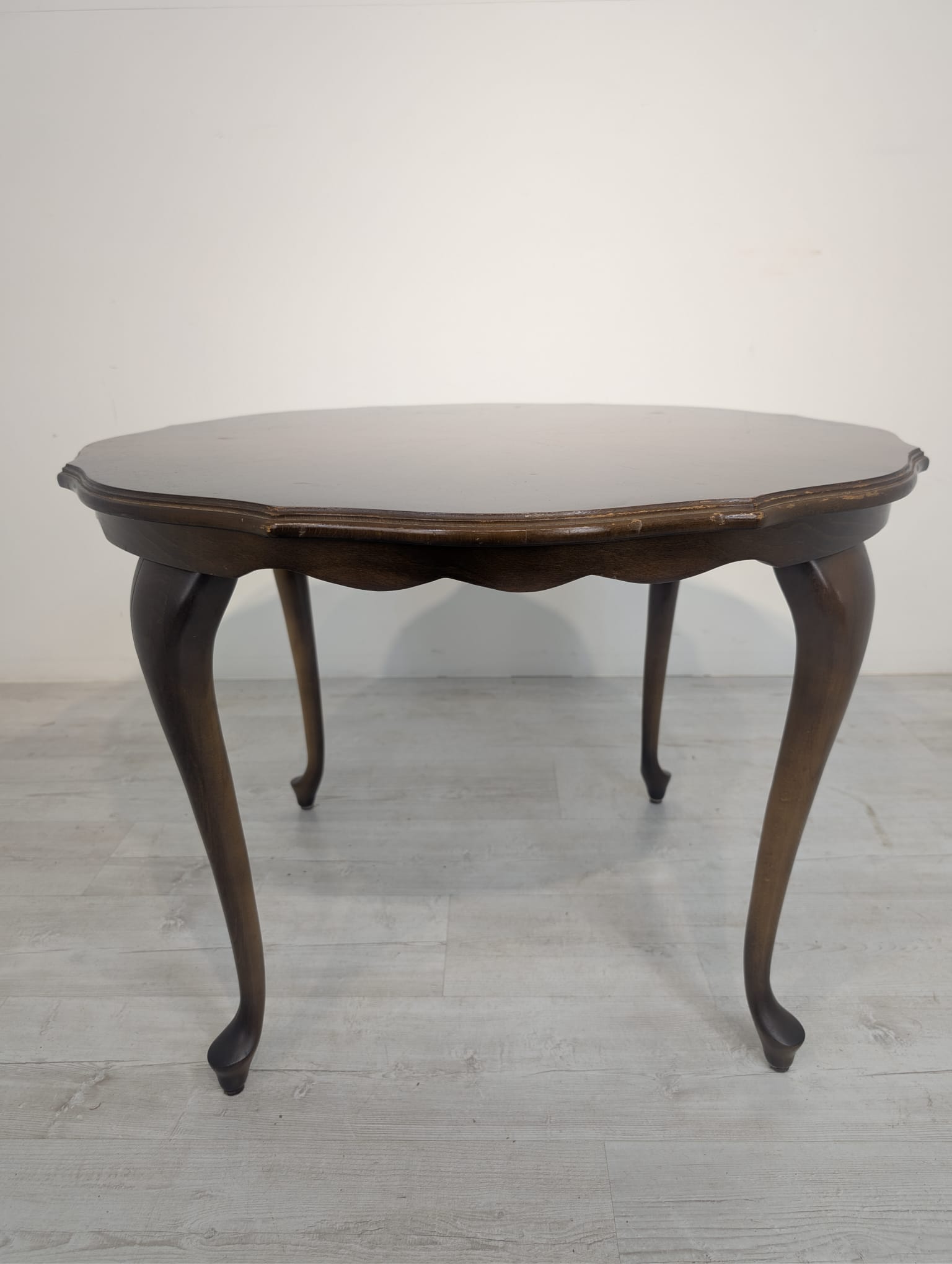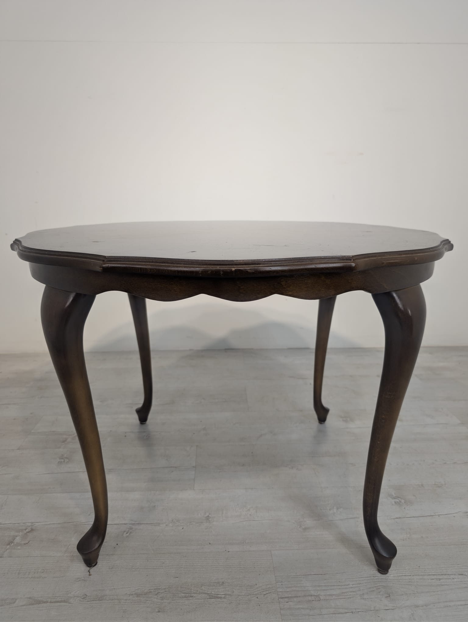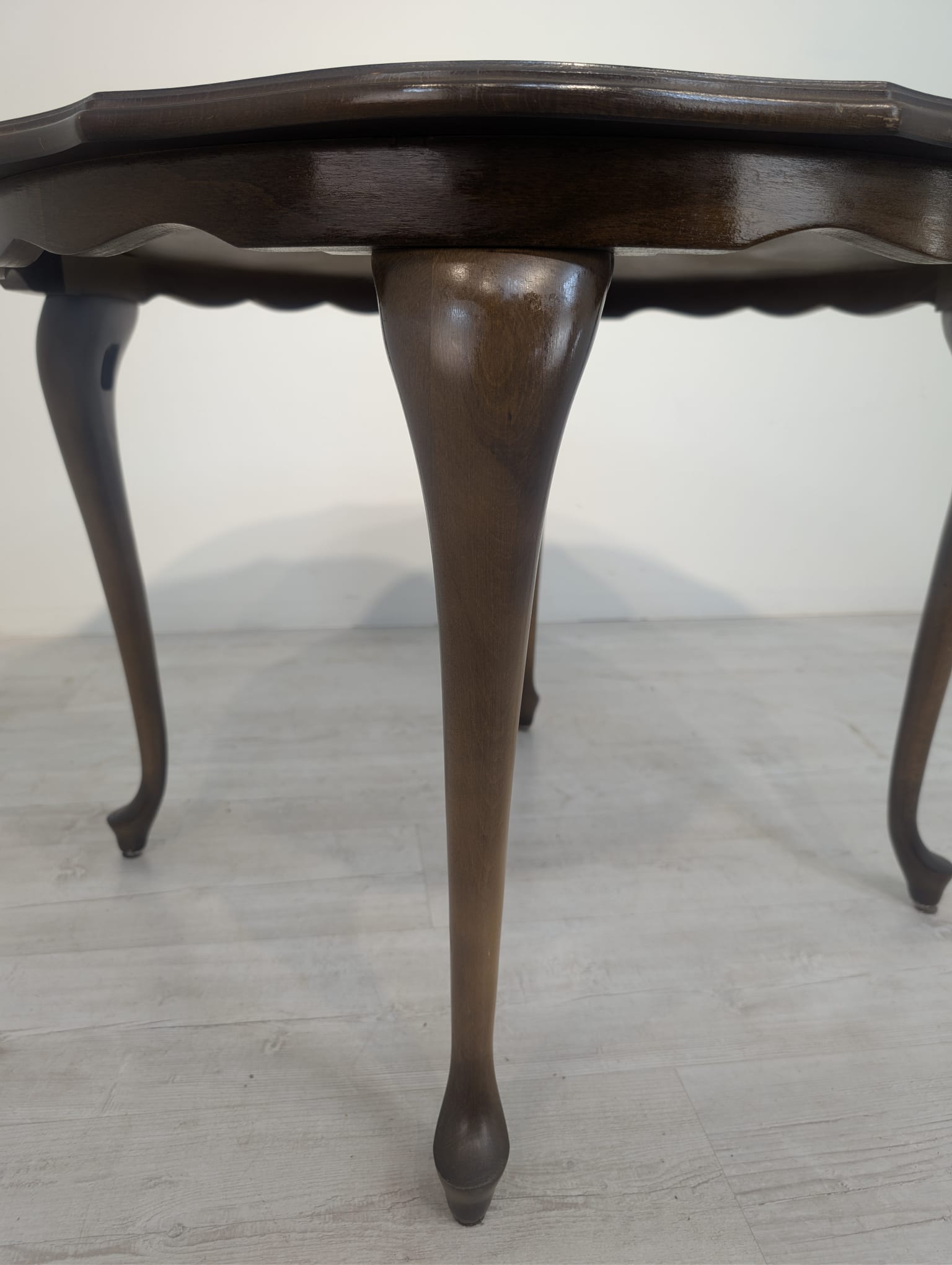Stylowy stolik kawowy w stylu ludwikowskim wykonany z drewna orzechowego. Mebel posiada charakterystyczne nogi w kształcie litery S oraz zaokrąglony blat. Stolik jest używany, ale w dobrym stanie.