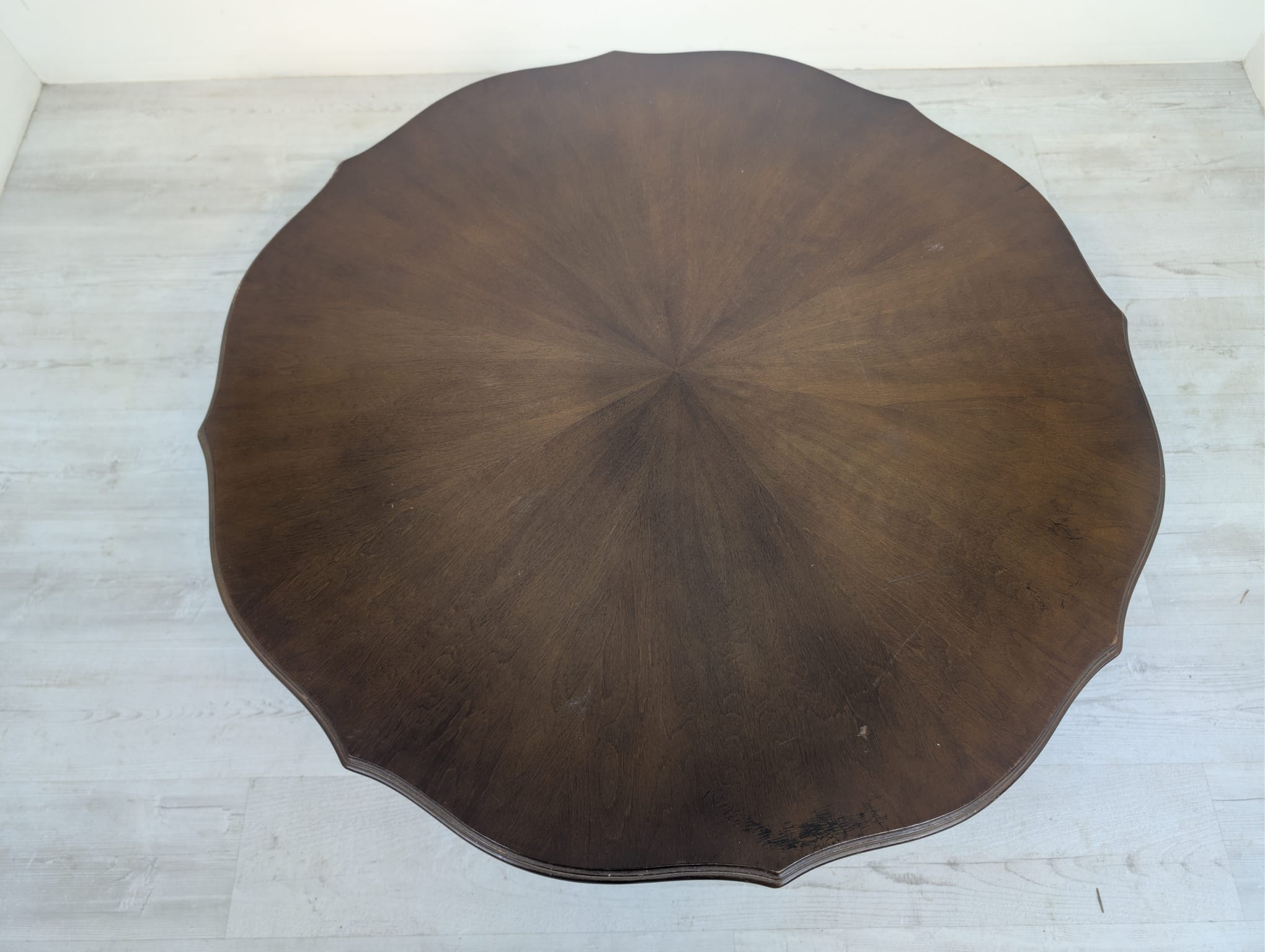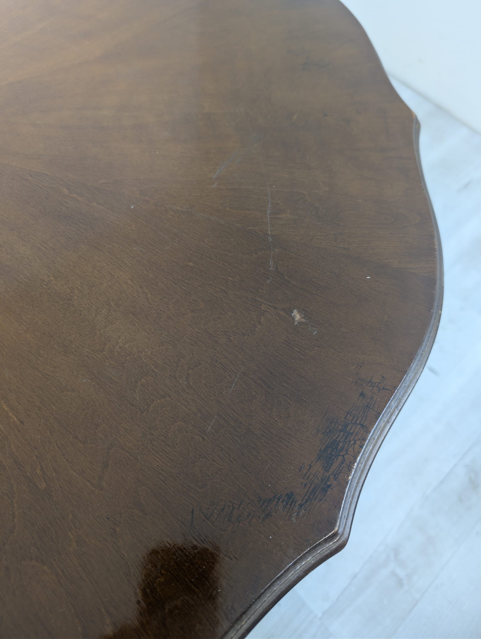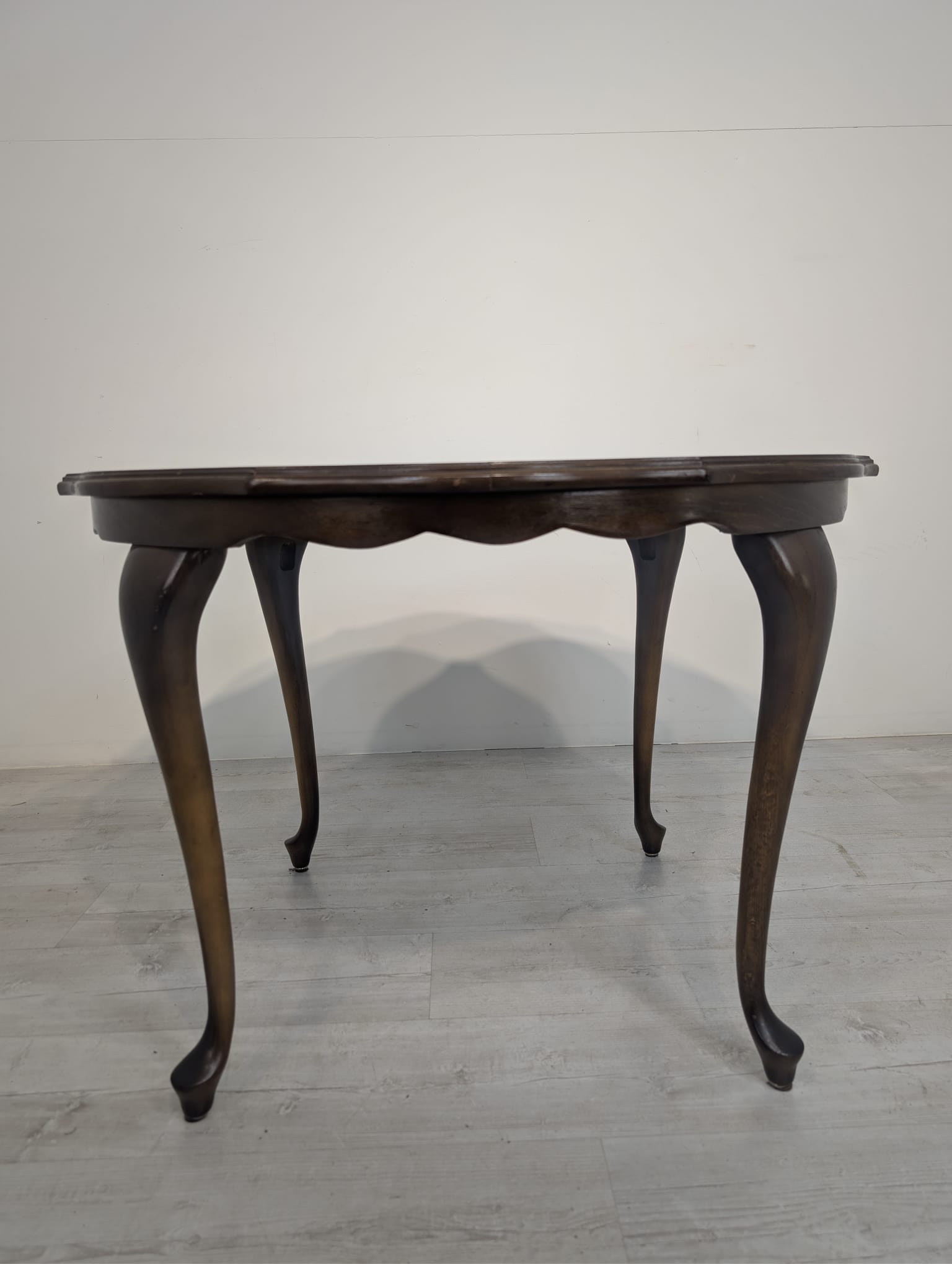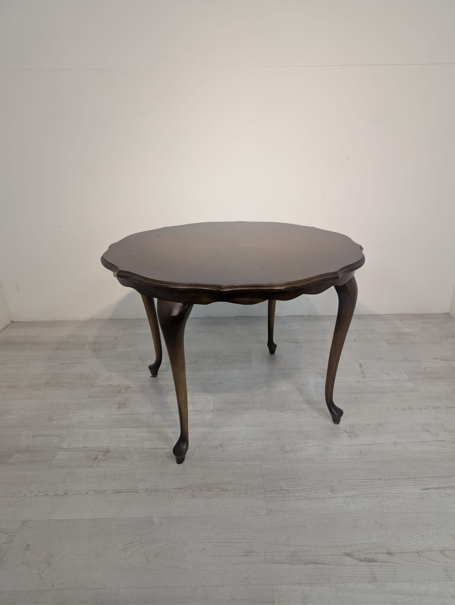 Stylowy stolik kawowy w stylu ludwikowskim wykonany z drewna orzechowego. Mebel posiada charakterystyczne nogi w kształcie litery S oraz zaokrąglony blat. Stolik jest używany, ale w dobrym stanie.
