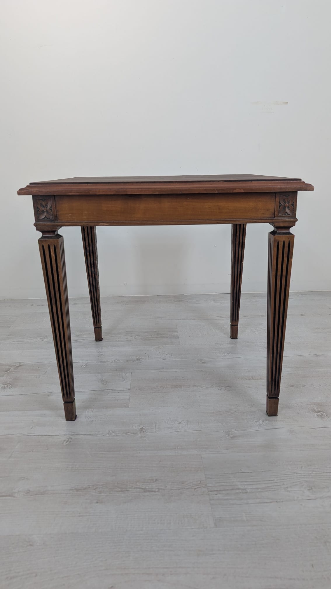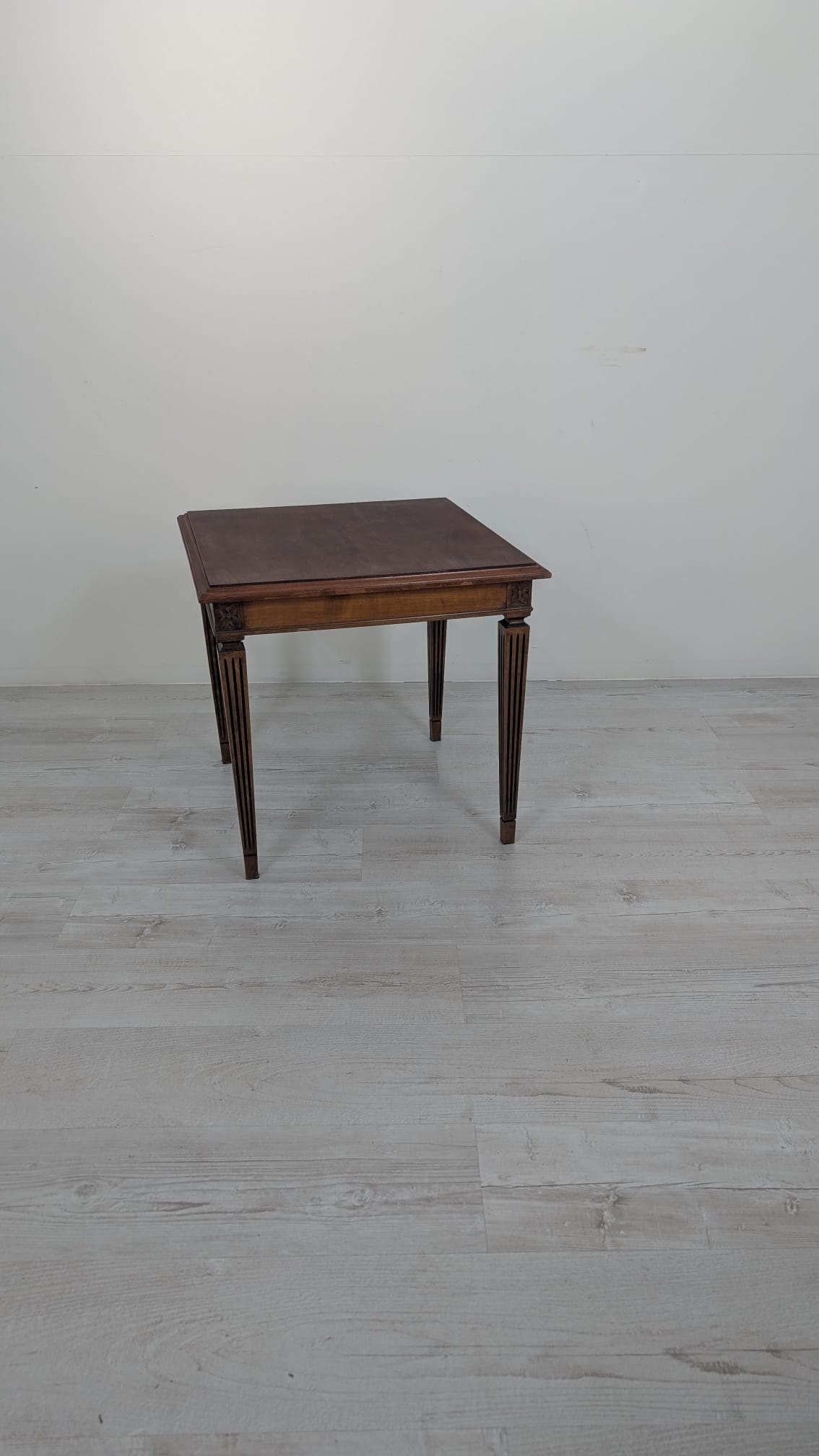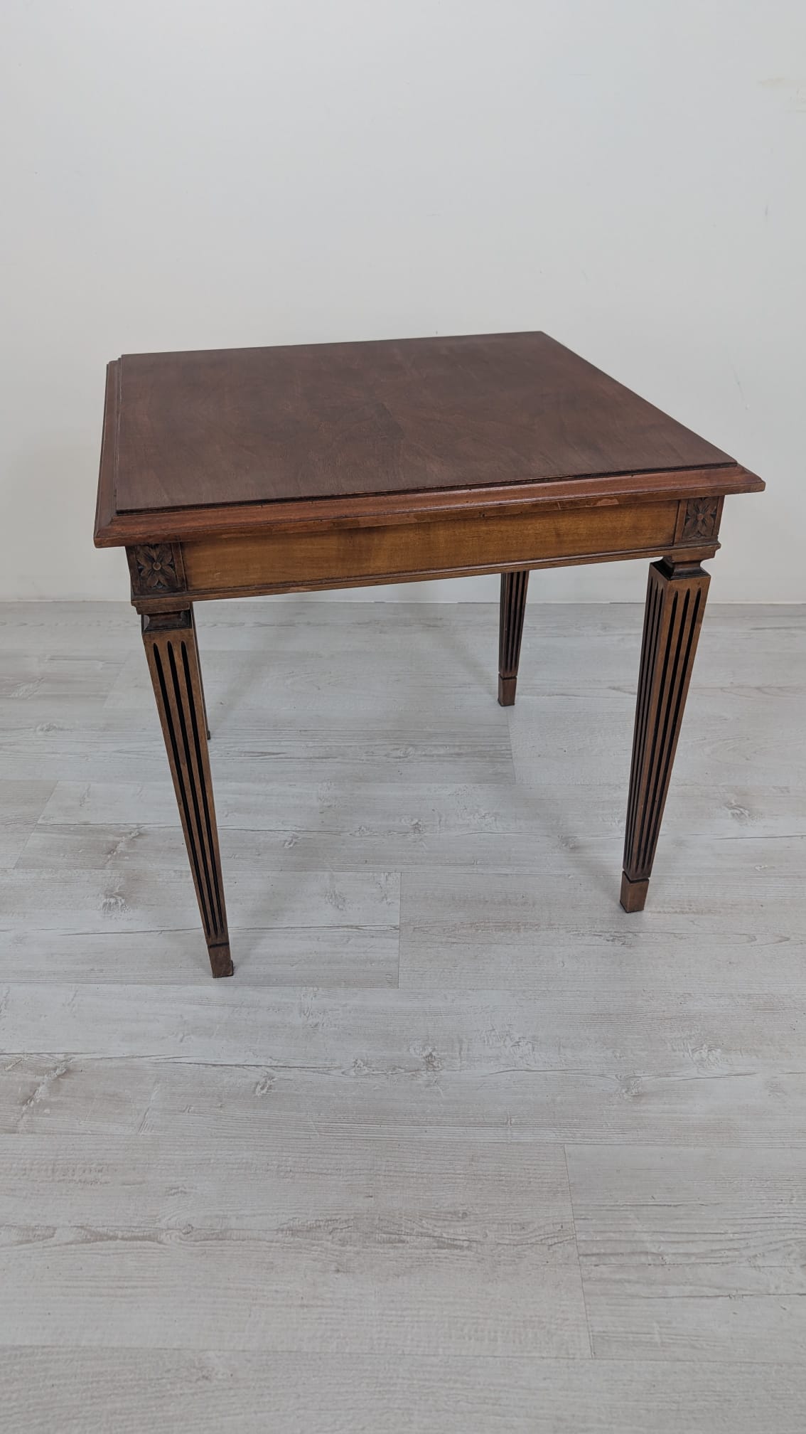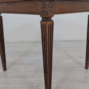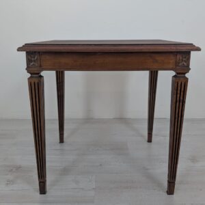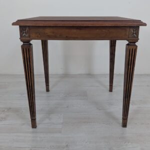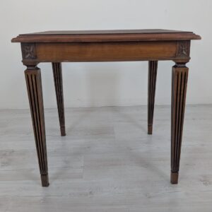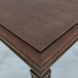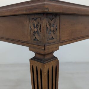 Stylowy stolik kawowy w stylu Ludwika XVII z XIX wieku, wykonany z drewna orzechowego. Mebel posiada elegancką, kwadratową formę oraz zdobione nogi. Stolik będzie pasować do klasycznego lub vintage’owego wystroju wnętrza.