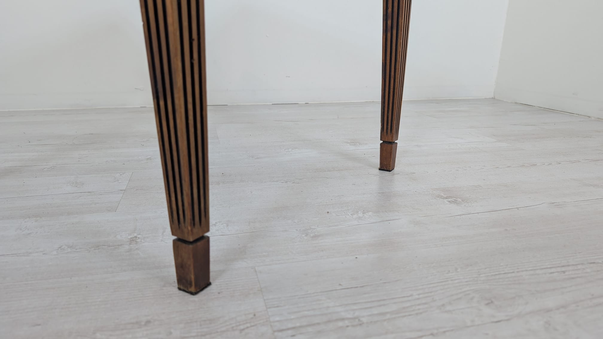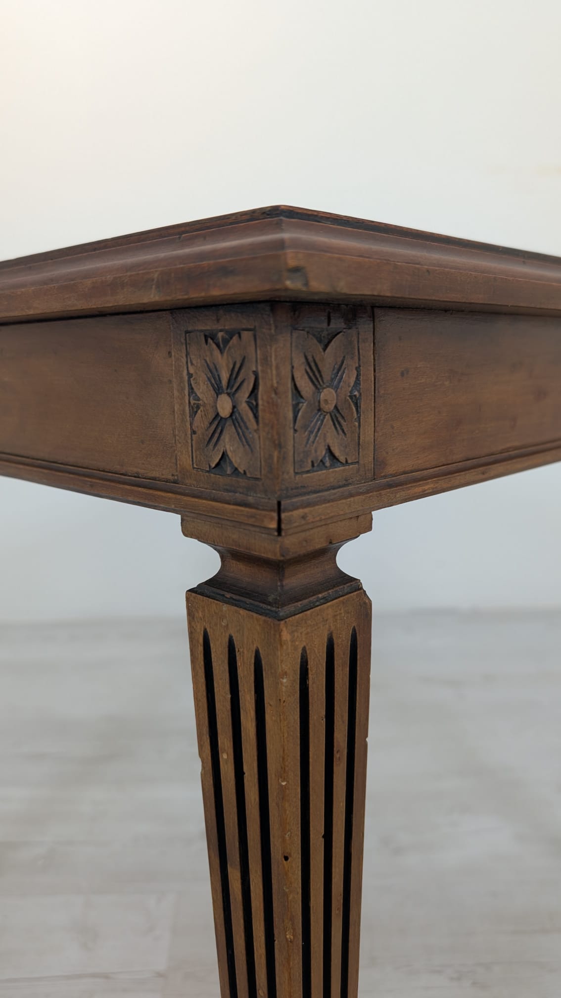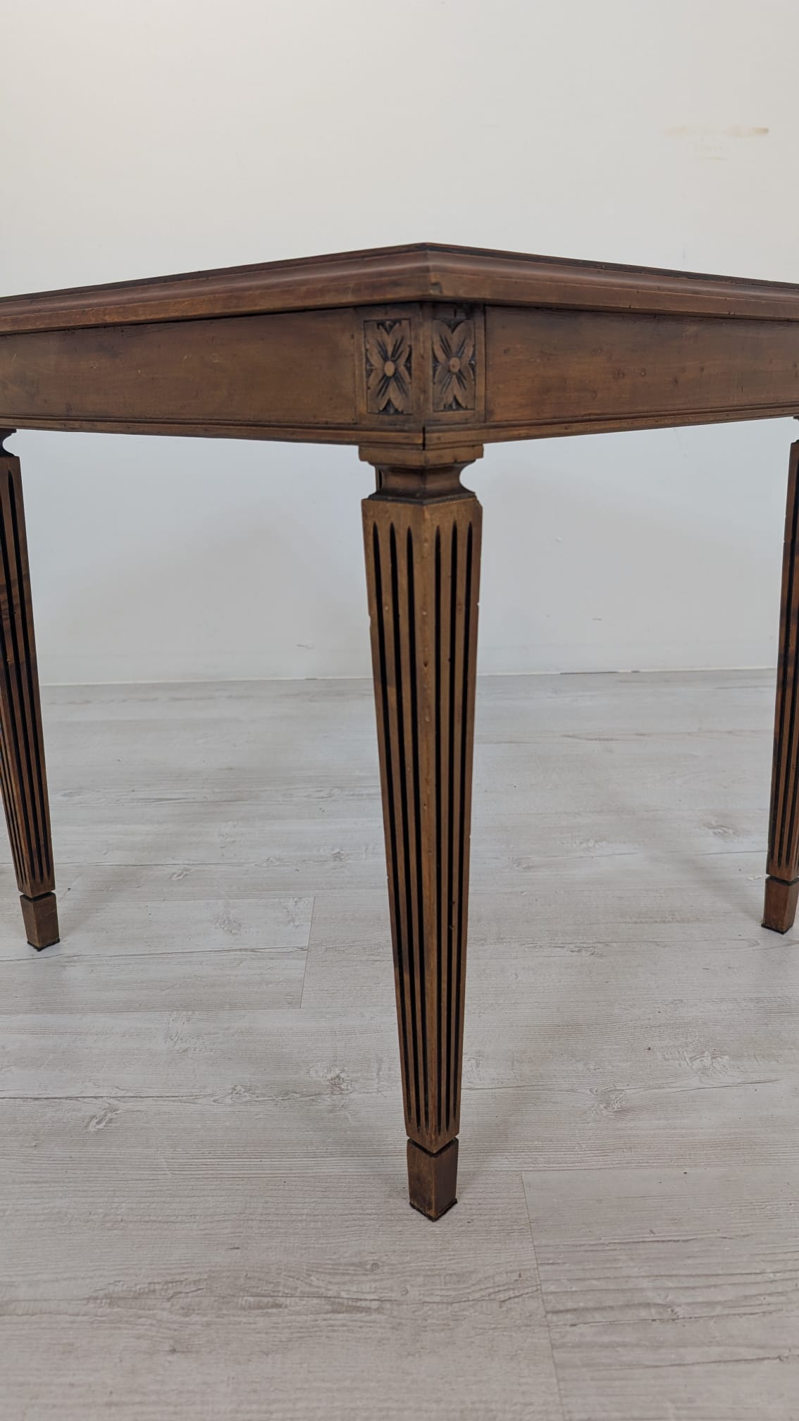 Stylowy stolik kawowy w stylu Ludwika XVII z XIX wieku, wykonany z drewna orzechowego. Mebel posiada elegancką, kwadratową formę oraz zdobione nogi. Stolik będzie pasować do klasycznego lub vintage’owego wystroju wnętrza.