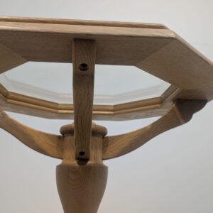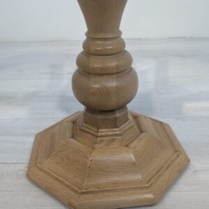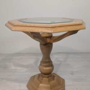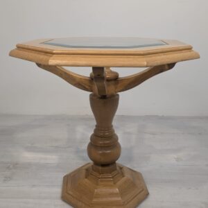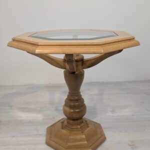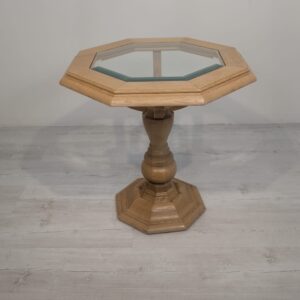 Stylowy, ośmiokątny stolik kawowy wykonany z drewna dębowego w jasnym odcieniu. Blat posiada fazowane szkło, co nadaje mu elegancki wygląd. Solidna konstrukcja i przemyślany design sprawiają, że ten stolik będzie doskonałym uzupełnieniem każdego salonu.