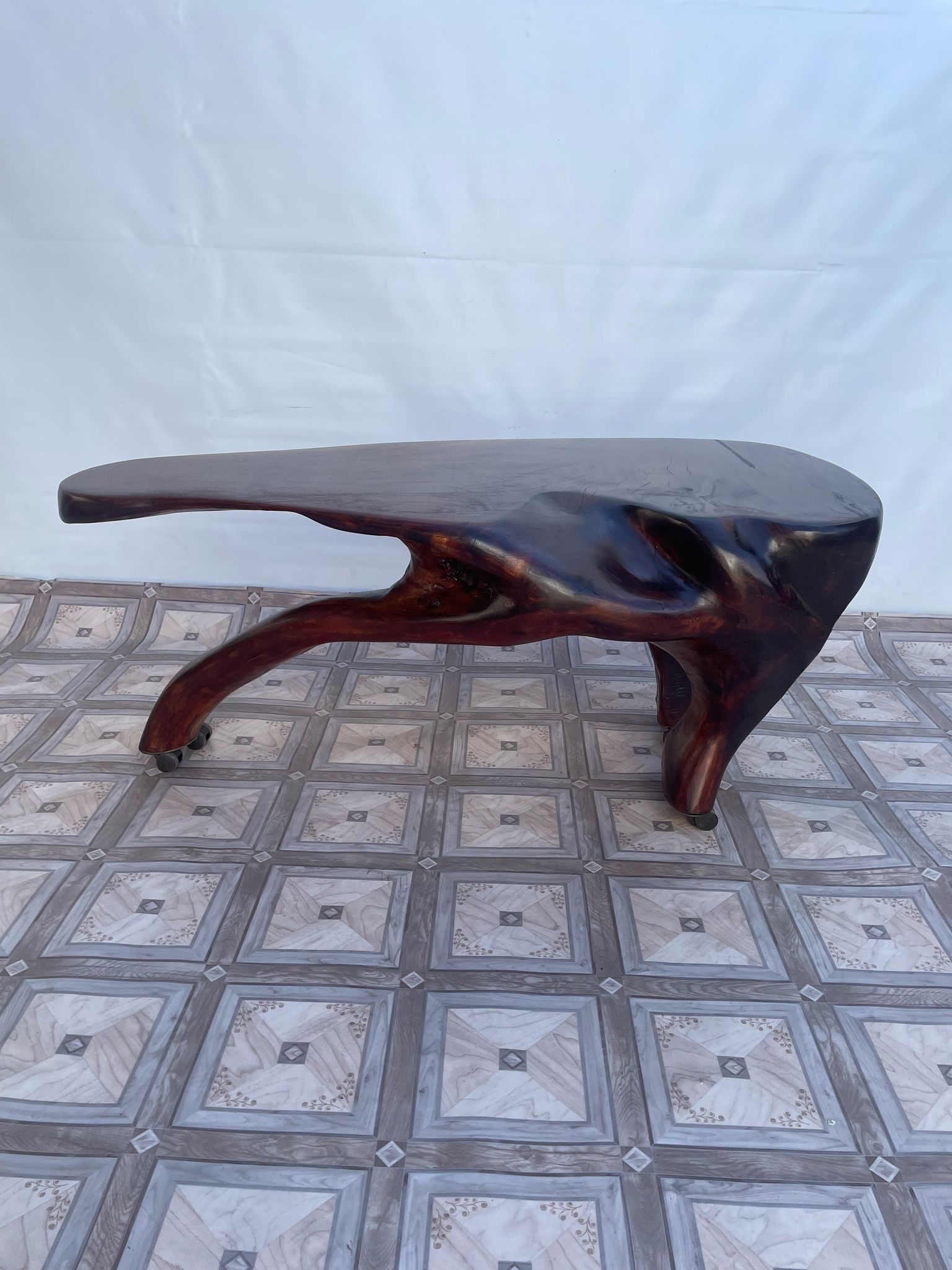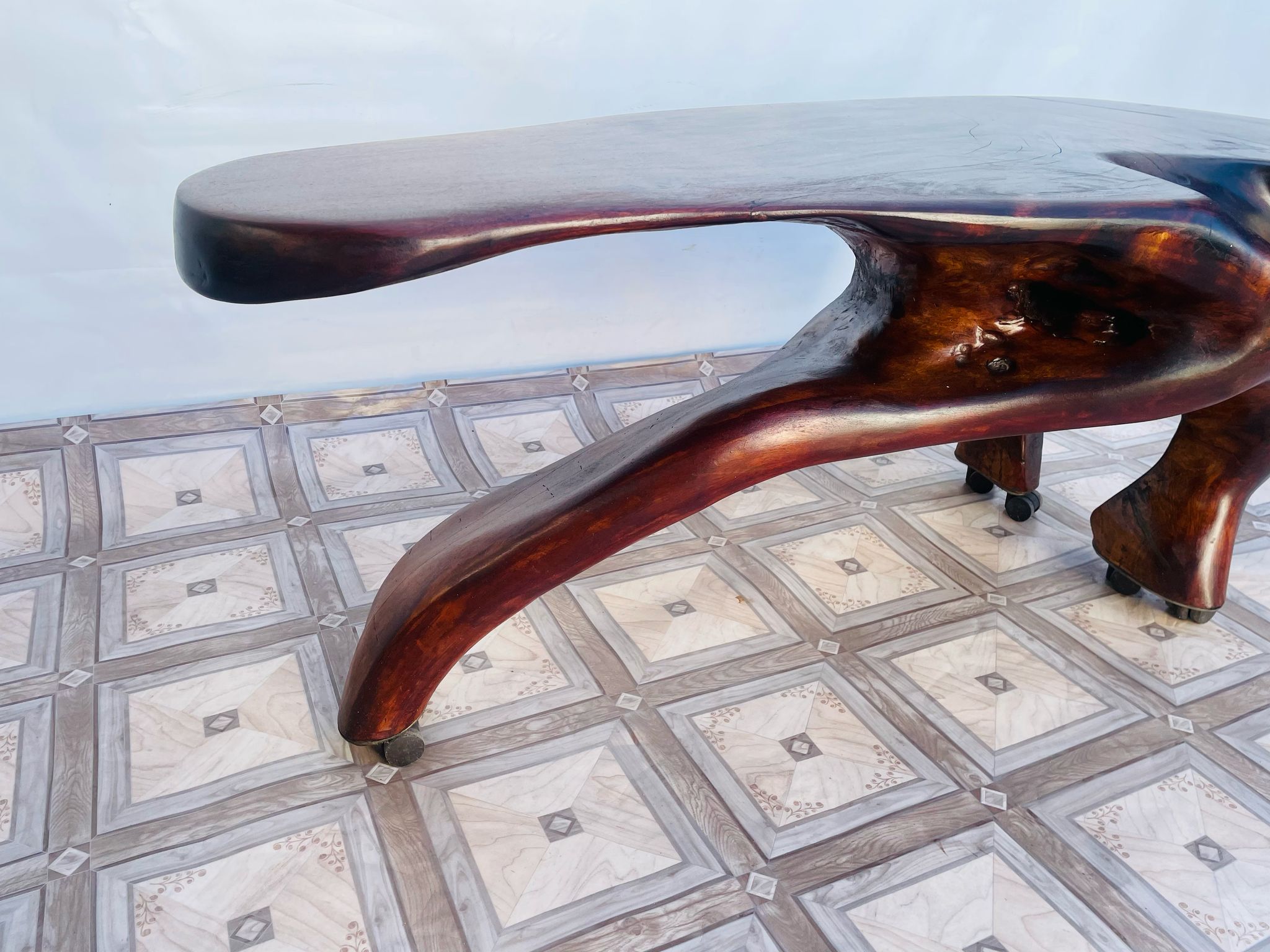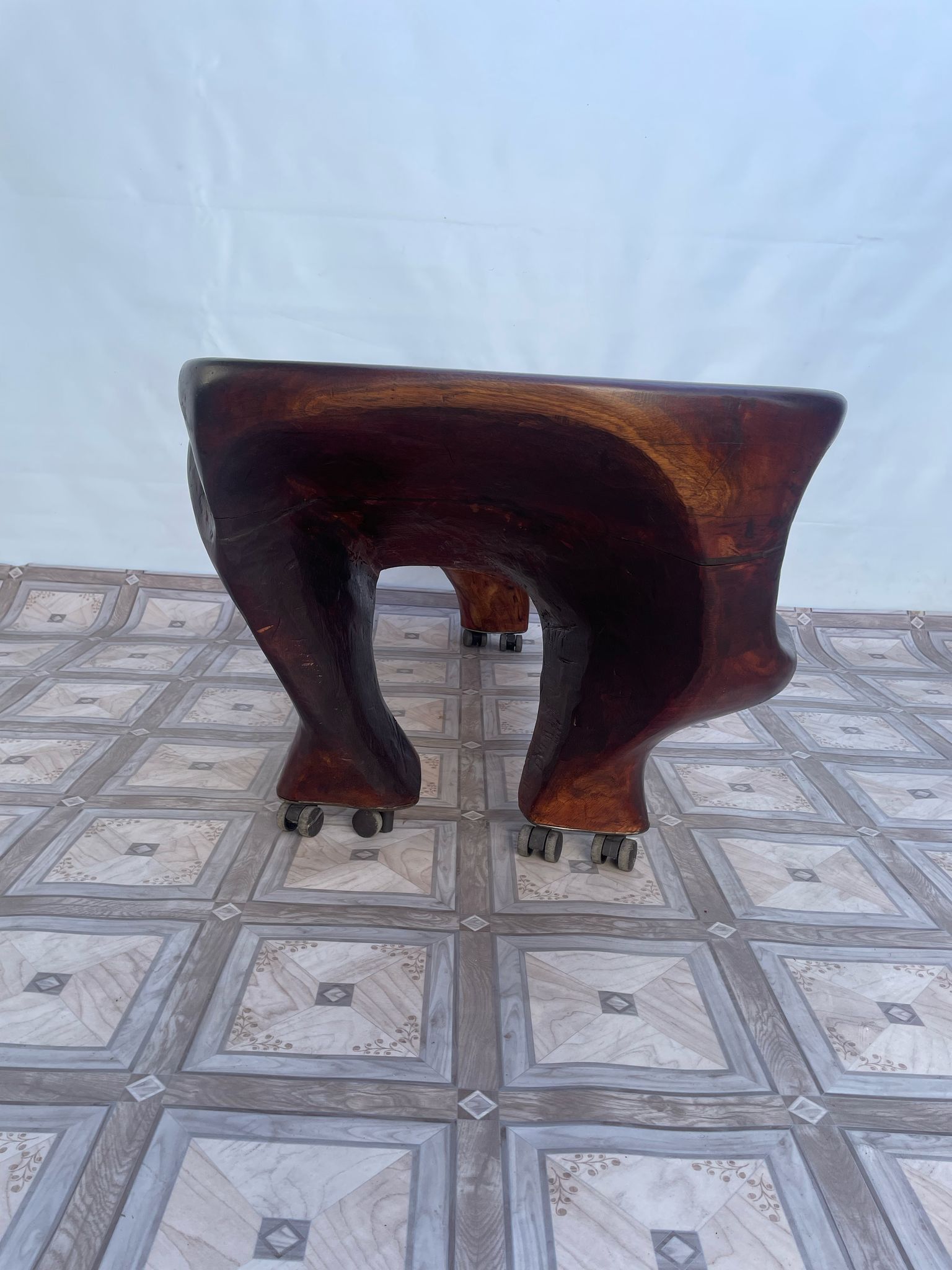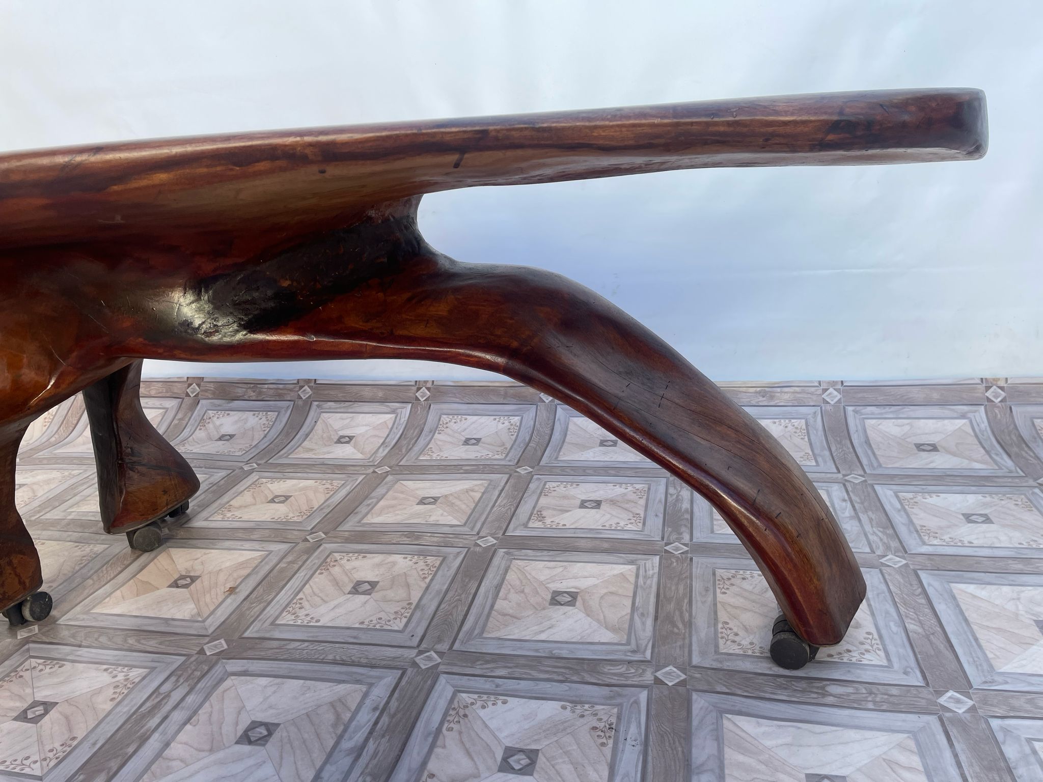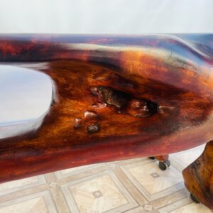 Stolik, ława stylowa z litego korzenia mango ma kółkach.