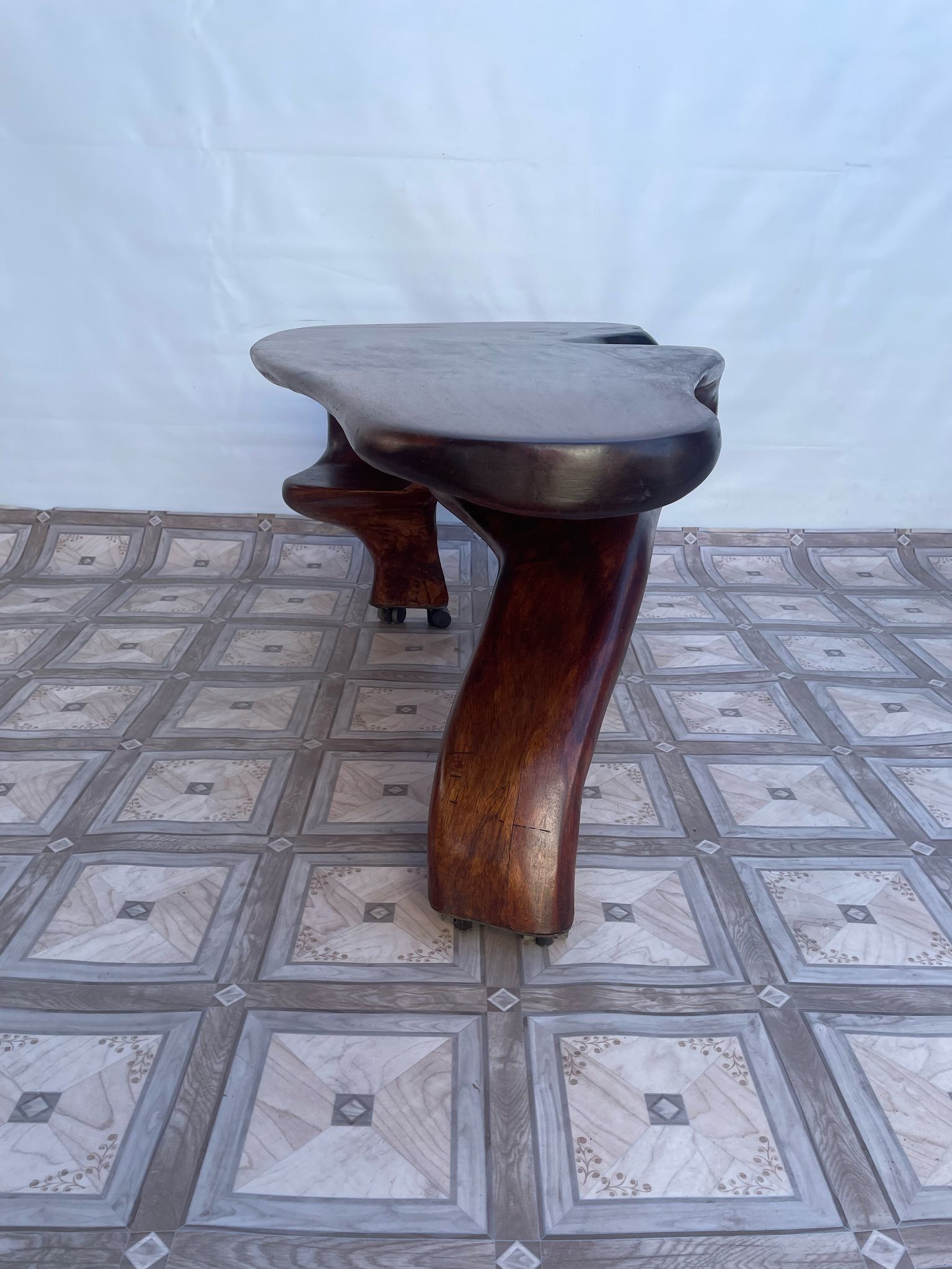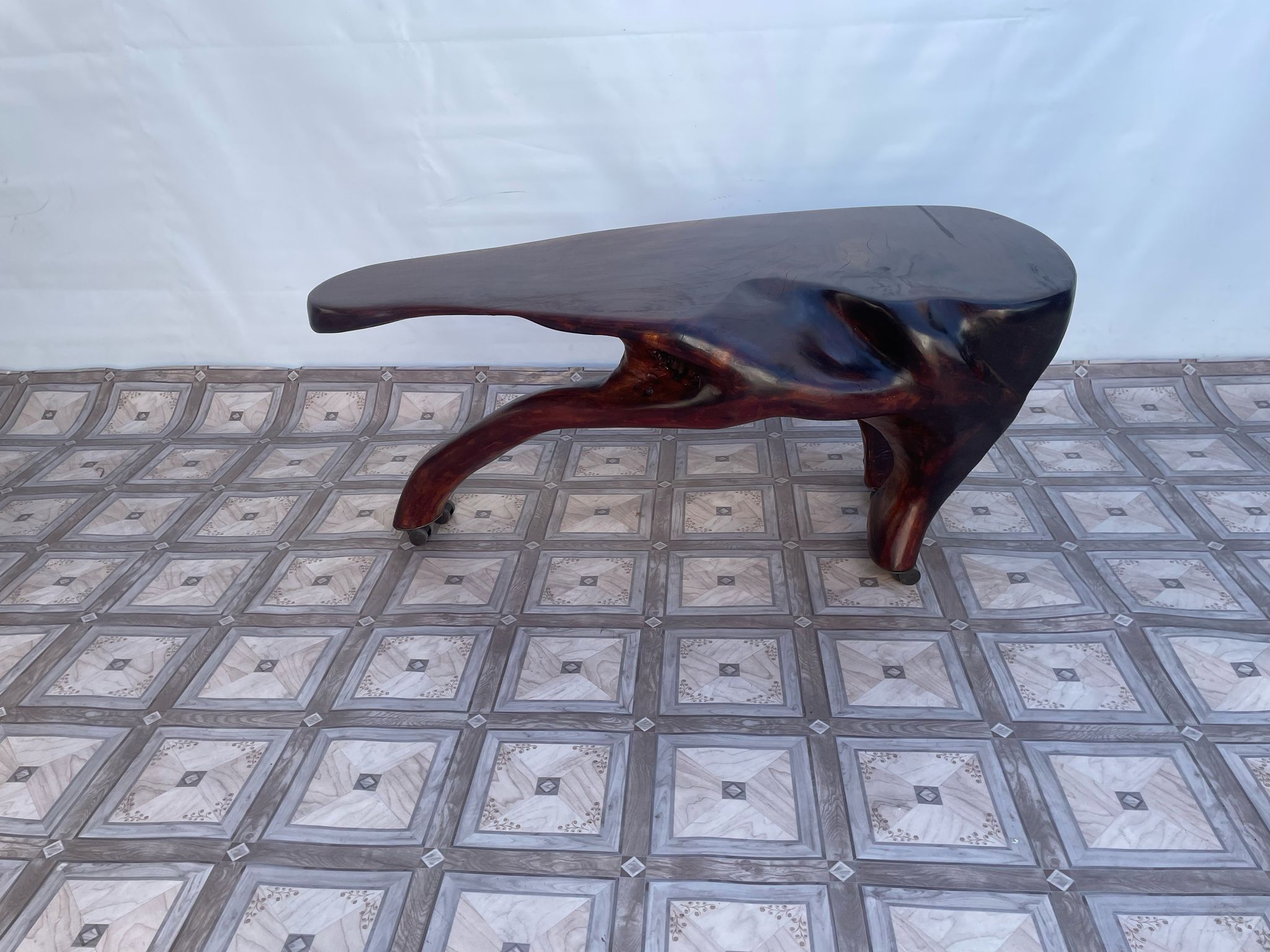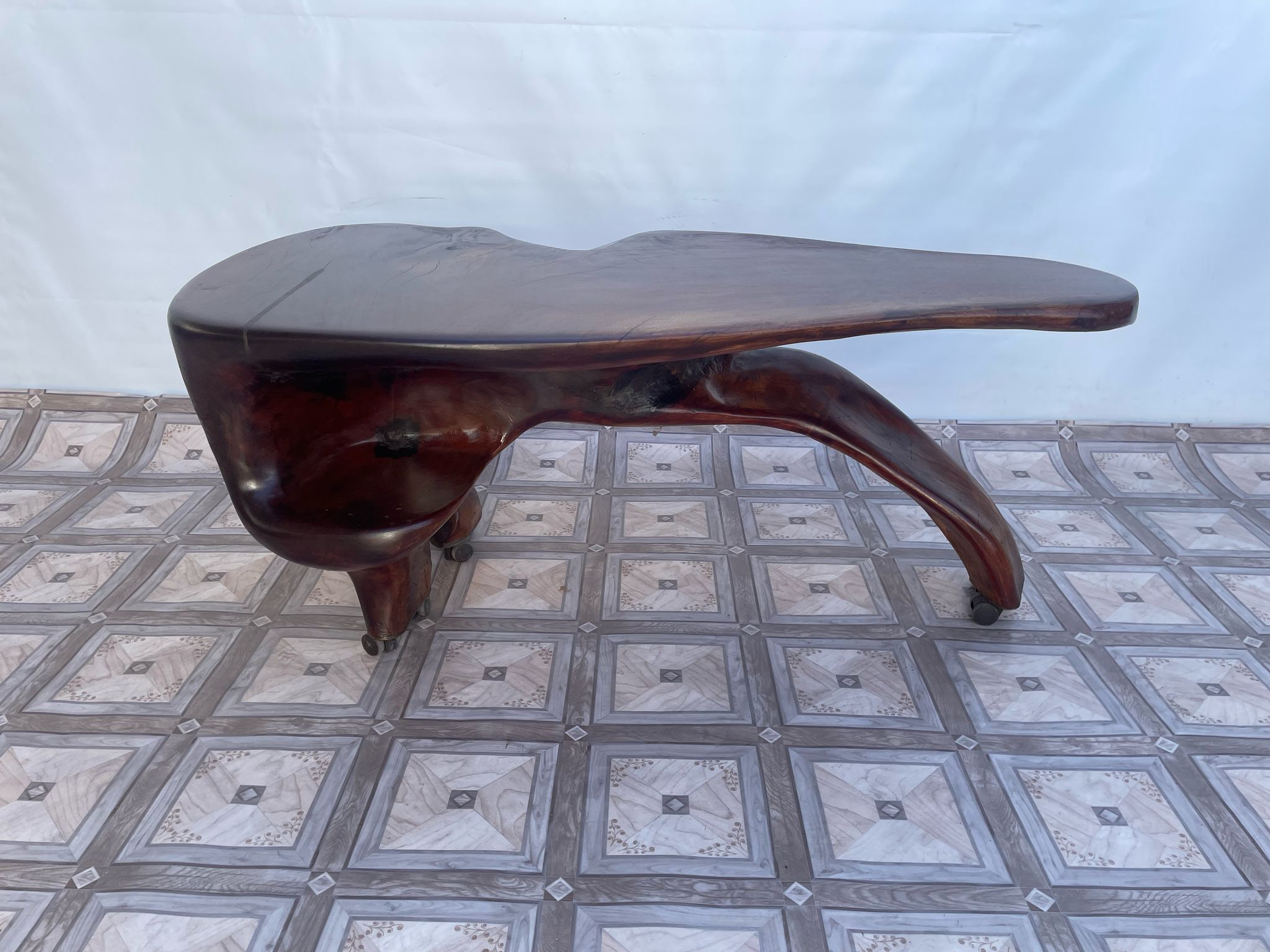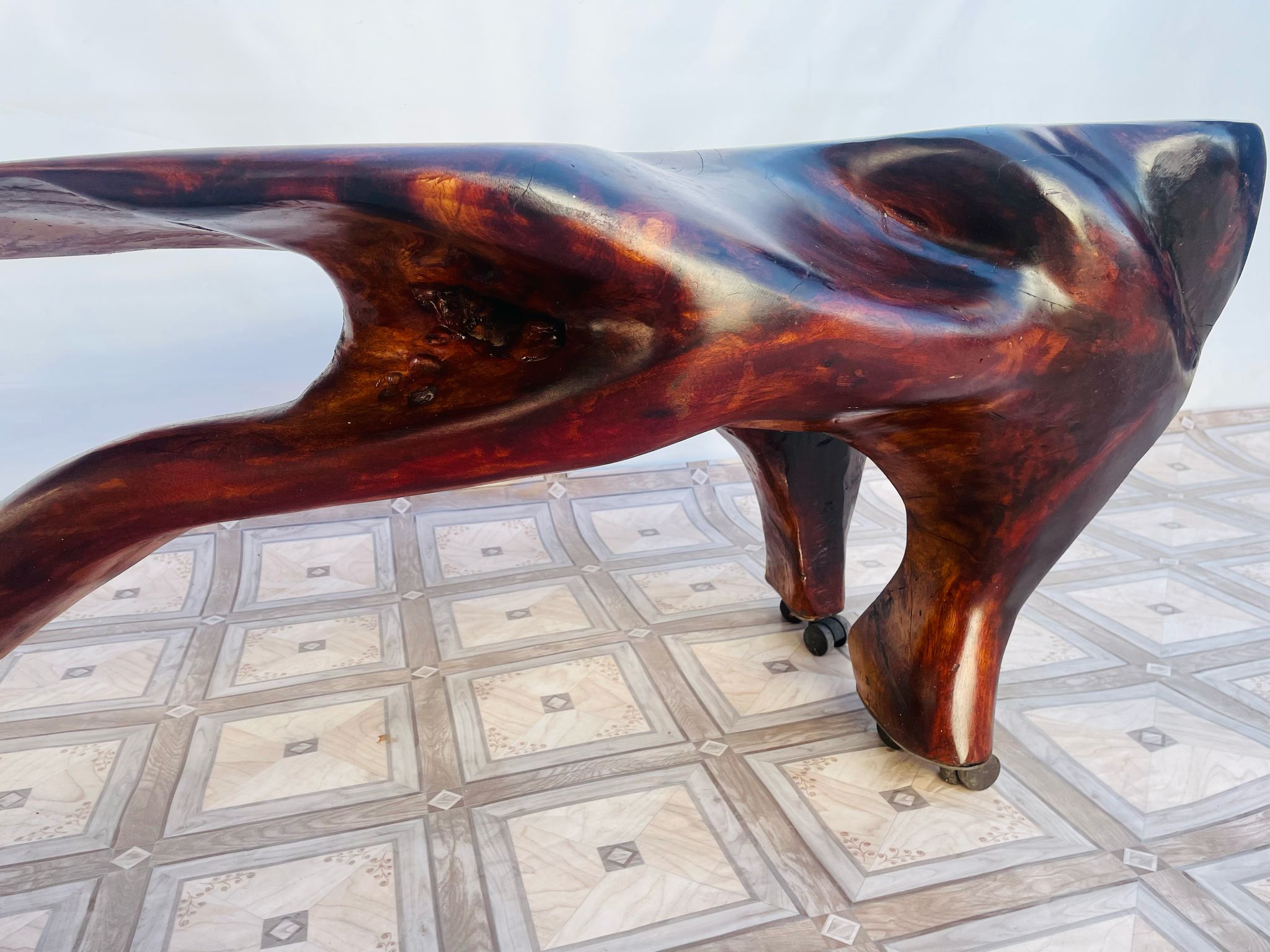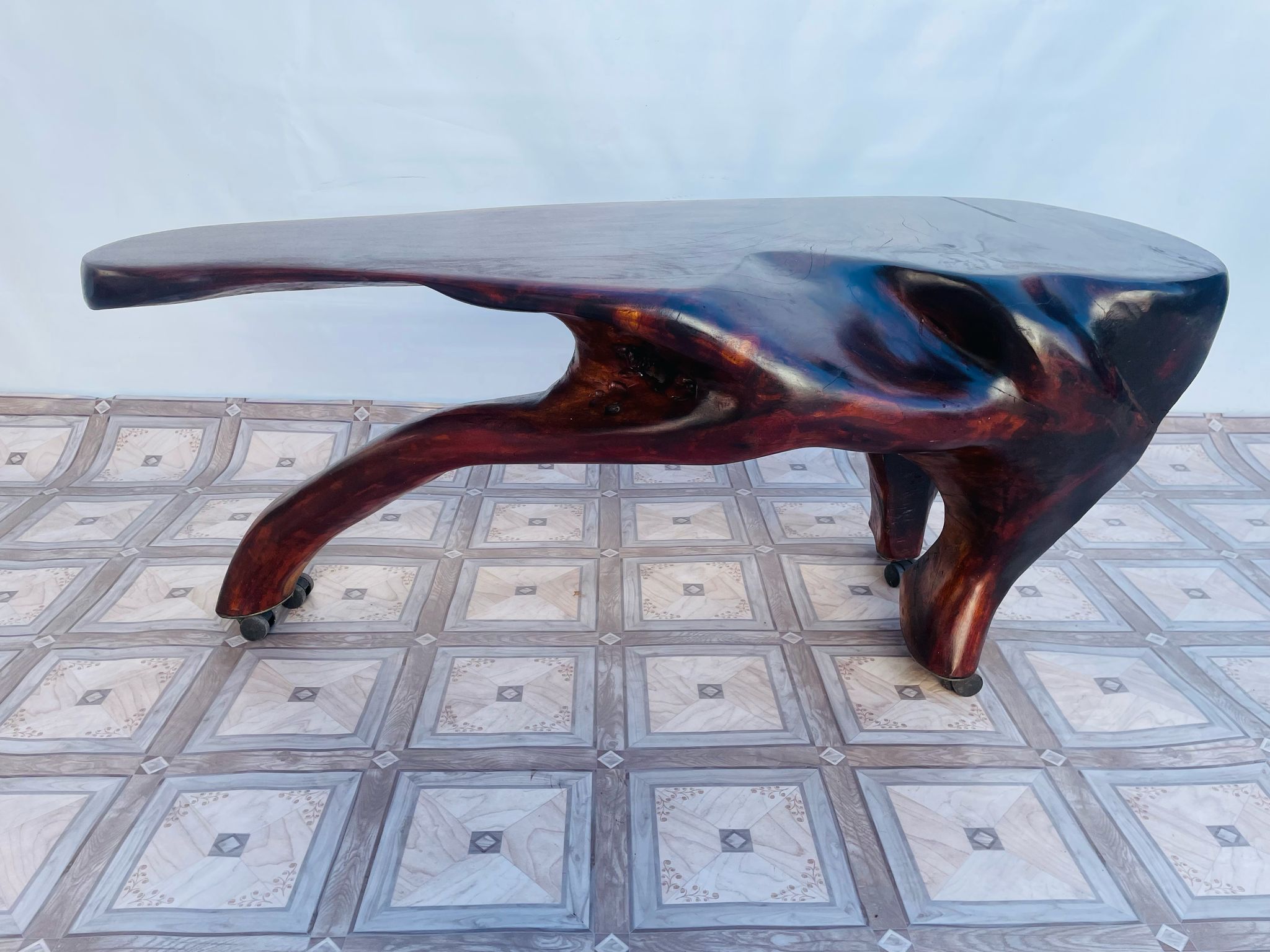 Stolik, ława stylowa z litego korzenia mango ma kółkach.