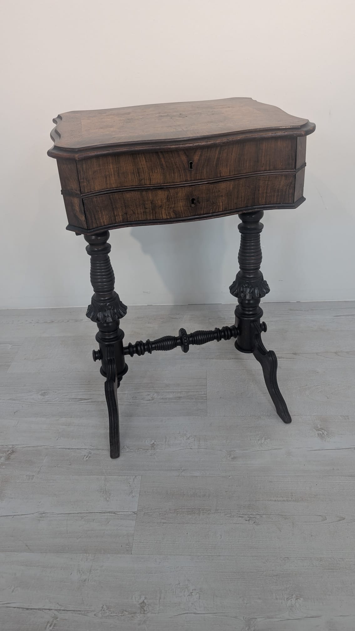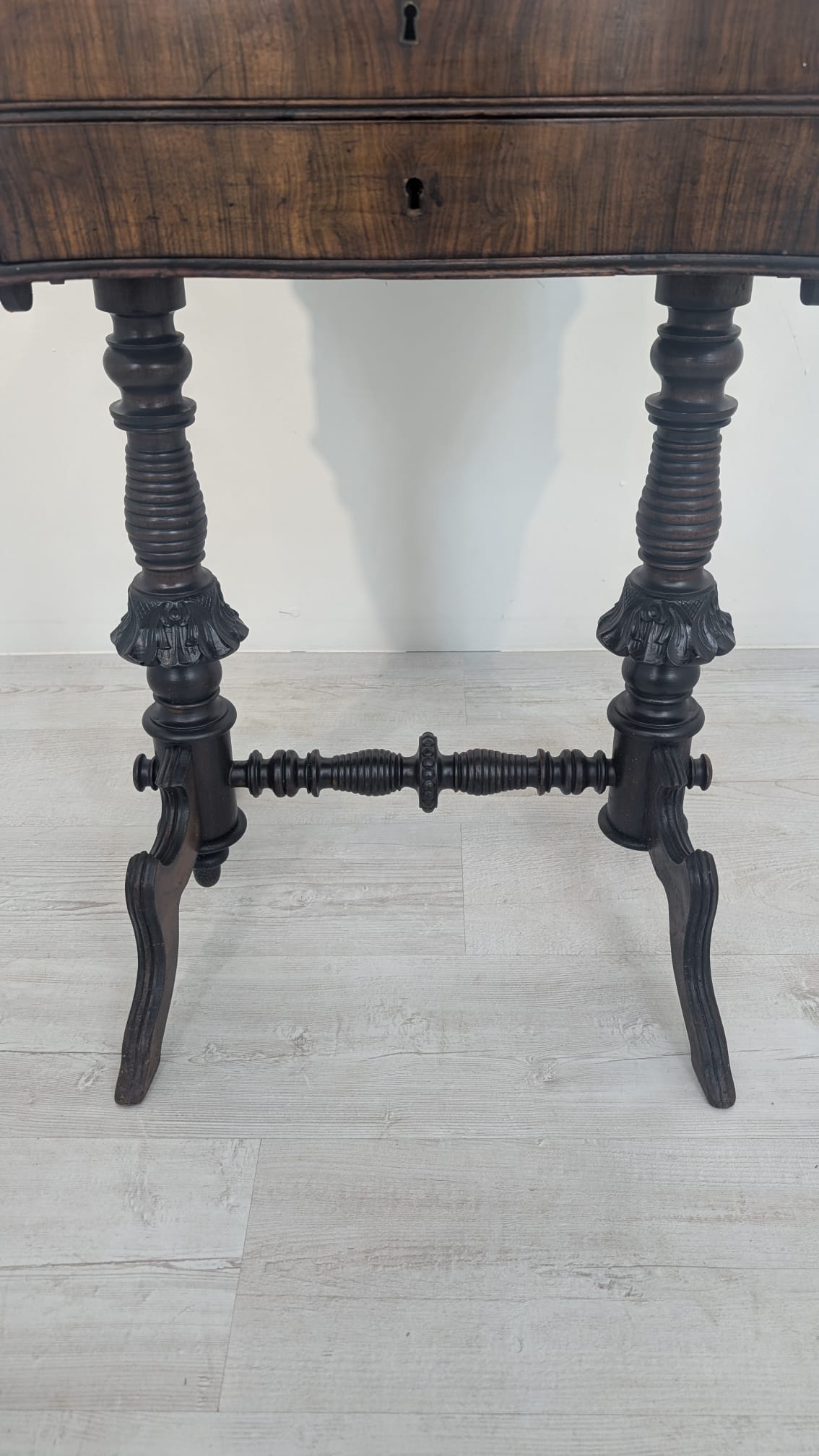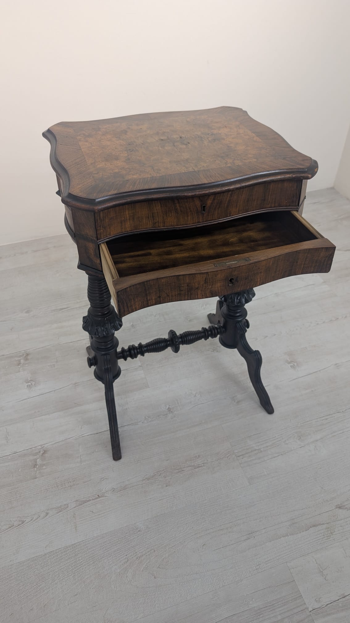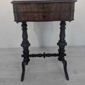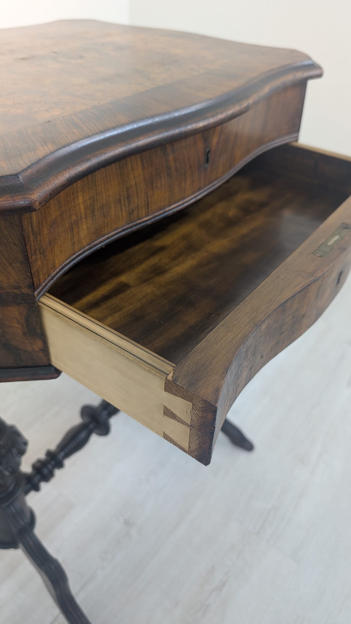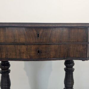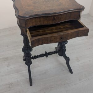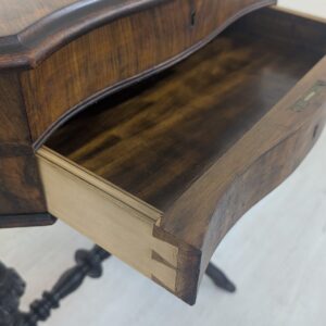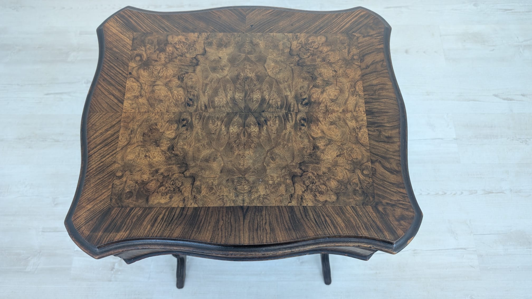 Stylowy, zabytkowy stolik drewniany w orzechu. Posiada jedną szufladę, która dodaje mu funkcjonalności. Solidna konstrukcja i piękne wykończenie sprawiają, że będzie on doskonałą ozdobą każdego wnętrza.