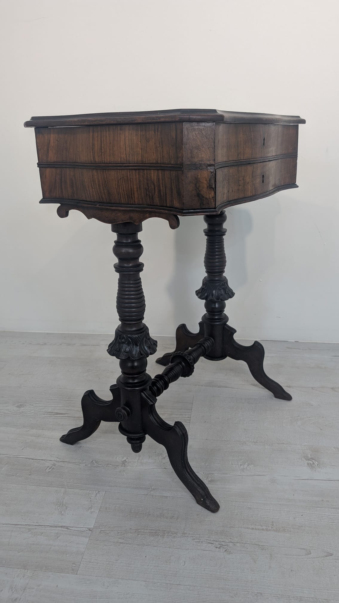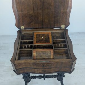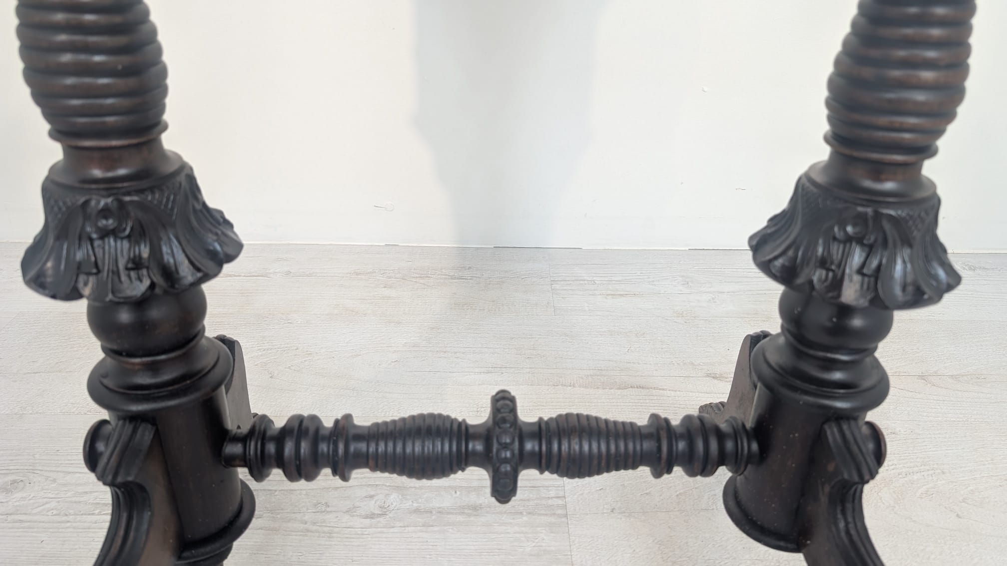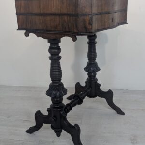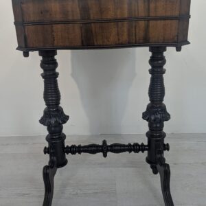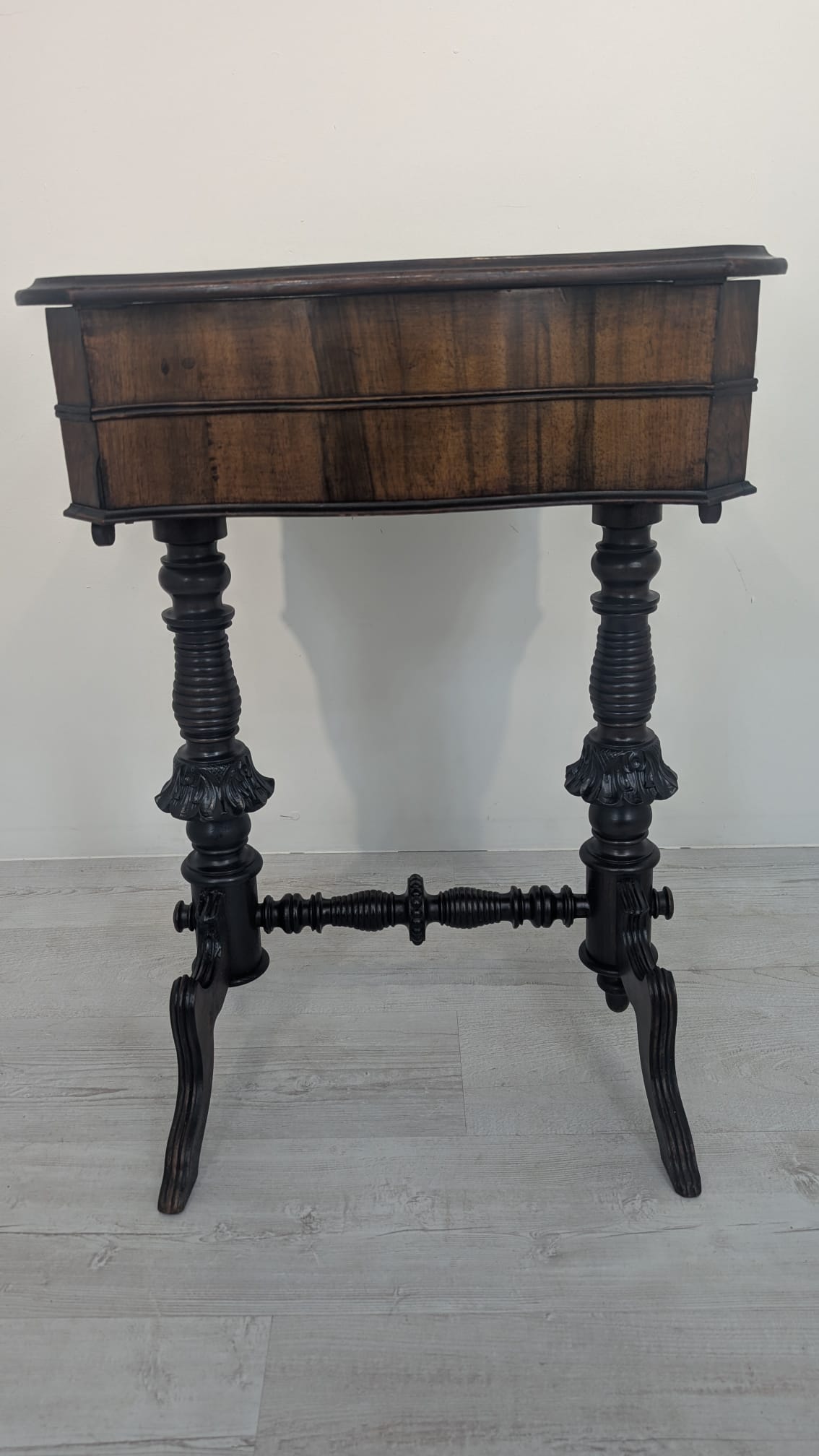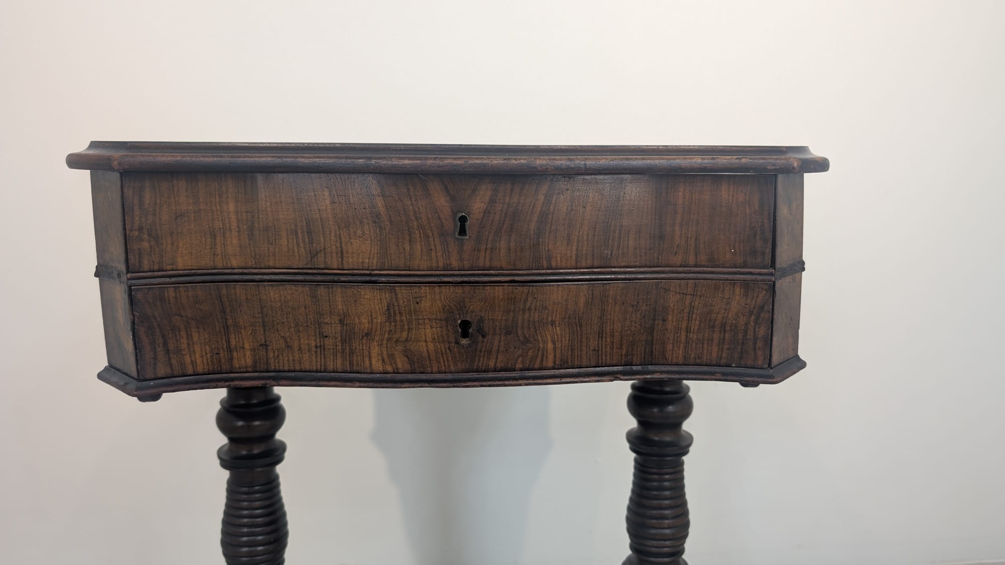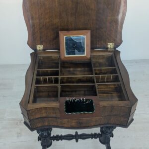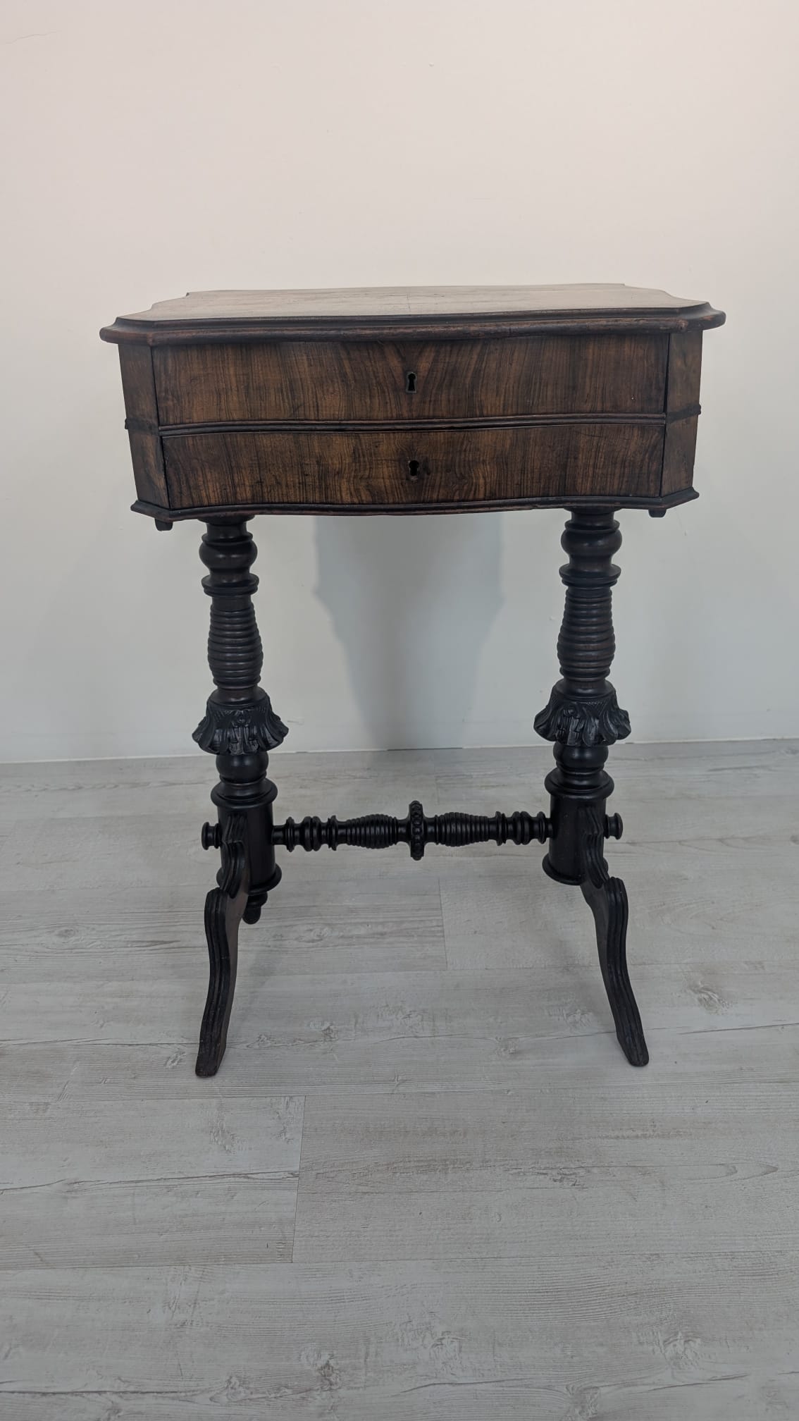 Stylowy, zabytkowy stolik drewniany w orzechu. Posiada jedną szufladę, która dodaje mu funkcjonalności. Solidna konstrukcja i piękne wykończenie sprawiają, że będzie on doskonałą ozdobą każdego wnętrza.