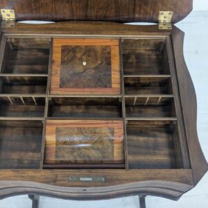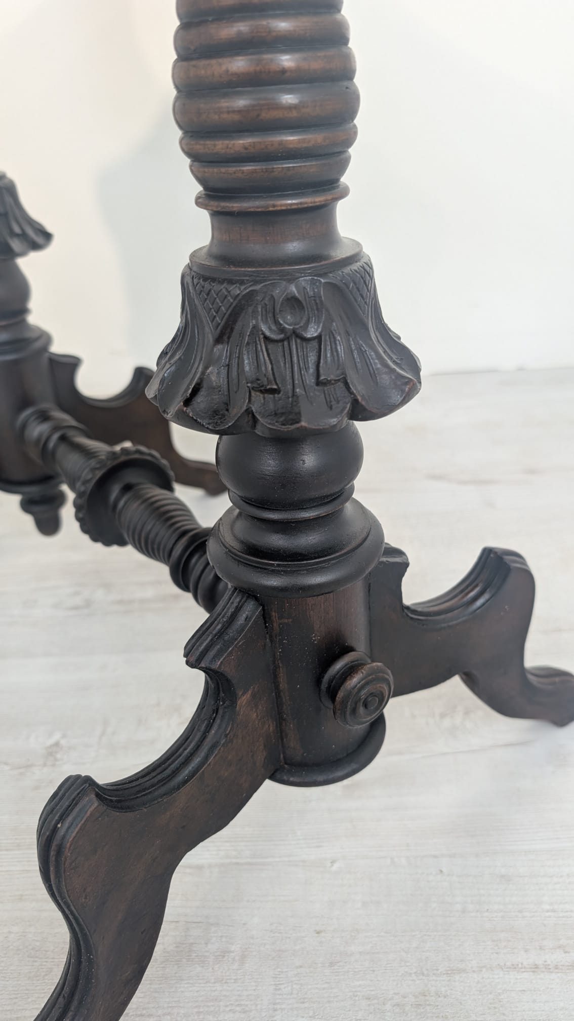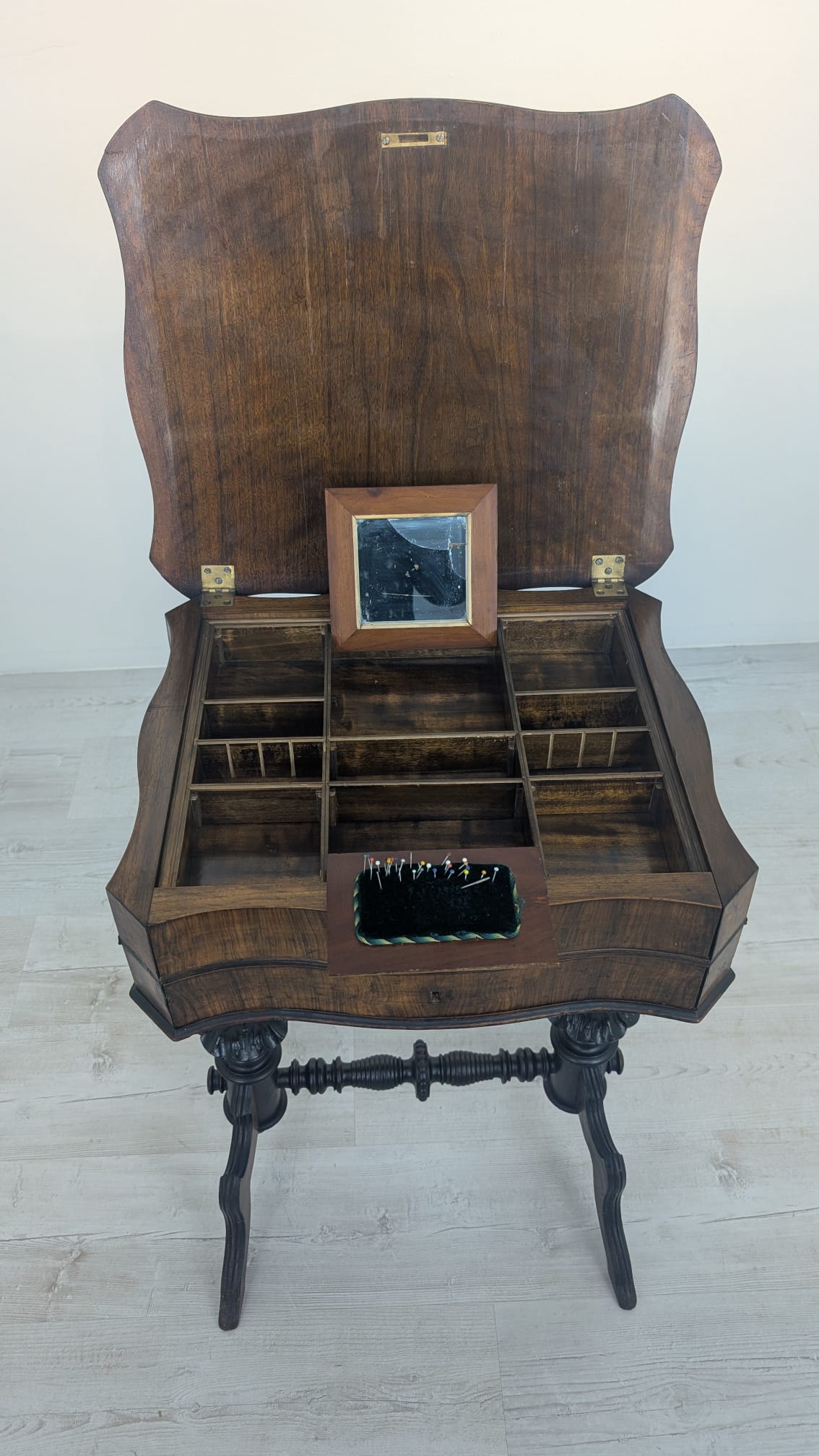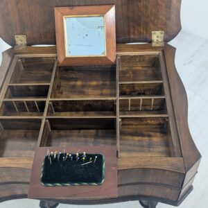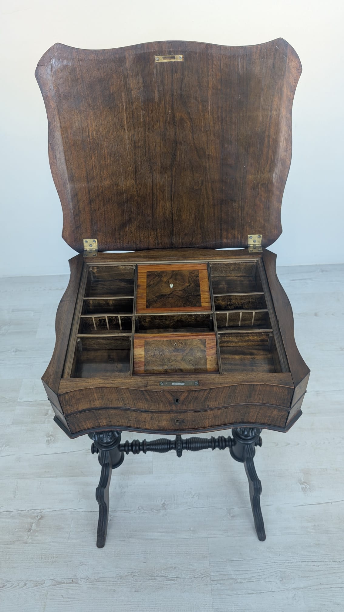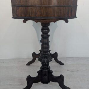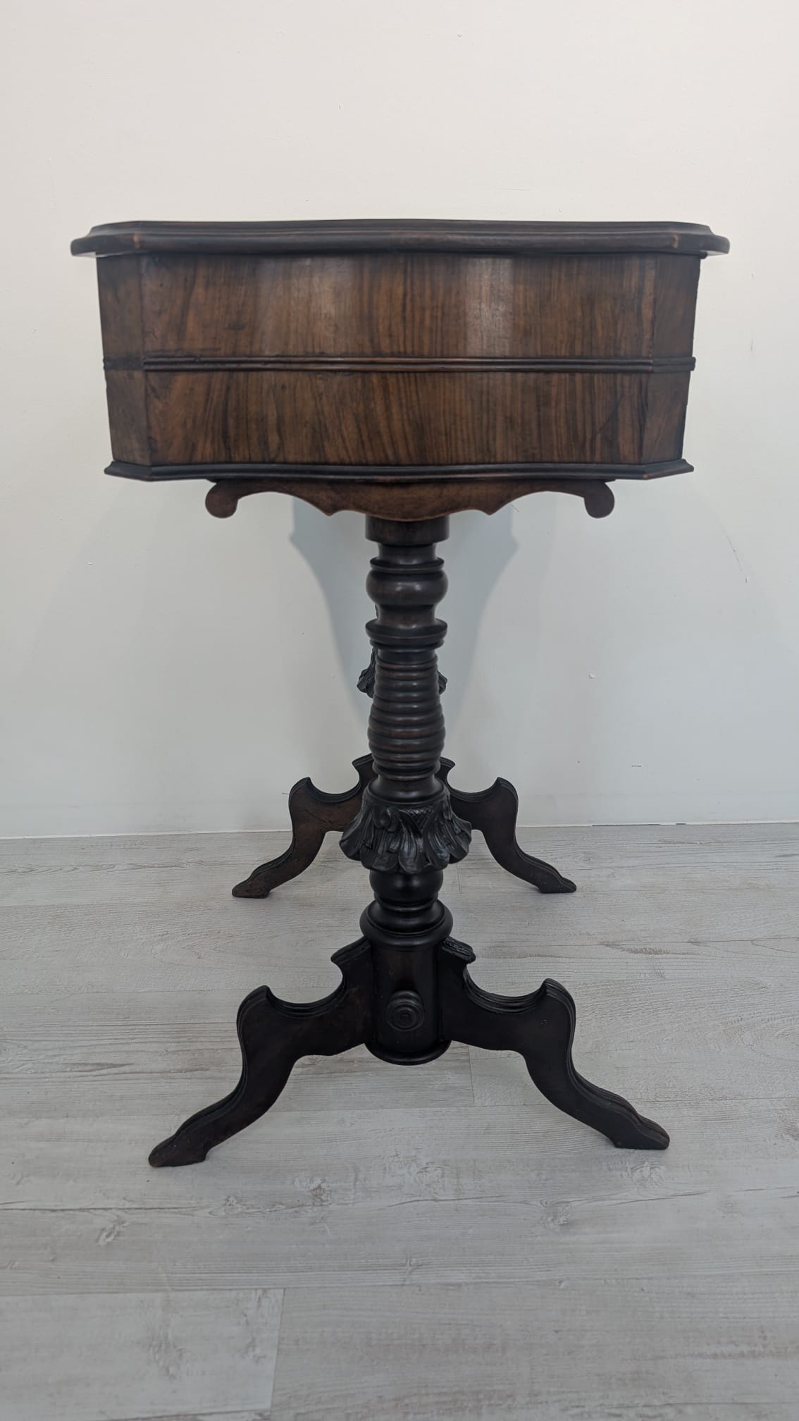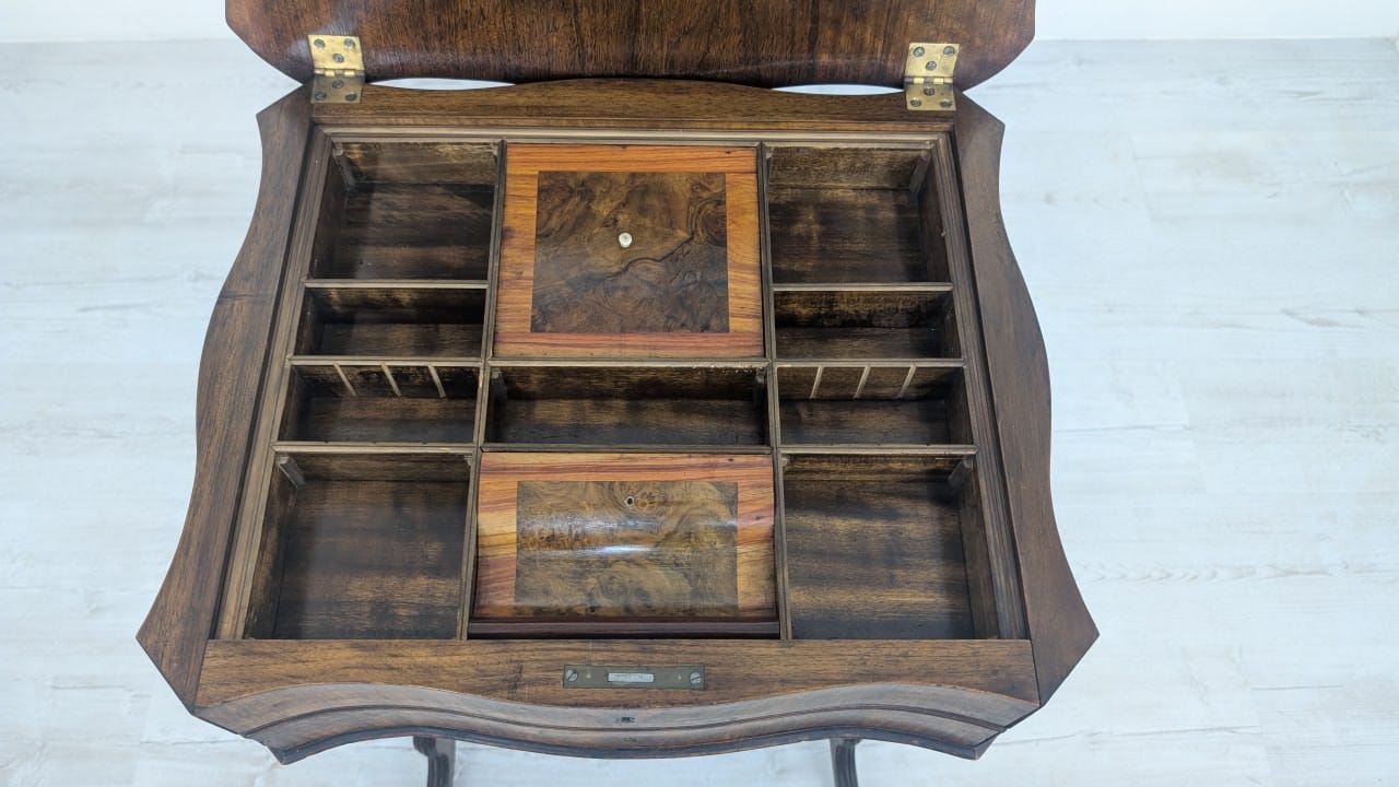 Stylowy, zabytkowy stolik drewniany w orzechu. Posiada jedną szufladę, która dodaje mu funkcjonalności. Solidna konstrukcja i piękne wykończenie sprawiają, że będzie on doskonałą ozdobą każdego wnętrza.