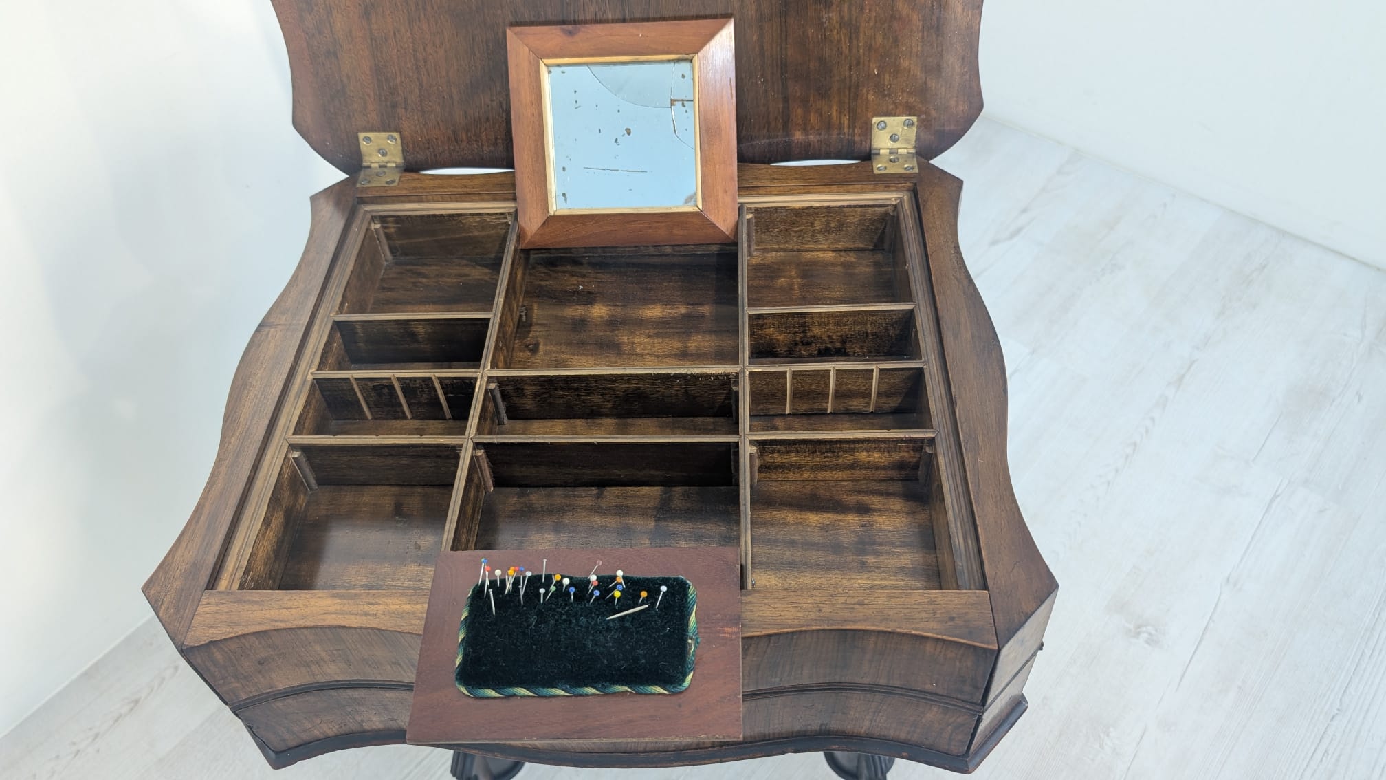 Brak kluczyka, brak gałki przy pojemnikach na igłach oraz pęknięte lustereczko.
