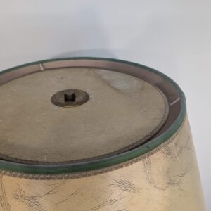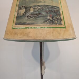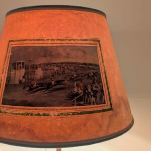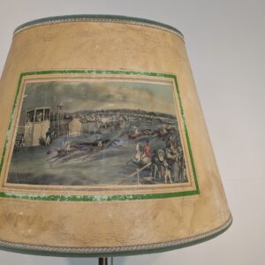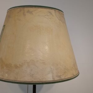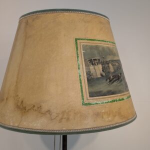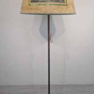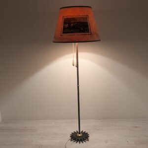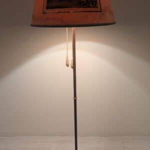 Stylowa, vintage’owa lampa podłogowa z mosiądzu z lat 50. lub 60. XX wieku. Abażur lampy zdobiony jest unikatową grafiką przedstawiającą scenę z przeszłości. Lampa jest w dobrym stanie i gotowa do użytku w Twoim domu, nadając mu niepowtarzalny klimat.