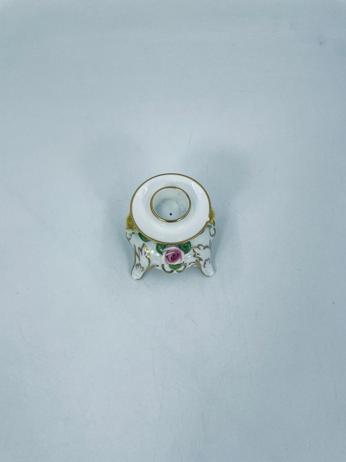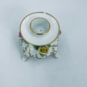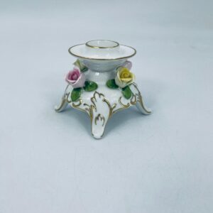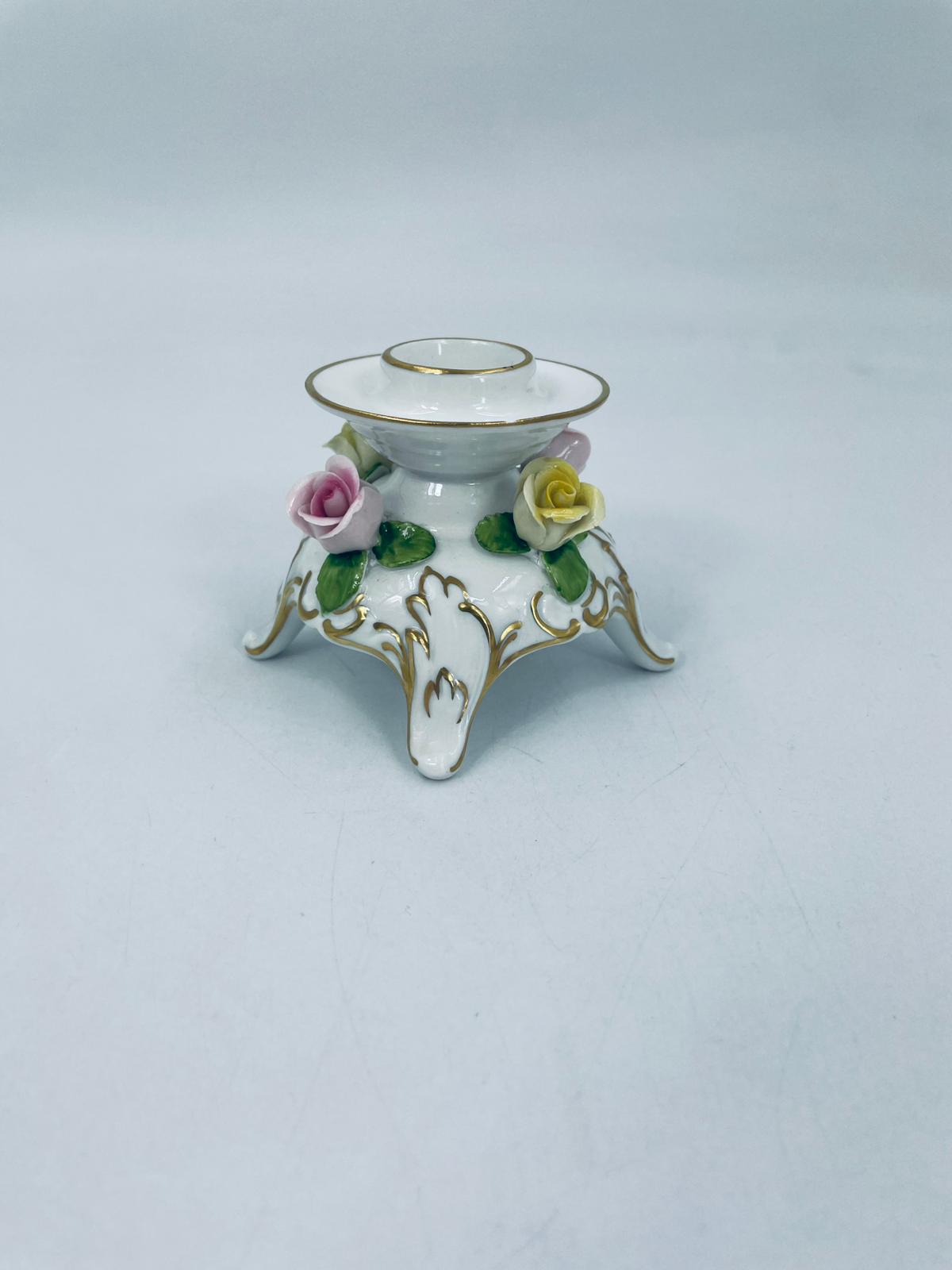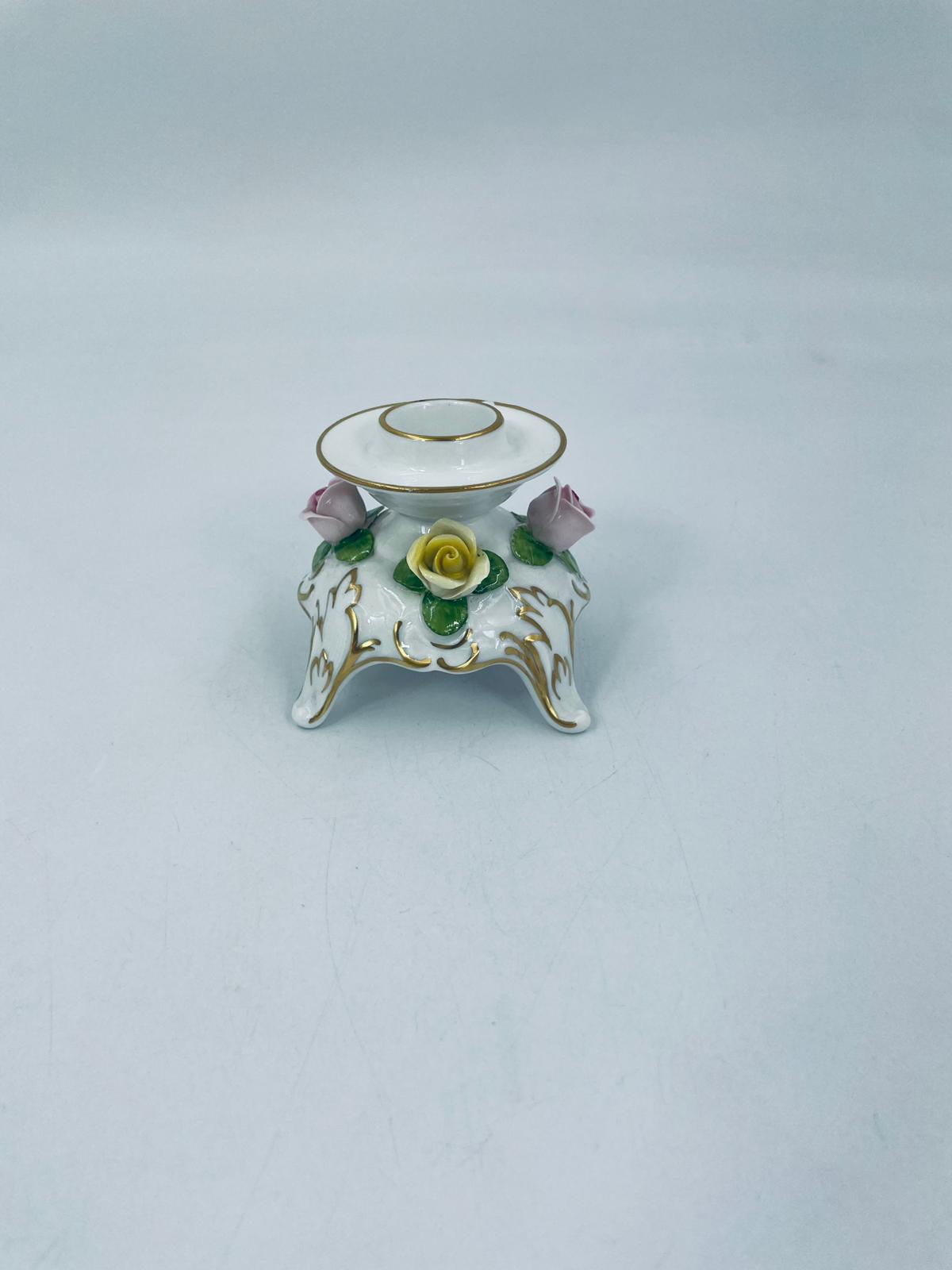 Świecznik na stopkach wytwórni Kaiser, wykonany z wysokiej jakości białej porcelany, ozdobiona aplikowanymi różami w kolorach różowym i żółtym, wykończony złotymi akcentami. Świecznik posiada mały uszczerbek na górnej krawędzi.