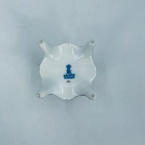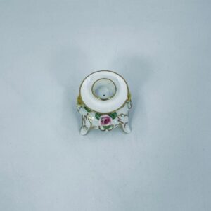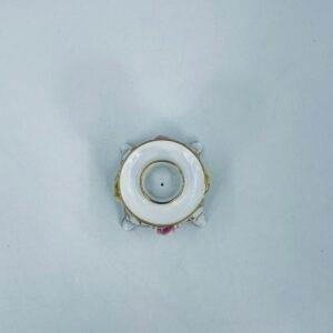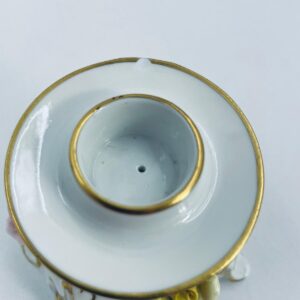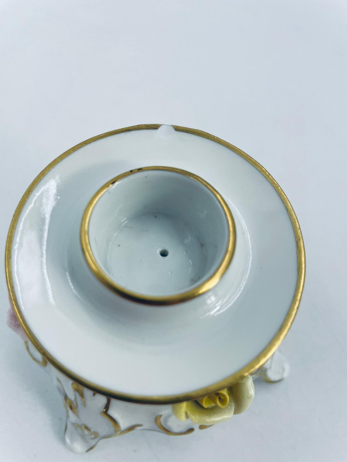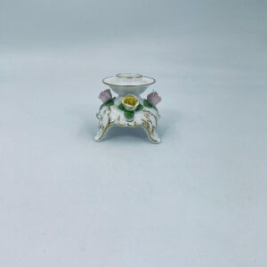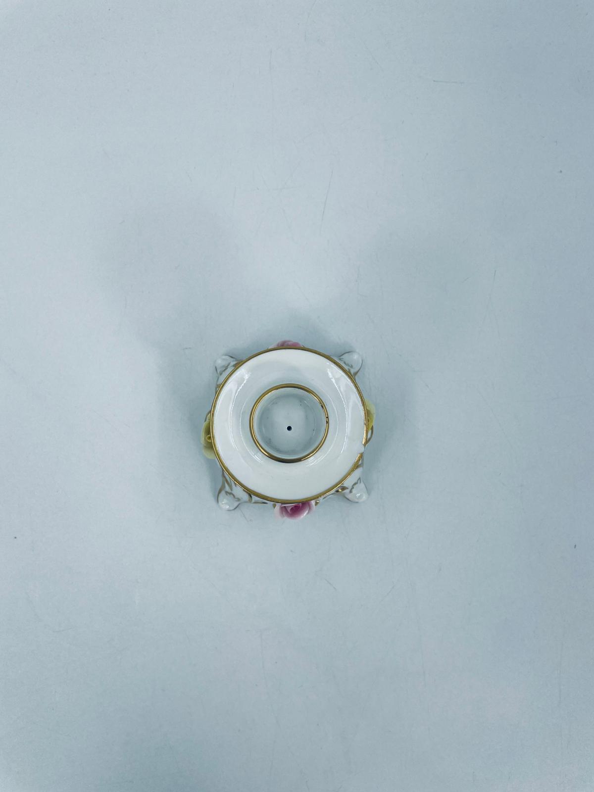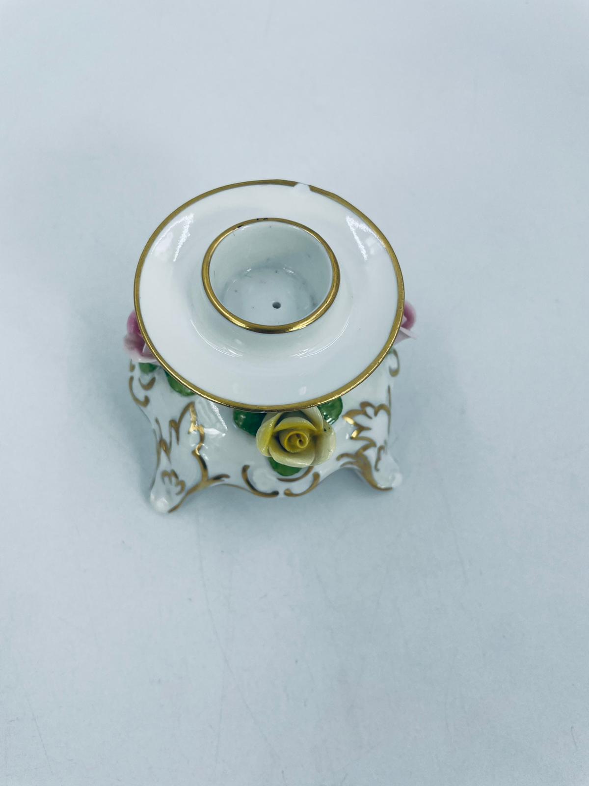 Świecznik na stopkach wytwórni Kaiser, wykonany z wysokiej jakości białej porcelany, ozdobiona aplikowanymi różami w kolorach różowym i żółtym, wykończony złotymi akcentami. Świecznik posiada mały uszczerbek na górnej krawędzi.