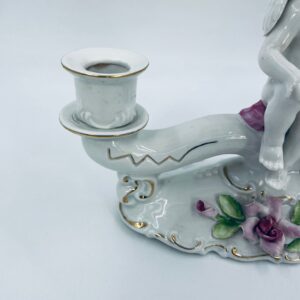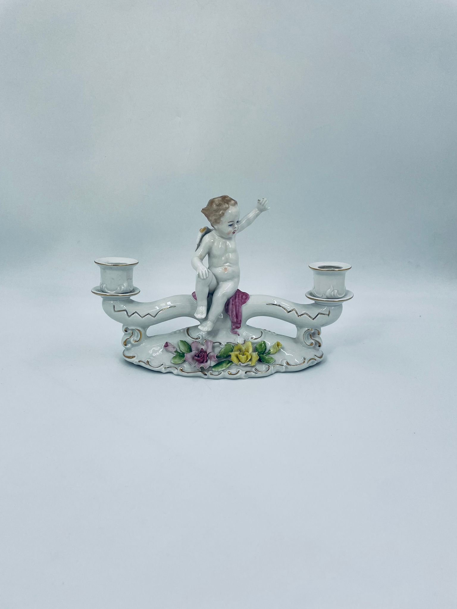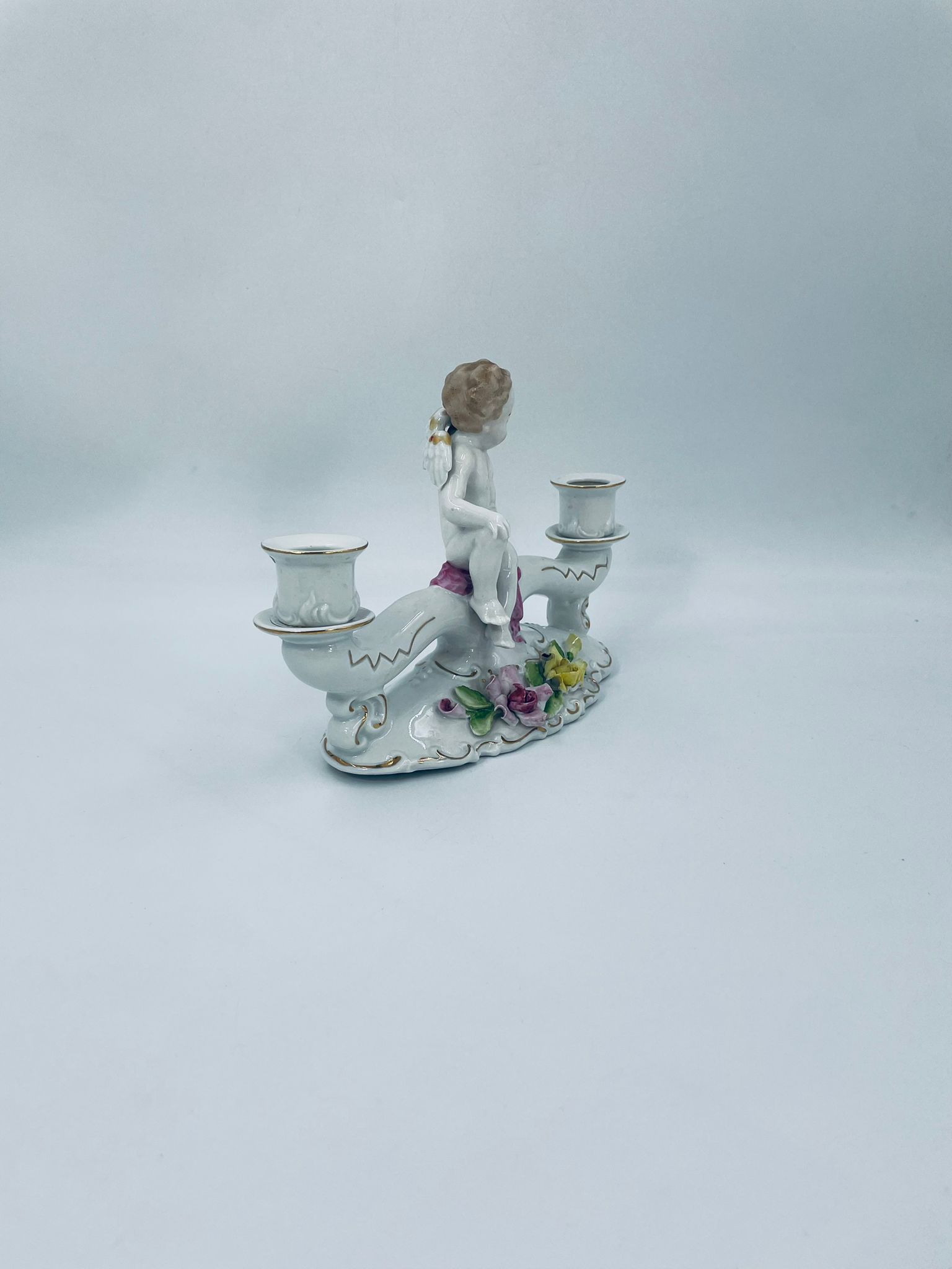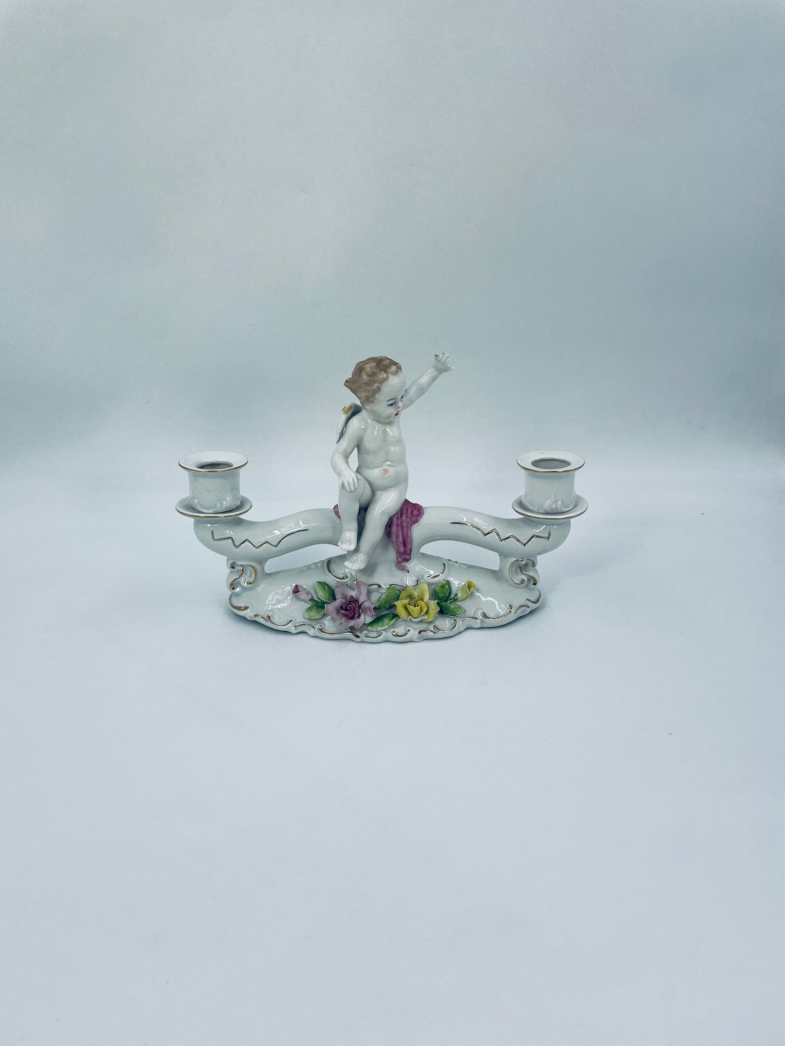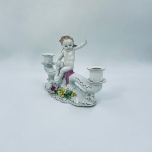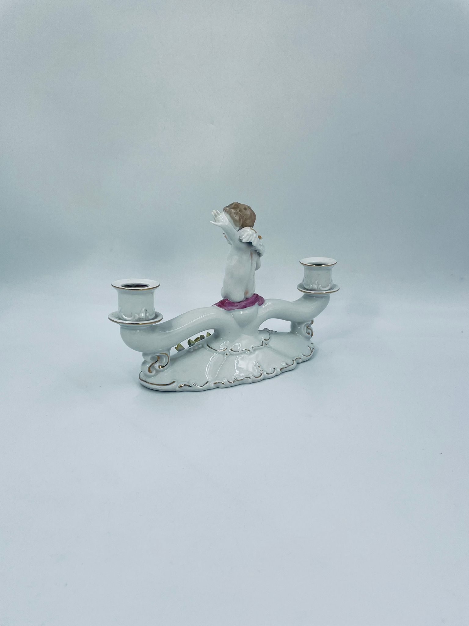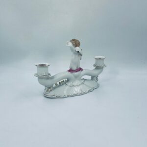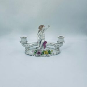Świecznik dwu ramienny wytwórni Gräfenrod Reinhold Voight , wykonany z wysokiej jakości białej porcelany. Świecznik z ozdobną figurka aniołka, z ręcznie malowaną i nakładaną dekoracją kwiatową oraz złotymi zdobieniami. Posiada uszczerbki oraz przetarcie na kwiatach.