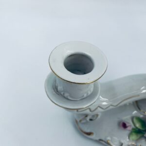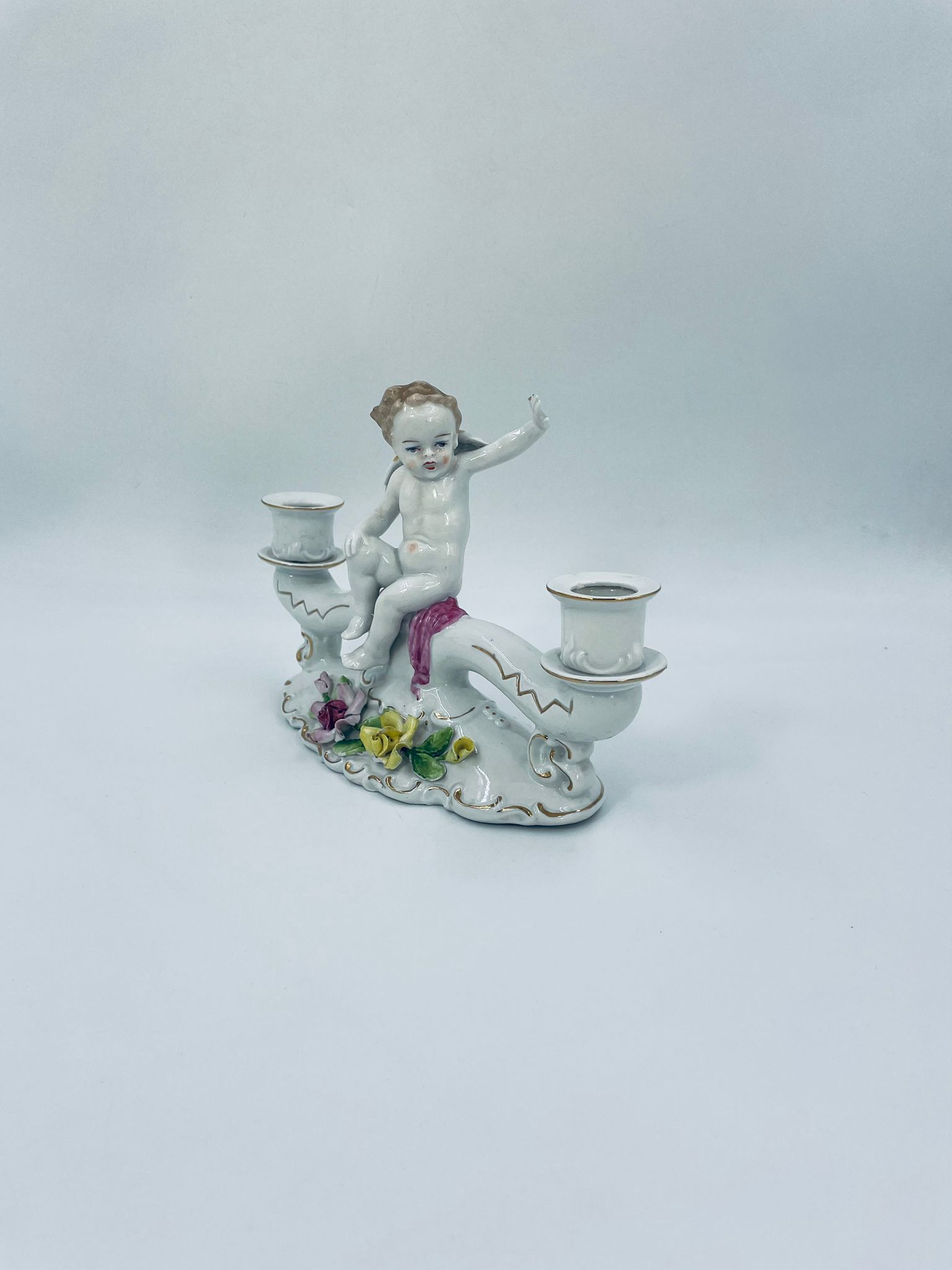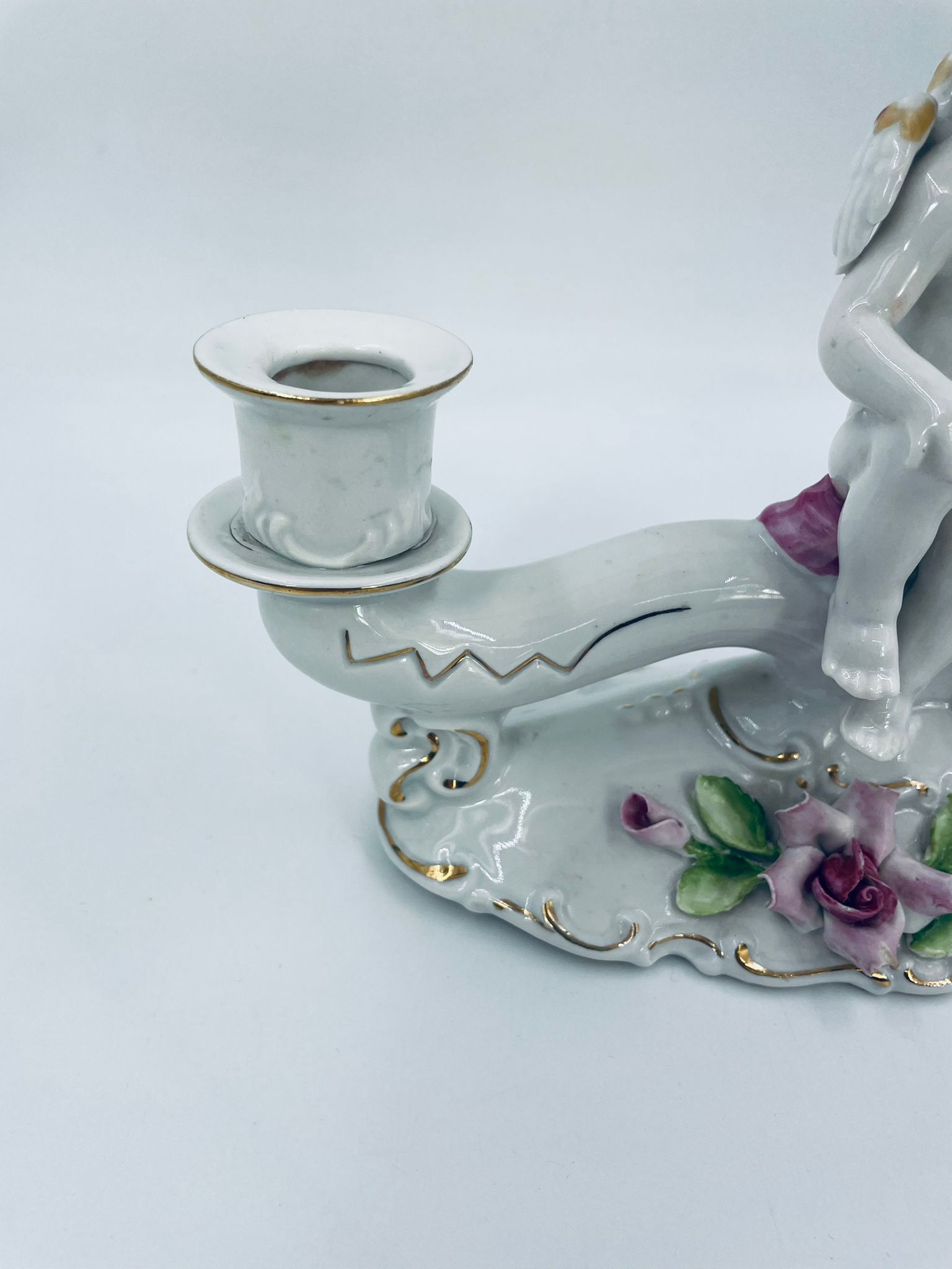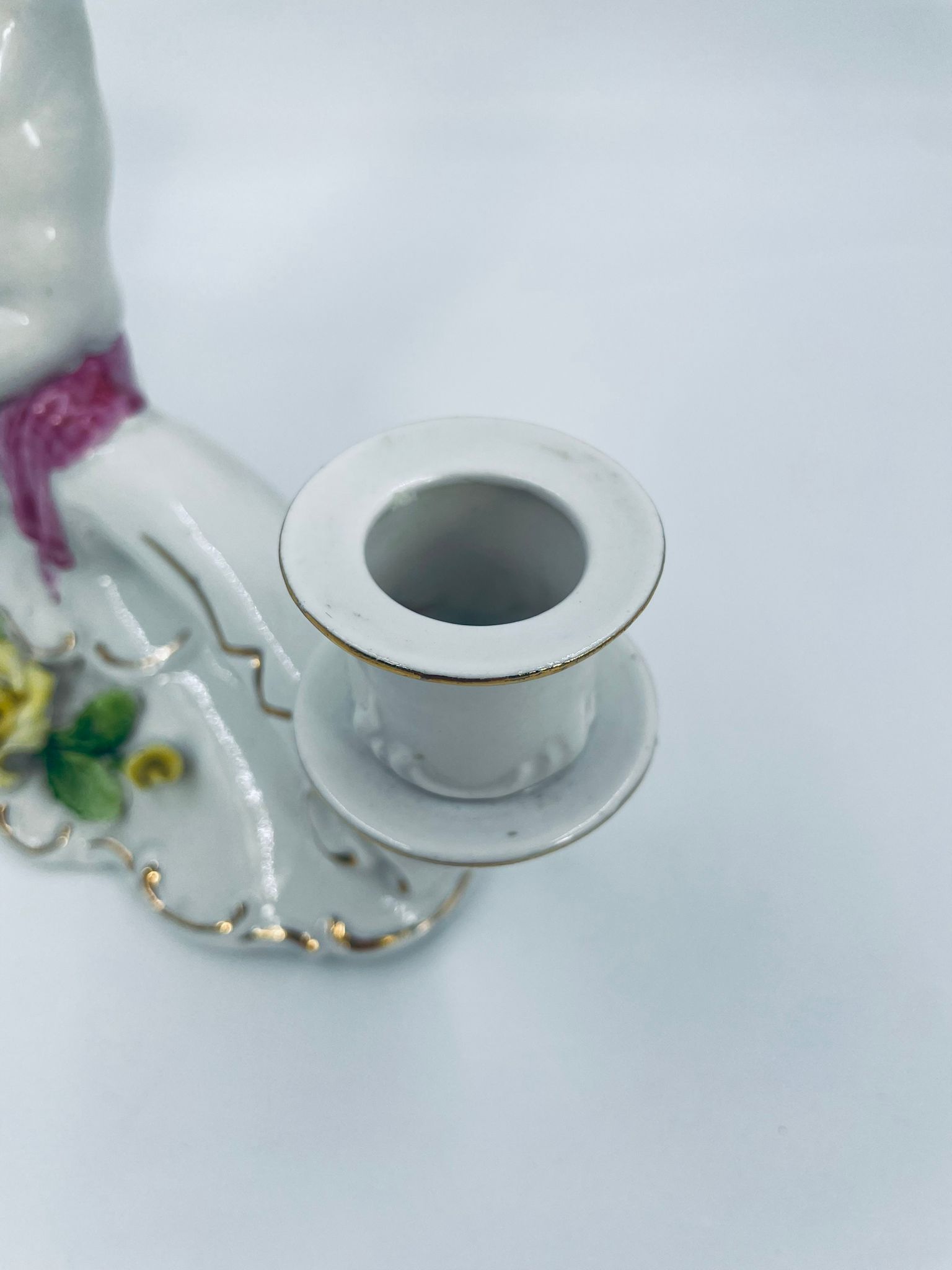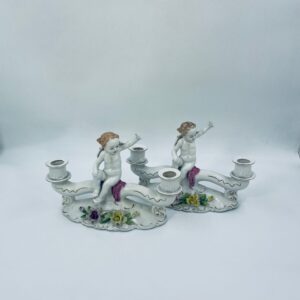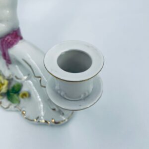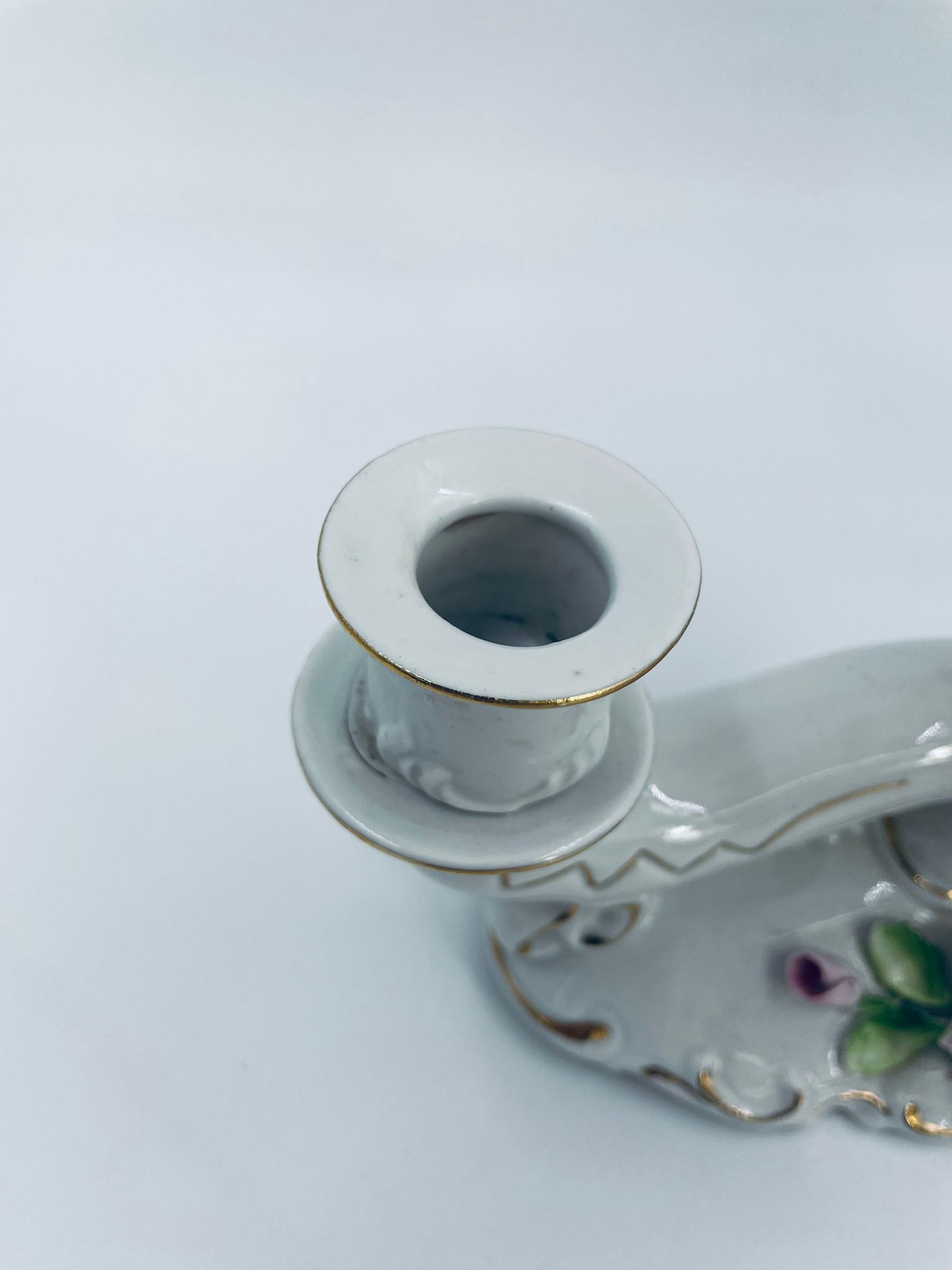 Świecznik dwu ramienny wytwórni Gräfenrod Reinhold Voight , wykonany z wysokiej jakości białej porcelany. Świecznik z ozdobną figurka aniołka, z ręcznie malowaną i nakładaną dekoracją kwiatową oraz złotymi zdobieniami. Posiada uszczerbki oraz przetarcie na kwiatach.