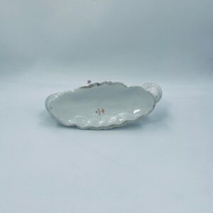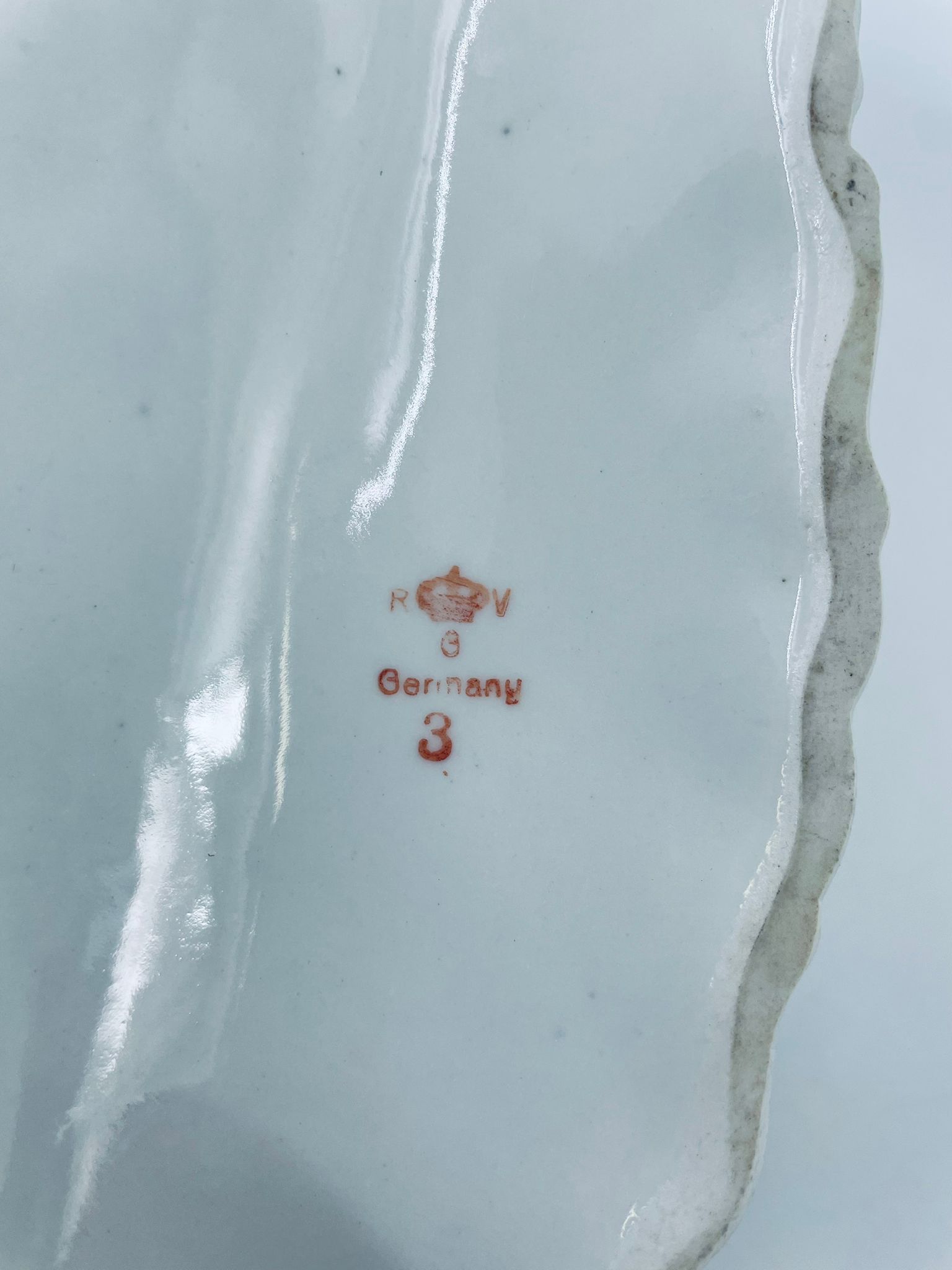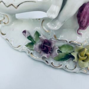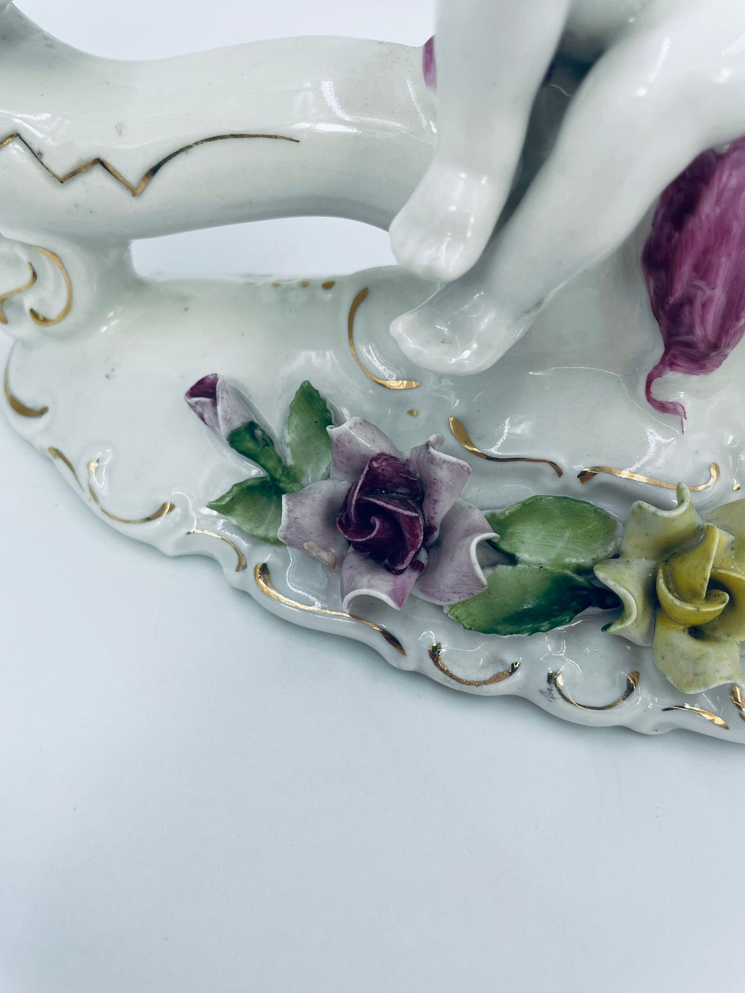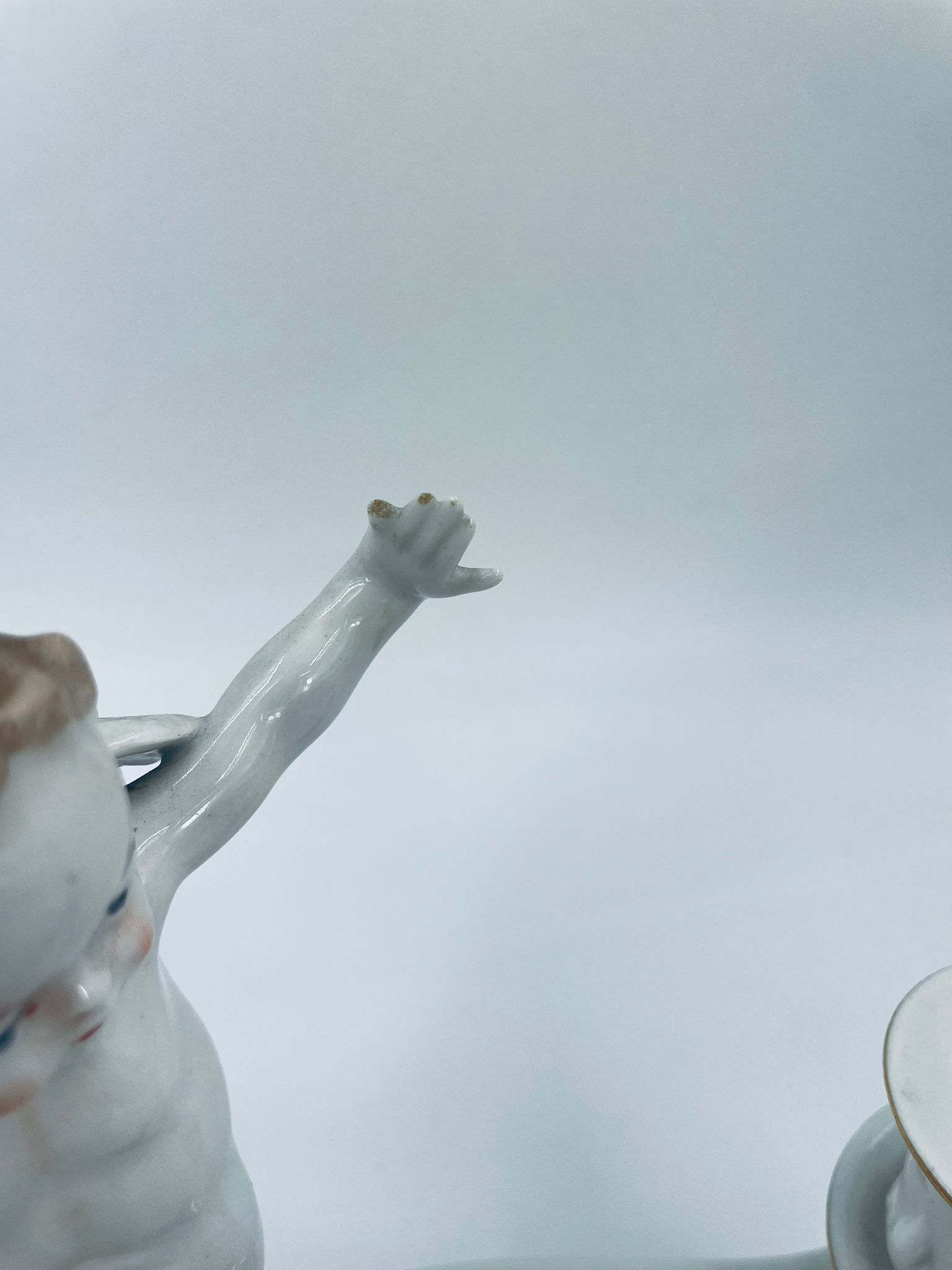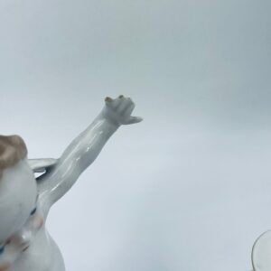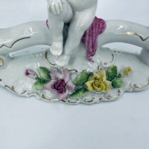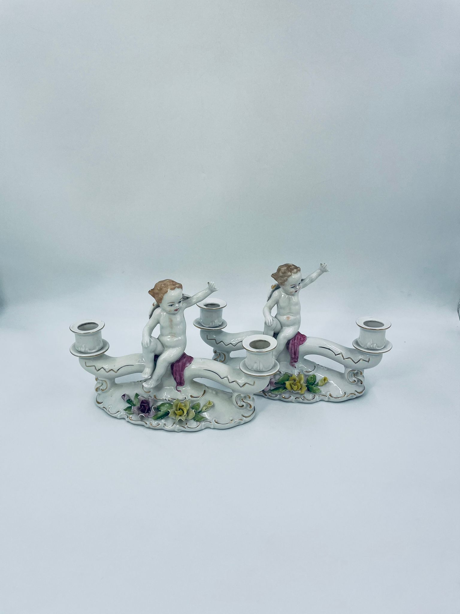 Świecznik dwu ramienny wytwórni Gräfenrod Reinhold Voight , wykonany z wysokiej jakości białej porcelany. Świecznik z ozdobną figurka aniołka, z ręcznie malowaną i nakładaną dekoracją kwiatową oraz złotymi zdobieniami. Posiada uszczerbki oraz przetarcie na kwiatach.