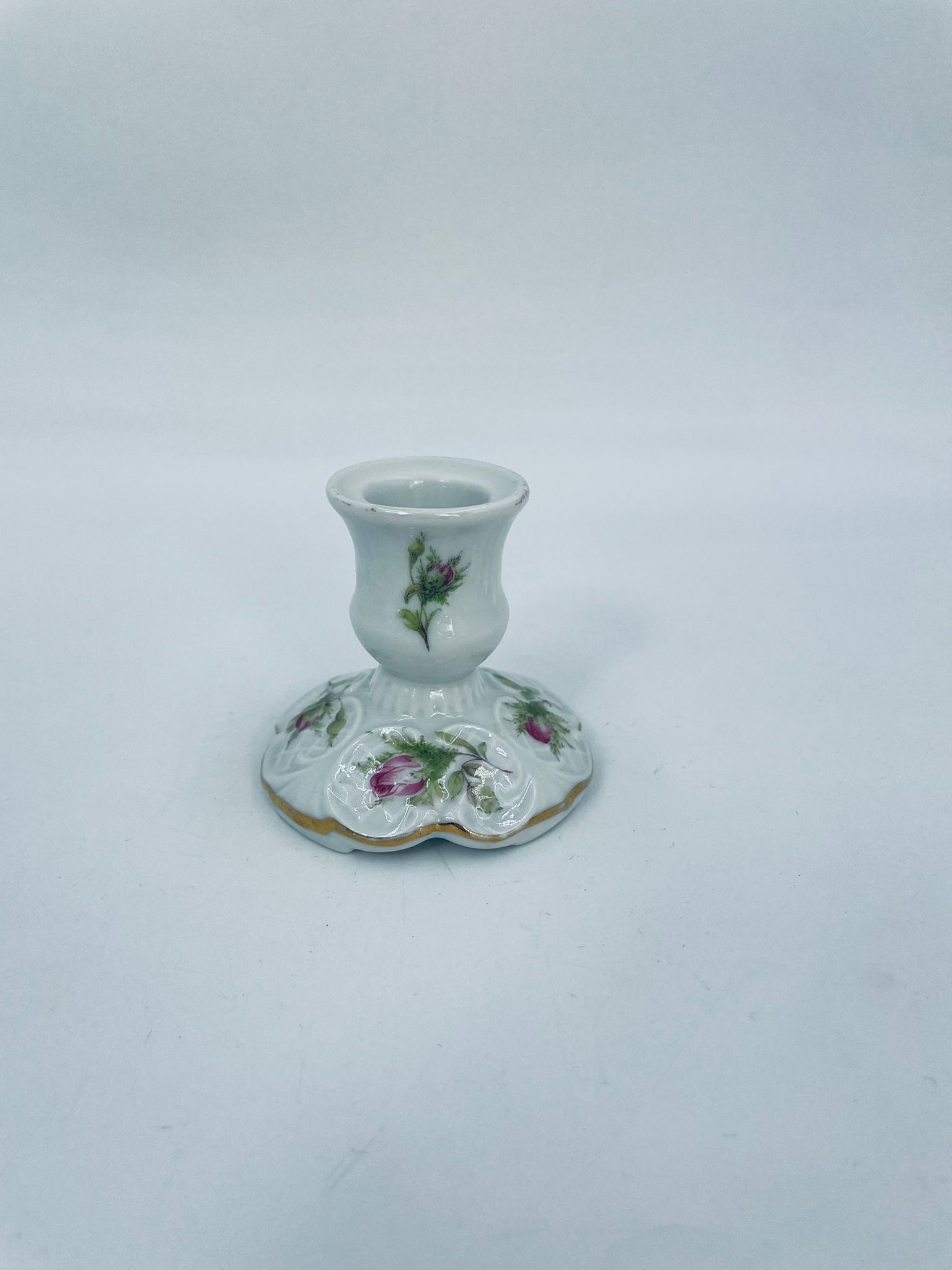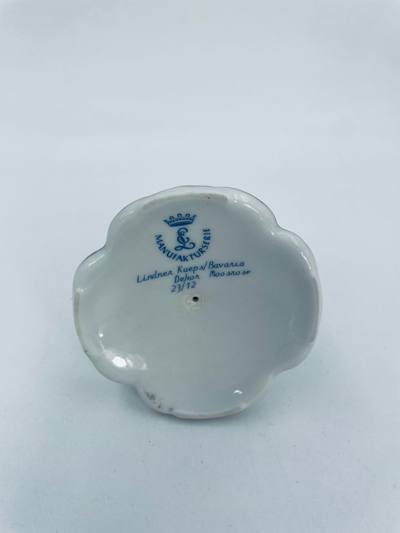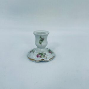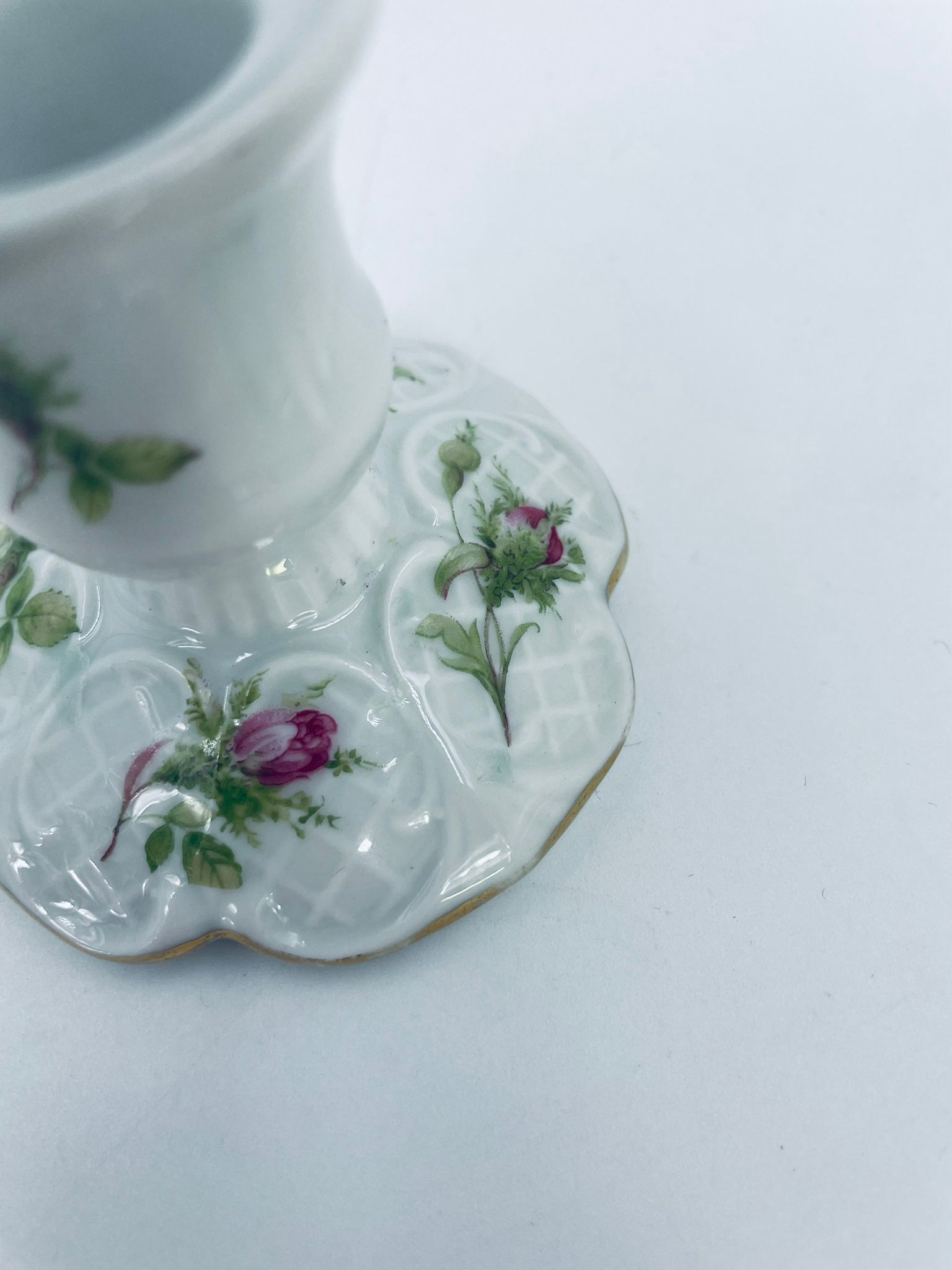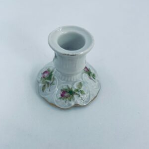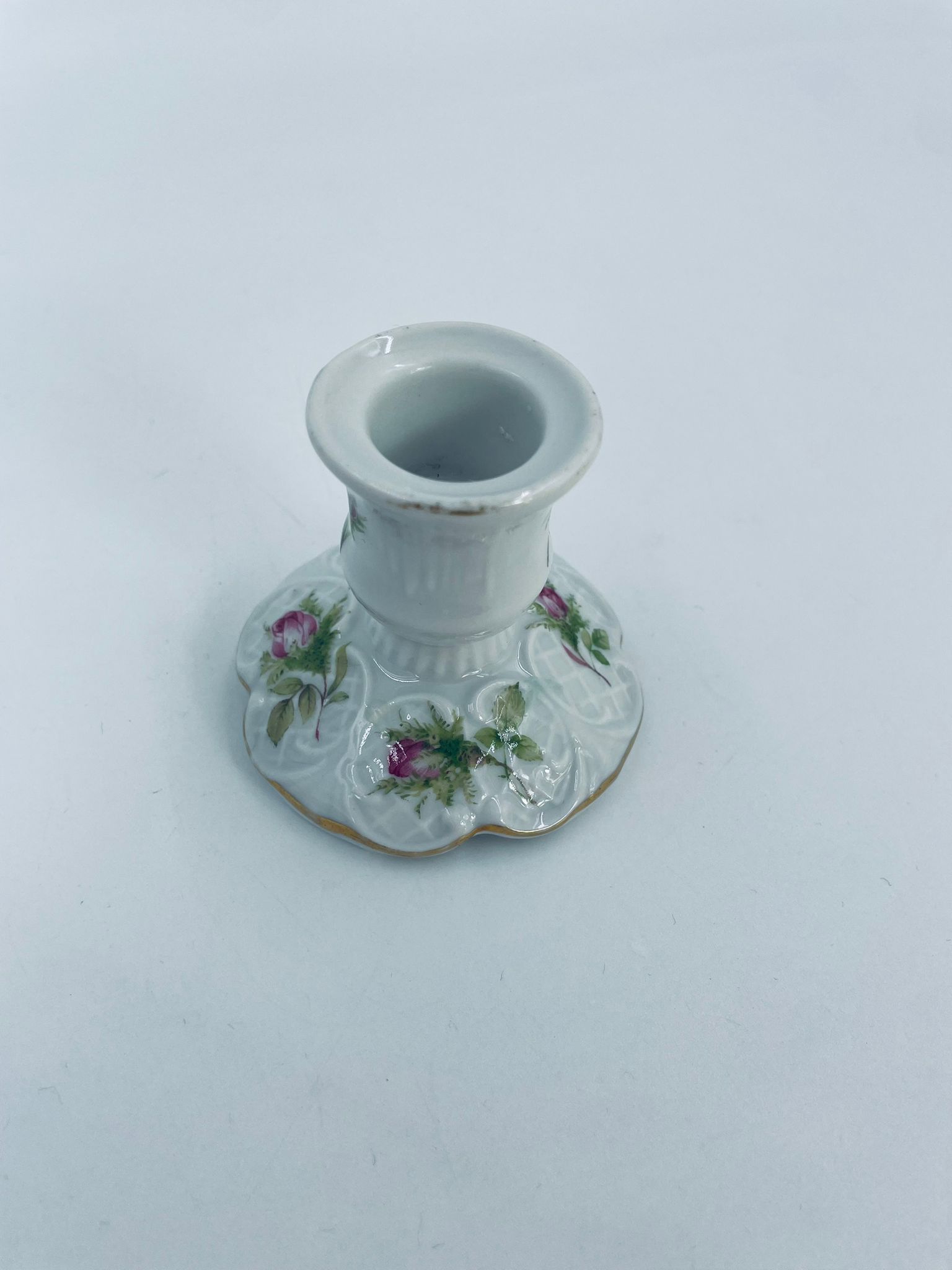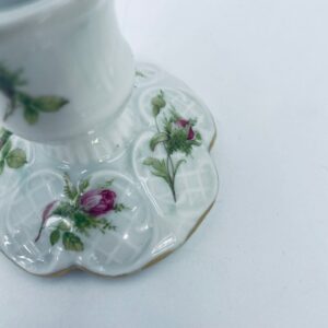 Świecznik wytwórni Lindner Kueps Bavaria wykonany z wysokiej jakości białej porcelany. Świecznik ozdobiony reliefowymi wzorami oraz motywem różowych róż , wykończony złoceniem na rantach. Posiada przetarcie na złoceniu.