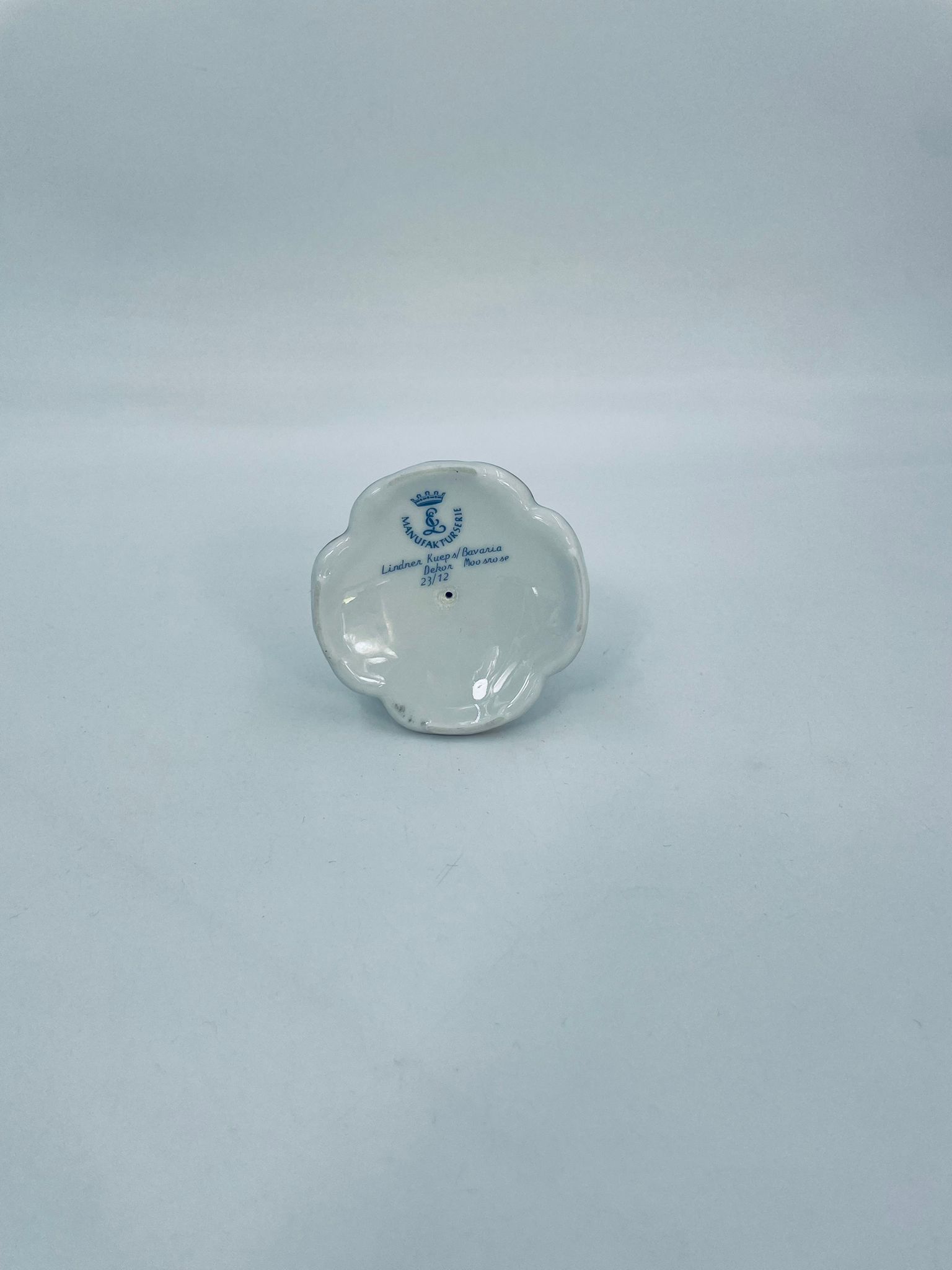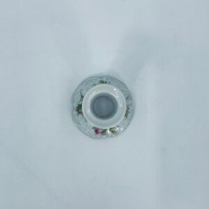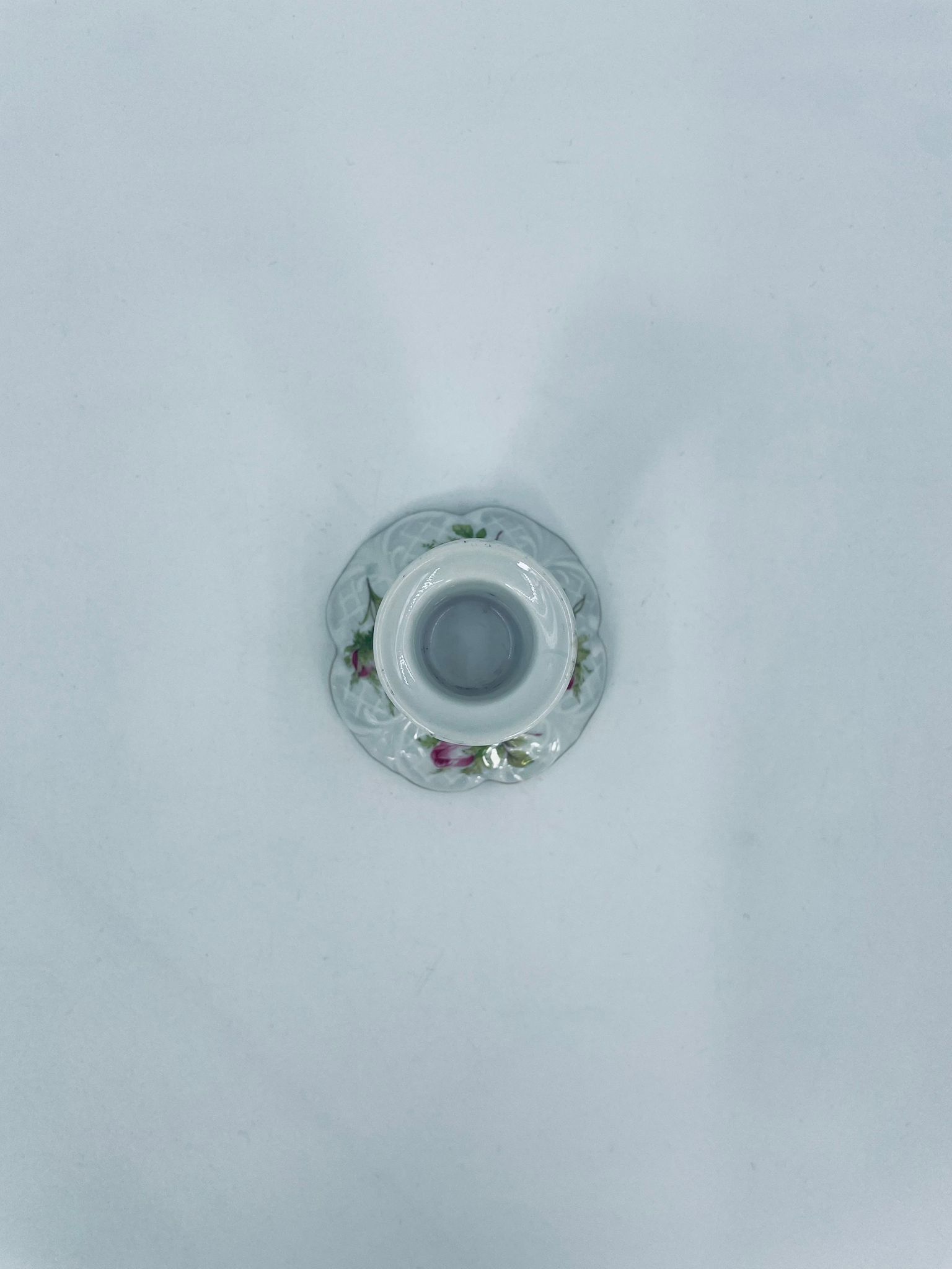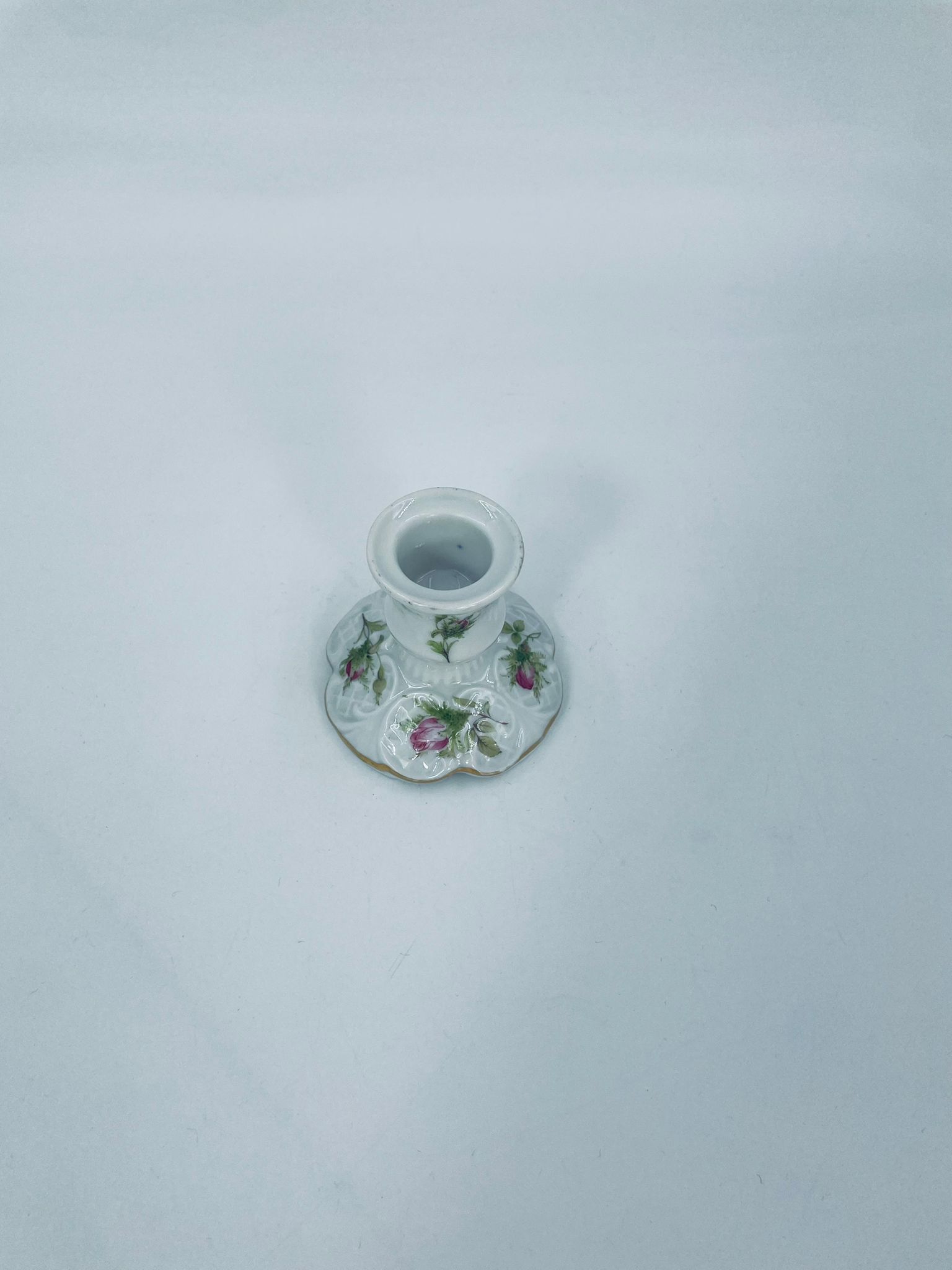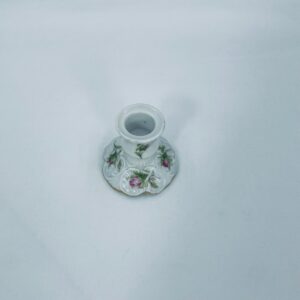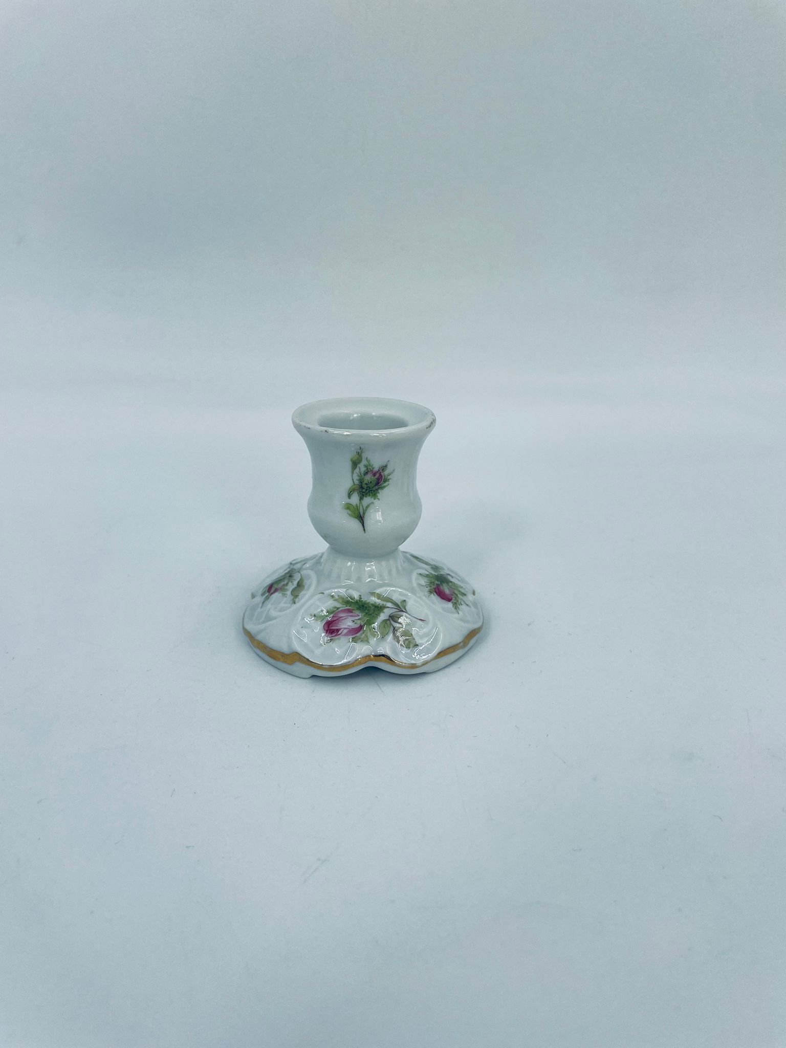 Świecznik wytwórni Lindner Kueps Bavaria wykonany z wysokiej jakości białej porcelany. Świecznik ozdobiony reliefowymi wzorami oraz motywem różowych róż , wykończony złoceniem na rantach. Posiada przetarcie na złoceniu.