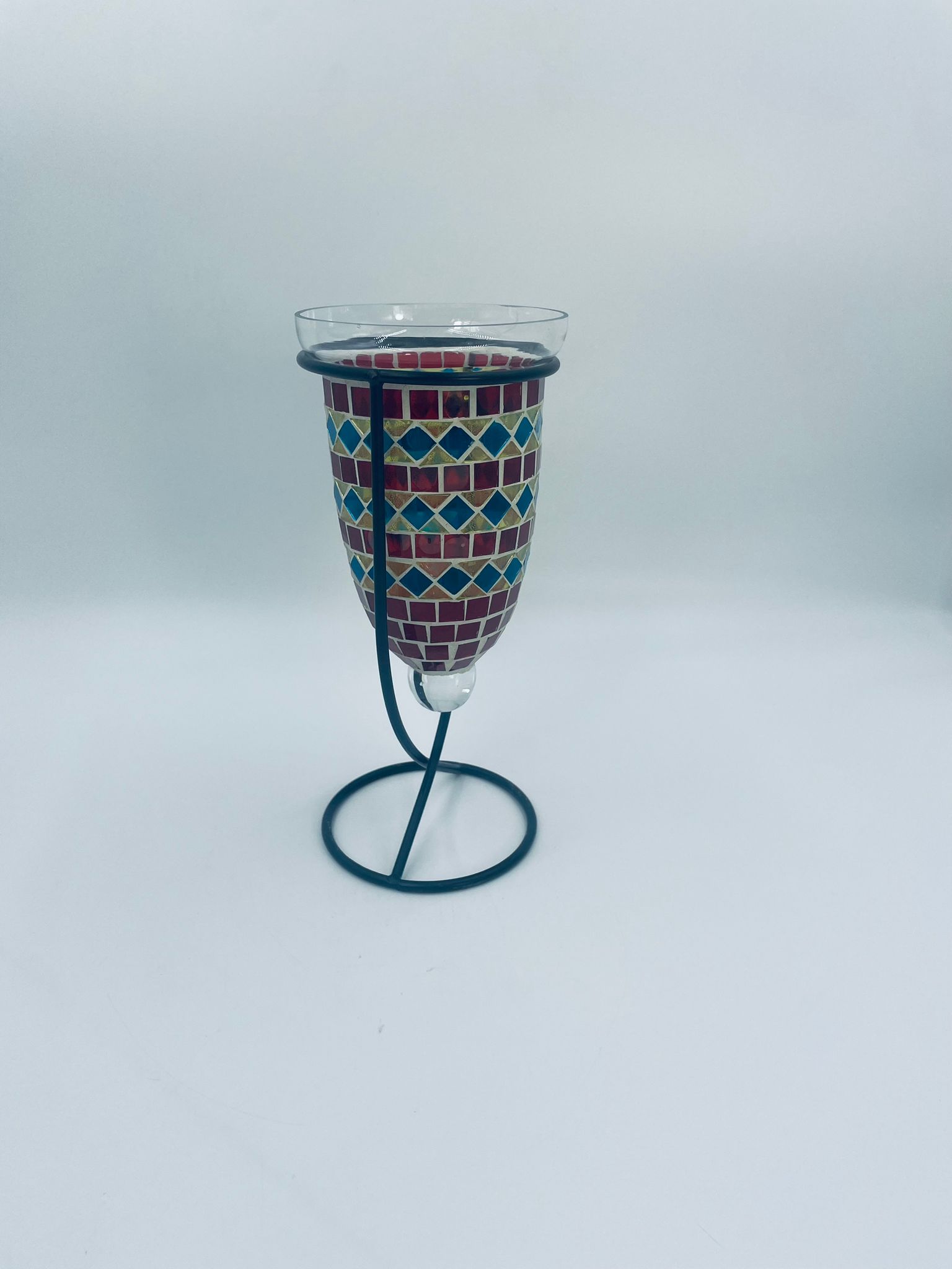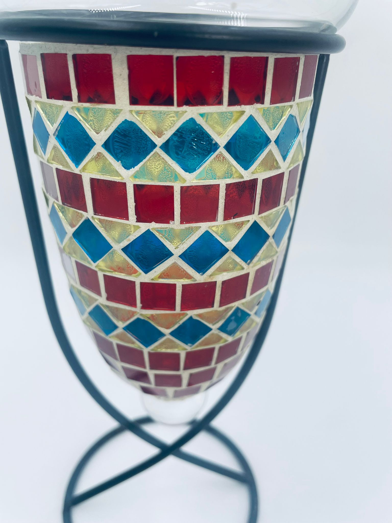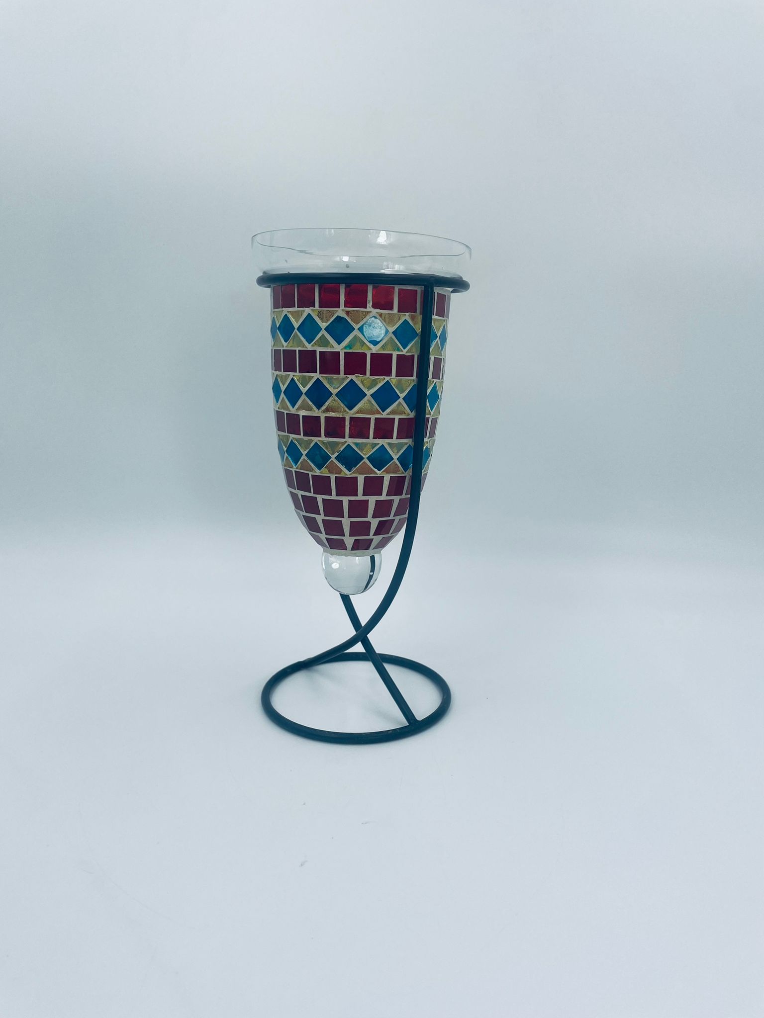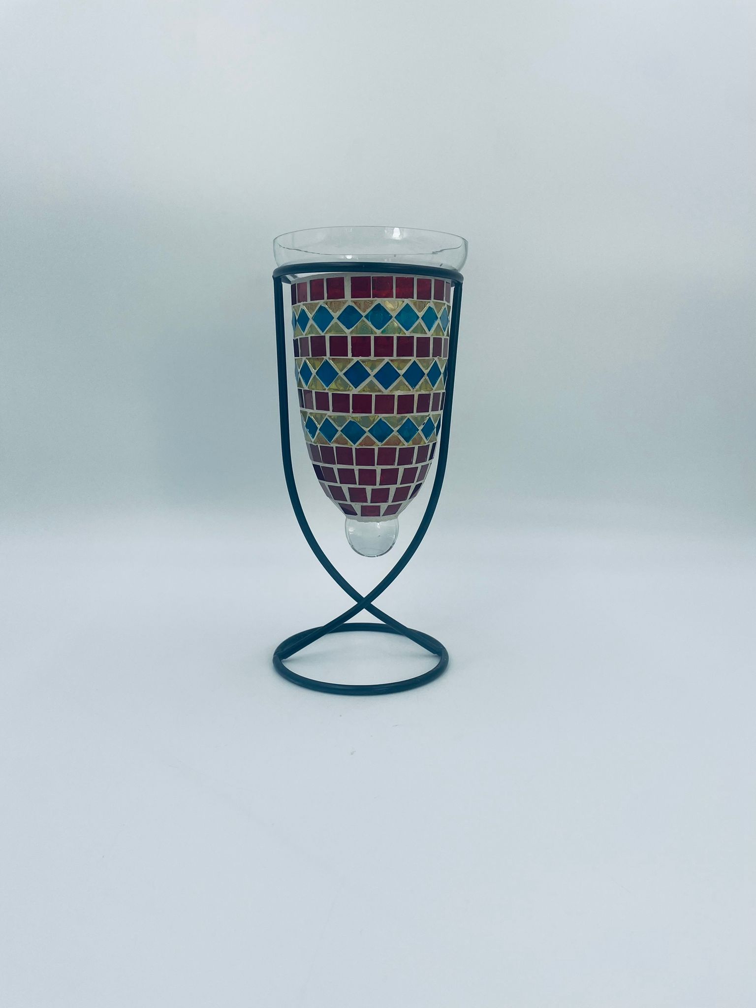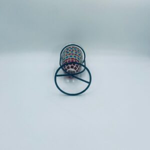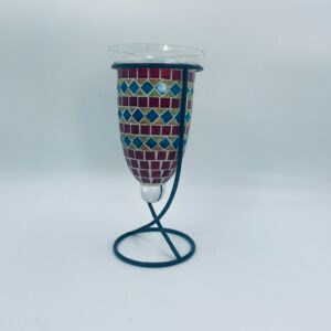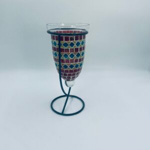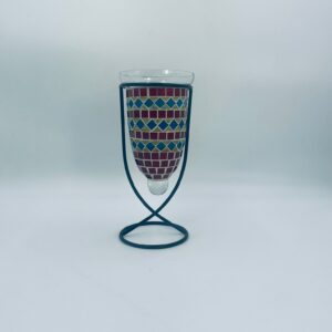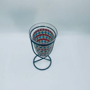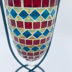 Świecznik dekoracyjny w stylu Marokańskim. Świecznik składa się z kielichowego klosza, wykonanego ręcznie w stylu witrażowym Tiffany, z kolorowymi szkiełkami ułożonymi w geometryczne wzory romby i kwadraty oraz minimalistycznego, metalowego stojaka w czarnym kolorze.
