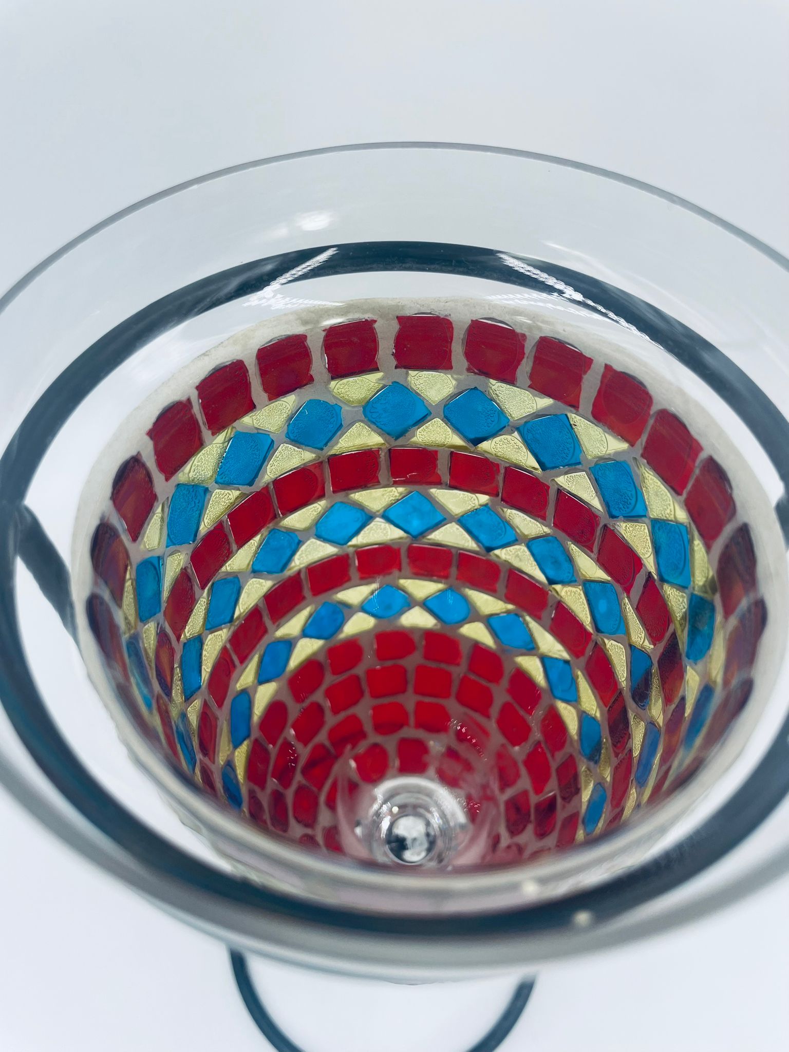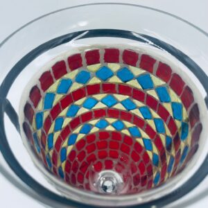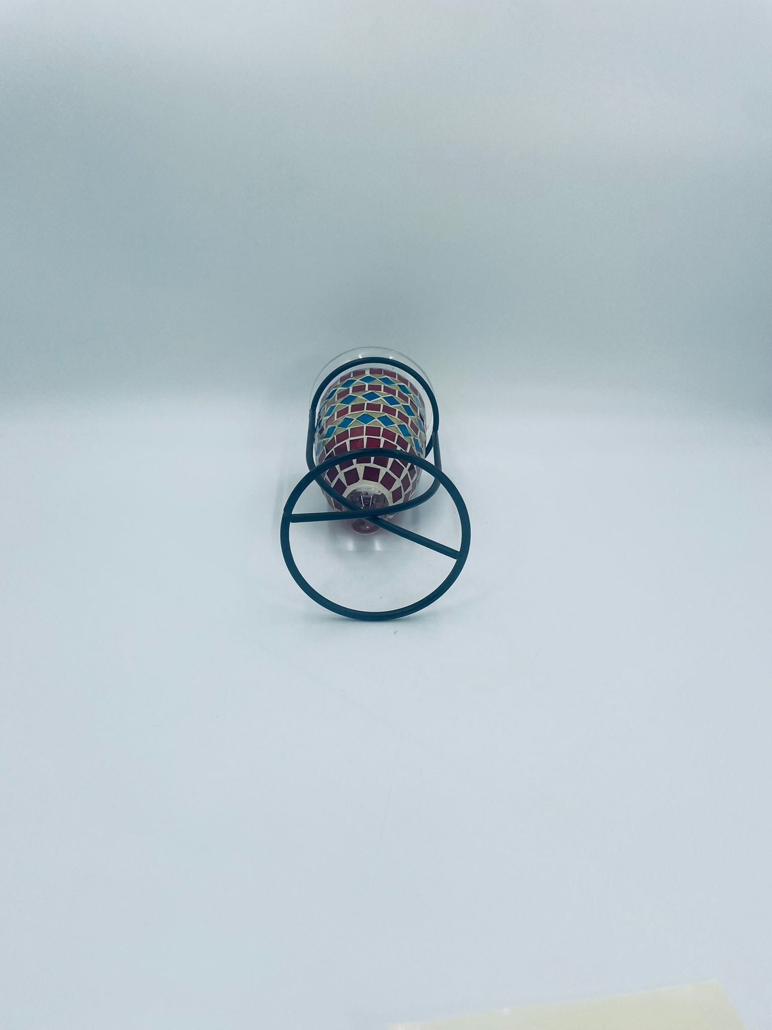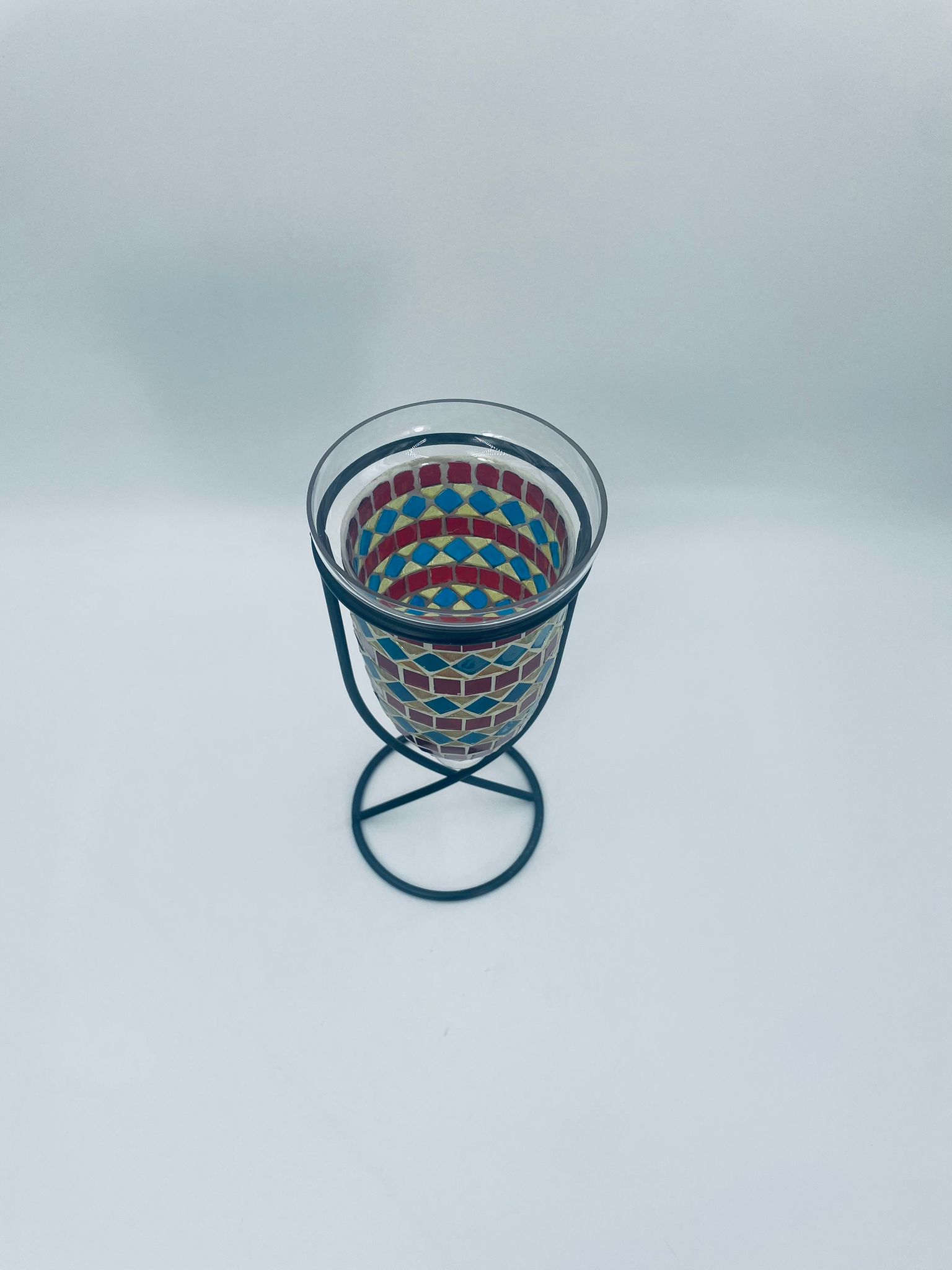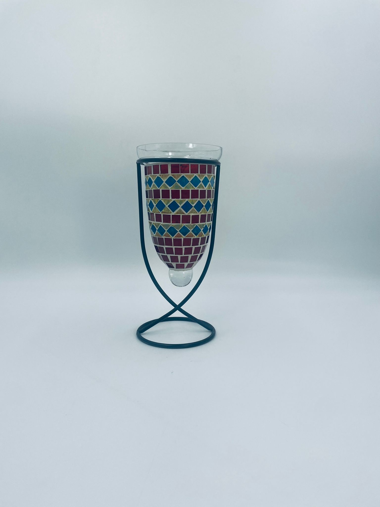 Świecznik dekoracyjny w stylu Marokańskim. Świecznik składa się z kielichowego klosza, wykonanego ręcznie w stylu witrażowym Tiffany, z kolorowymi szkiełkami ułożonymi w geometryczne wzory romby i kwadraty oraz minimalistycznego, metalowego stojaka w czarnym kolorze.