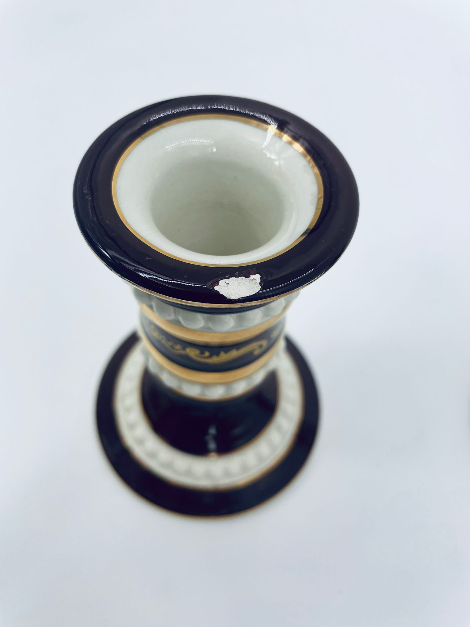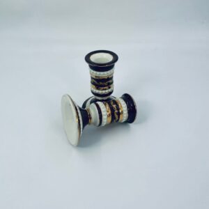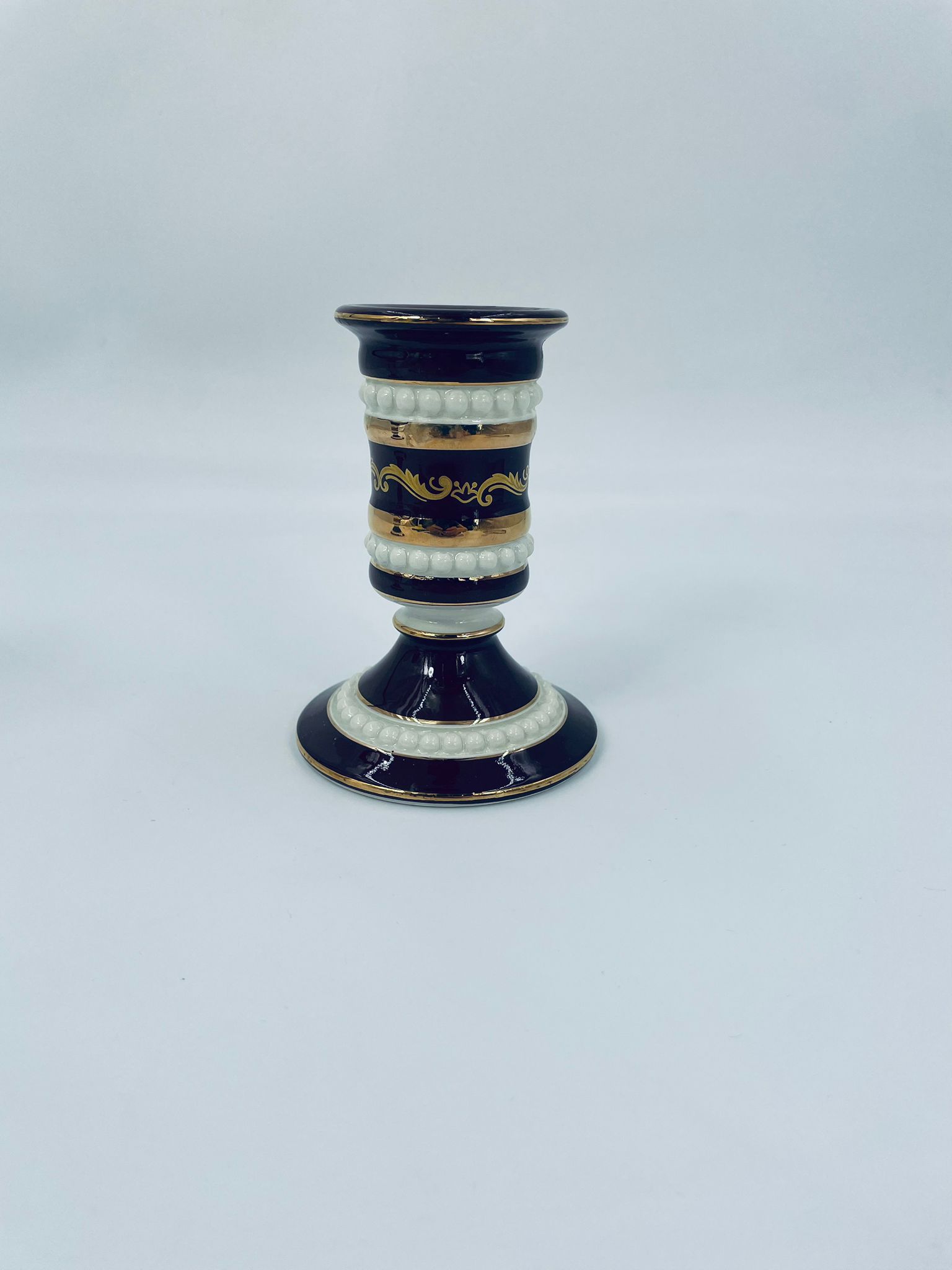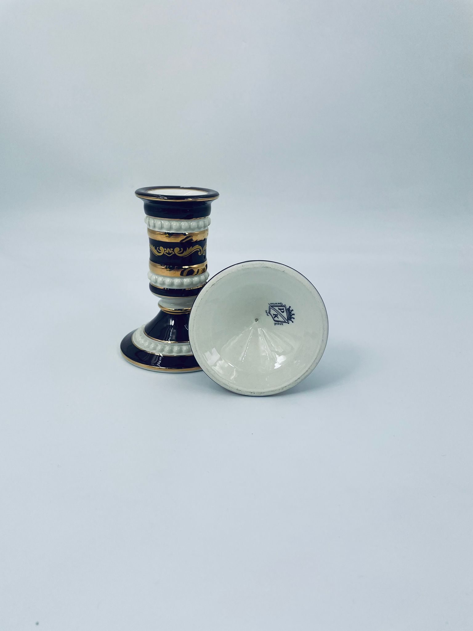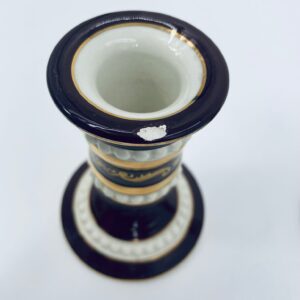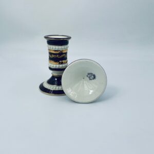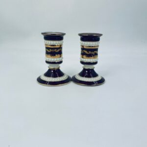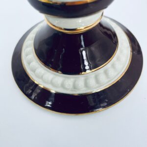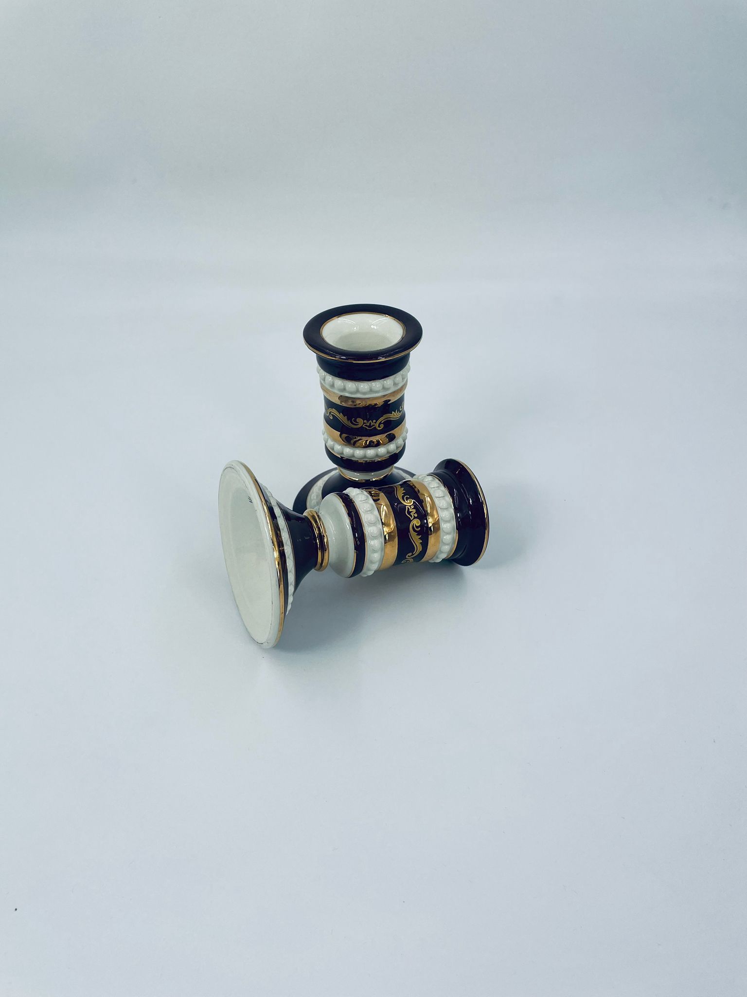 Świeczniki autorstwa Klausa Cutika z Kups PK Korona, wykonane z porcelany, zdobione bogatymi motywami złotymi na burgundowym tle. Świeczniki wykończone złoceniami na rantach. Jeden świecznik posiada uszczerbek na górnym rancie oraz odprysk na w dolnej części.