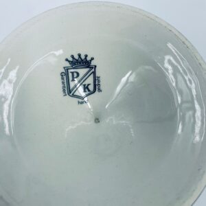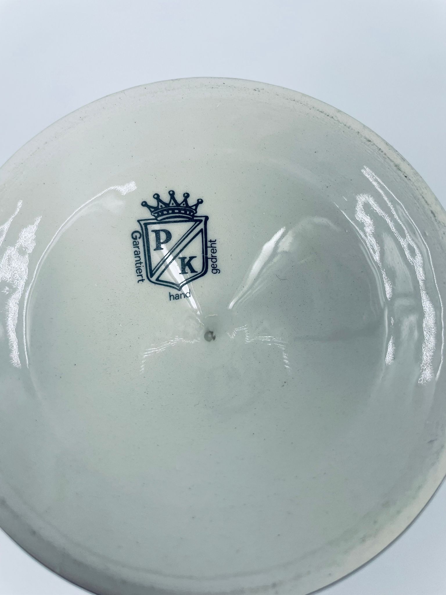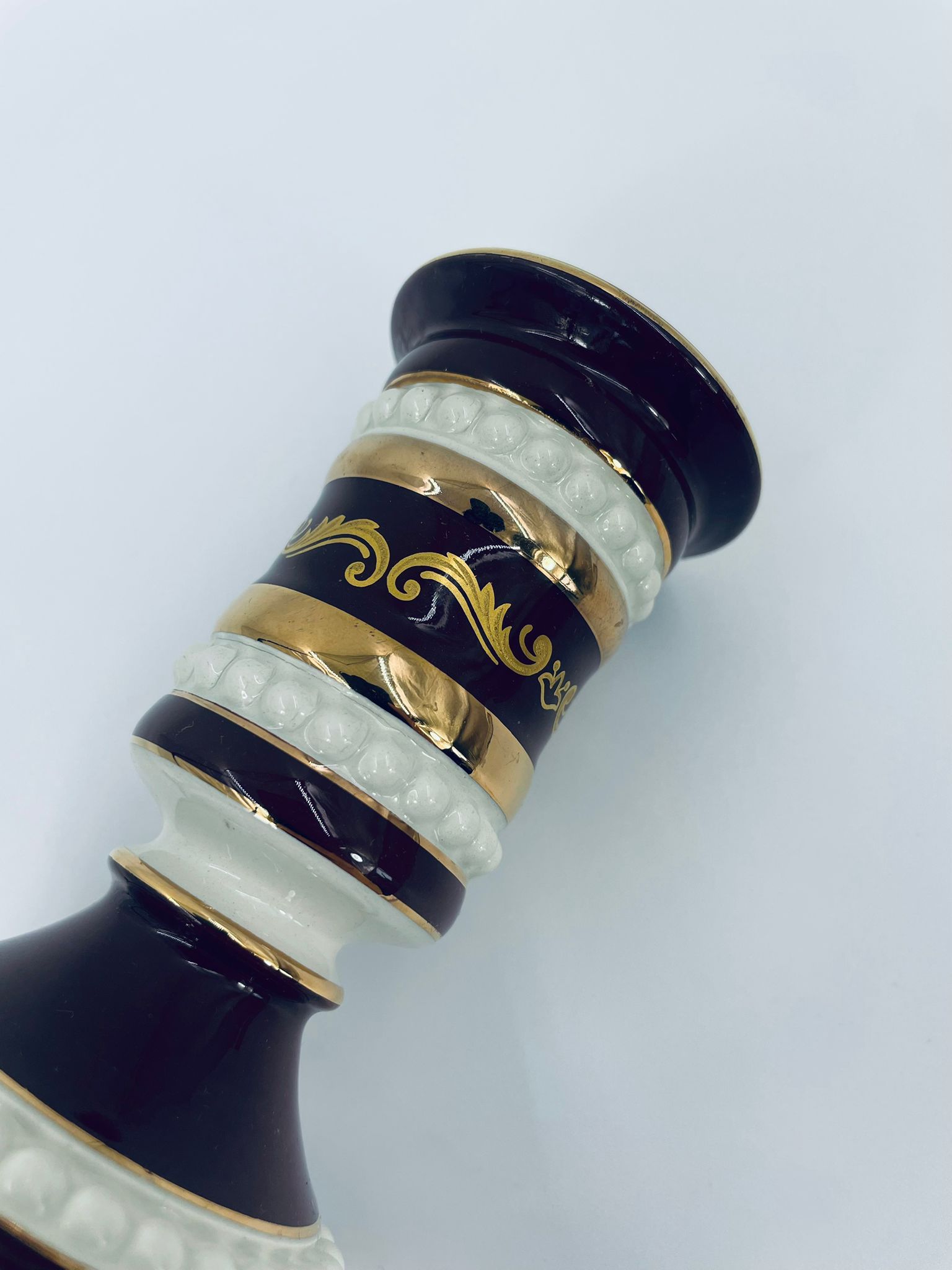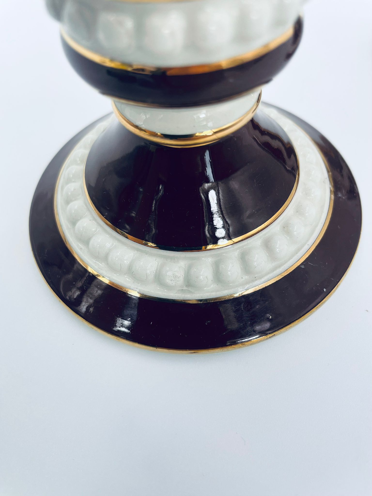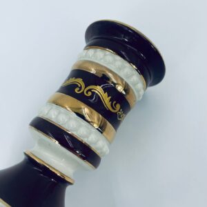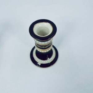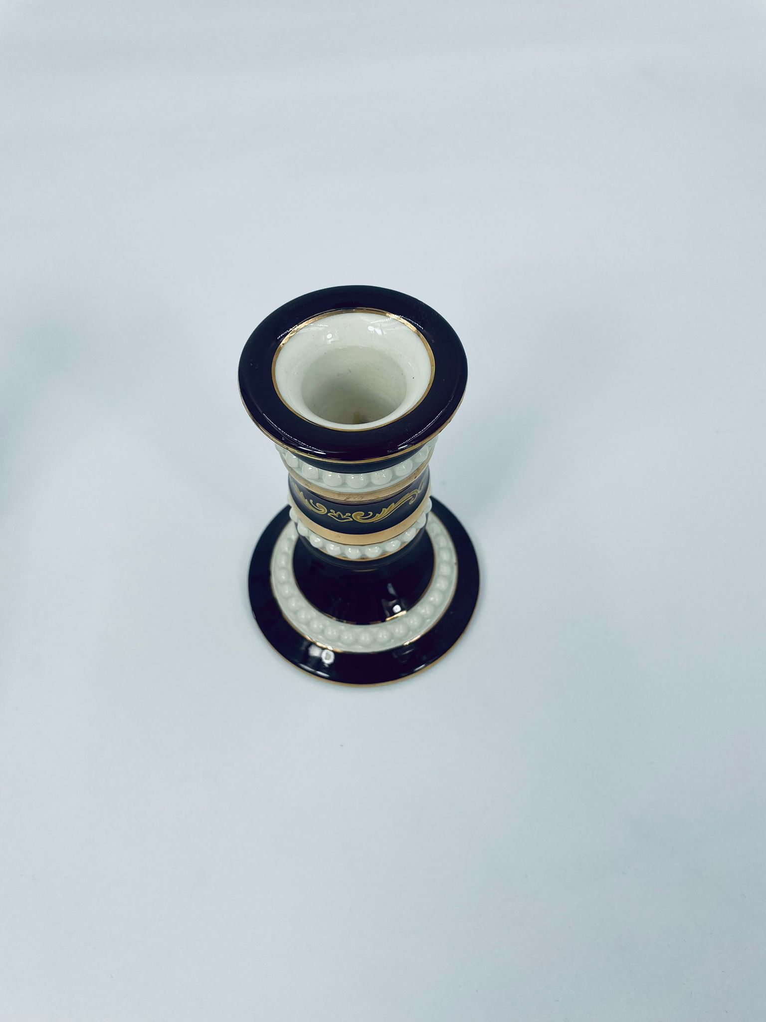 Świeczniki autorstwa Klausa Cutika z Kups PK Korona, wykonane z porcelany, zdobione bogatymi motywami złotymi na burgundowym tle. Świeczniki wykończone złoceniami na rantach. Jeden świecznik posiada uszczerbek na górnym rancie oraz odprysk na w dolnej części.